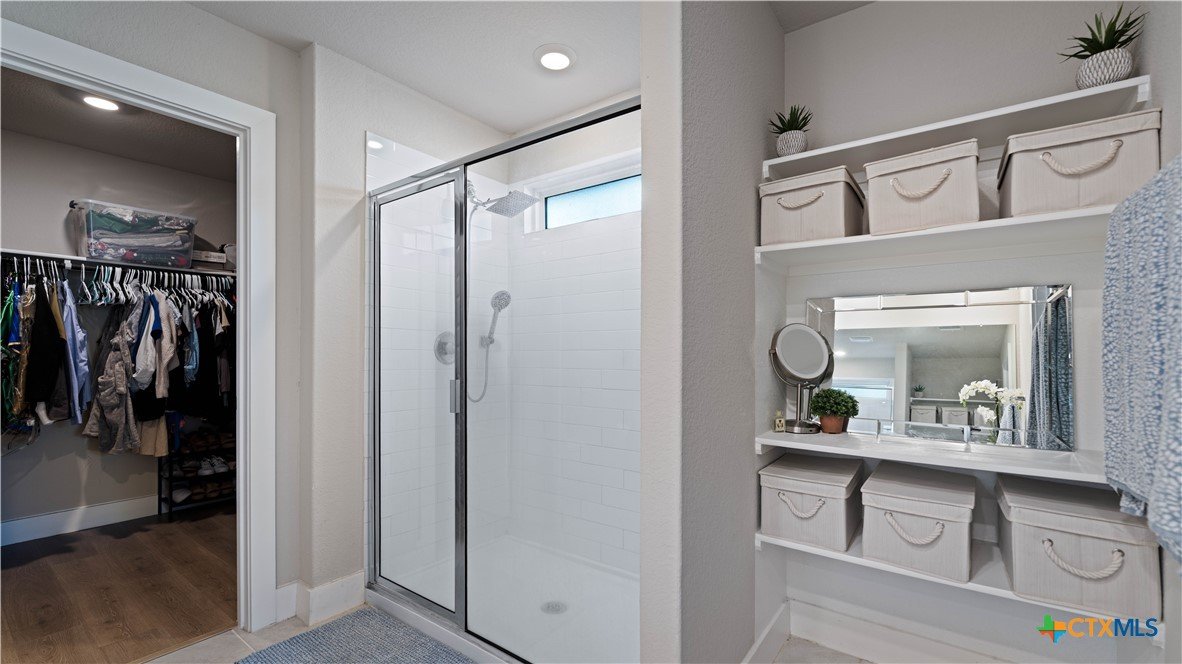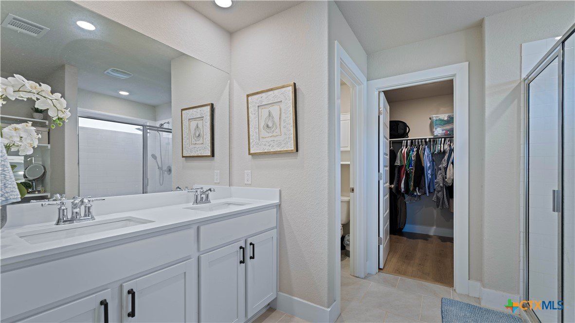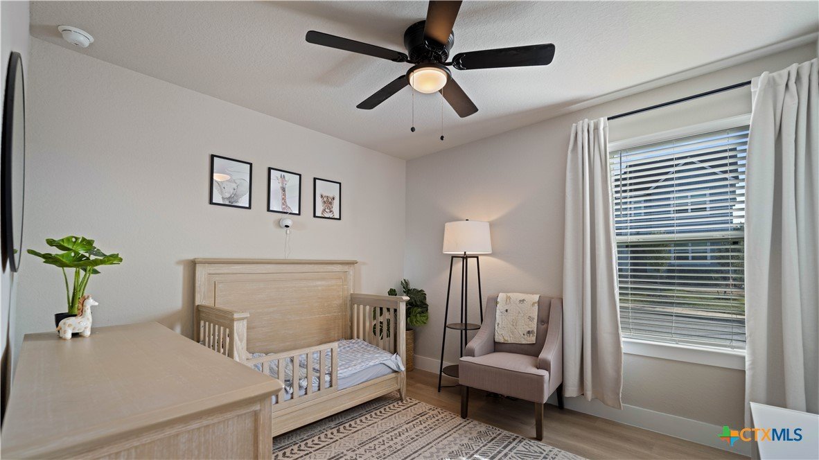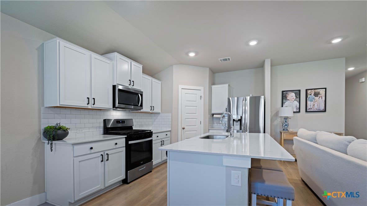 The Fargo plan blends timeless farmhouse inspiration with modern comfort in this beautifully crafted single-story home offering 1,665 square feet of thoughtfully designed living space. With four bedrooms and two bathrooms, the layout balances openness and privacy, beginning with an extended foyer that leads into a light-filled open-concept living room, kitchen, and dining room-ideal for both everyday living and entertaining. The kitchen is the heart of the home, featuring quartz countertops, stainless steel appliances, an oven/range combo, a walk-in corner pantry, and a generous center island with a deep single-bowl sink. A refrigerator is included for added convenience. Light oak Mohawk RevWood flooring throughout the home enhances the farmhouse aesthetic with warmth, durability, and a cohesive upscale finish. The dining room opens to a covered patio and professionally landscaped backyard with full irrigation, creating a seamless indoor-outdoor living experience. Privately situated, the primary suite offers a serene retreat with dual vanity sinks, an expansive walk-in closet, a separate water closet, and a spacious walk-in shower accented with classic white subway tile. Three secondary bedrooms and a full bathroom are thoughtfully positioned on the opposite side of the home for comfort and privacy. Additional highlights include tile flooring in all bathrooms and the utility room, faux wood cordless window blinds, and a pre-plumbed water softener loop. Completing the home is the Home Is Connected Smart Home package, featuring a smart thermostat, smart light switch, home hub, smart front door lock, video doorbell, and 24/7 video surveillance, offering modern convenience and peace of mind. VA Loan Assumption for VA buyer available!