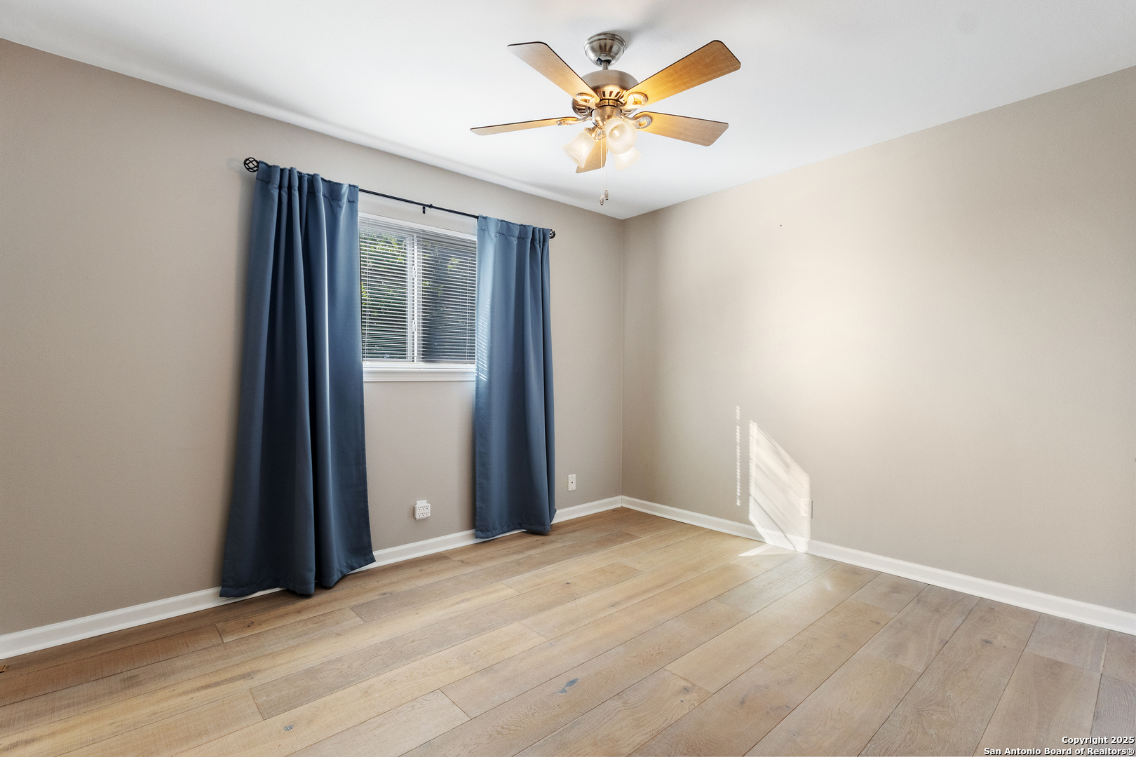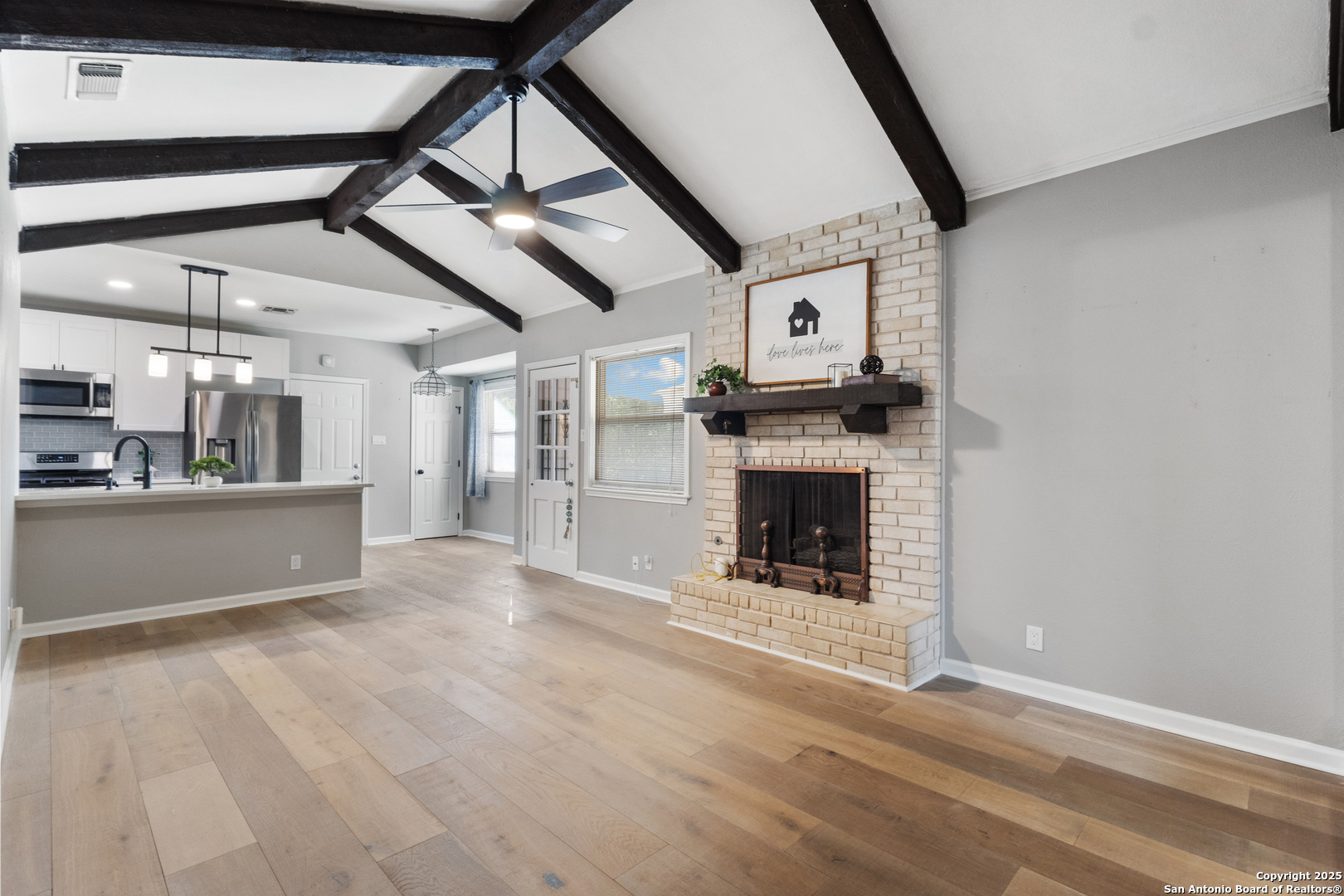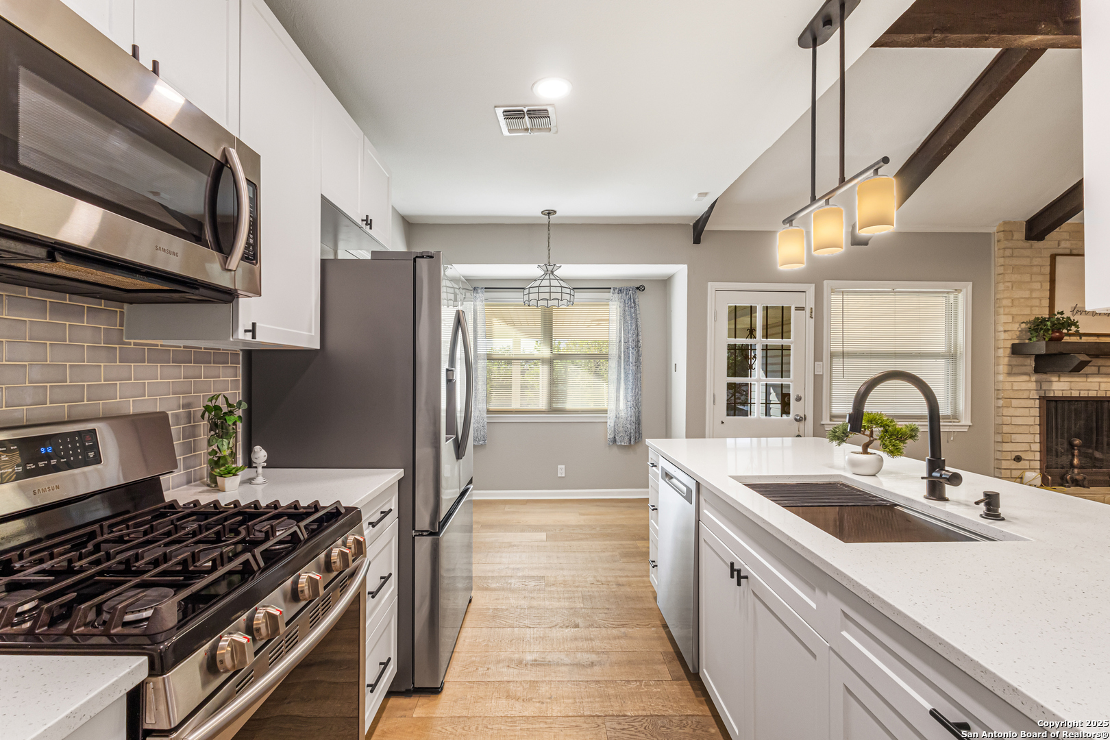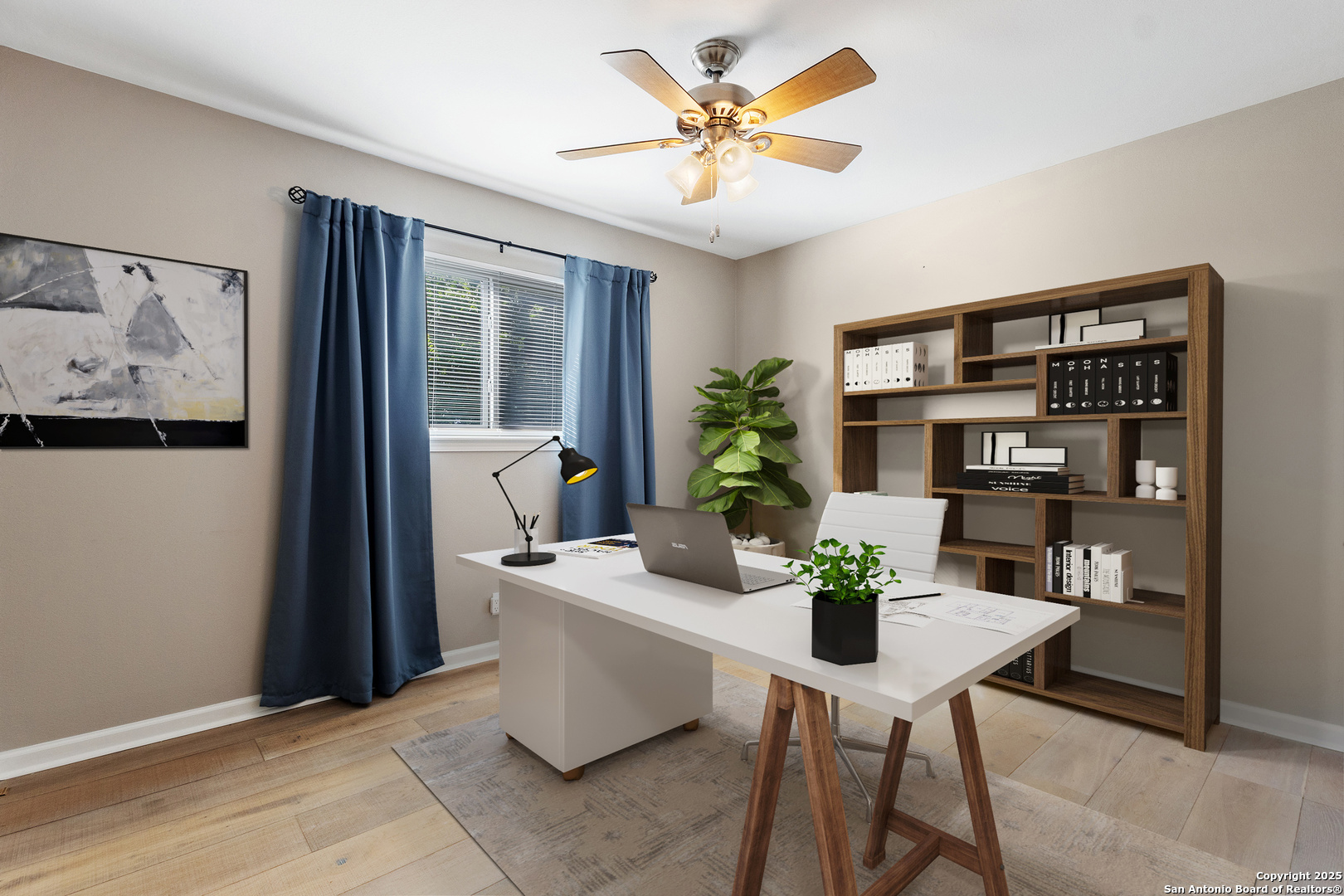 Well cared for one story home offering 4 bedrooms, 2 baths, updated kitchen, modern engineered wood flooring and neutral colors through out. Welcoming covered front porch leads into the living and dining rooms. The second living or family room has gas fireplace and the layout is open to the kitchen. Additional seating for entertaining can be added at the quartz countertop breakfast bar. The bedrooms are spacious with ample closet space. The home offers comfortable living space and is well lit from the natural light. Enjoy Texas BBQ's on the large covered back patio. Backyard has plenty of room for gardening, room to run and is maintainable. Home is energy efficient with newer windows and ceiling fans. Views of the South Texas Medical Center skyline, home to the major hub of medical treatment, education and research. Convenient to universities, shops and restaurants. Walk to Oak Hills Elementary. Schedule your private showing located in the heart of Oak Hills Terrace.