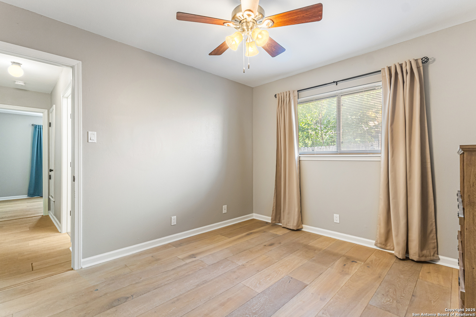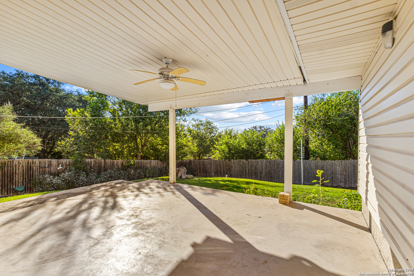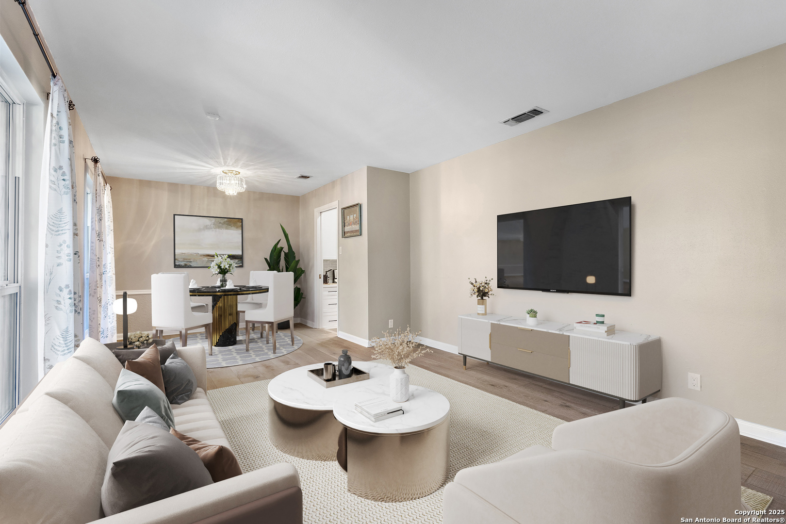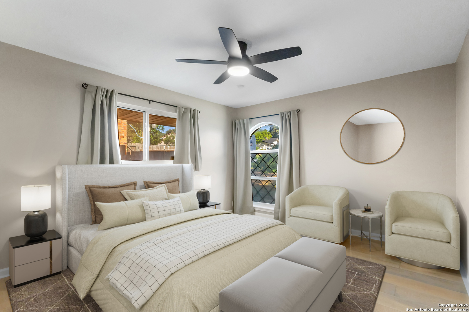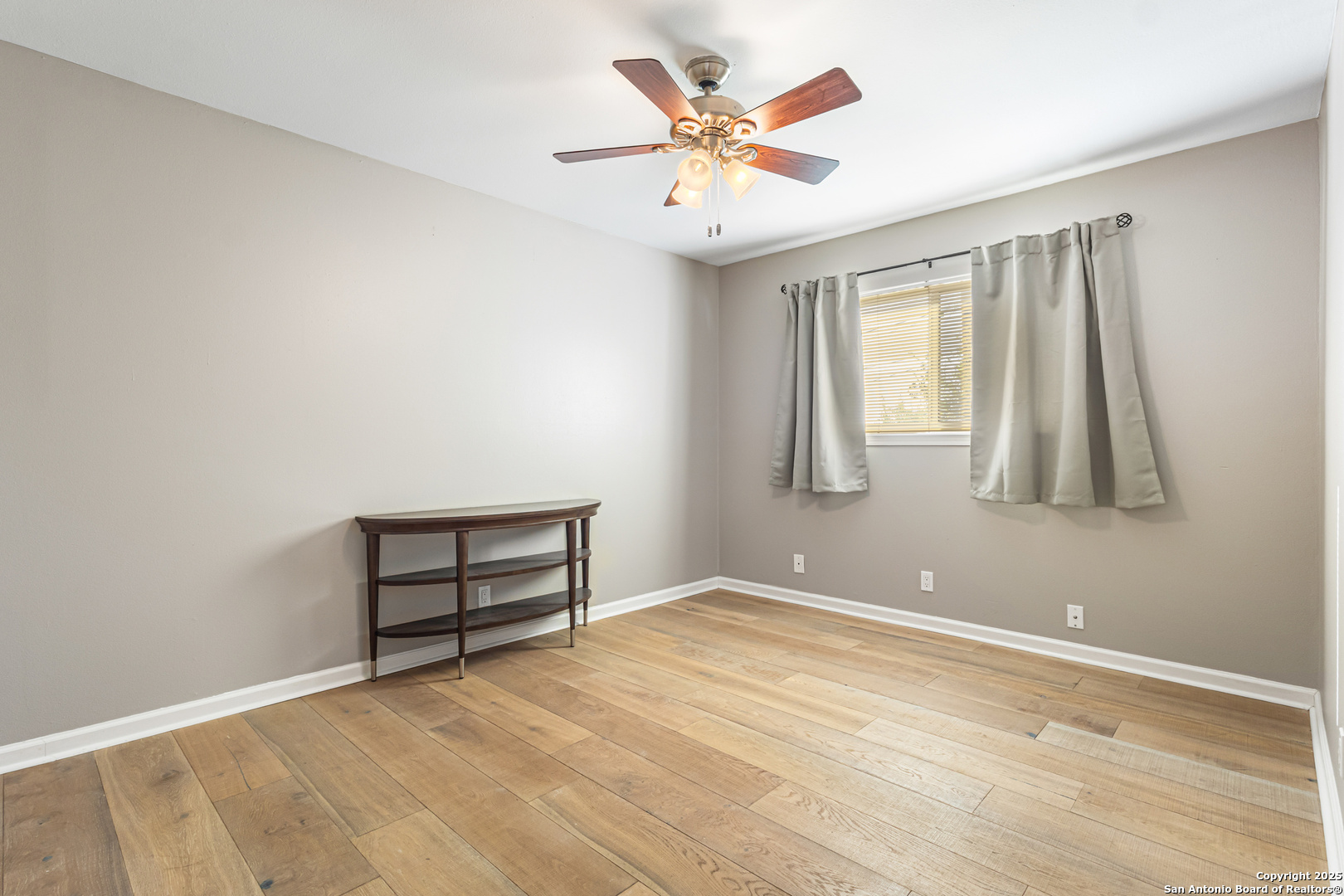 Well cared for one story home offering 4 bedrooms, 2 baths, updated kitchen, modern engineered wood flooring and neutral colors through out. Welcoming covered front porch leads into the living and dining rooms. The second living or family room has gas fireplace and the layout is open to the kitchen. Additional seating for entertaining can be added at the quartz countertop breakfast bar. The bedrooms are spacious with ample closet space. The home offers comfortable living space and is well lit from the natural light. Enjoy Texas BBQ's on the large covered back patio. Backyard has plenty of room for gardening, room to run and is maintainable. Home is energy efficient with newer windows and ceiling fans. Views of the South Texas Medical Center skyline, home to the major hub of medical treatment, education and research. Convenient to universities, shops and restaurants. Walk to Oak Hills Elementary. Schedule your private showing located in the heart of Oak Hills Terrace.