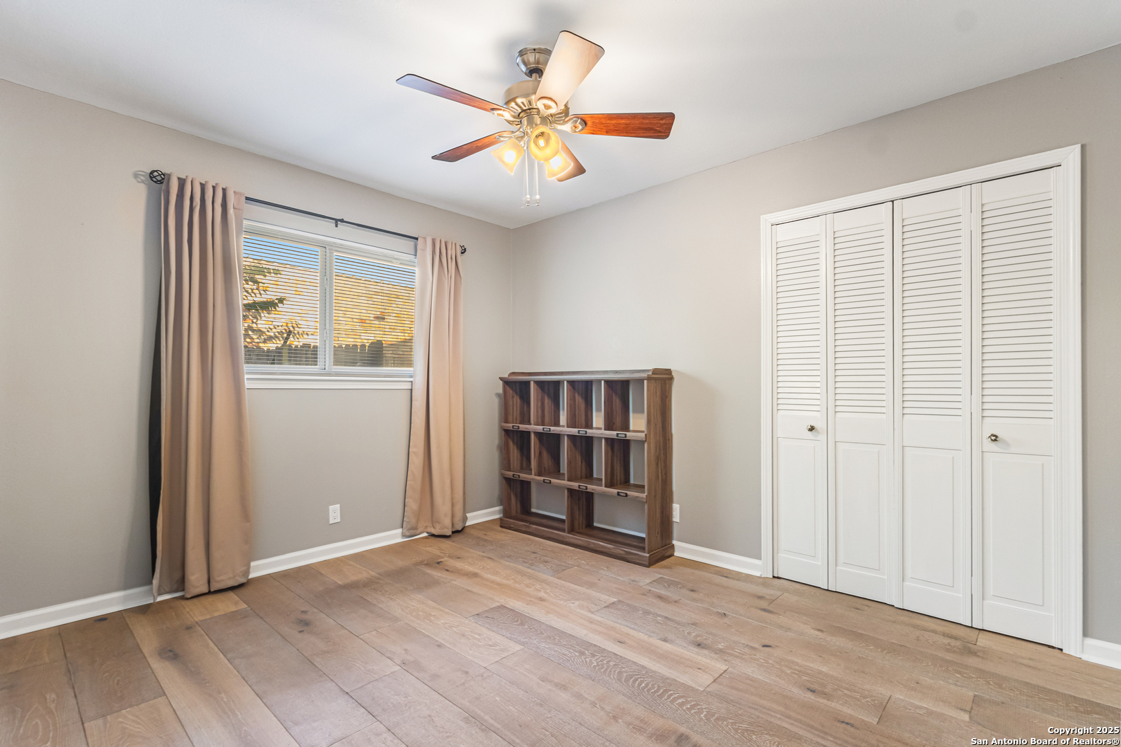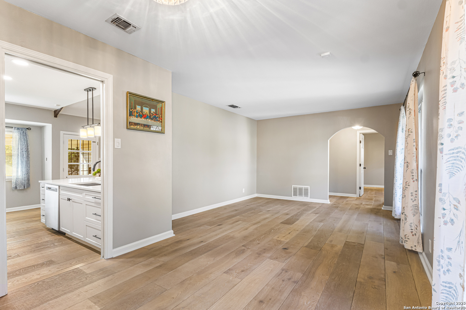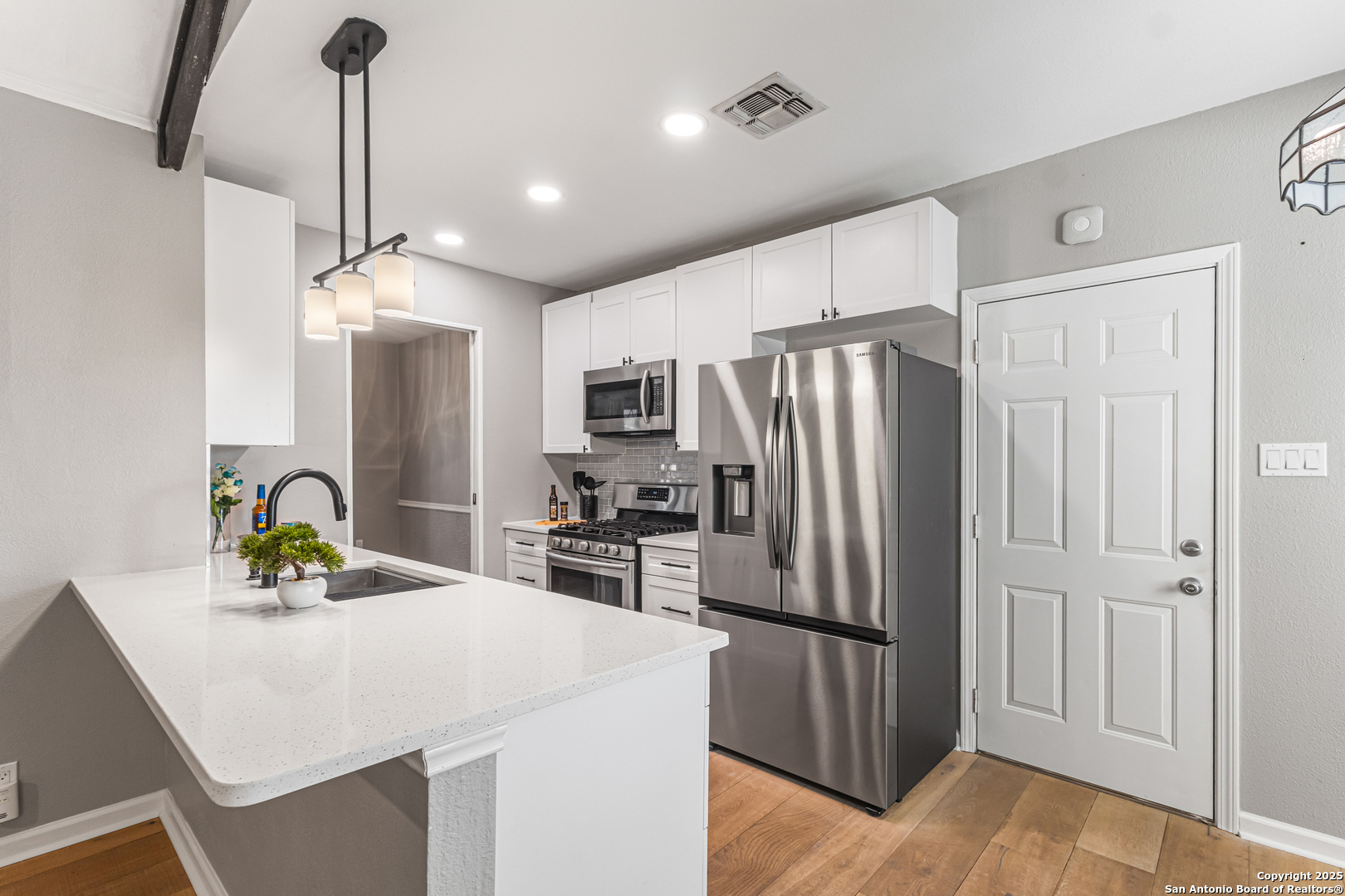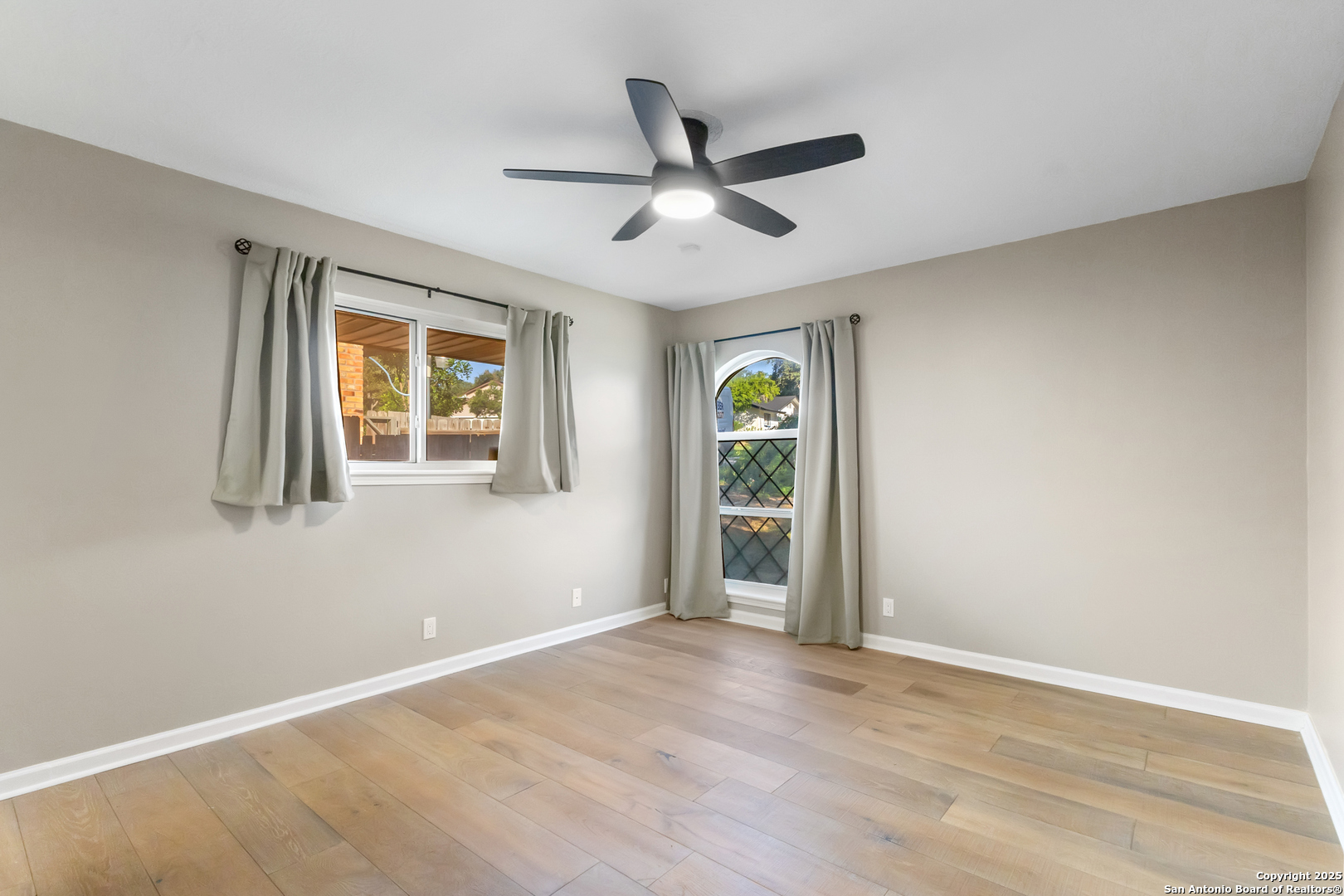 Well cared for one story home offering 4 bedrooms, 2 baths, updated kitchen, modern engineered wood flooring and neutral colors through out. Welcoming covered front porch leads into the living and dining rooms. The second living or family room has gas fireplace and the layout is open to the kitchen. Additional seating for entertaining can be added at the quartz countertop breakfast bar. The bedrooms are spacious with ample closet space. The home offers comfortable living space and is well lit from the natural light. Enjoy Texas BBQ's on the large covered back patio. Backyard has plenty of room for gardening, room to run and is maintainable. Home is energy efficient with newer windows and ceiling fans. Views of the South Texas Medical Center skyline, home to the major hub of medical treatment, education and research. Convenient to universities, shops and restaurants. Walk to Oak Hills Elementary. Schedule your private showing located in the heart of Oak Hills Terrace.