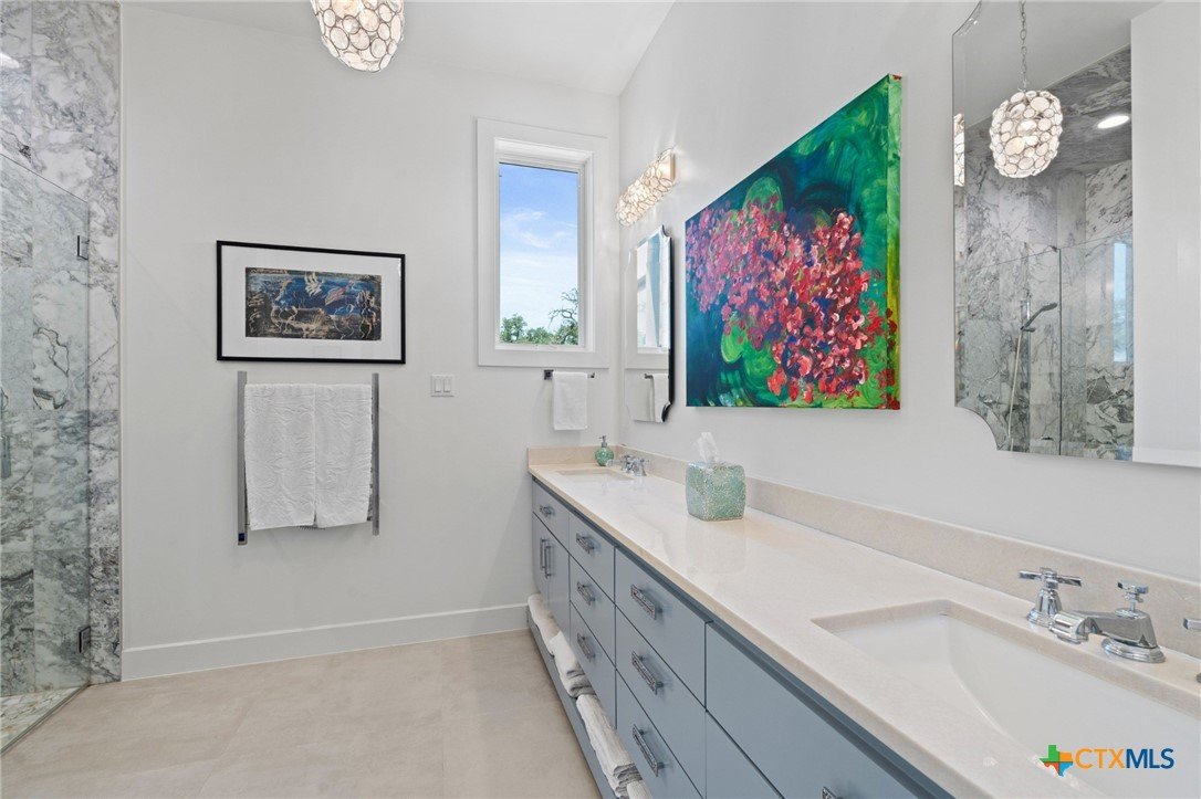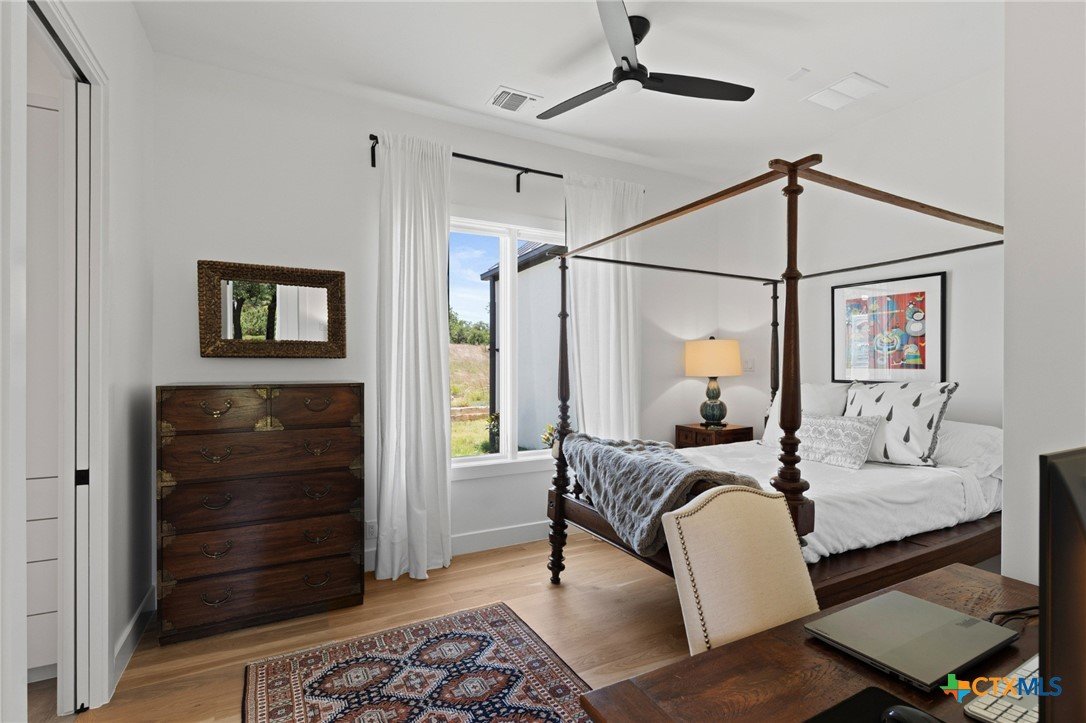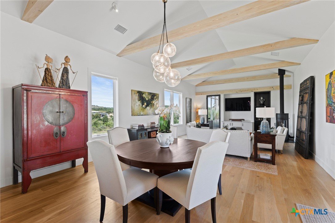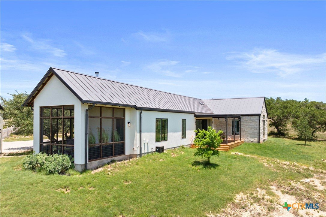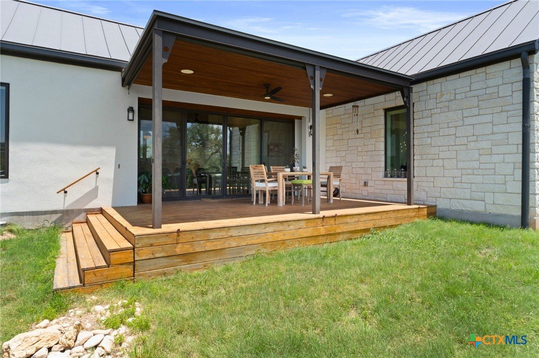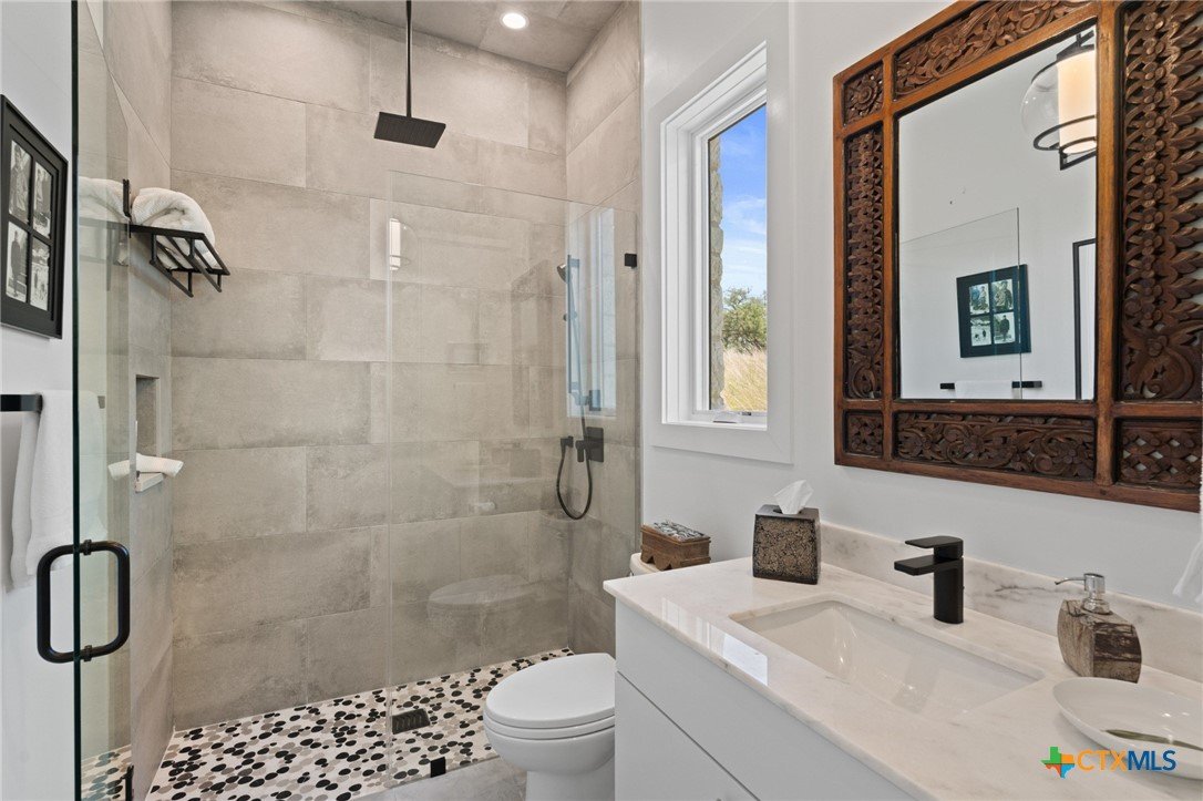Experience luxury living at the exclusive ag-exempt ranch community, the Preserve at Walnut Springs. This development spans 2,000 acres with 66 lots, 1,500 of those acres are protected open space. Set in the Texas Hill Country, enjoy the good life with 22 miles of private trails for hiking, biking, and horseback riding. Perched on a scenic hilltop overlooking a tranquil pond and Towhead Creek, this beautifully crafted 4/bed, 4/bath, contemporary home sits on 6.82 private acres. Designed by renowned architect Tim Brown and built in 2022, the 2,722-square-foot home blends elegant design with natural materials, including French-country hardwood flooring and elegant lighting. 13’6” cathedral ceilings enclose the main living areas with Marvin doors/windows providing natural light. The wood-beamed ceilings, unique tilework, and a Bari wood-burning stove add warmth and character. The kitchen features Thermador appliances, including one electric oven and one propane oven/stovetop, custom cabinetry, and natural quartzite countertops. There are 3 covered outdoor living and entertaining areas all having stunning views of the Hill Country sunsets. Additionally, there is a detached, AC/heat workshop with an outdoor shower that can be used as a tool shop, office, or easily converted to guest quarters. Atop the carport building is a spacious 30’ x 30’ storage attic. Living at the Preserve at Walnut Springs offers access to top-tier amenities, including a clubhouse, two pools, tennis courts, stocked fishing ponds, a spring-fed swimming hole, hunting access, and an equestrian center with stalls and a covered arena. Residents also benefit from a full-time concierge service, making life here heavenly at a tremendous value. Located eight miles outside of Johnson City, close to Hye and Fredericksburg, and only an hour from both Austin and San Antonio, this property offers the perfect blend of luxury, privacy, and Texas Hill Country charm.