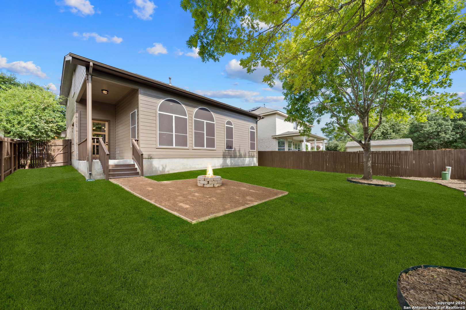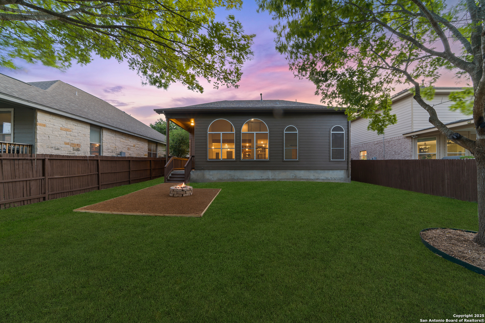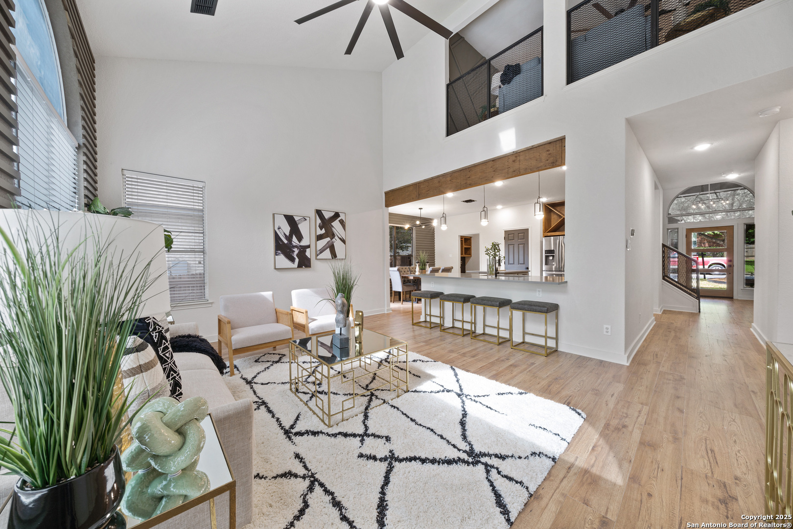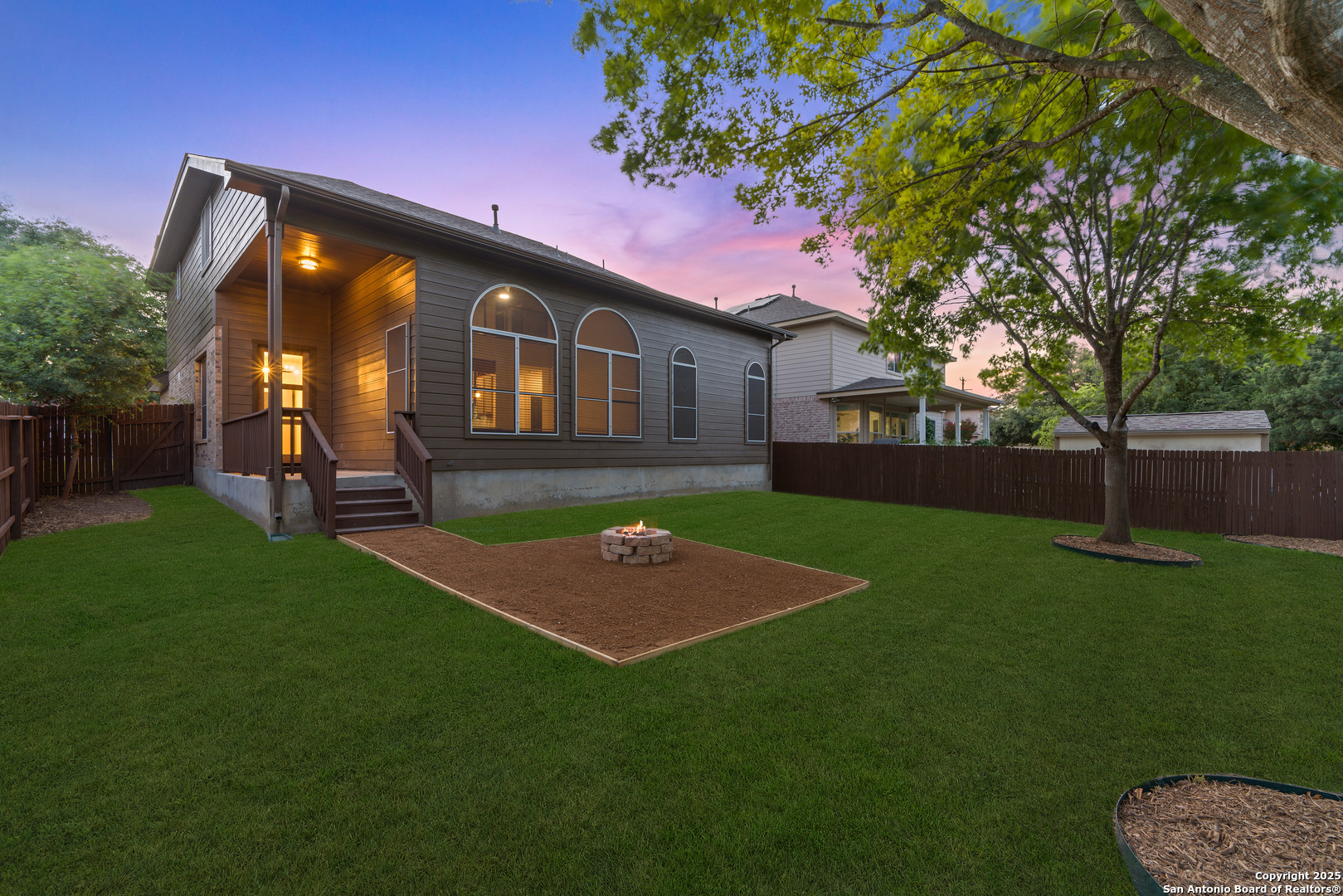 Spacious 4 bedroom, 2 and a half bath home in Alamo Ranch boasting human centered design. Expansive ceilings in entrance and living room with extra large windows & new energy saving solar screens. All new flooring, quartz countertops, custom cabinetry to ceiling with upgraded hardware, stainless steel vent hood with pot filler and tiled backsplash. Bathrooms feature frameless shower enclosures, shower tile to ceiling, custom mirrors, and decorative wall design elements at vanities. Half bath downstairs with decorative wainscot. Modern lighting and plumbing fixtures throughout, custom metal stair railing with decorative accent walls at Living Room, Game Room, Breakfast, Office & Bedrooms. 96" front and back doors, barn doors at Office and Master Bathroom. New Nest thermostat, garage door, and garage epoxy flooring. Brand new Owens Corning 30 yr roof, freshly landscaped exterior with 3' expansion on each side of driveway, and a firepit perfect for entertaining on Texas nights. MUST SEE HOME.