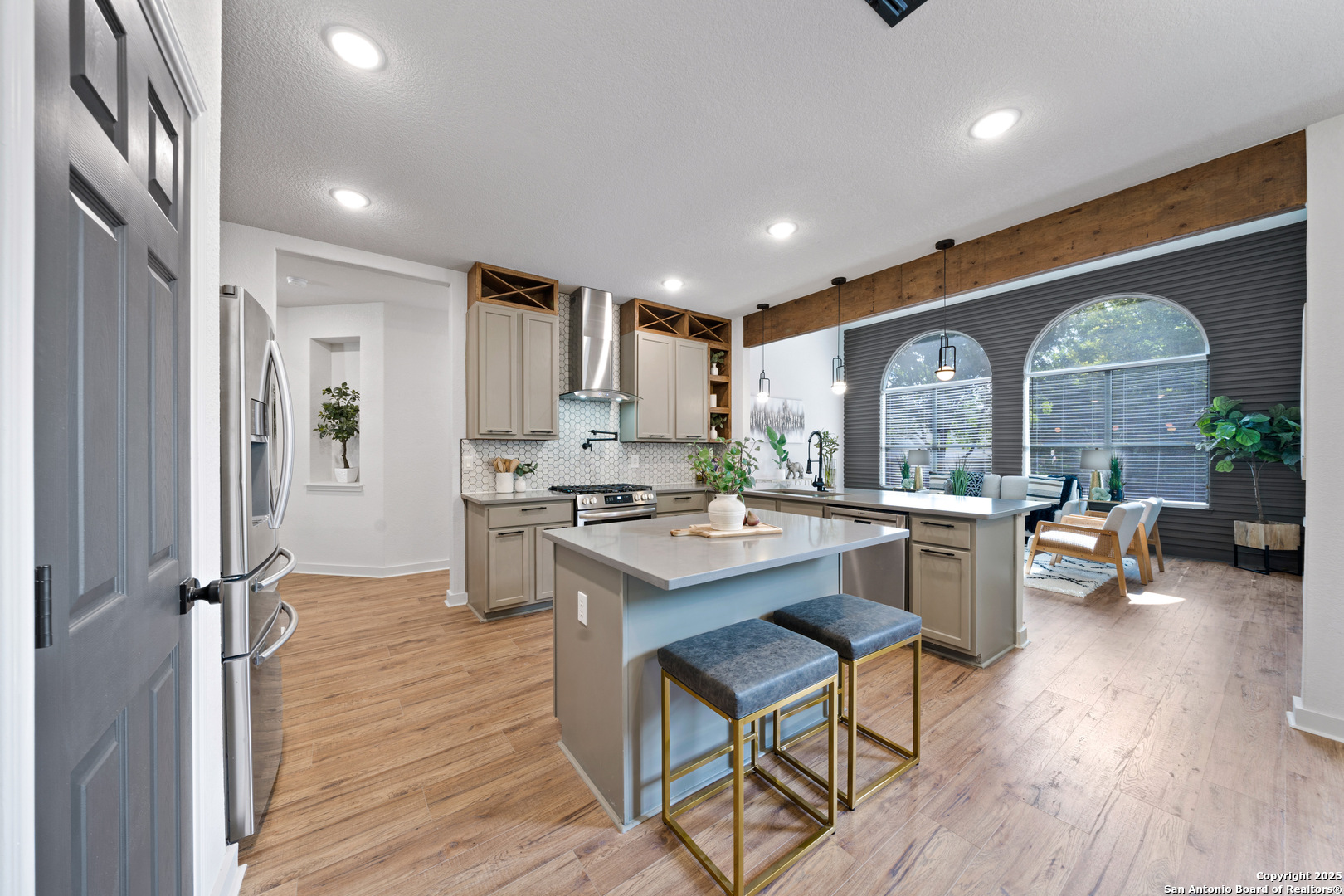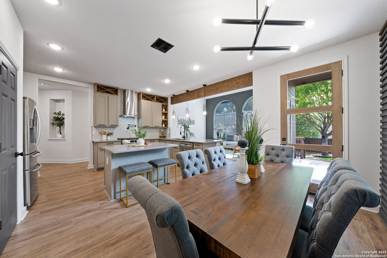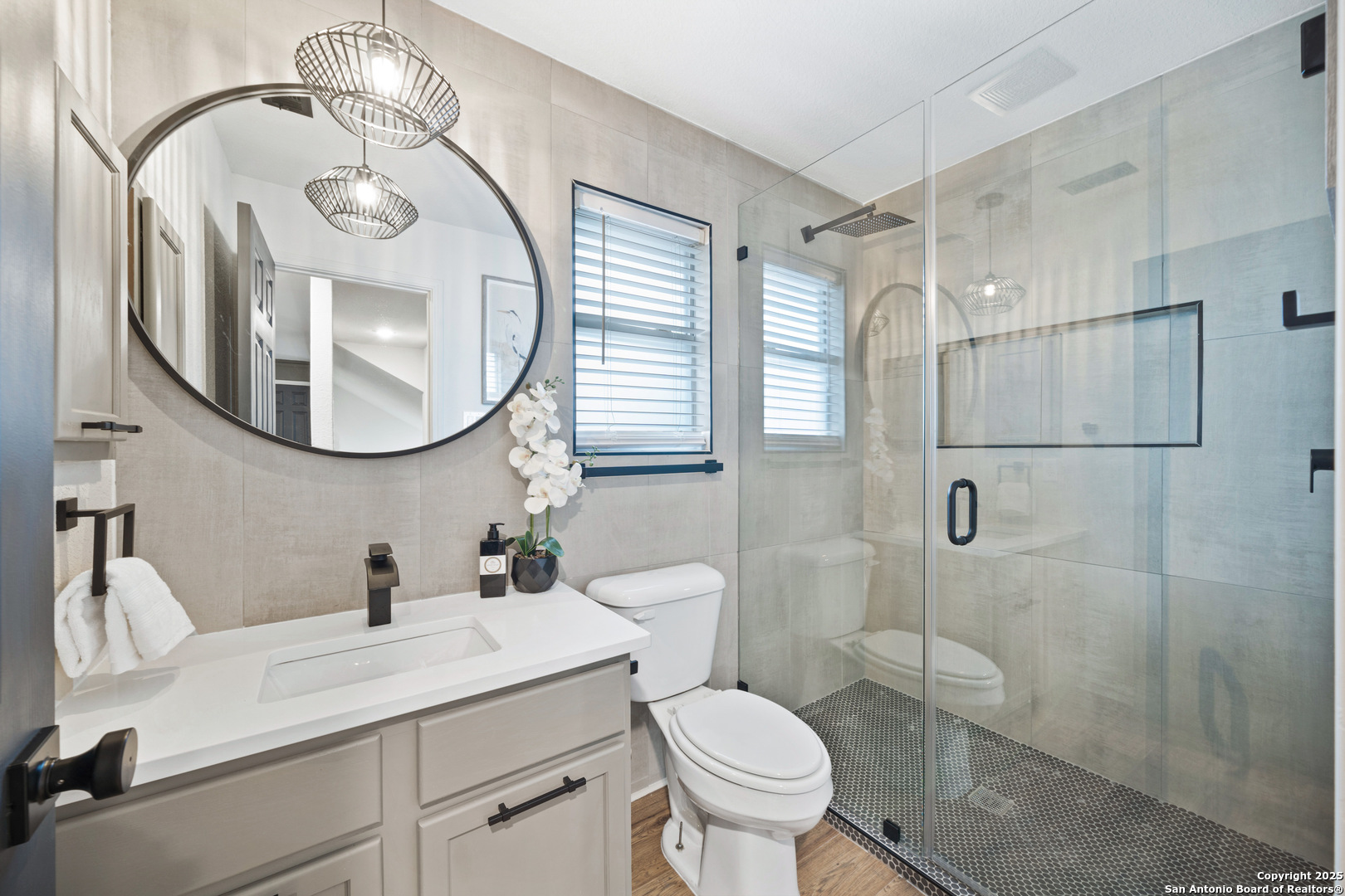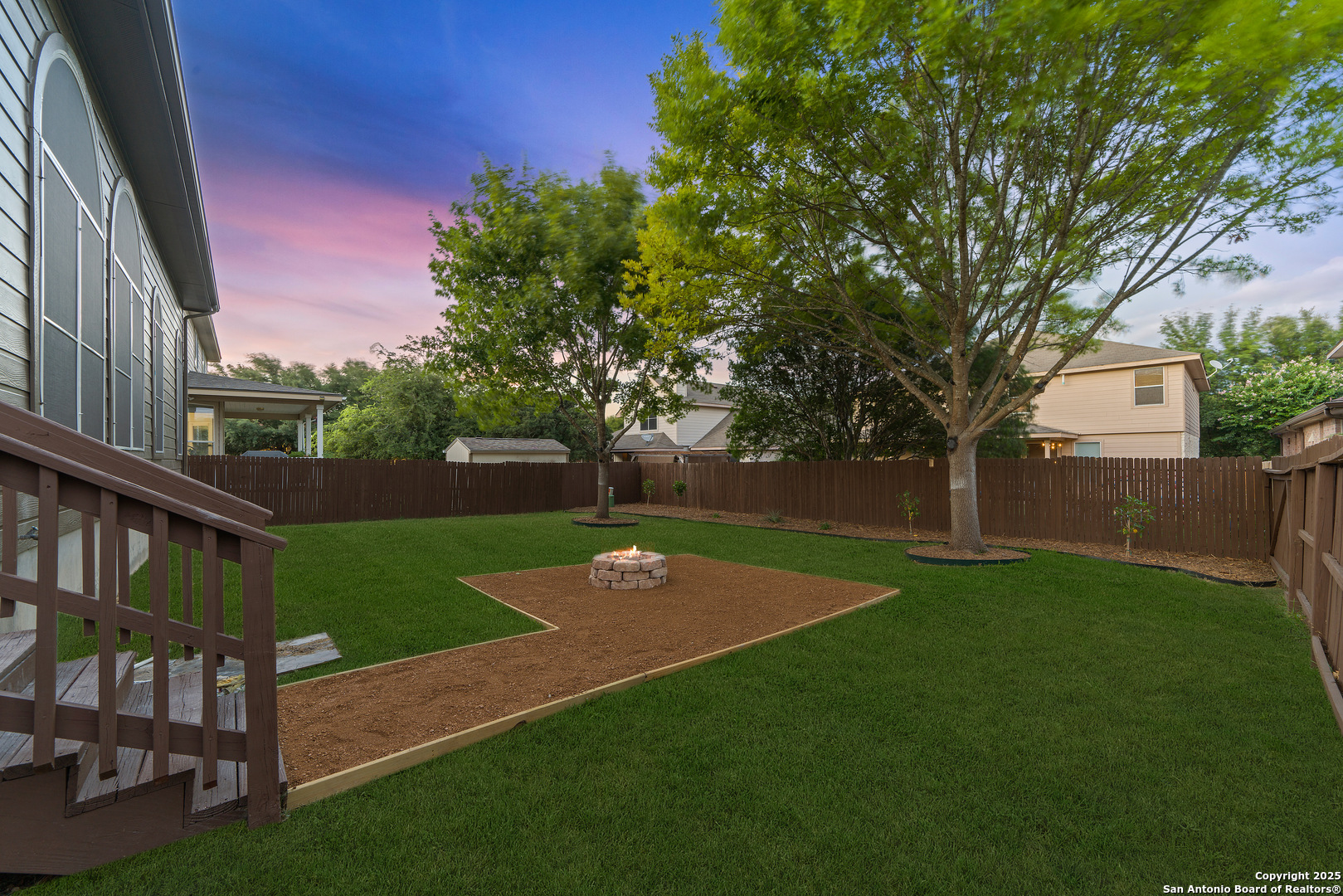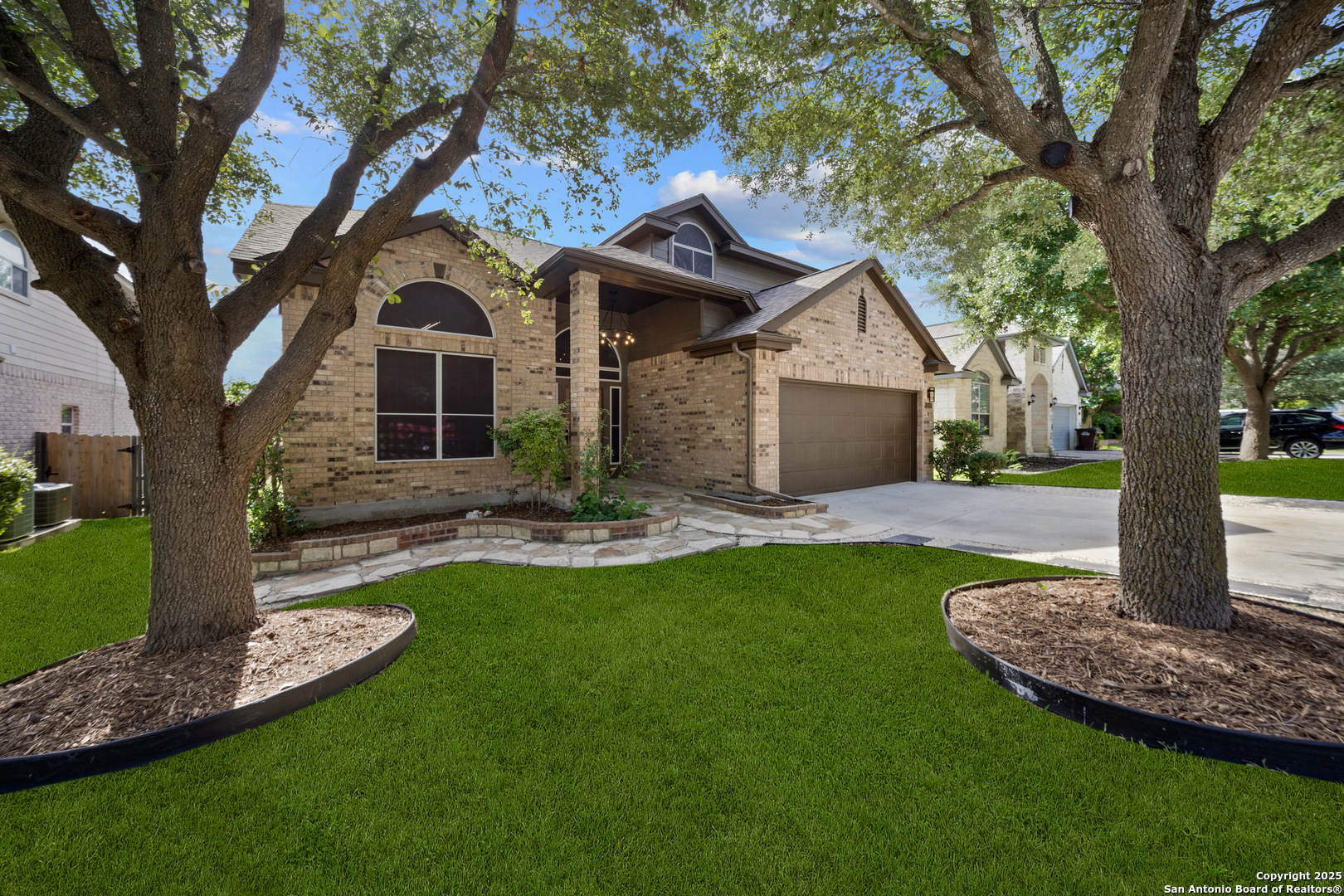Spacious 4 bedroom, 2 and a half bath home in Alamo Ranch boasting human centered design. Expansive ceilings in entrance and living room with extra large windows & new energy saving solar screens. All new flooring, quartz countertops, custom cabinetry to ceiling with upgraded hardware, stainless steel vent hood with pot filler and tiled backsplash. Bathrooms feature frameless shower enclosures, shower tile to ceiling, custom mirrors, and decorative wall design elements at vanities. Half bath downstairs with decorative wainscot. Modern lighting and plumbing fixtures throughout, custom metal stair railing with decorative accent walls at Living Room, Game Room, Breakfast, Office & Bedrooms. 96" front and back doors, barn doors at Office and Master Bathroom. New Nest thermostat, garage door, and garage epoxy flooring. Brand new Owens Corning 30 yr roof, freshly landscaped exterior with 3' expansion on each side of driveway, and a firepit perfect for entertaining on Texas nights. MUST SEE HOME.