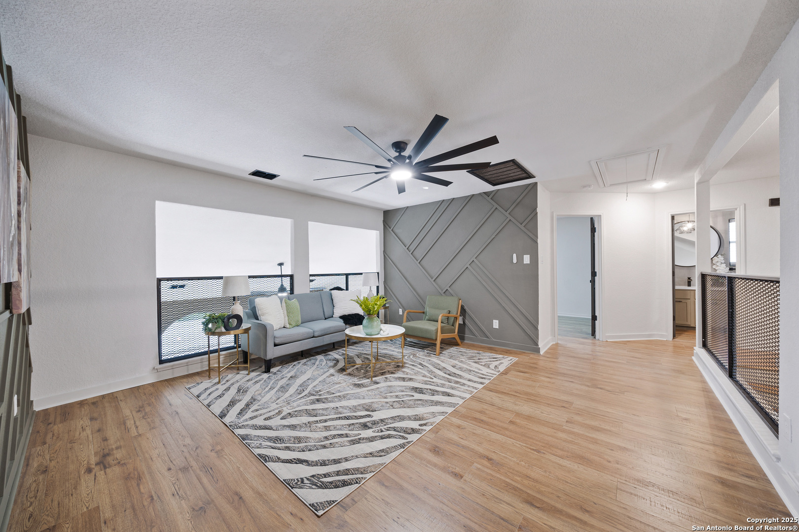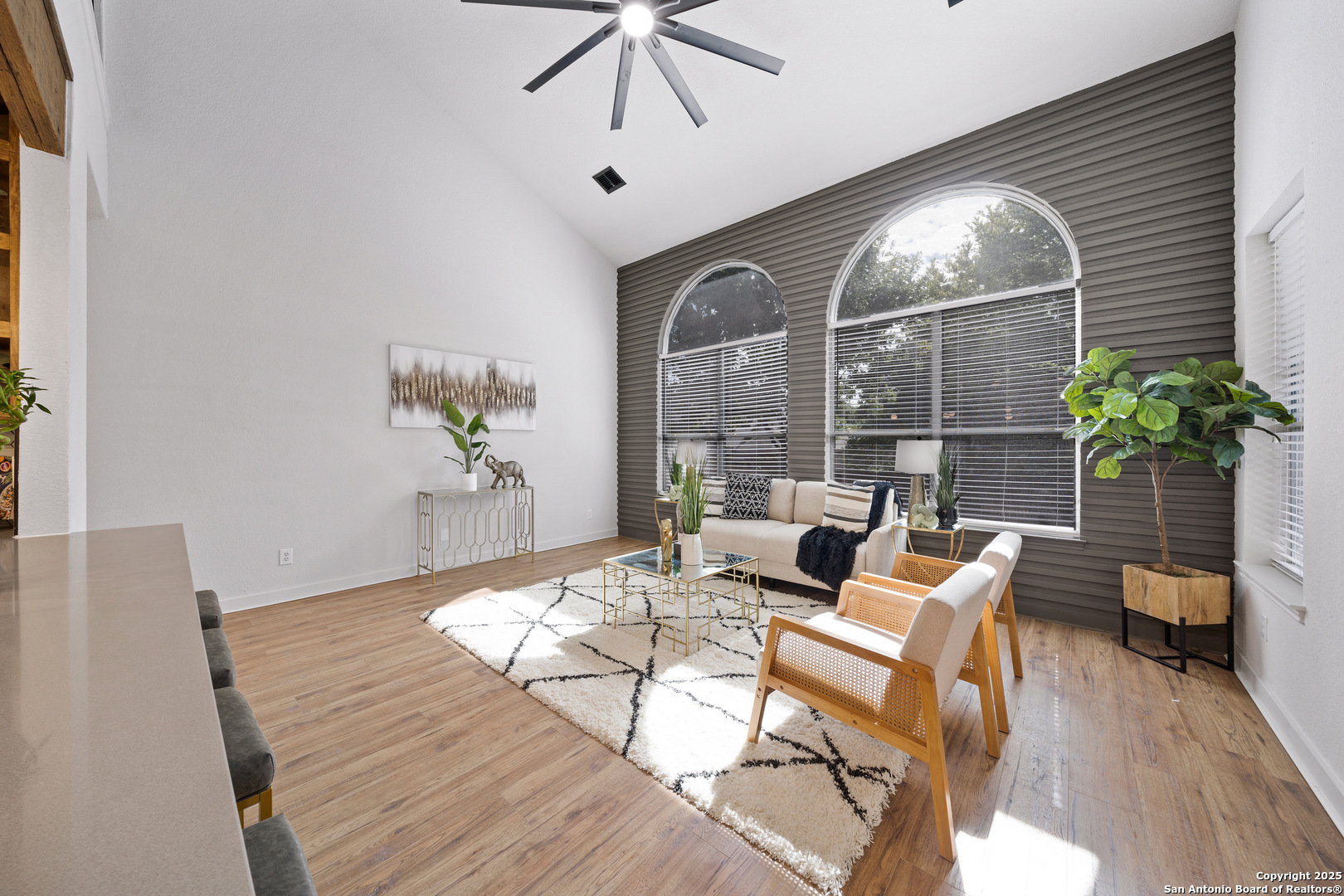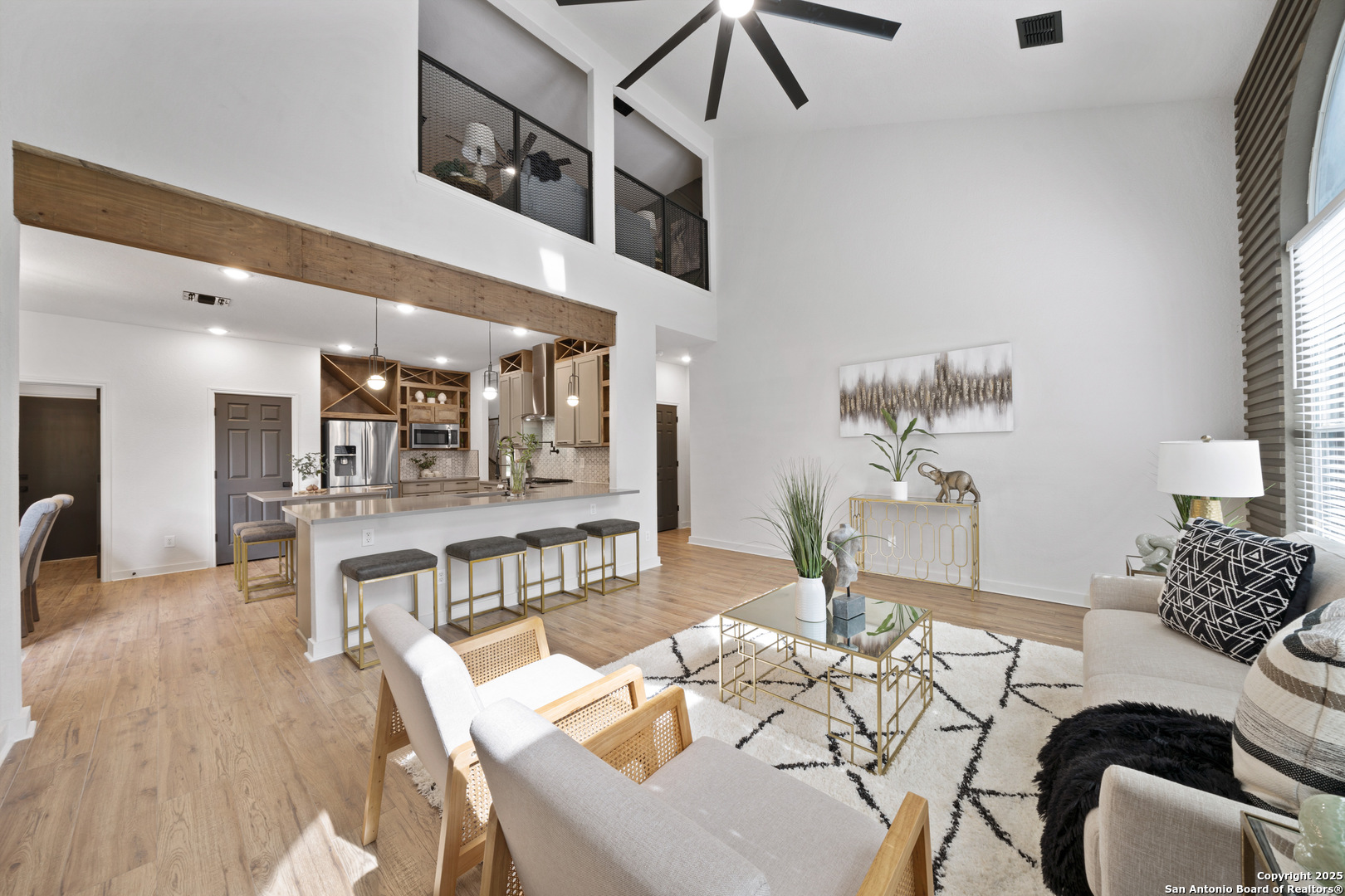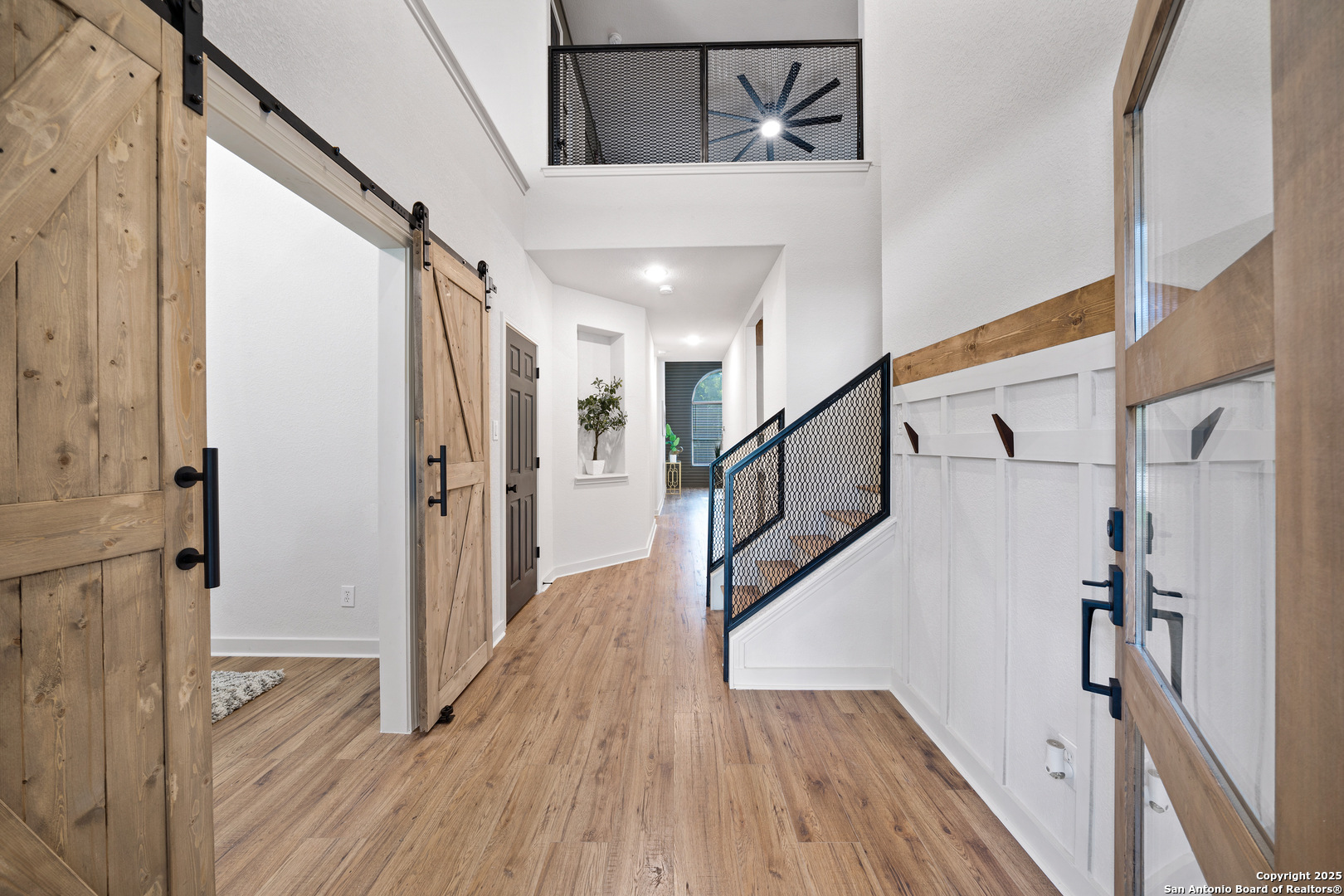 Spacious 4 bedroom, 2 and a half bath home in Alamo Ranch boasting human centered design. Expansive ceilings in entrance and living room with extra large windows & new energy saving solar screens. All new flooring, quartz countertops, custom cabinetry to ceiling with upgraded hardware, stainless steel vent hood with pot filler and tiled backsplash. Bathrooms feature frameless shower enclosures, shower tile to ceiling, custom mirrors, and decorative wall design elements at vanities. Half bath downstairs with decorative wainscot. Modern lighting and plumbing fixtures throughout, custom metal stair railing with decorative accent walls at Living Room, Game Room, Breakfast, Office & Bedrooms. 96" front and back doors, barn doors at Office and Master Bathroom. New Nest thermostat, garage door, and garage epoxy flooring. Brand new Owens Corning 30 yr roof, freshly landscaped exterior with 3' expansion on each side of driveway, and a firepit perfect for entertaining on Texas nights. MUST SEE HOME.