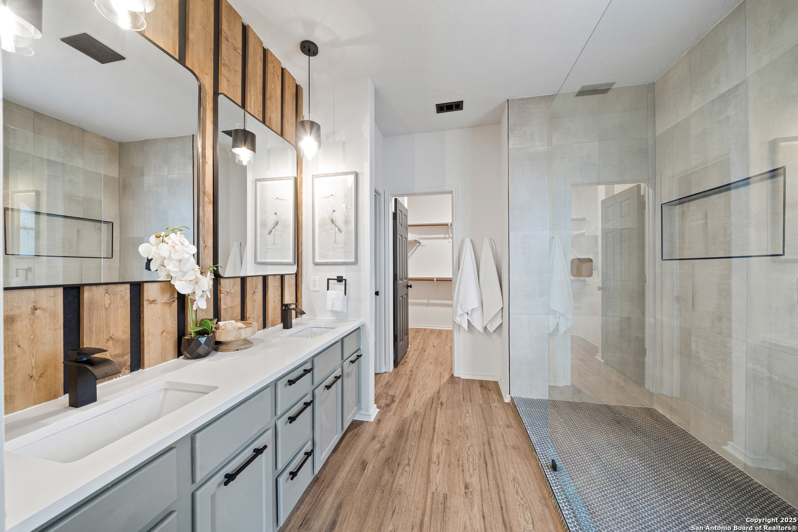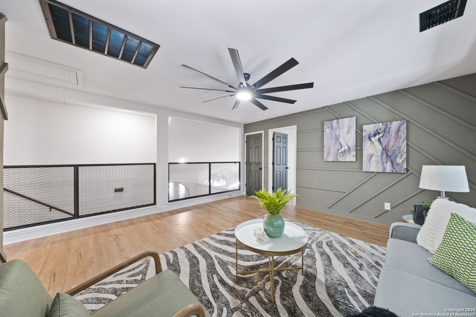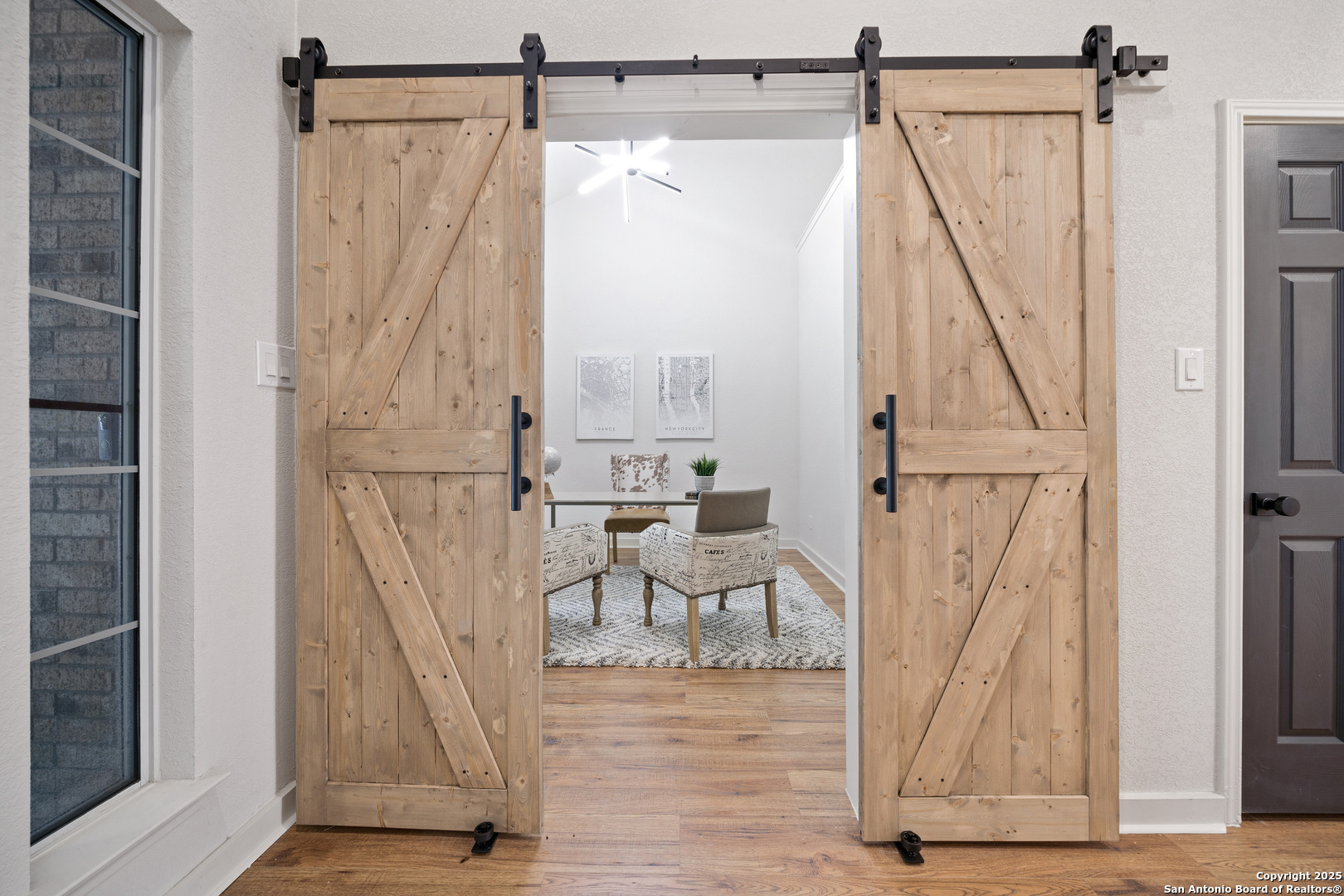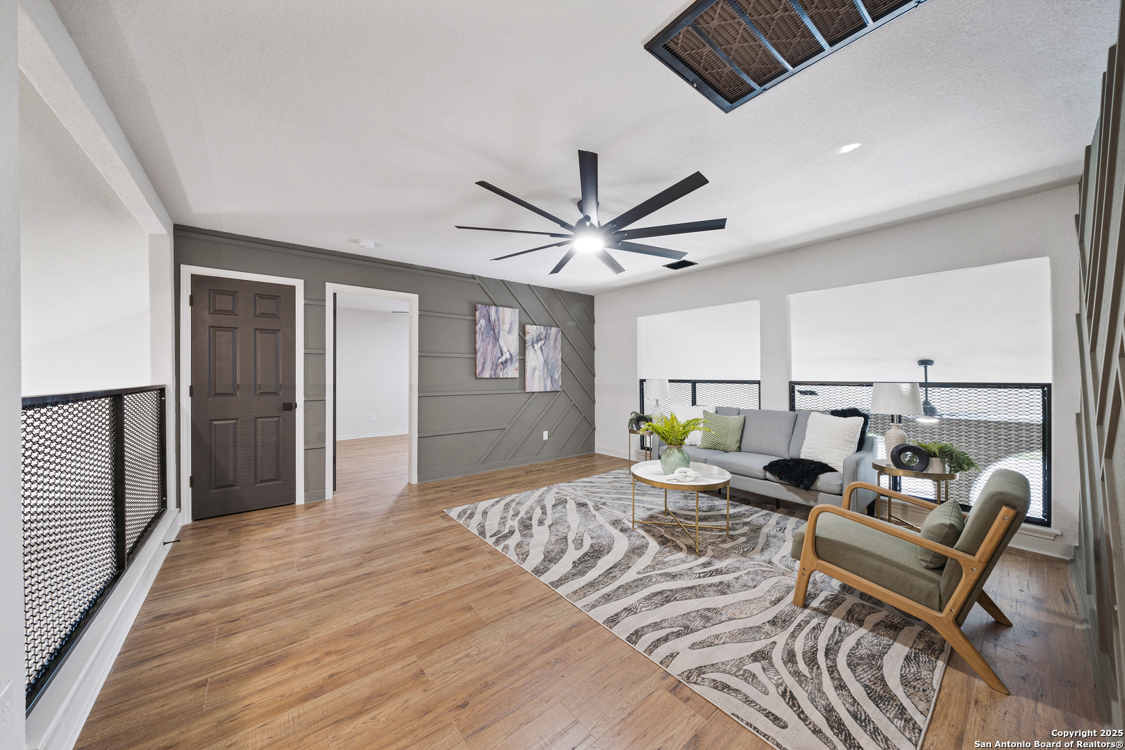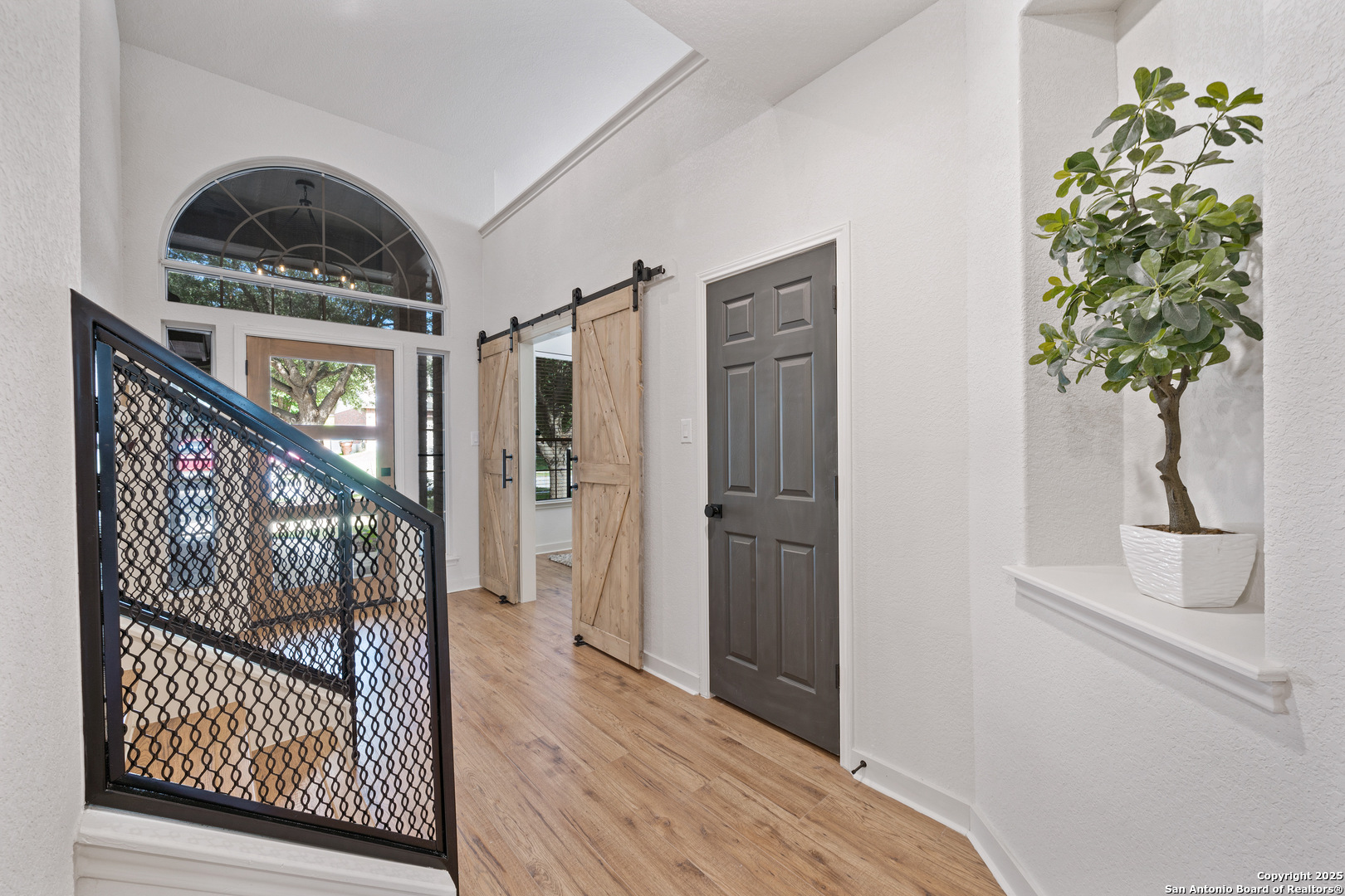 Spacious 4 bedroom, 2 and a half bath home in Alamo Ranch boasting human centered design. Expansive ceilings in entrance and living room with extra large windows & new energy saving solar screens. All new flooring, quartz countertops, custom cabinetry to ceiling with upgraded hardware, stainless steel vent hood with pot filler and tiled backsplash. Bathrooms feature frameless shower enclosures, shower tile to ceiling, custom mirrors, and decorative wall design elements at vanities. Half bath downstairs with decorative wainscot. Modern lighting and plumbing fixtures throughout, custom metal stair railing with decorative accent walls at Living Room, Game Room, Breakfast, Office & Bedrooms. 96" front and back doors, barn doors at Office and Master Bathroom. New Nest thermostat, garage door, and garage epoxy flooring. Brand new Owens Corning 30 yr roof, freshly landscaped exterior with 3' expansion on each side of driveway, and a firepit perfect for entertaining on Texas nights. MUST SEE HOME.