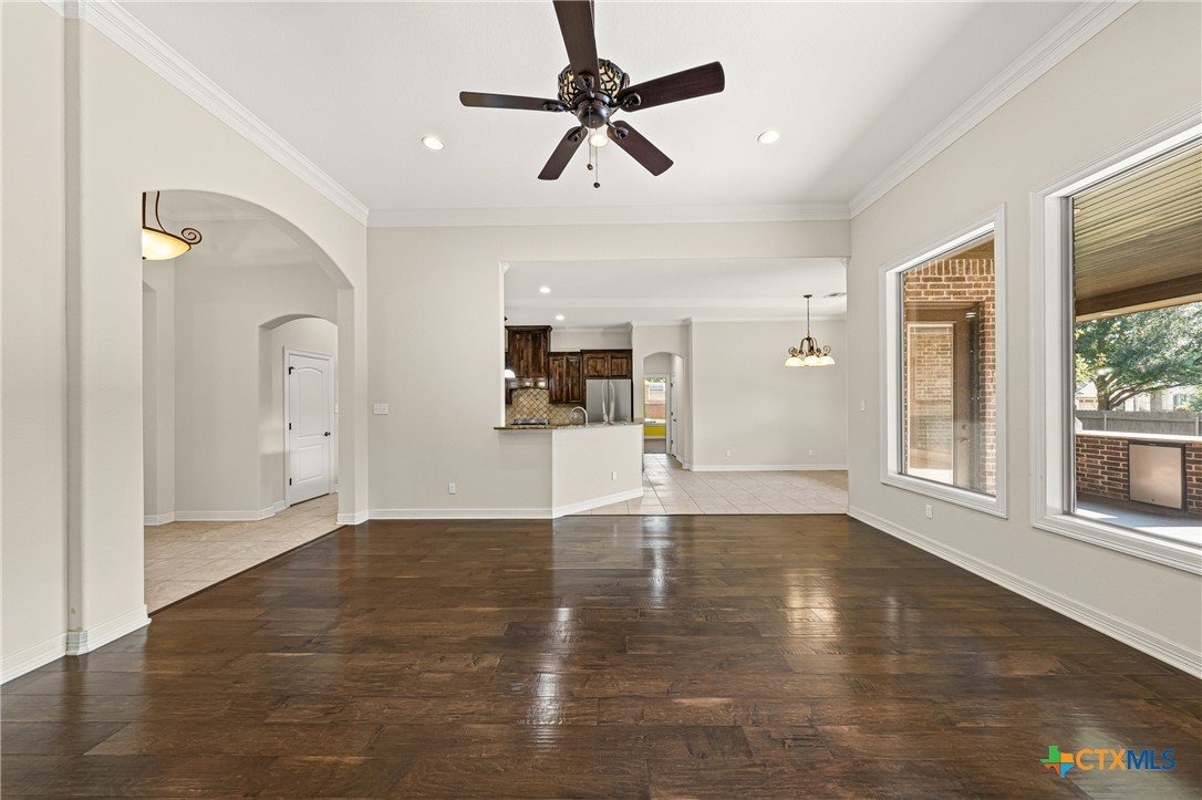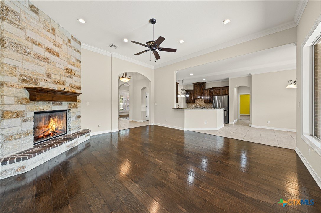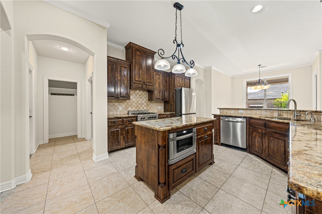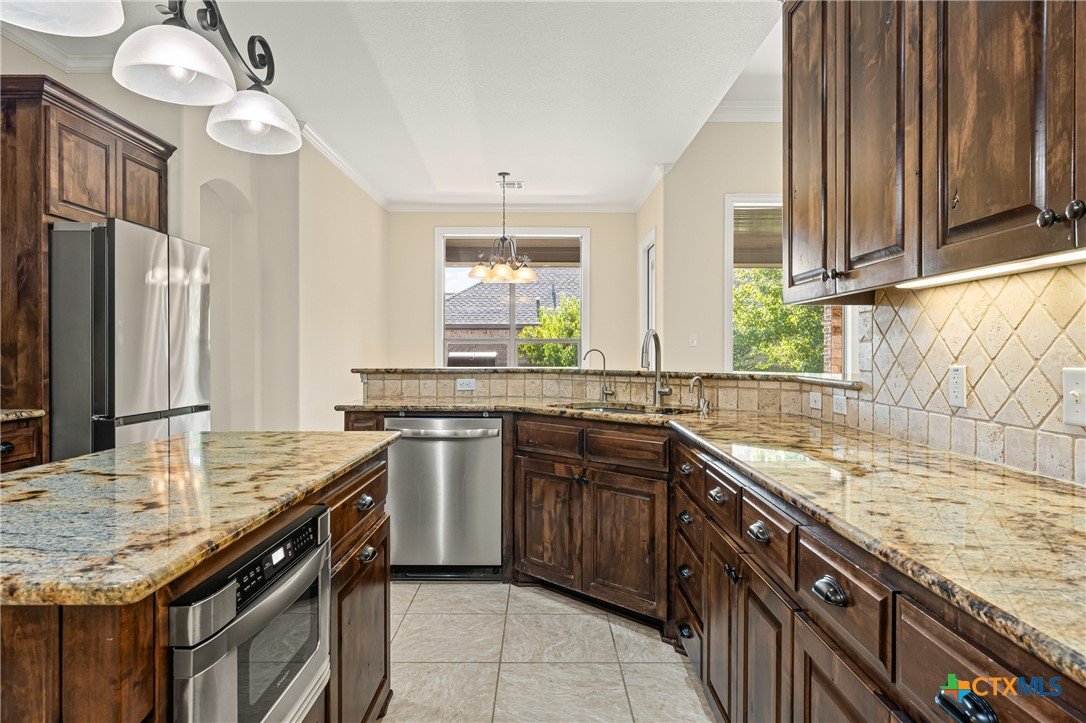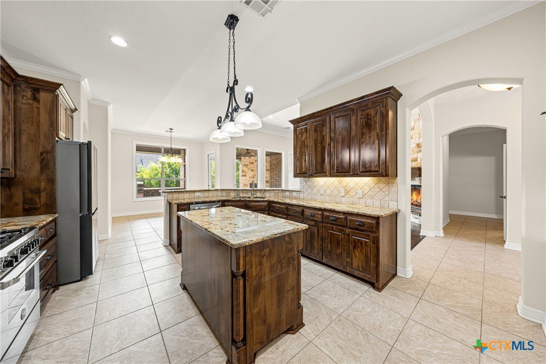 Discover your dream home in this prestigious gated community where luxury meets tranquility. This stunning 4-bedroom, 3.5-bathroom residence of thoughtfully designed living space that perfectly balances elegance with everyday functionality. Step inside to find both formal and informal dining areas, ideal for everything from intimate family meals to grand dinner parties. Custom Plantation Shutters added on front interior of the home. The heart of the home features a spacious family room anchored by a cozy fireplace, creating the perfect gathering spot for chilly evenings. The kitchen Has a gas stove, 2025 Samsung 4 door Refrigerator, Butler's pantry, custom wood cabinetry, center island, and counter prep space throughout. This east-facing covered patio extends the entertainment outdoors to your private outdoor fireplace area and outdoor kitchen for year around use. The floor plan includes extra space strategically positioned between two of the secondary bedrooms, offering endless possibilities as an office, guest room/bedroom, theatre, play area, or game room. The primary bedroom is split from the other bedrooms providing a perfect spa bathroom and bedroom retreat. An office space above the three-car side entry garage comes complete with its own mini-split air conditioning unit, providing a comfortable work-from-home sanctuary. This exceptional neighborhood offers the perfect blend of tranquility and convenience. Upgrades include fresh paint 8/2025, Roof replaced 5/2024, HVAC system updated 5/2023, including Smart Thermostat, and 4" media Air cleaner/filter, spray foam. You will appreciate proximity to schools, while the nearby Baylor Scott & White Medical Center ensures peace of mind with top-tier healthcare close by. The location truly shines with its easy access to diverse dining options, shopping centers, and essential services. Whether you're grabbing groceries, enjoying a night out, or running daily errands, everything you need is within comfortable reach.