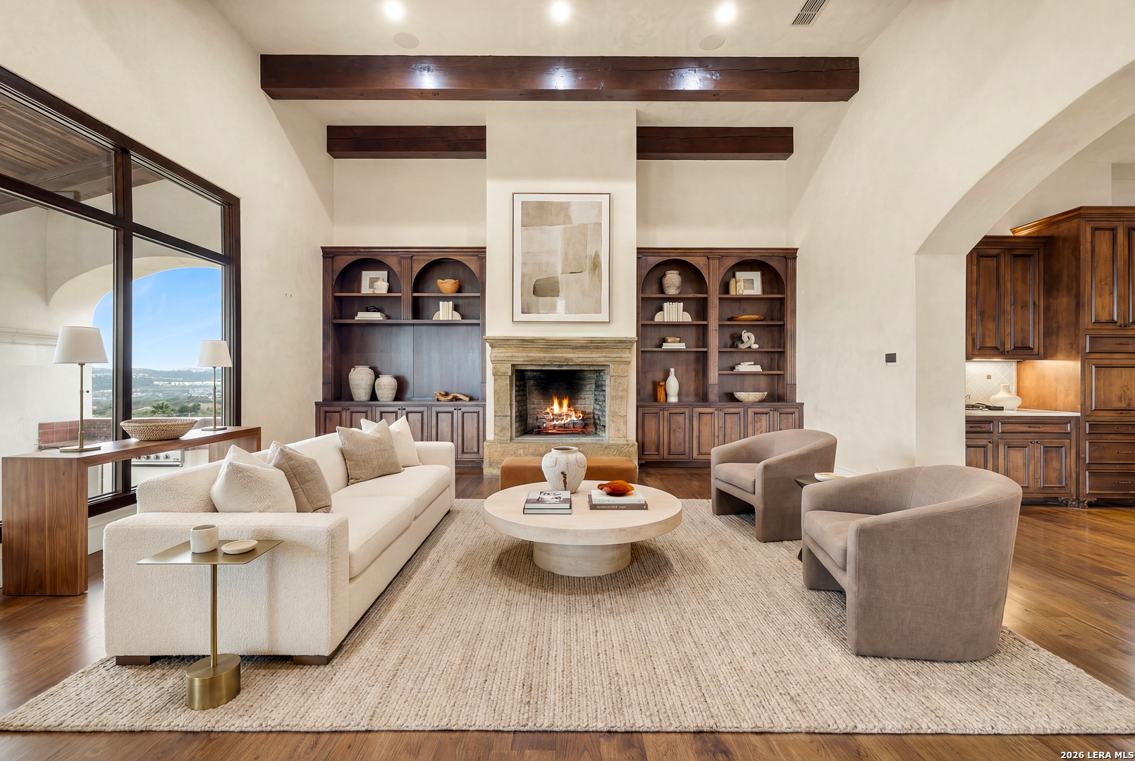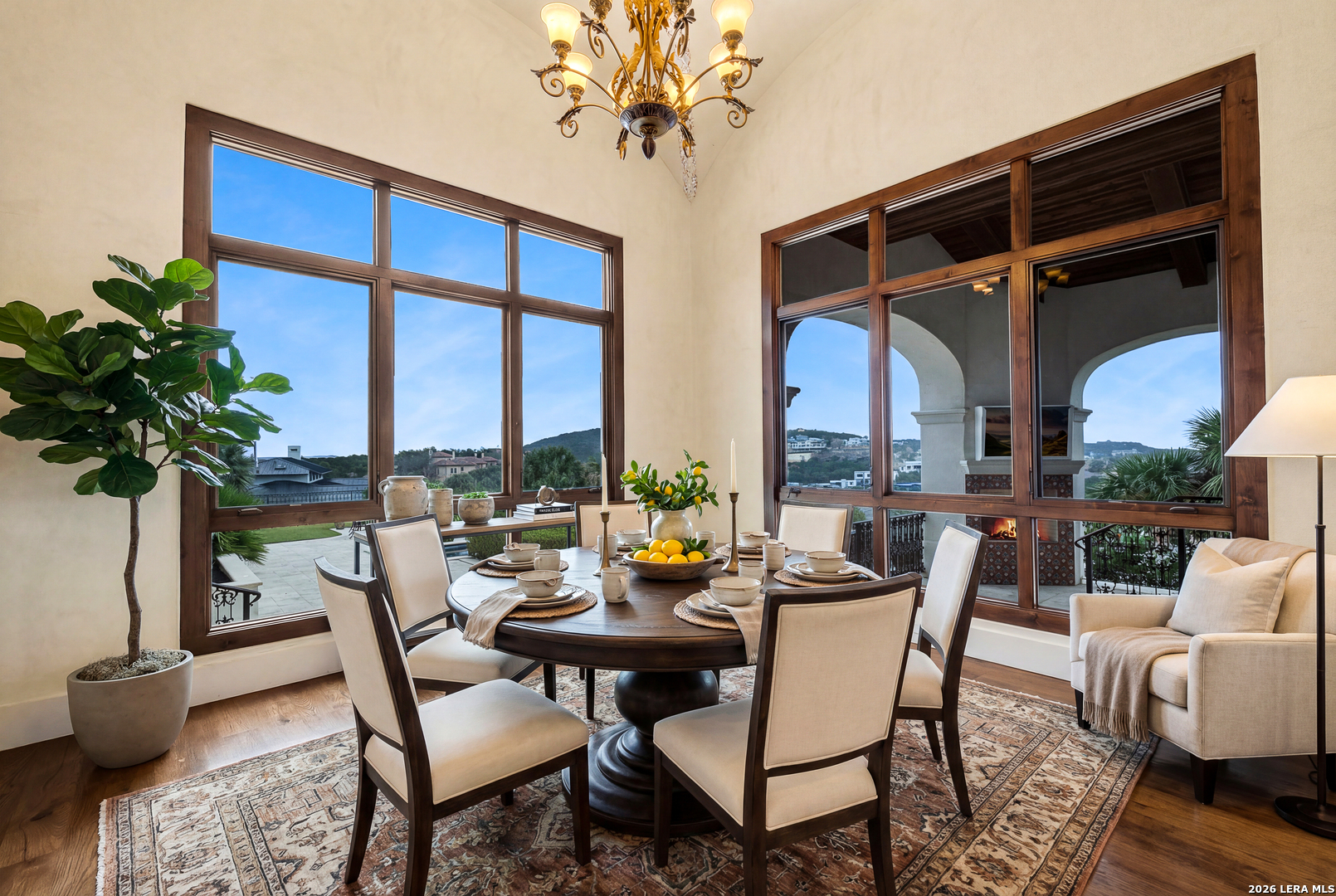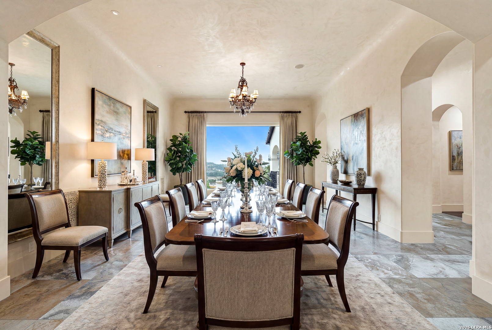 A magnificent California-styled Mansion is privately situated behind gates and sits up high on a 1.5 acre hilltop. This extraordinary estate commands sweeping views of the San Antonio skyline and the rolling Texas hill country. Located in The Dominion, one of the most sought-after and prestigious guarded neighborhoods, this residence represents the pinnacle of luxury living. Enjoy basking on the expansive patios overlooking a stunning Zars-designed infinity-edge pool and spa, where evenings are illuminated by nightly fireworks and the twinkling lights of the entire San Antonio skyline. Designed for memorable gatherings, this classic estate invites friends and family to experience effortless indoor-outdoor living. Enter the private gates and drive up the gently curving hill to a welcoming front door, where complete privacy surrounds you. The meticulously, curated grounds feature elaborate retaining walls and museum quality landscaping creating a setting of rare beauty and serenity. Custom built with top tier finishes including Venetian plaster walls, gleaming rich wood floors and TWO Primary Suites, this exceptional estate has been owned by only two discerning owners. For those seeking a timeless acquisition, this residence represents an extraordinary opportunity in today's market place and within this price range. An incredible offering not to be missed! Schedule your private showing today.