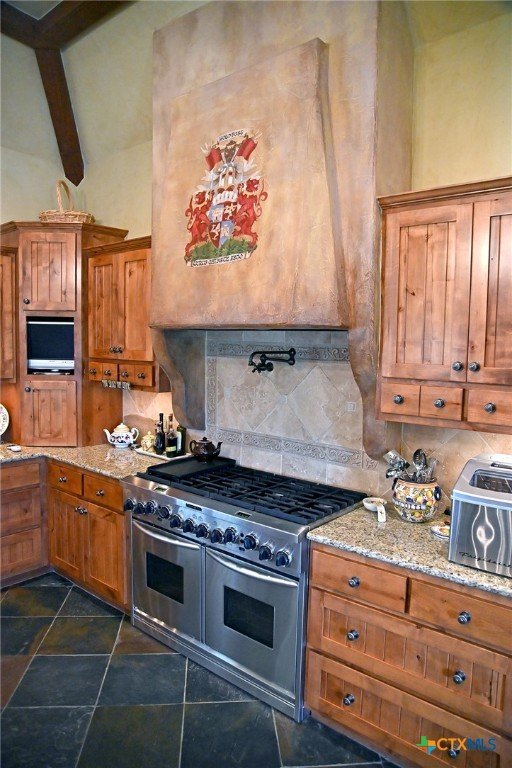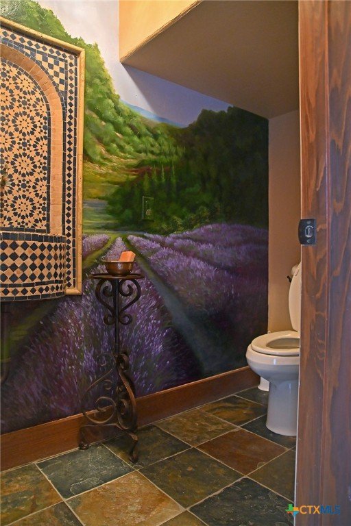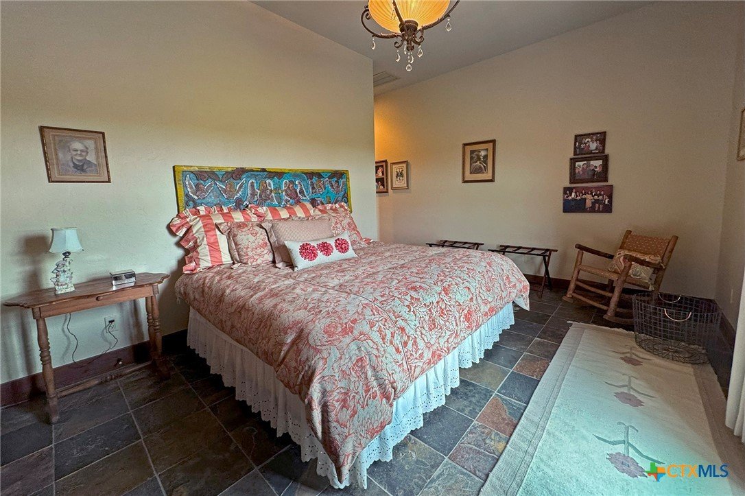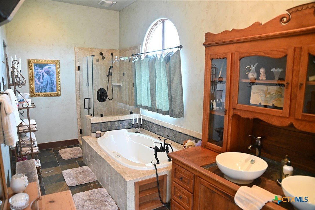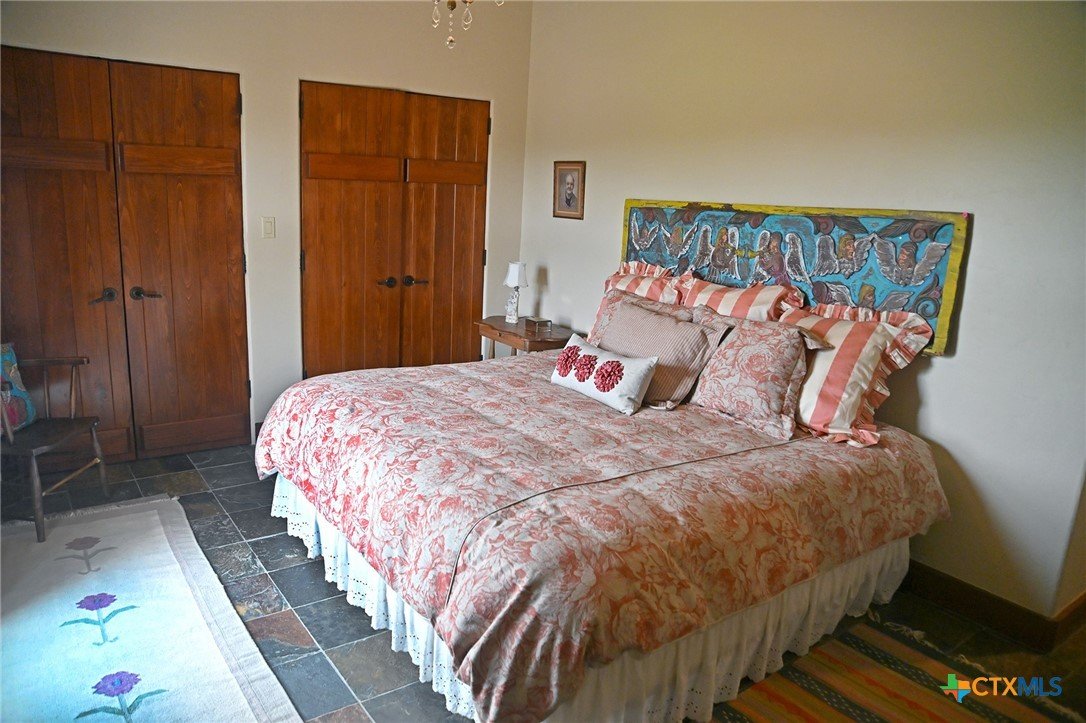 Aptly named "Mas de L'ange" (House of the Angels), this custom-built County French home was inspired by a house of the same name near Arles in the Provence region of France. Magnificently situated on the property's highest point, it overlooks green meadows, a meditative labyrinth, two ponds, and acreage maintained as a wildlife habitat. The curving road and circular driveway lead visitors to the impressive cypress front door through which one enters the great room with its massive wooden beams supporting the cathedral ceiling, a floor-to-ceiling limestone fireplace, slate floors, hand-plastered walls and a gorgeous wrought-iron chandelier. The heart of the home, the kitchen--with professional-grade appliances, knotty alder cabinets, breakfast bar, built-in buffet and walk-in pantry--opens to the great room, an herb garden in the front and a covered patio in the rear. The master suite, also with beamed and vaulted ceilings, has a generous sitting area, a walk-in closet and an en suite bath with a double vanity, jetted tub and separate shower. The guest suite features large closets, an en suite bath, and lovely views of the property. The third downstairs bedroom suite currently features a daybed for overflow sleeping and serves as an office. A charming half bath displays a Moroccan tile wall-mounted sink and a hand-painted mural of lavender fields. The upstairs flex space may be a fourth bedroom, home office, home gym or hobby room. Outdoor entertaining is a dream with the covered back porch, the sitting area around the tower fountain, the labyrinth and the beautiful grassy areas. The two stocked ponds may be filled from one of the two wells on the property. Deer, wild turkey, hogs and native birds are abundant in their habitat at the rear of the property. Two storage buildings provide ample space for a workshop and art studio. An exterior shower affords easy cleanup after gardening. This property is truly unique and offers the very best in luxurious country living!