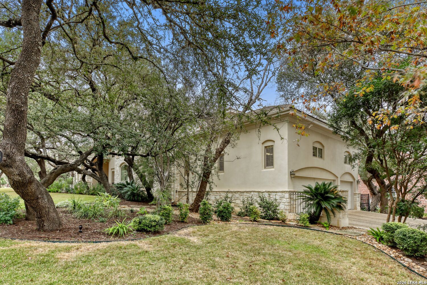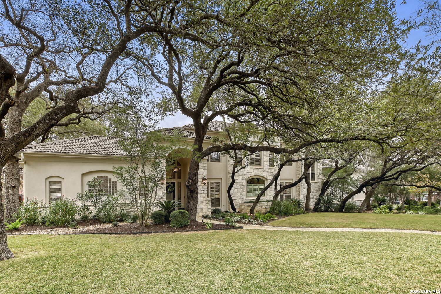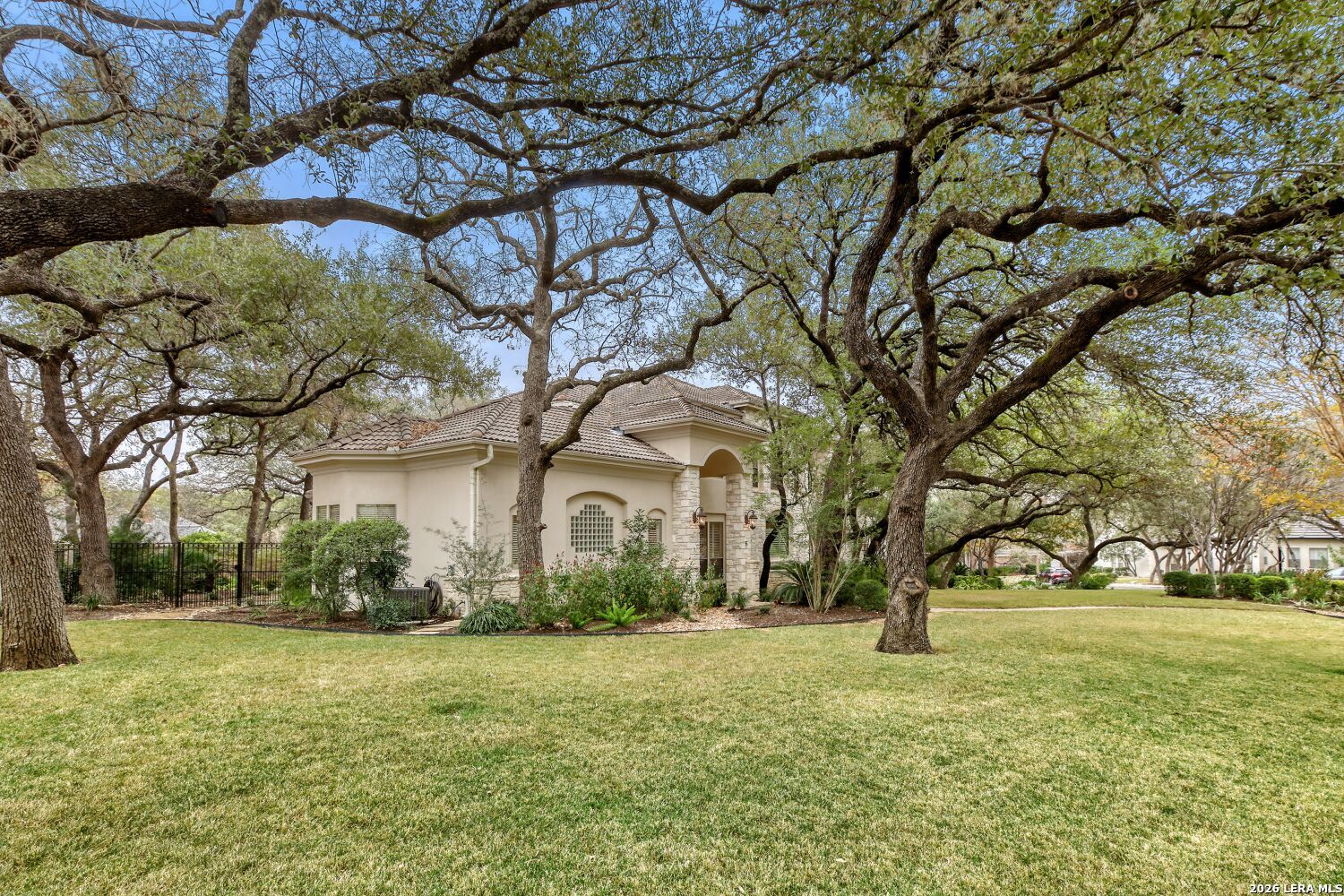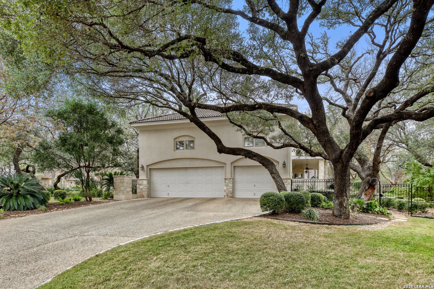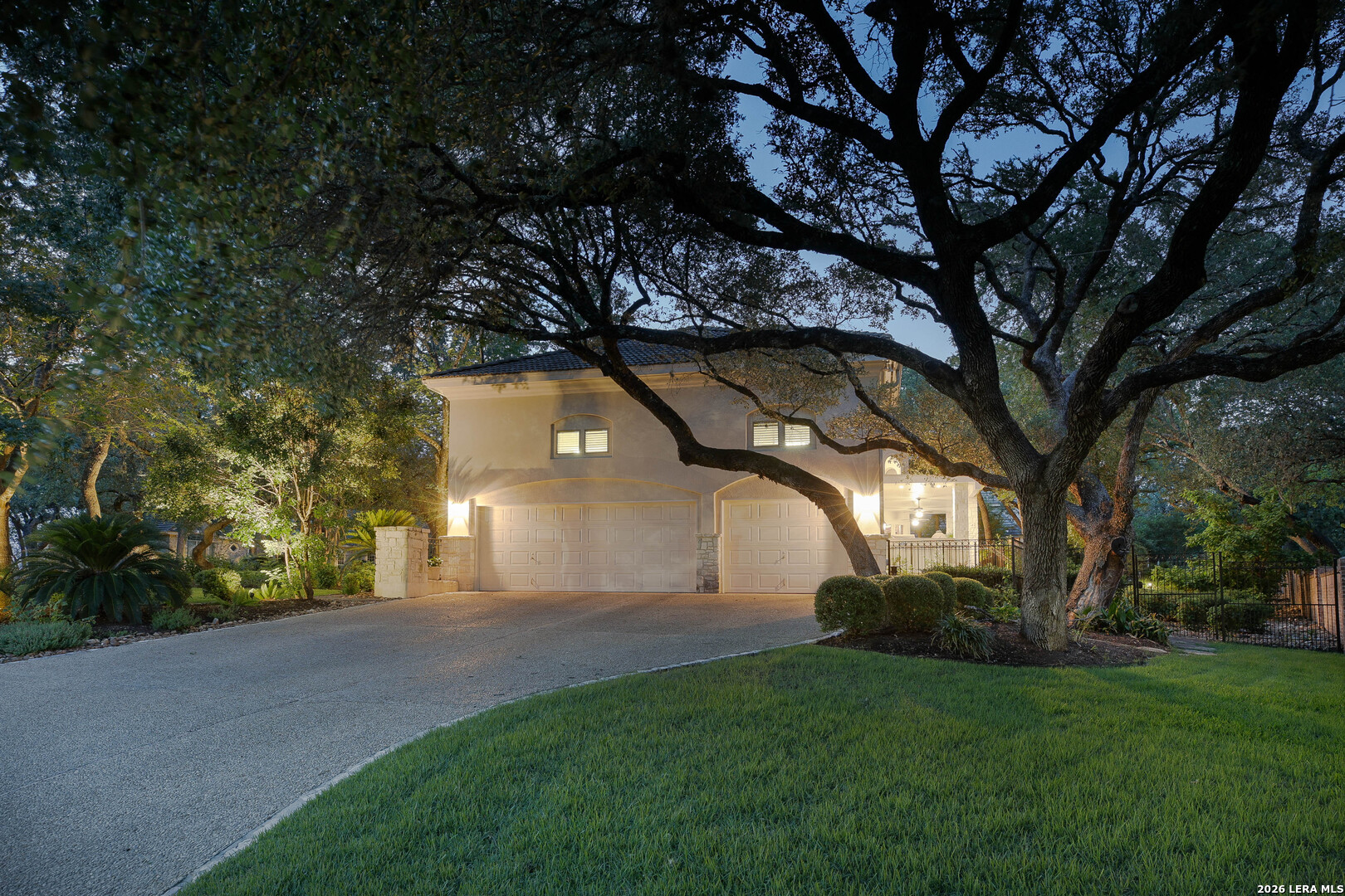 Exceptional custom residence in the guarded and gated Estates section of Inwood, thoughtfully designed by acclaimed designer Michael Hyden, and masterfully built by respected custom builder Terry Espensen. Completed in 2000, this Mediterranean-inspired home blends timeless architecture, thoughtful craftsmanship, and beautifully landscaped surroundings. Set on a tree-studded half-acre lot, the property is framed by mature Live Oak, Post Oak, Cedar Elm, and other native trees, creating a private and tranquil setting enhanced by extensive landscaping. The stucco and stone exterior offers classic Mediterranean character, while inside, soaring ceilings ranging from 10 to 20 feet, a dramatic barrel entry, and two staircases create a sense of openness and architectural interest throughout. Designed for both everyday living and memorable gatherings, the home features a formal dining room with an included wine cellar, a welcoming family room anchored by a custom cantera stone gas fireplace, and a built-in media cabinet with TV. Just beyond is a charming piano or sitting room, ideal for conversation or quiet evenings at home. The kitchen is beautifully appointed with high-end granite countertops and premium appliances including Bosch and GE Profile appliances, an induction cooktop, warming drawer, and a Sub-Zero 48-inch cabinet-depth refrigerator. Thoughtful details such as a unique fold-out cabinet pantry, electric operated trash/recycle drawer, and dedicated cookbook shelving make the space both functional and distinctive. The spacious downstairs primary suite offers a peaceful retreat with two generous closets, a walk-in glass block shower, and a jacuzzi tub. An adjacent exercise room with additional storage adds flexibility for wellness or private workspace. Also on the main level is a study, or additional bedroom with an adjacent full bath, offering versatility for guests, or a home office. The laundry room is exceptionally functional, featuring extra cabinets, closets, hanging space, under-stair storage, and even a laundry chute from the upstairs level. Upstairs, two additional bedrooms with full baths are complemented by a large game room with an included pool table/table-tennis combination, as well as a walk-in craft, media, or flex room with a tabletop workspace and abundant storage. Car enthusiasts and hobbyists will appreciate the oversized three-car garage, finished with polyaspartic flooring, built-in cabinets and workbench, an additional refrigerator, hanging storage panels, and both fixed and electric overhead storage. Outdoor living is equally inviting. The expansive rear patio provides generous seating areas and is equipped with a 32-inch Delta Heat gas grill and a Large Big Green Egg, creating the perfect setting for entertaining or relaxing evenings outdoors. A dedicated storage and internet distribution hub room adds practical convenience. Additional features throughout the home include wired speakers in most rooms, Cat-5 ethernet cabling for enhanced connectivity, four HVAC systems (three primary units plus a split unit), and customizable Elfa shelving in many closets. Thoughtfully designed and meticulously maintained, this Inwood Estates residence offers distinctive architecture, versatile living spaces, and exceptional amenities in one of San Antonio's premier guard and gated communities.