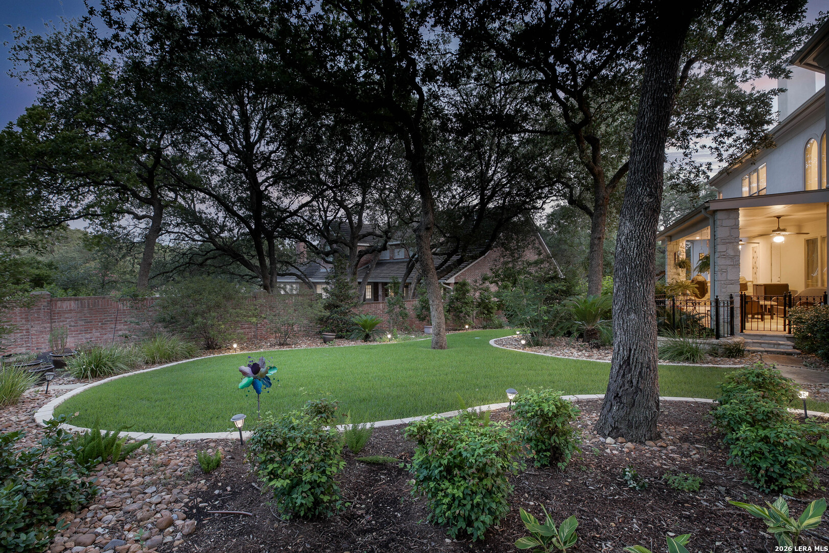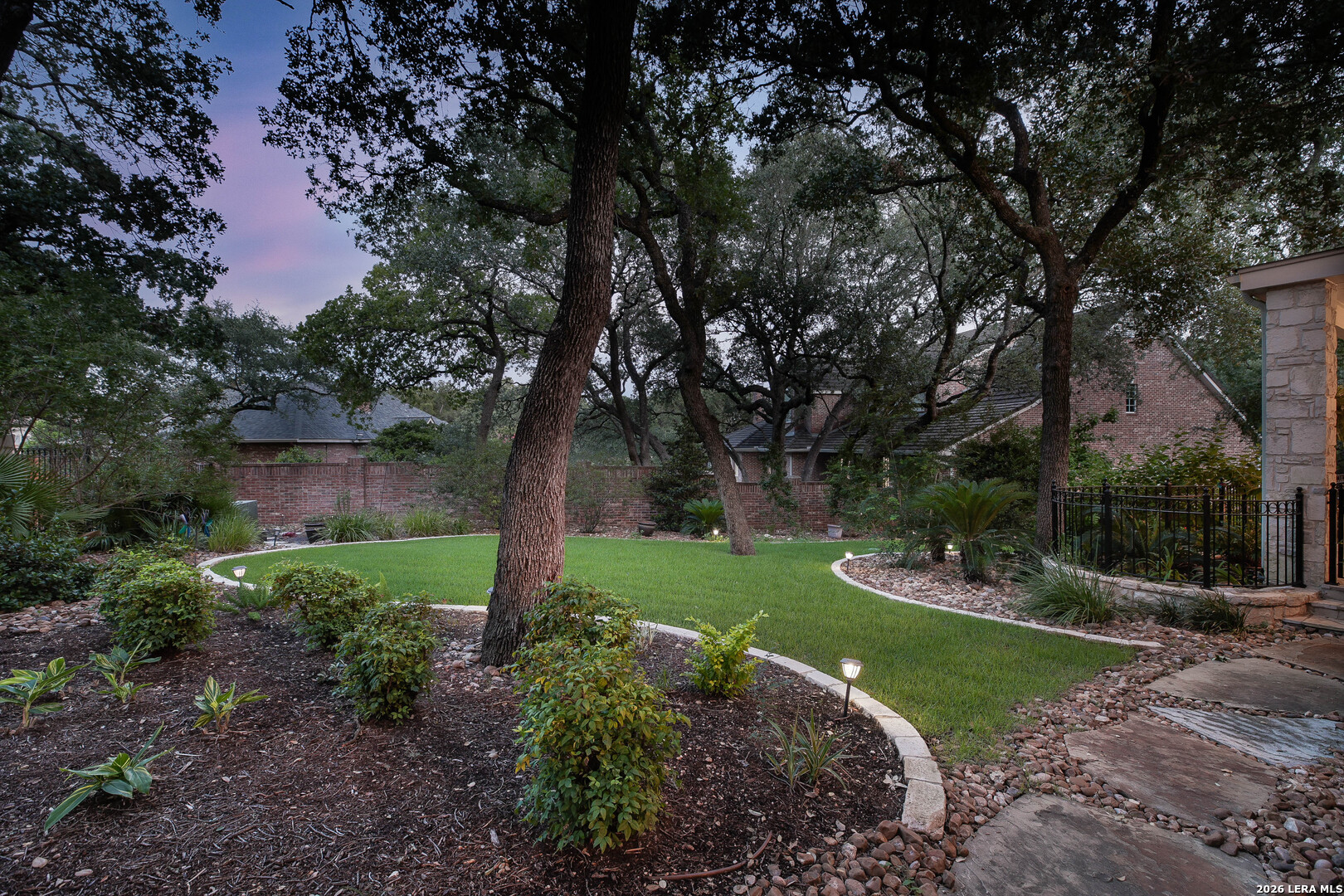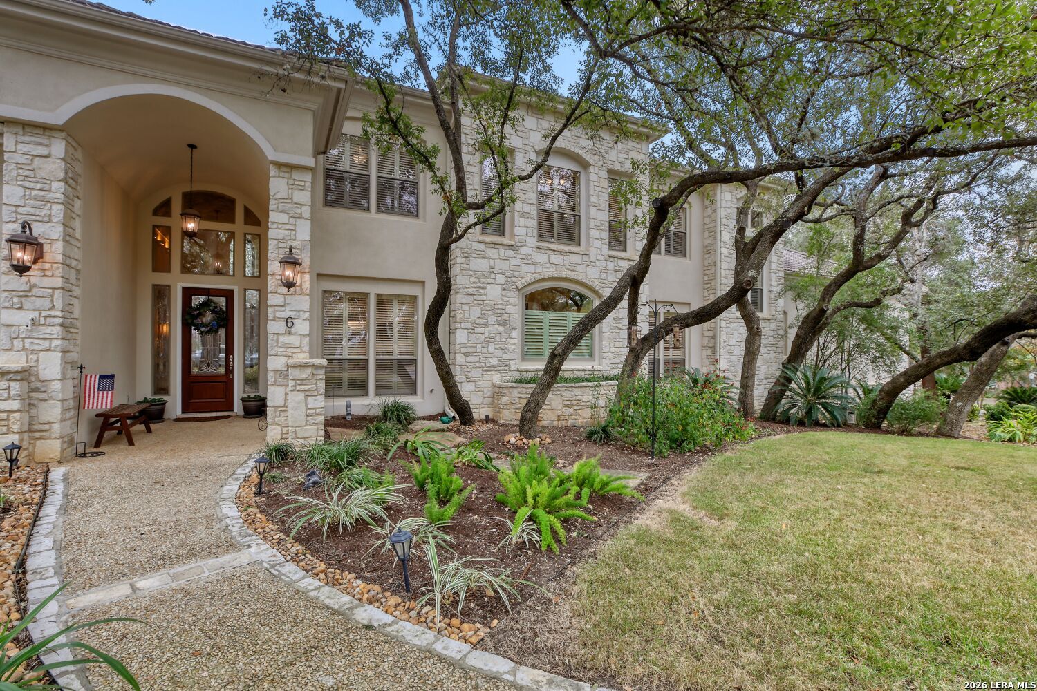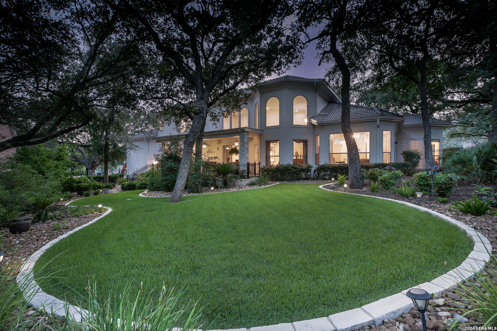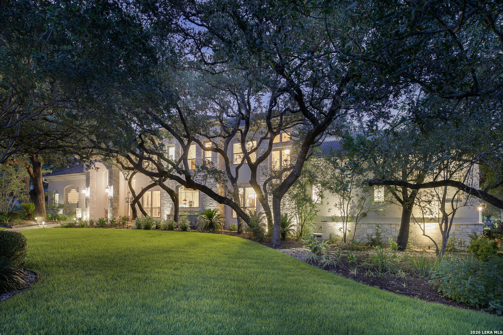 Exceptional custom residence in the guarded and gated Estates section of Inwood, thoughtfully designed by acclaimed designer Michael Hyden, and masterfully built by respected custom builder Terry Espensen. Completed in 2000, this Mediterranean-inspired home blends timeless architecture, thoughtful craftsmanship, and beautifully landscaped surroundings. Set on a tree-studded half-acre lot, the property is framed by mature Live Oak, Post Oak, Cedar Elm, and other native trees, creating a private and tranquil setting enhanced by extensive landscaping. The stucco and stone exterior offers classic Mediterranean character, while inside, soaring ceilings ranging from 10 to 20 feet, a dramatic barrel entry, and two staircases create a sense of openness and architectural interest throughout. Designed for both everyday living and memorable gatherings, the home features a formal dining room with an included wine cellar, a welcoming family room anchored by a custom cantera stone gas fireplace, and a built-in media cabinet with TV. Just beyond is a charming piano or sitting room, ideal for conversation or quiet evenings at home. The kitchen is beautifully appointed with high-end granite countertops and premium appliances including Bosch and GE Profile appliances, an induction cooktop, warming drawer, and a Sub-Zero 48-inch cabinet-depth refrigerator. Thoughtful details such as a unique fold-out cabinet pantry, electric operated trash/recycle drawer, and dedicated cookbook shelving make the space both functional and distinctive. The spacious downstairs primary suite offers a peaceful retreat with two generous closets, a walk-in glass block shower, and a jacuzzi tub. An adjacent exercise room with additional storage adds flexibility for wellness or private workspace. Also on the main level is a study, or additional bedroom with an adjacent full bath, offering versatility for guests, or a home office. The laundry room is exceptionally functional, featuring extra cabinets, closets, hanging space, under-stair storage, and even a laundry chute from the upstairs level. Upstairs, two additional bedrooms with full baths are complemented by a large game room with an included pool table/table-tennis combination, as well as a walk-in craft, media, or flex room with a tabletop workspace and abundant storage. Car enthusiasts and hobbyists will appreciate the oversized three-car garage, finished with polyaspartic flooring, built-in cabinets and workbench, an additional refrigerator, hanging storage panels, and both fixed and electric overhead storage. Outdoor living is equally inviting. The expansive rear patio provides generous seating areas and is equipped with a 32-inch Delta Heat gas grill and a Large Big Green Egg, creating the perfect setting for entertaining or relaxing evenings outdoors. A dedicated storage and internet distribution hub room adds practical convenience. Additional features throughout the home include wired speakers in most rooms, Cat-5 ethernet cabling for enhanced connectivity, four HVAC systems (three primary units plus a split unit), and customizable Elfa shelving in many closets. Thoughtfully designed and meticulously maintained, this Inwood Estates residence offers distinctive architecture, versatile living spaces, and exceptional amenities in one of San Antonio's premier guard and gated communities.