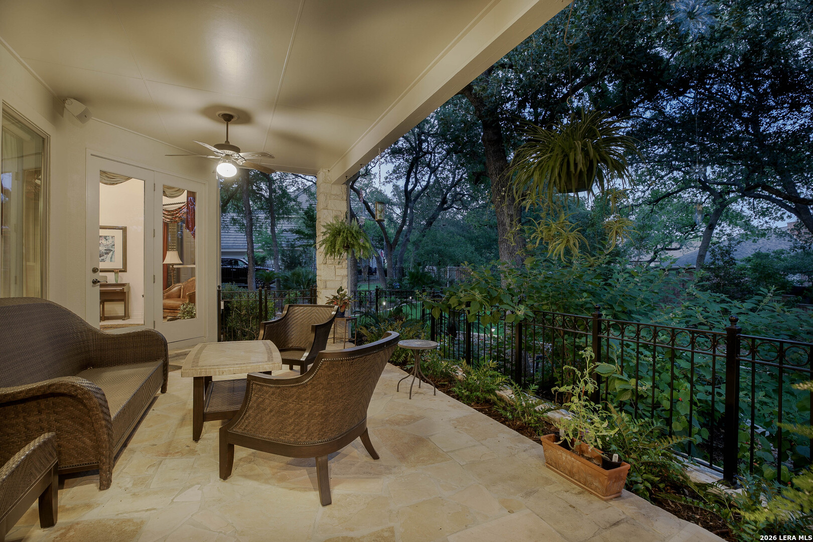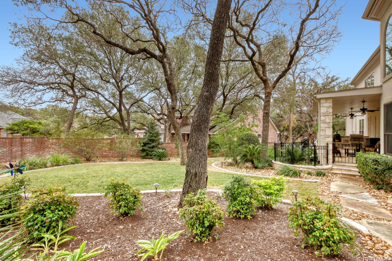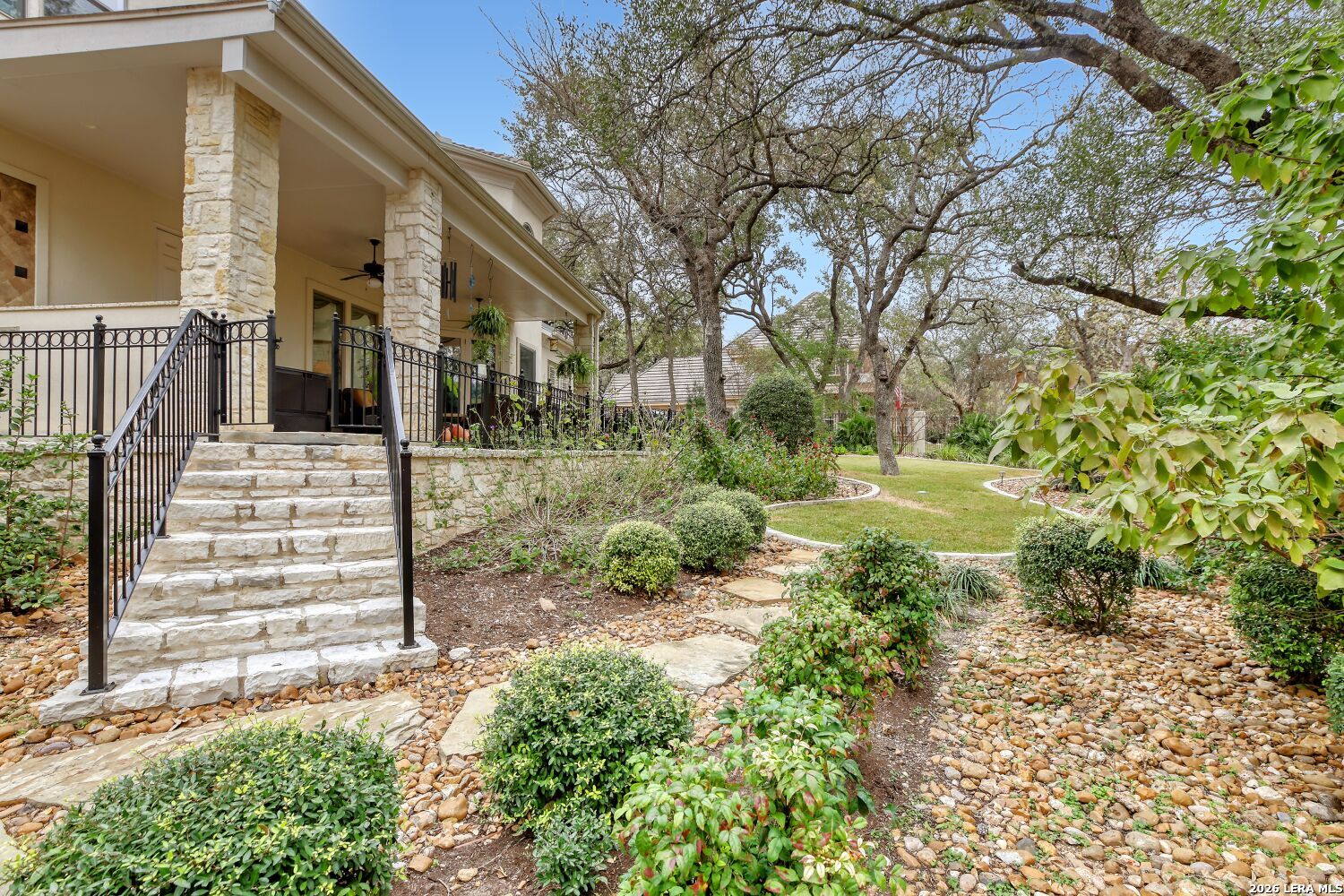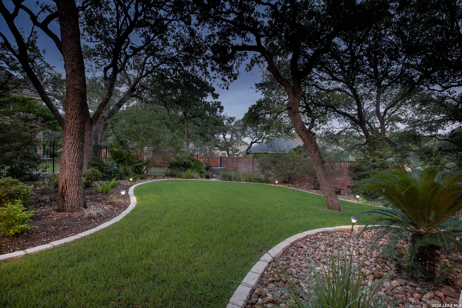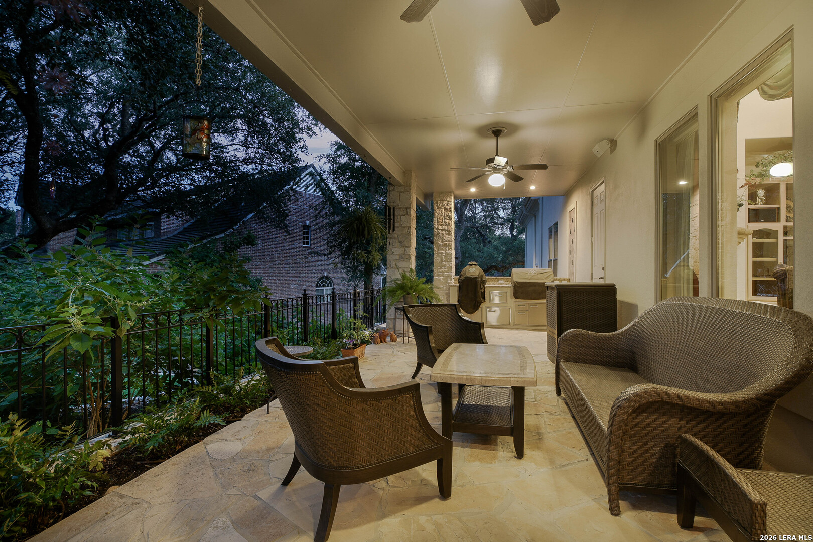 Exceptional custom residence in the guarded and gated Estates section of Inwood, thoughtfully designed by acclaimed designer Michael Hyden, and masterfully built by respected custom builder Terry Espensen. Completed in 2000, this Mediterranean-inspired home blends timeless architecture, thoughtful craftsmanship, and beautifully landscaped surroundings. Set on a tree-studded half-acre lot, the property is framed by mature Live Oak, Post Oak, Cedar Elm, and other native trees, creating a private and tranquil setting enhanced by extensive landscaping. The stucco and stone exterior offers classic Mediterranean character, while inside, soaring ceilings ranging from 10 to 20 feet, a dramatic barrel entry, and two staircases create a sense of openness and architectural interest throughout. Designed for both everyday living and memorable gatherings, the home features a formal dining room with an included wine cellar, a welcoming family room anchored by a custom cantera stone gas fireplace, and a built-in media cabinet with TV. Just beyond is a charming piano or sitting room, ideal for conversation or quiet evenings at home. The kitchen is beautifully appointed with high-end granite countertops and premium appliances including Bosch and GE Profile appliances, an induction cooktop, warming drawer, and a Sub-Zero 48-inch cabinet-depth refrigerator. Thoughtful details such as a unique fold-out cabinet pantry, electric operated trash/recycle drawer, and dedicated cookbook shelving make the space both functional and distinctive. The spacious downstairs primary suite offers a peaceful retreat with two generous closets, a walk-in glass block shower, and a jacuzzi tub. An adjacent exercise room with additional storage adds flexibility for wellness or private workspace. Also on the main level is a study, or additional bedroom with an adjacent full bath, offering versatility for guests, or a home office. The laundry room is exceptionally functional, featuring extra cabinets, closets, hanging space, under-stair storage, and even a laundry chute from the upstairs level. Upstairs, two additional bedrooms with full baths are complemented by a large game room with an included pool table/table-tennis combination, as well as a walk-in craft, media, or flex room with a tabletop workspace and abundant storage. Car enthusiasts and hobbyists will appreciate the oversized three-car garage, finished with polyaspartic flooring, built-in cabinets and workbench, an additional refrigerator, hanging storage panels, and both fixed and electric overhead storage. Outdoor living is equally inviting. The expansive rear patio provides generous seating areas and is equipped with a 32-inch Delta Heat gas grill and a Large Big Green Egg, creating the perfect setting for entertaining or relaxing evenings outdoors. A dedicated storage and internet distribution hub room adds practical convenience. Additional features throughout the home include wired speakers in most rooms, Cat-5 ethernet cabling for enhanced connectivity, four HVAC systems (three primary units plus a split unit), and customizable Elfa shelving in many closets. Thoughtfully designed and meticulously maintained, this Inwood Estates residence offers distinctive architecture, versatile living spaces, and exceptional amenities in one of San Antonio's premier guard and gated communities.