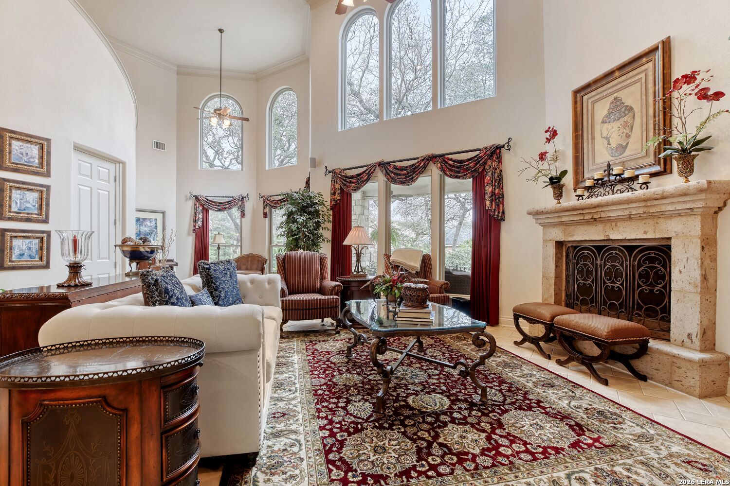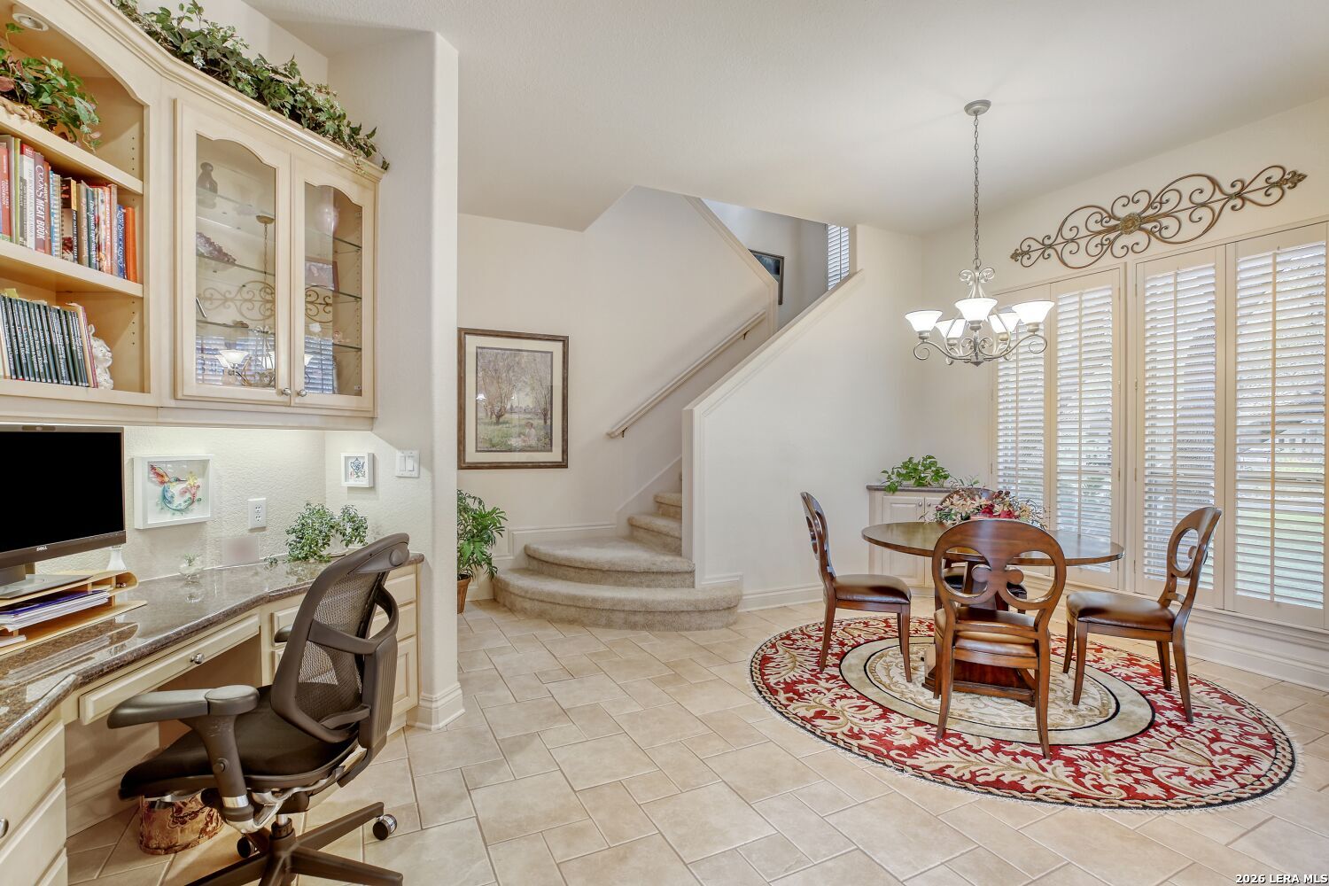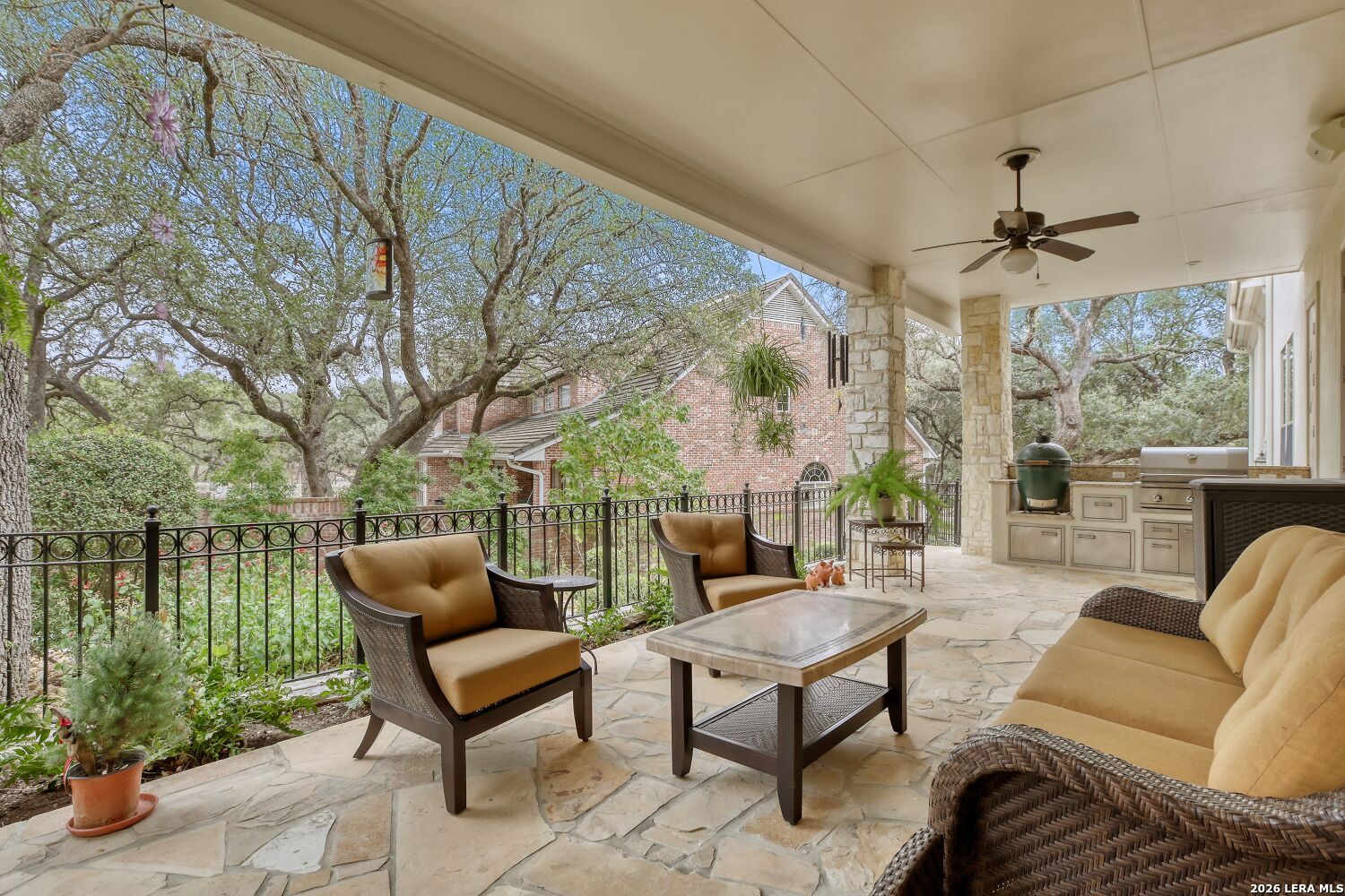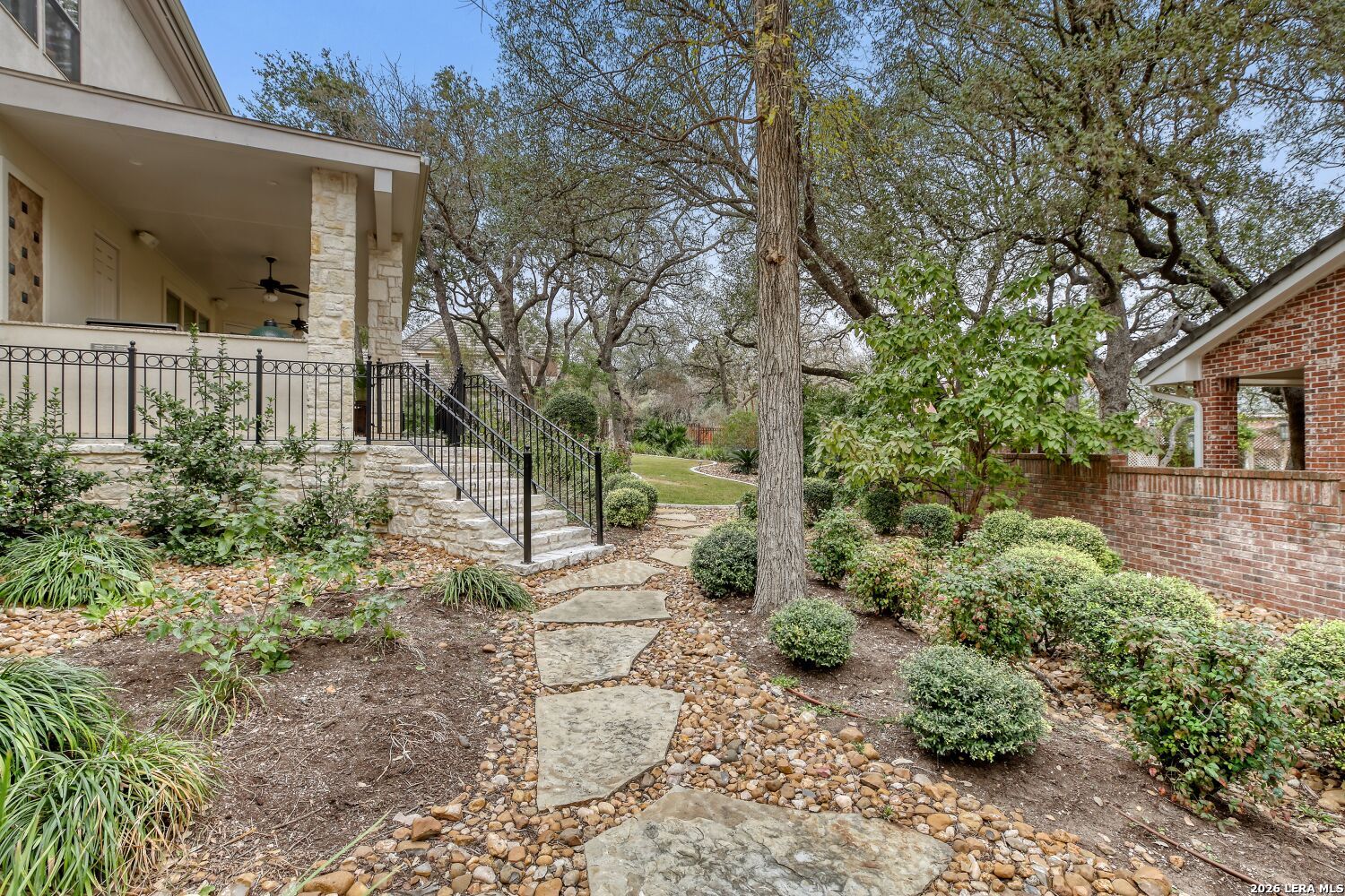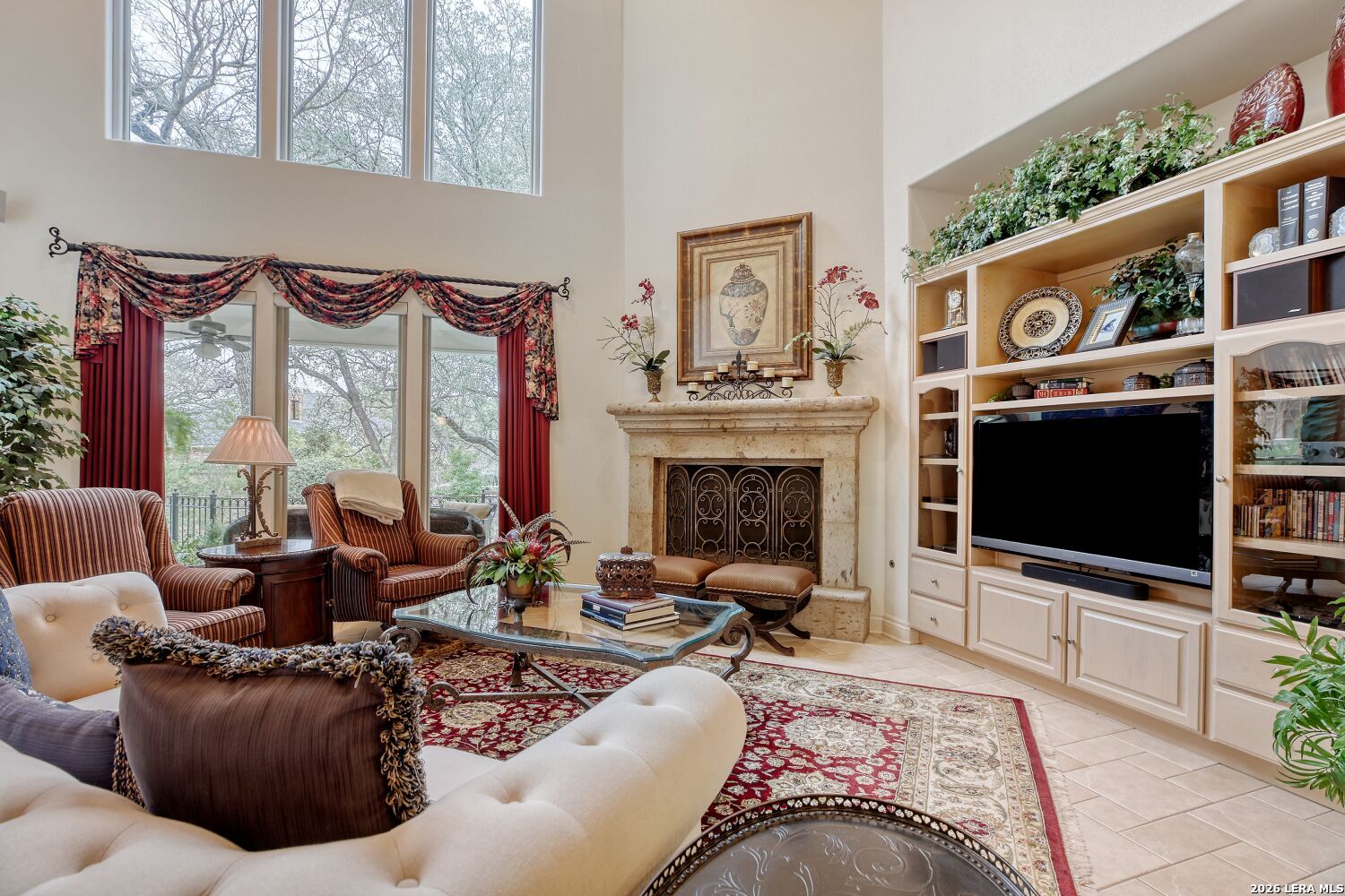 Exceptional custom residence in the guarded and gated Estates section of Inwood, thoughtfully designed by acclaimed designer Michael Hyden, and masterfully built by respected custom builder Terry Espensen. Completed in 2000, this Mediterranean-inspired home blends timeless architecture, thoughtful craftsmanship, and beautifully landscaped surroundings. Set on a tree-studded half-acre lot, the property is framed by mature Live Oak, Post Oak, Cedar Elm, and other native trees, creating a private and tranquil setting enhanced by extensive landscaping. The stucco and stone exterior offers classic Mediterranean character, while inside, soaring ceilings ranging from 10 to 20 feet, a dramatic barrel entry, and two staircases create a sense of openness and architectural interest throughout. Designed for both everyday living and memorable gatherings, the home features a formal dining room with an included wine cellar, a welcoming family room anchored by a custom cantera stone gas fireplace, and a built-in media cabinet with TV. Just beyond is a charming piano or sitting room, ideal for conversation or quiet evenings at home. The kitchen is beautifully appointed with high-end granite countertops and premium appliances including Bosch and GE Profile appliances, an induction cooktop, warming drawer, and a Sub-Zero 48-inch cabinet-depth refrigerator. Thoughtful details such as a unique fold-out cabinet pantry, electric operated trash/recycle drawer, and dedicated cookbook shelving make the space both functional and distinctive. The spacious downstairs primary suite offers a peaceful retreat with two generous closets, a walk-in glass block shower, and a jacuzzi tub. An adjacent exercise room with additional storage adds flexibility for wellness or private workspace. Also on the main level is a study, or additional bedroom with an adjacent full bath, offering versatility for guests, or a home office. The laundry room is exceptionally functional, featuring extra cabinets, closets, hanging space, under-stair storage, and even a laundry chute from the upstairs level. Upstairs, two additional bedrooms with full baths are complemented by a large game room with an included pool table/table-tennis combination, as well as a walk-in craft, media, or flex room with a tabletop workspace and abundant storage. Car enthusiasts and hobbyists will appreciate the oversized three-car garage, finished with polyaspartic flooring, built-in cabinets and workbench, an additional refrigerator, hanging storage panels, and both fixed and electric overhead storage. Outdoor living is equally inviting. The expansive rear patio provides generous seating areas and is equipped with a 32-inch Delta Heat gas grill and a Large Big Green Egg, creating the perfect setting for entertaining or relaxing evenings outdoors. A dedicated storage and internet distribution hub room adds practical convenience. Additional features throughout the home include wired speakers in most rooms, Cat-5 ethernet cabling for enhanced connectivity, four HVAC systems (three primary units plus a split unit), and customizable Elfa shelving in many closets. Thoughtfully designed and meticulously maintained, this Inwood Estates residence offers distinctive architecture, versatile living spaces, and exceptional amenities in one of San Antonio's premier guard and gated communities.