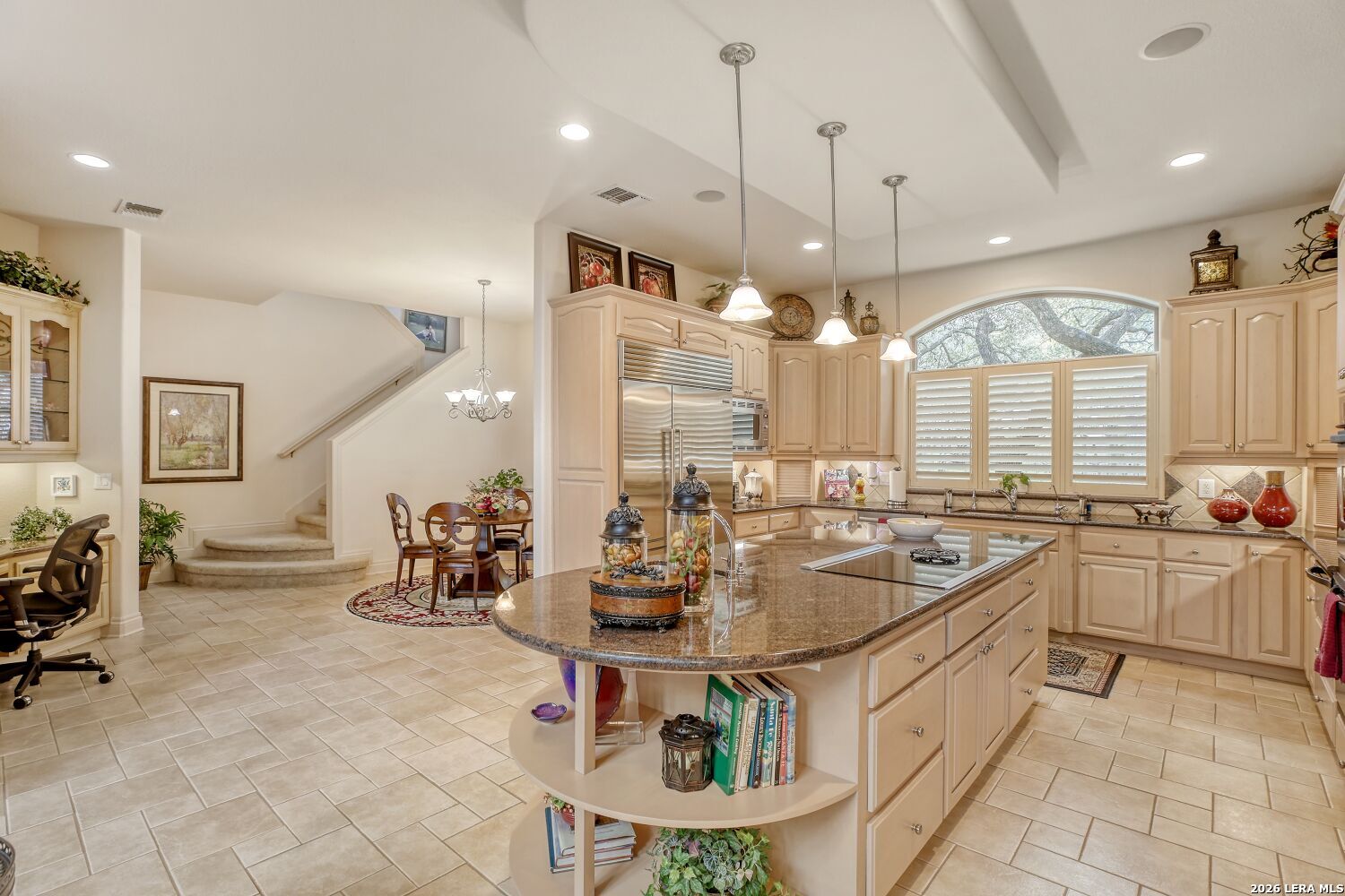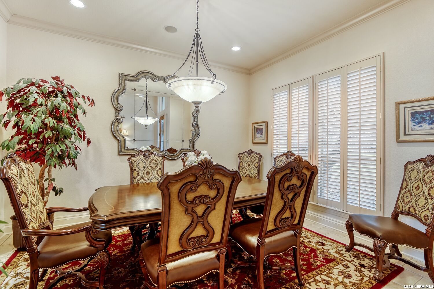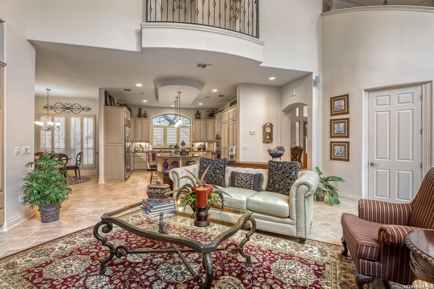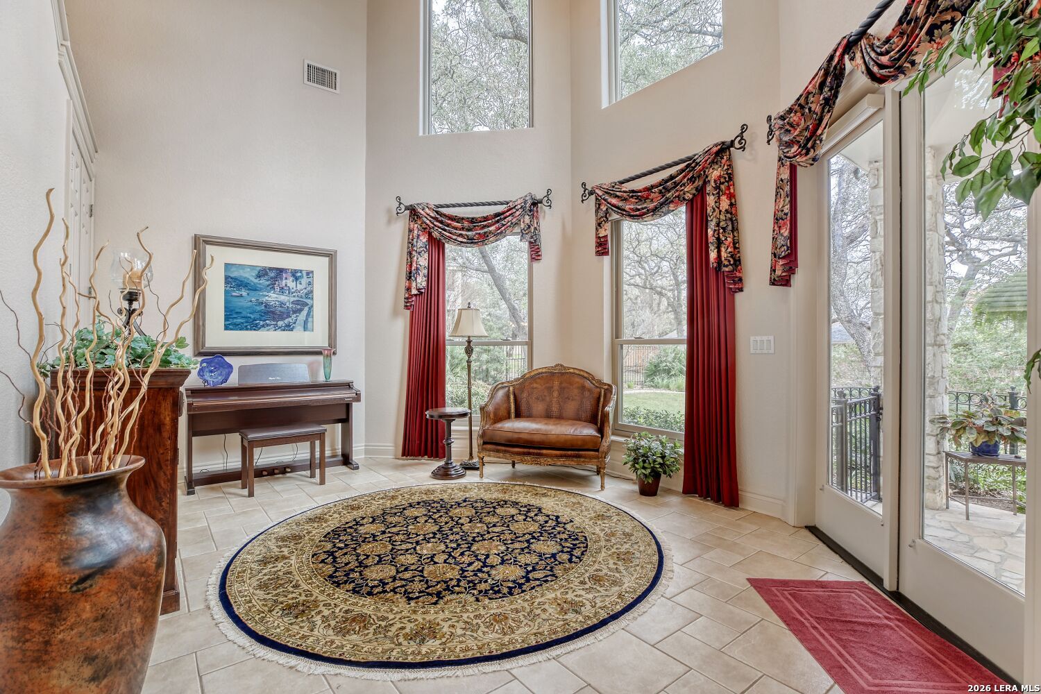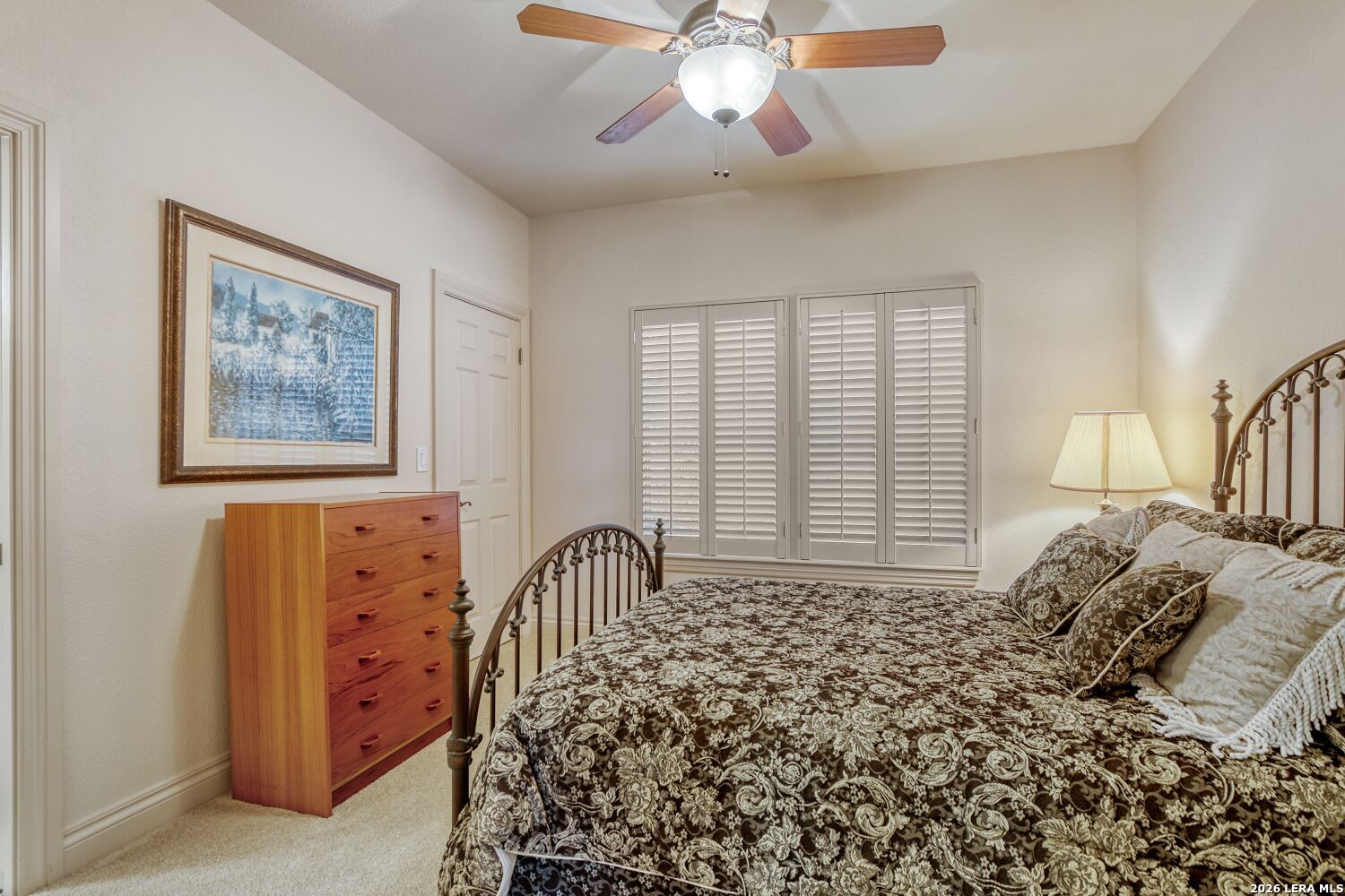 Exceptional custom residence in the guarded and gated Estates section of Inwood, thoughtfully designed by acclaimed designer Michael Hyden, and masterfully built by respected custom builder Terry Espensen. Completed in 2000, this Mediterranean-inspired home blends timeless architecture, thoughtful craftsmanship, and beautifully landscaped surroundings. Set on a tree-studded half-acre lot, the property is framed by mature Live Oak, Post Oak, Cedar Elm, and other native trees, creating a private and tranquil setting enhanced by extensive landscaping. The stucco and stone exterior offers classic Mediterranean character, while inside, soaring ceilings ranging from 10 to 20 feet, a dramatic barrel entry, and two staircases create a sense of openness and architectural interest throughout. Designed for both everyday living and memorable gatherings, the home features a formal dining room with an included wine cellar, a welcoming family room anchored by a custom cantera stone gas fireplace, and a built-in media cabinet with TV. Just beyond is a charming piano or sitting room, ideal for conversation or quiet evenings at home. The kitchen is beautifully appointed with high-end granite countertops and premium appliances including Bosch and GE Profile appliances, an induction cooktop, warming drawer, and a Sub-Zero 48-inch cabinet-depth refrigerator. Thoughtful details such as a unique fold-out cabinet pantry, electric operated trash/recycle drawer, and dedicated cookbook shelving make the space both functional and distinctive. The spacious downstairs primary suite offers a peaceful retreat with two generous closets, a walk-in glass block shower, and a jacuzzi tub. An adjacent exercise room with additional storage adds flexibility for wellness or private workspace. Also on the main level is a study, or additional bedroom with an adjacent full bath, offering versatility for guests, or a home office. The laundry room is exceptionally functional, featuring extra cabinets, closets, hanging space, under-stair storage, and even a laundry chute from the upstairs level. Upstairs, two additional bedrooms with full baths are complemented by a large game room with an included pool table/table-tennis combination, as well as a walk-in craft, media, or flex room with a tabletop workspace and abundant storage. Car enthusiasts and hobbyists will appreciate the oversized three-car garage, finished with polyaspartic flooring, built-in cabinets and workbench, an additional refrigerator, hanging storage panels, and both fixed and electric overhead storage. Outdoor living is equally inviting. The expansive rear patio provides generous seating areas and is equipped with a 32-inch Delta Heat gas grill and a Large Big Green Egg, creating the perfect setting for entertaining or relaxing evenings outdoors. A dedicated storage and internet distribution hub room adds practical convenience. Additional features throughout the home include wired speakers in most rooms, Cat-5 ethernet cabling for enhanced connectivity, four HVAC systems (three primary units plus a split unit), and customizable Elfa shelving in many closets. Thoughtfully designed and meticulously maintained, this Inwood Estates residence offers distinctive architecture, versatile living spaces, and exceptional amenities in one of San Antonio's premier guard and gated communities.