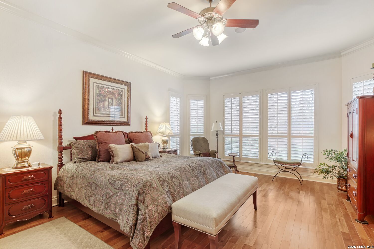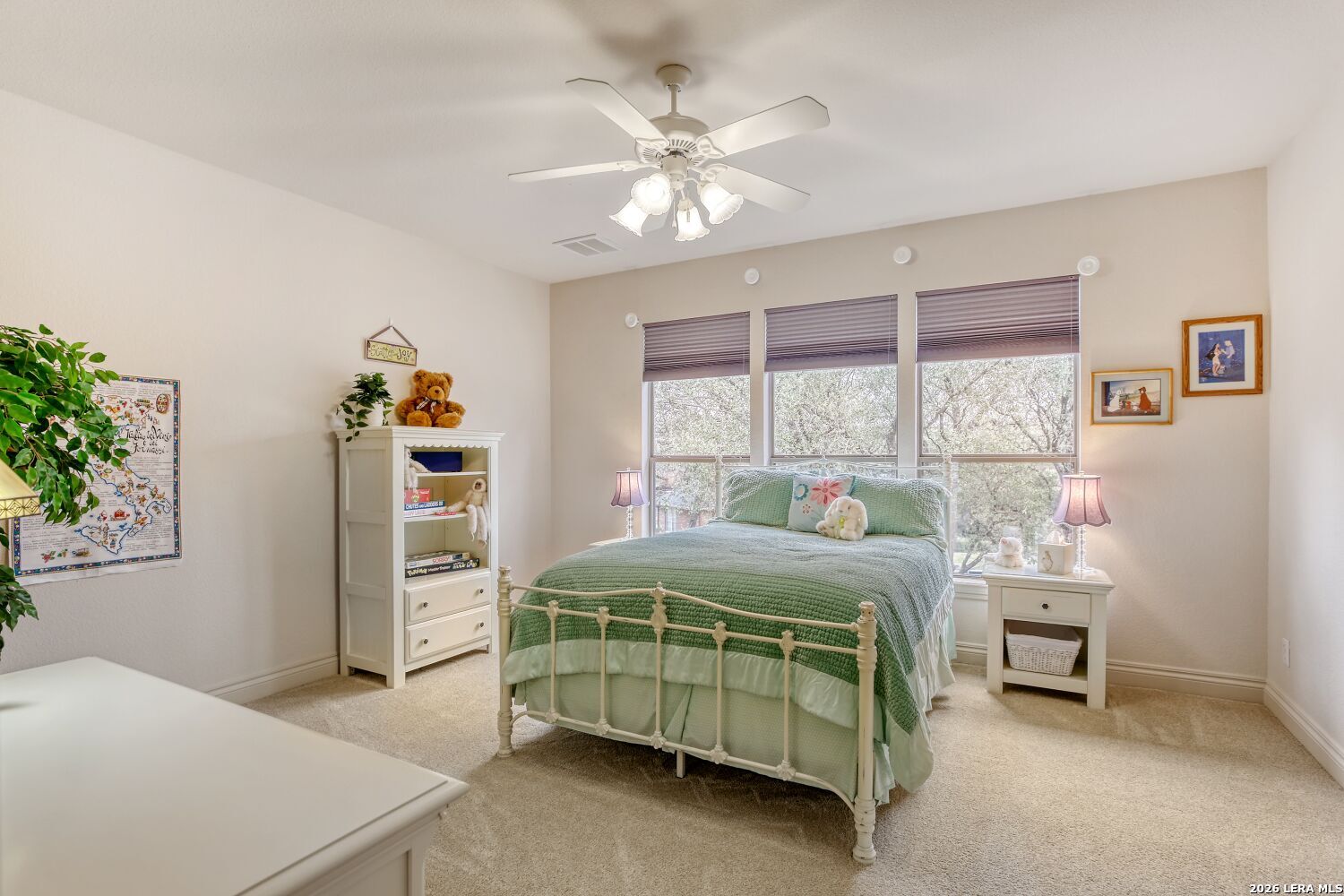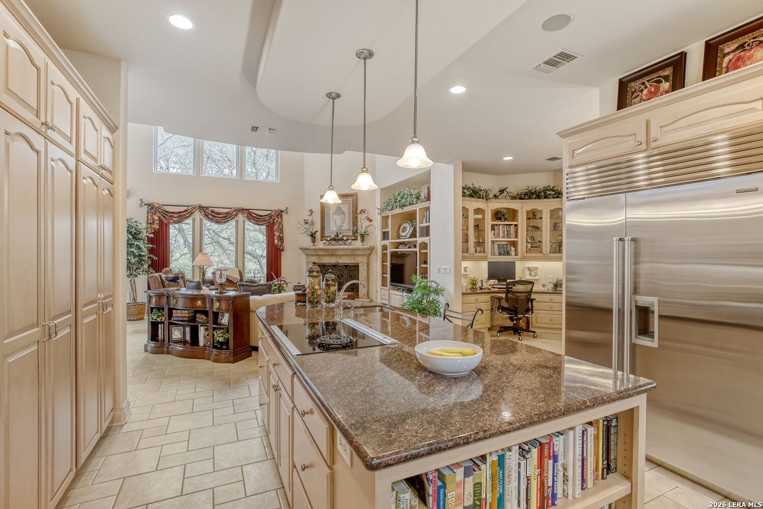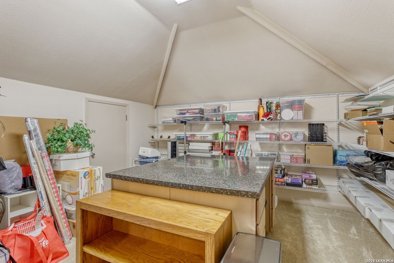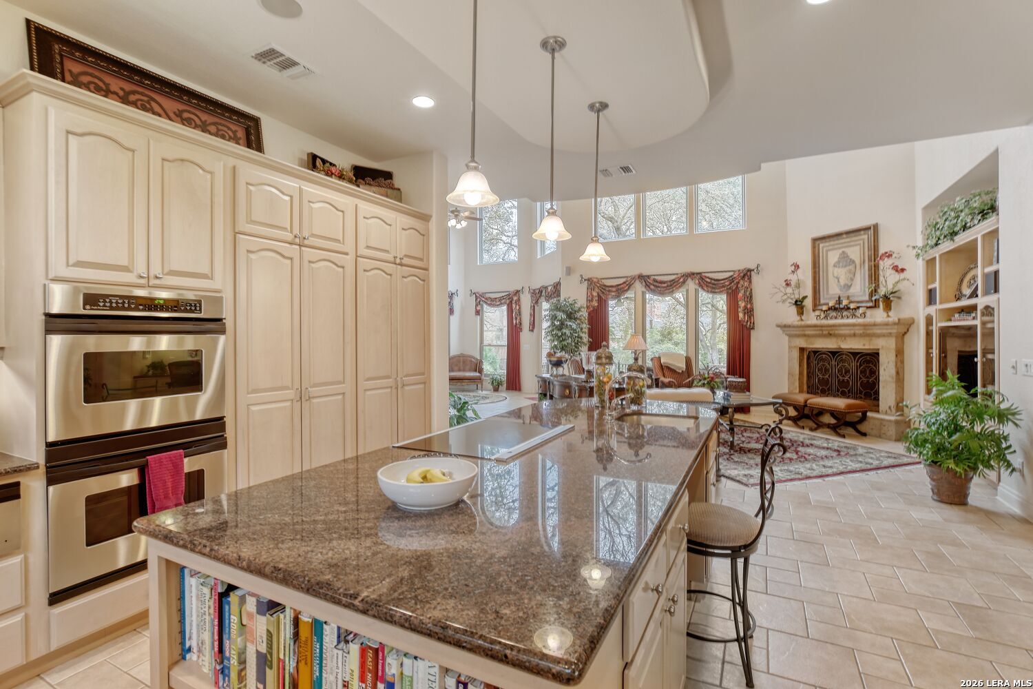 Exceptional custom residence in the guarded and gated Estates section of Inwood, thoughtfully designed by acclaimed designer Michael Hyden, and masterfully built by respected custom builder Terry Espensen. Completed in 2000, this Mediterranean-inspired home blends timeless architecture, thoughtful craftsmanship, and beautifully landscaped surroundings. Set on a tree-studded half-acre lot, the property is framed by mature Live Oak, Post Oak, Cedar Elm, and other native trees, creating a private and tranquil setting enhanced by extensive landscaping. The stucco and stone exterior offers classic Mediterranean character, while inside, soaring ceilings ranging from 10 to 20 feet, a dramatic barrel entry, and two staircases create a sense of openness and architectural interest throughout. Designed for both everyday living and memorable gatherings, the home features a formal dining room with an included wine cellar, a welcoming family room anchored by a custom cantera stone gas fireplace, and a built-in media cabinet with TV. Just beyond is a charming piano or sitting room, ideal for conversation or quiet evenings at home. The kitchen is beautifully appointed with high-end granite countertops and premium appliances including Bosch and GE Profile appliances, an induction cooktop, warming drawer, and a Sub-Zero 48-inch cabinet-depth refrigerator. Thoughtful details such as a unique fold-out cabinet pantry, electric operated trash/recycle drawer, and dedicated cookbook shelving make the space both functional and distinctive. The spacious downstairs primary suite offers a peaceful retreat with two generous closets, a walk-in glass block shower, and a jacuzzi tub. An adjacent exercise room with additional storage adds flexibility for wellness or private workspace. Also on the main level is a study, or additional bedroom with an adjacent full bath, offering versatility for guests, or a home office. The laundry room is exceptionally functional, featuring extra cabinets, closets, hanging space, under-stair storage, and even a laundry chute from the upstairs level. Upstairs, two additional bedrooms with full baths are complemented by a large game room with an included pool table/table-tennis combination, as well as a walk-in craft, media, or flex room with a tabletop workspace and abundant storage. Car enthusiasts and hobbyists will appreciate the oversized three-car garage, finished with polyaspartic flooring, built-in cabinets and workbench, an additional refrigerator, hanging storage panels, and both fixed and electric overhead storage. Outdoor living is equally inviting. The expansive rear patio provides generous seating areas and is equipped with a 32-inch Delta Heat gas grill and a Large Big Green Egg, creating the perfect setting for entertaining or relaxing evenings outdoors. A dedicated storage and internet distribution hub room adds practical convenience. Additional features throughout the home include wired speakers in most rooms, Cat-5 ethernet cabling for enhanced connectivity, four HVAC systems (three primary units plus a split unit), and customizable Elfa shelving in many closets. Thoughtfully designed and meticulously maintained, this Inwood Estates residence offers distinctive architecture, versatile living spaces, and exceptional amenities in one of San Antonio's premier guard and gated communities.