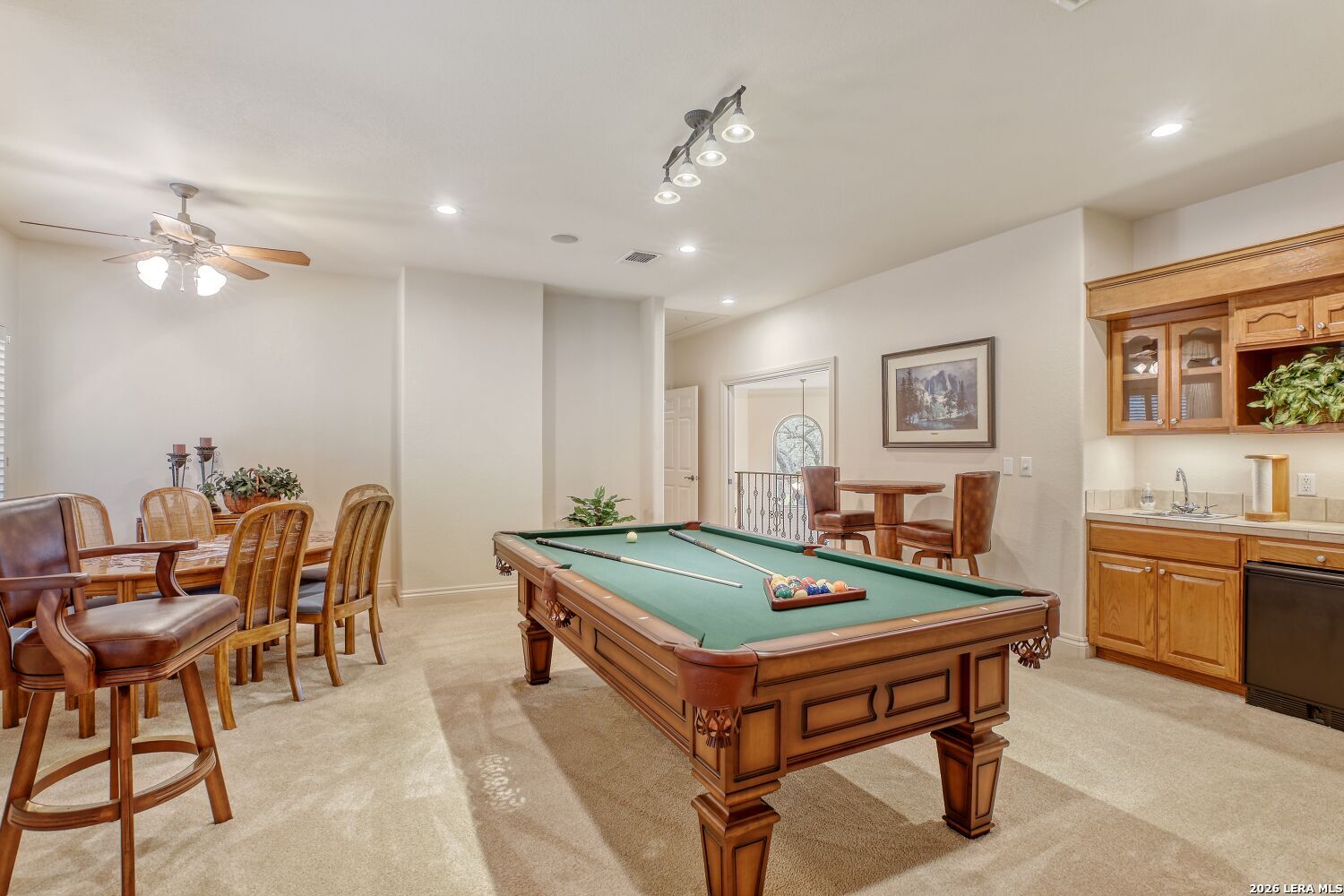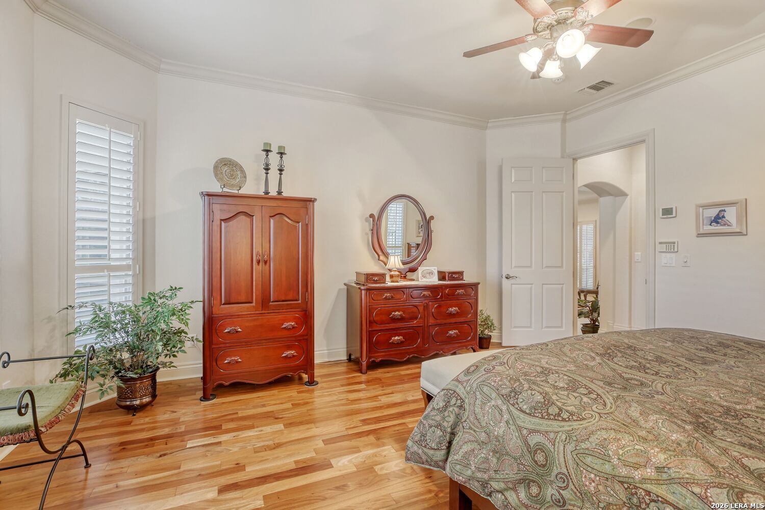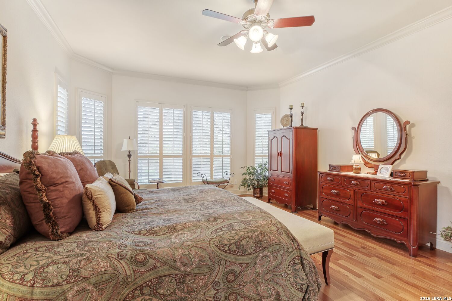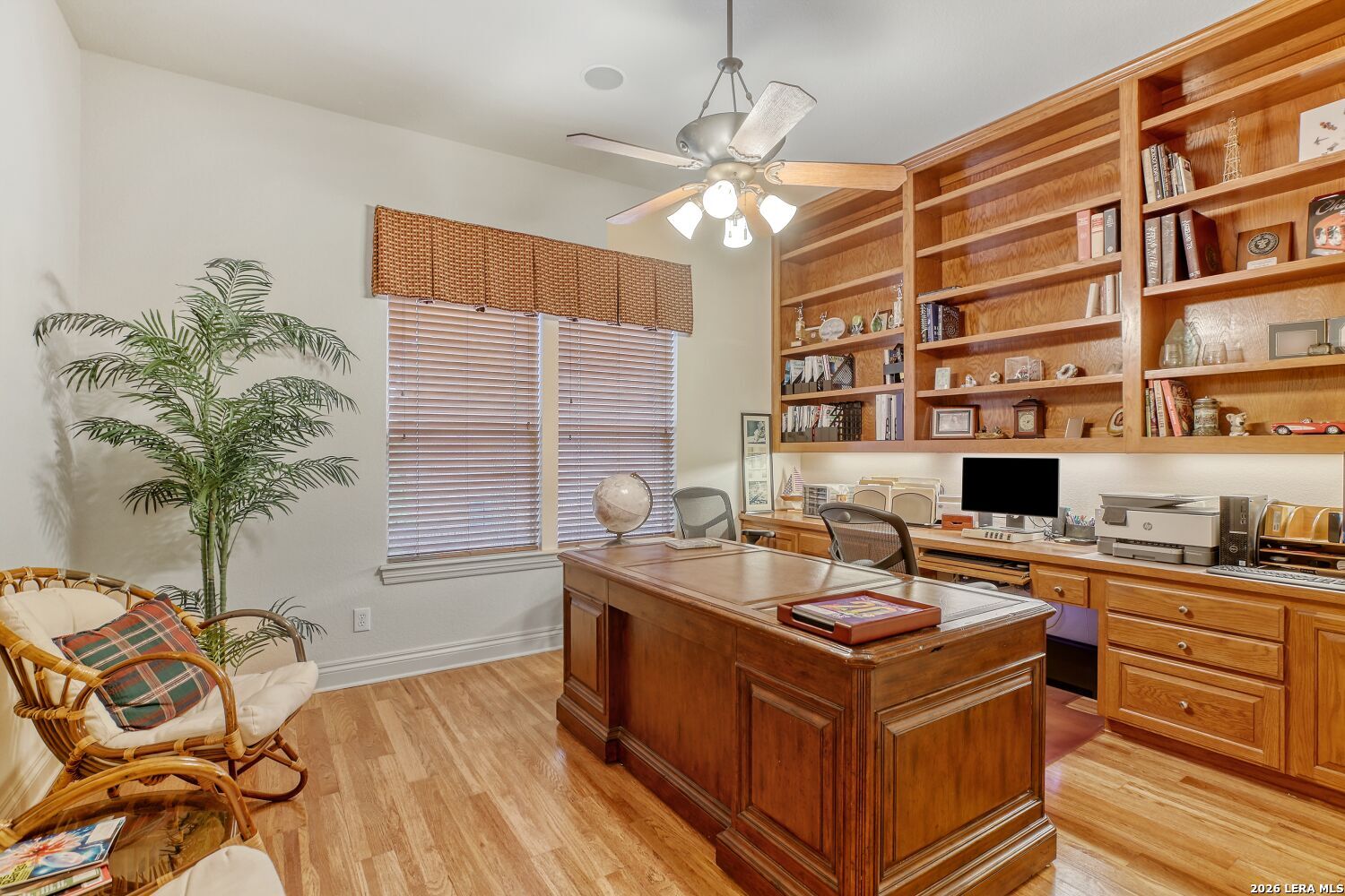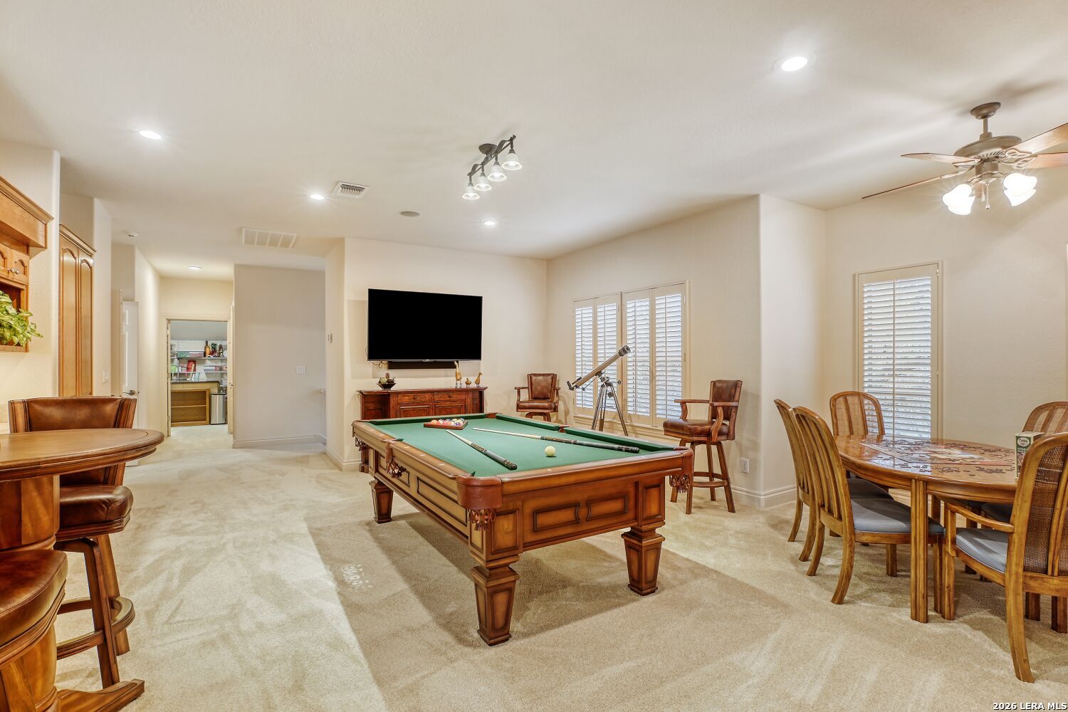 Exceptional custom residence in the guarded and gated Estates section of Inwood, thoughtfully designed by acclaimed designer Michael Hyden, and masterfully built by respected custom builder Terry Espensen. Completed in 2000, this Mediterranean-inspired home blends timeless architecture, thoughtful craftsmanship, and beautifully landscaped surroundings. Set on a tree-studded half-acre lot, the property is framed by mature Live Oak, Post Oak, Cedar Elm, and other native trees, creating a private and tranquil setting enhanced by extensive landscaping. The stucco and stone exterior offers classic Mediterranean character, while inside, soaring ceilings ranging from 10 to 20 feet, a dramatic barrel entry, and two staircases create a sense of openness and architectural interest throughout. Designed for both everyday living and memorable gatherings, the home features a formal dining room with an included wine cellar, a welcoming family room anchored by a custom cantera stone gas fireplace, and a built-in media cabinet with TV. Just beyond is a charming piano or sitting room, ideal for conversation or quiet evenings at home. The kitchen is beautifully appointed with high-end granite countertops and premium appliances including Bosch and GE Profile appliances, an induction cooktop, warming drawer, and a Sub-Zero 48-inch cabinet-depth refrigerator. Thoughtful details such as a unique fold-out cabinet pantry, electric operated trash/recycle drawer, and dedicated cookbook shelving make the space both functional and distinctive. The spacious downstairs primary suite offers a peaceful retreat with two generous closets, a walk-in glass block shower, and a jacuzzi tub. An adjacent exercise room with additional storage adds flexibility for wellness or private workspace. Also on the main level is a study, or additional bedroom with an adjacent full bath, offering versatility for guests, or a home office. The laundry room is exceptionally functional, featuring extra cabinets, closets, hanging space, under-stair storage, and even a laundry chute from the upstairs level. Upstairs, two additional bedrooms with full baths are complemented by a large game room with an included pool table/table-tennis combination, as well as a walk-in craft, media, or flex room with a tabletop workspace and abundant storage. Car enthusiasts and hobbyists will appreciate the oversized three-car garage, finished with polyaspartic flooring, built-in cabinets and workbench, an additional refrigerator, hanging storage panels, and both fixed and electric overhead storage. Outdoor living is equally inviting. The expansive rear patio provides generous seating areas and is equipped with a 32-inch Delta Heat gas grill and a Large Big Green Egg, creating the perfect setting for entertaining or relaxing evenings outdoors. A dedicated storage and internet distribution hub room adds practical convenience. Additional features throughout the home include wired speakers in most rooms, Cat-5 ethernet cabling for enhanced connectivity, four HVAC systems (three primary units plus a split unit), and customizable Elfa shelving in many closets. Thoughtfully designed and meticulously maintained, this Inwood Estates residence offers distinctive architecture, versatile living spaces, and exceptional amenities in one of San Antonio's premier guard and gated communities.