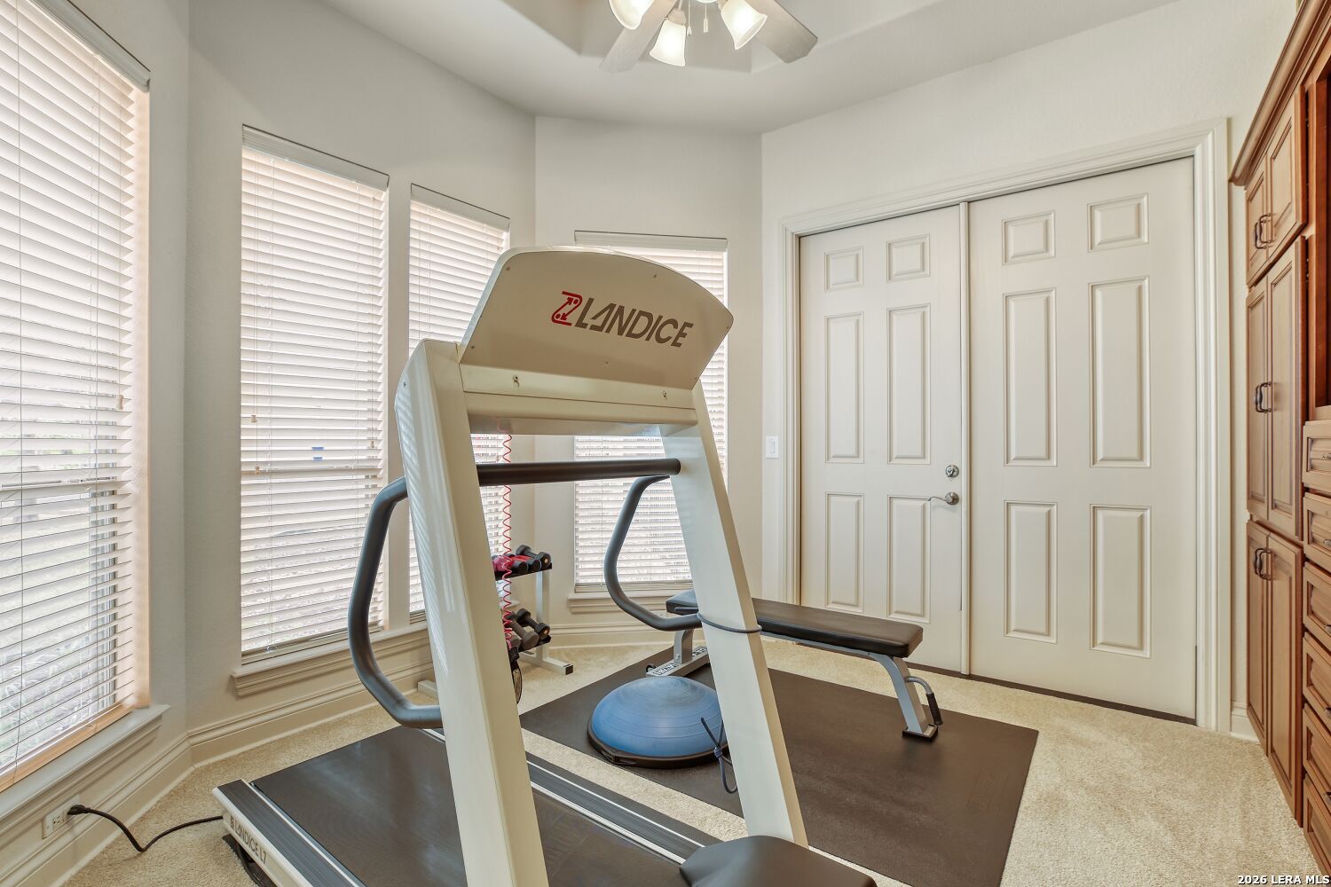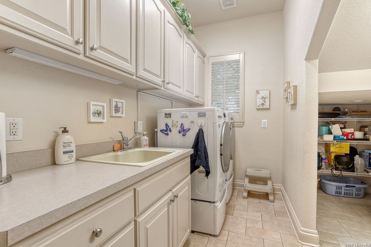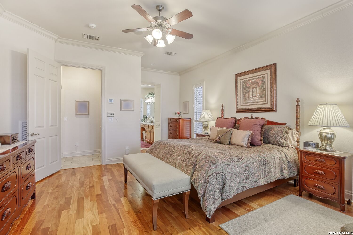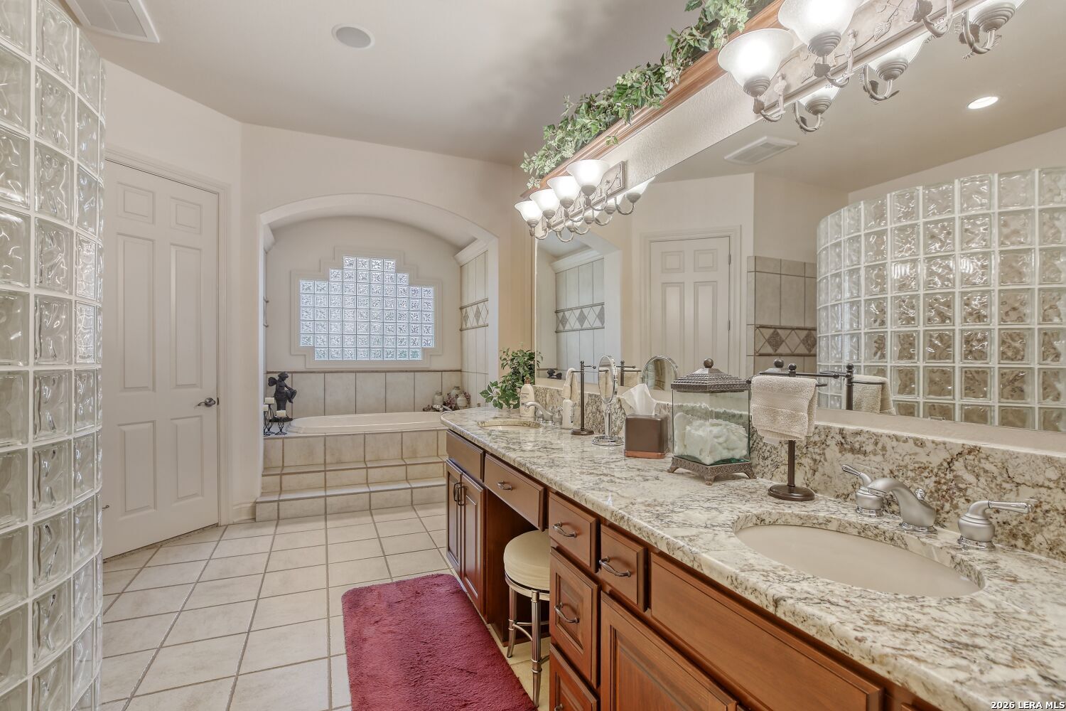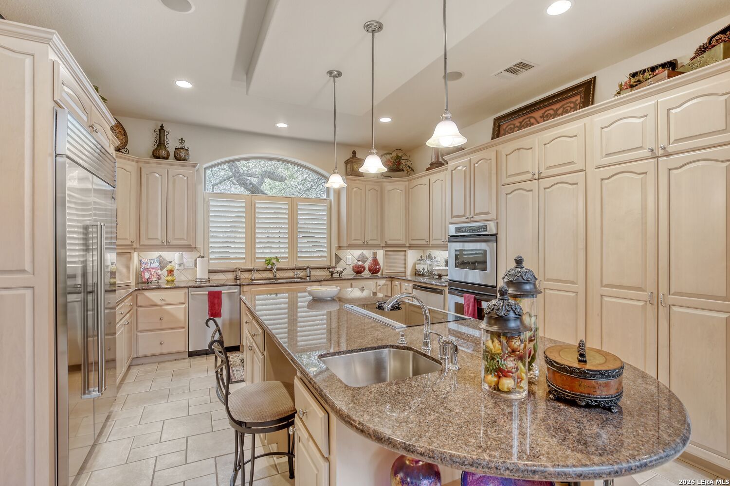 Exceptional custom residence in the guarded and gated Estates section of Inwood, thoughtfully designed by acclaimed designer Michael Hyden, and masterfully built by respected custom builder Terry Espensen. Completed in 2000, this Mediterranean-inspired home blends timeless architecture, thoughtful craftsmanship, and beautifully landscaped surroundings. Set on a tree-studded half-acre lot, the property is framed by mature Live Oak, Post Oak, Cedar Elm, and other native trees, creating a private and tranquil setting enhanced by extensive landscaping. The stucco and stone exterior offers classic Mediterranean character, while inside, soaring ceilings ranging from 10 to 20 feet, a dramatic barrel entry, and two staircases create a sense of openness and architectural interest throughout. Designed for both everyday living and memorable gatherings, the home features a formal dining room with an included wine cellar, a welcoming family room anchored by a custom cantera stone gas fireplace, and a built-in media cabinet with TV. Just beyond is a charming piano or sitting room, ideal for conversation or quiet evenings at home. The kitchen is beautifully appointed with high-end granite countertops and premium appliances including Bosch and GE Profile appliances, an induction cooktop, warming drawer, and a Sub-Zero 48-inch cabinet-depth refrigerator. Thoughtful details such as a unique fold-out cabinet pantry, electric operated trash/recycle drawer, and dedicated cookbook shelving make the space both functional and distinctive. The spacious downstairs primary suite offers a peaceful retreat with two generous closets, a walk-in glass block shower, and a jacuzzi tub. An adjacent exercise room with additional storage adds flexibility for wellness or private workspace. Also on the main level is a study, or additional bedroom with an adjacent full bath, offering versatility for guests, or a home office. The laundry room is exceptionally functional, featuring extra cabinets, closets, hanging space, under-stair storage, and even a laundry chute from the upstairs level. Upstairs, two additional bedrooms with full baths are complemented by a large game room with an included pool table/table-tennis combination, as well as a walk-in craft, media, or flex room with a tabletop workspace and abundant storage. Car enthusiasts and hobbyists will appreciate the oversized three-car garage, finished with polyaspartic flooring, built-in cabinets and workbench, an additional refrigerator, hanging storage panels, and both fixed and electric overhead storage. Outdoor living is equally inviting. The expansive rear patio provides generous seating areas and is equipped with a 32-inch Delta Heat gas grill and a Large Big Green Egg, creating the perfect setting for entertaining or relaxing evenings outdoors. A dedicated storage and internet distribution hub room adds practical convenience. Additional features throughout the home include wired speakers in most rooms, Cat-5 ethernet cabling for enhanced connectivity, four HVAC systems (three primary units plus a split unit), and customizable Elfa shelving in many closets. Thoughtfully designed and meticulously maintained, this Inwood Estates residence offers distinctive architecture, versatile living spaces, and exceptional amenities in one of San Antonio's premier guard and gated communities.