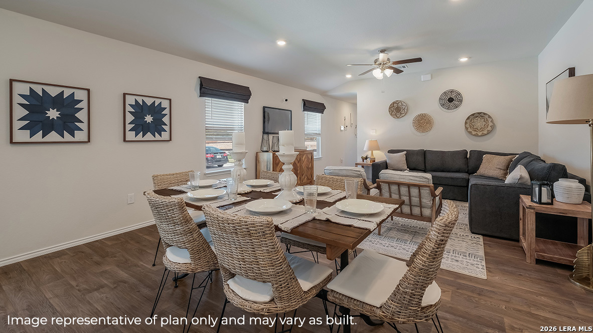The Diana plan is a large one-story home offered in Blue Ridge Ranch in San Antonio, TX. Featuring 2 classic front exteriors, 3 bedrooms, 2 baths, 2-car garage and 1535 square feet of living space, this floor plan is sure to turn heads. Comfort greets you at the door with a long foyer leading to a combined living and dining area, then flowing into the grand corner kitchen. The kitchen includes a breakfast bar with beautiful quartz counter tops, stainless steel appliances, shaker style cabinetry and a corner pantry with built-in shelving. Your blended family room and dining area feature quality sheet vinyl flooring and plenty of windows, creating a light and bright space for living and entertaining. The main bedroom is located at the back of the home and has its own attached bathroom that offers a separate water closet, tiled walk-in shower and spacious walk-in closet. All secondary bedrooms offer quality carpeted floors and a closet. These rooms are versatile. Use them as bedrooms, offices, work out rooms or other bonus spaces. The Diana floor plan also includes quartz countertops in all bathrooms, full yard landscaping and irrigation, and our HOME IS CONNECTED base package. Using one central hub that talks to all the devices in your home, you can control the lights, thermostat and locks, all from your cellular device.