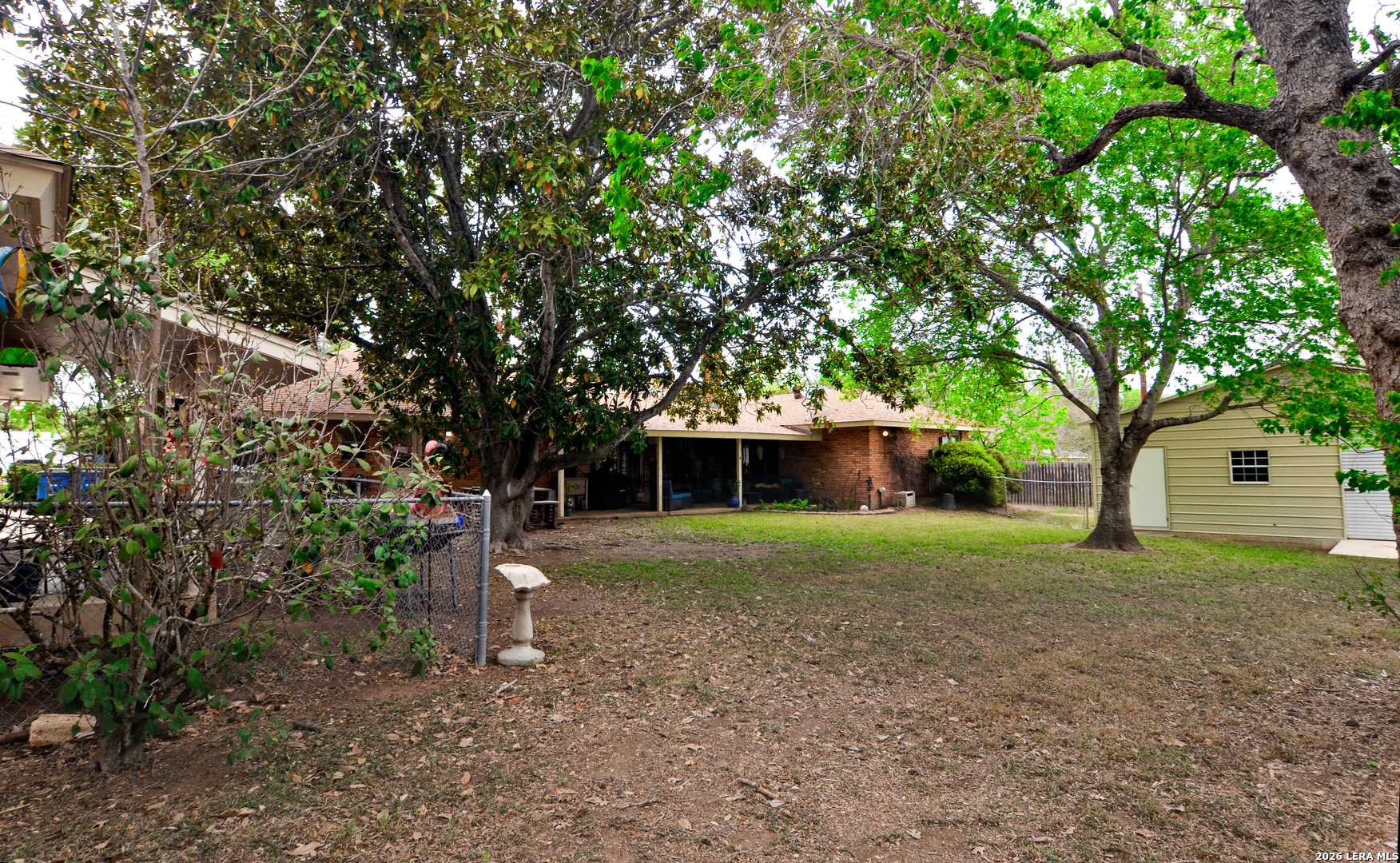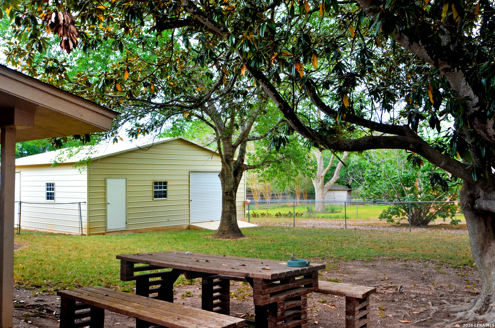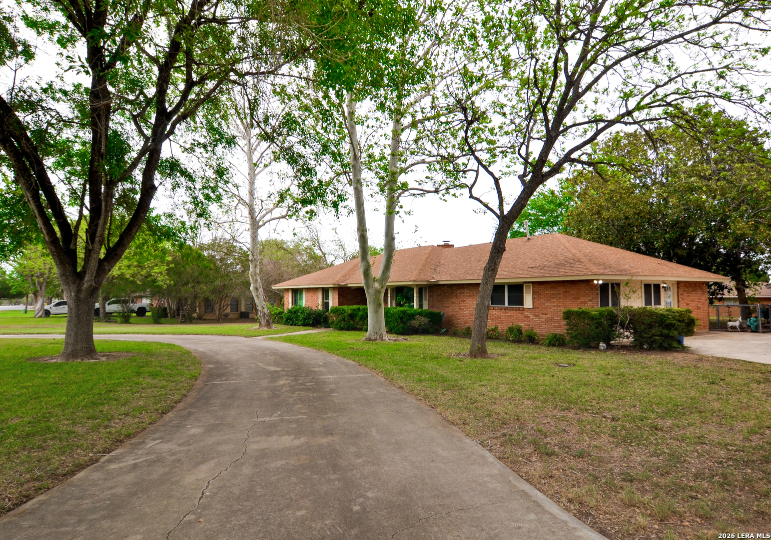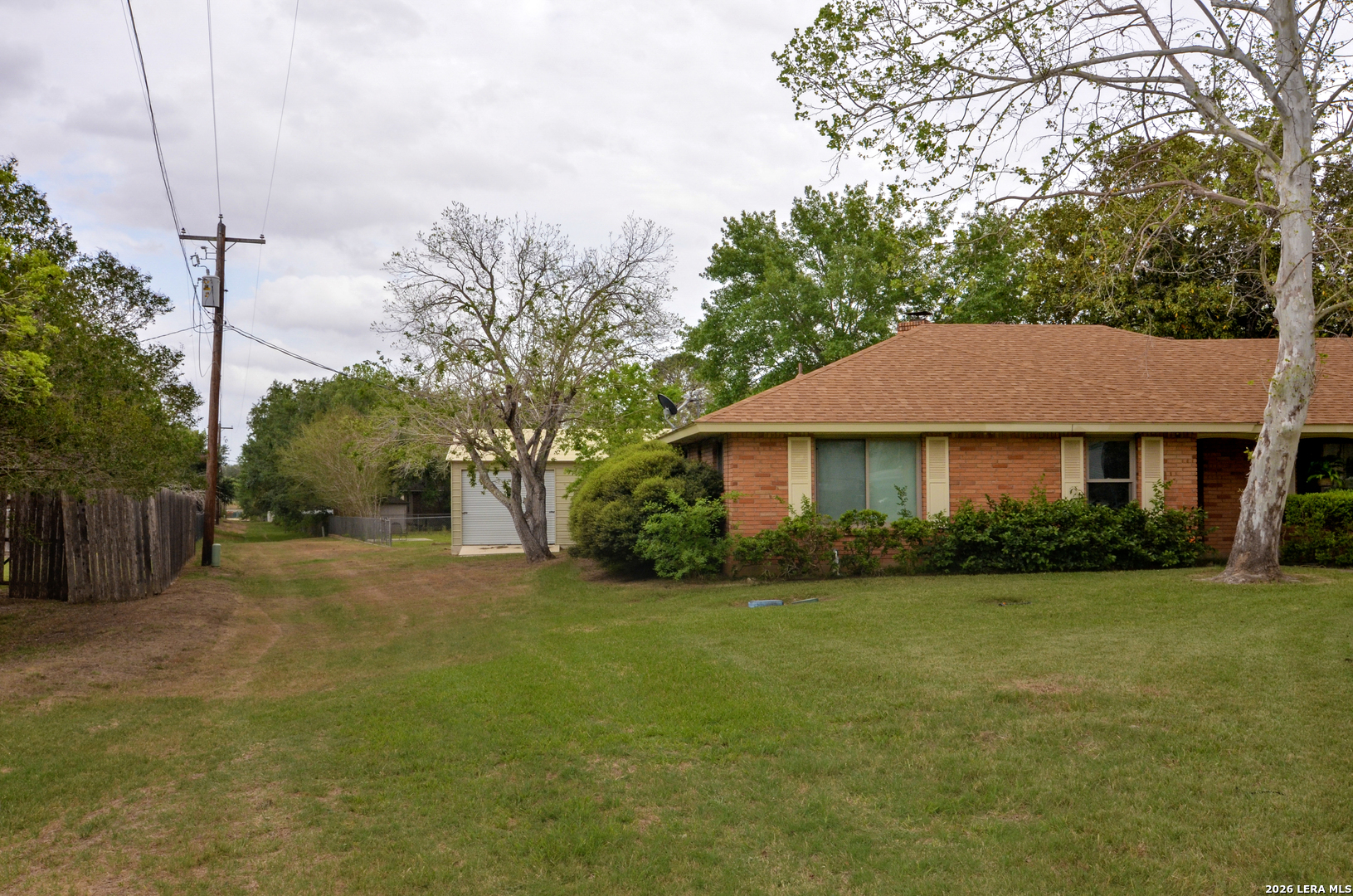 Floresville Estate with Guest House & Workshop. Versatility meets convenience on this lush 0.5-acre property. This expansive estate features a main residence, a fully independent guest apartment and 2 outer building for storage. Property also has two driveways the main one located on F Street with a separate one in the back off of Cottonwood. Main Residence (2,645 sqft): The primary home centers around a main living area off of the kitchen. Kitchen has a breakfast nook and eat-in bar. Flexibility is key: the oversized den includes dedicated office space, while the formal dining and sitting areas adapt to your lifestyle. The home features 3 bedrooms, 2.5 bathrooms, and abundant storage throughout. Practicality is built-in with a spacious laundry/mudroom and half bath located just off the back patio. Independent Guest Apartment (570 sqft): This self-contained 1-bedroom 1 bath unit includes a full kitchen, living area, laundry room, and 40ft covered porch with separate driveway located at the rear of the property off Cottonwood. Exterior & Mechanicals: Workshop: 16x20 metal building + additional wood storage shed. Landscaping: Mature Live Oak, Magnolia and Fig trees, a circle drive, and a deep backyard that extends beyond the chainlink fence. New HVAC