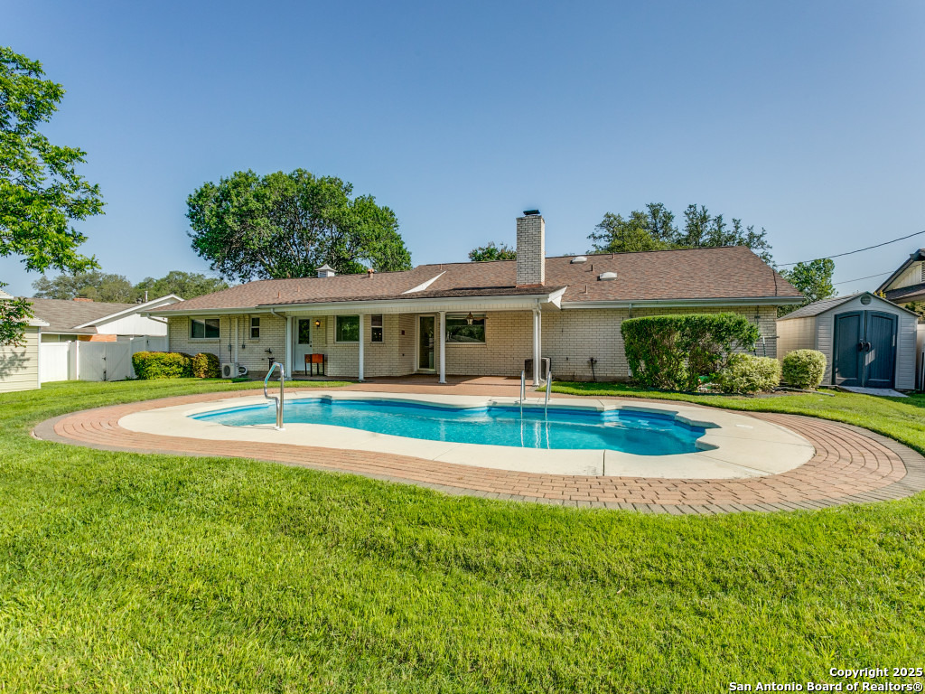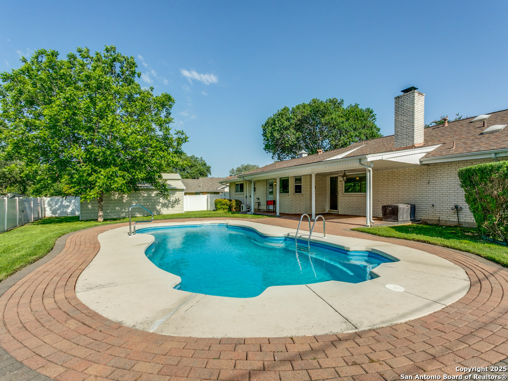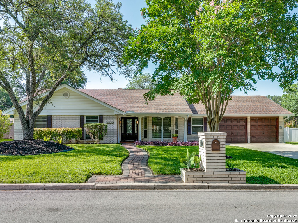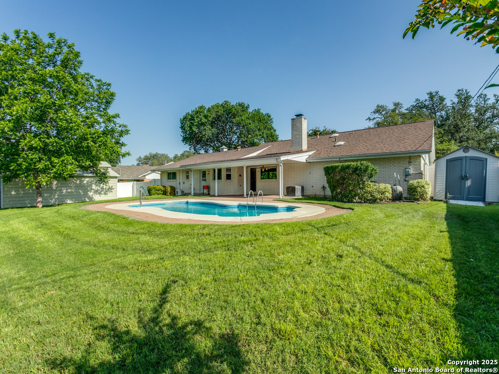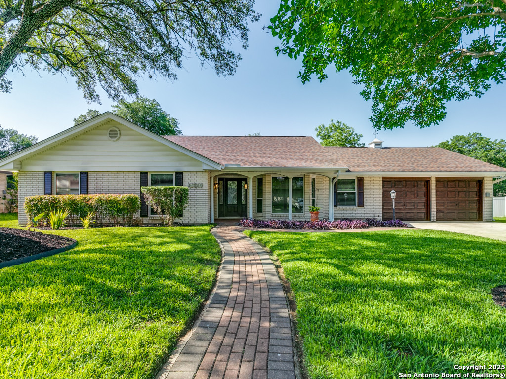 One-story ranch-style home in Windcrest featuring 3 bedrooms, 2.5 baths, and a dedicated office. Enjoy wood floors, a cozy fireplace with gas logs, and a kitchen with quartz countertops and gas cooking. The primary suite offers a walk-in closet and all bedrooms include built-ins. Fresh paint, updated electrical, whole-house surge protector and water softener provide peace of mind. Outside relax by the pool, enjoy RV parking, a storage shed, a sprinkler system, and privacy fencing. With a two-car garage and modern updates throughout, this home is move-in ready!
