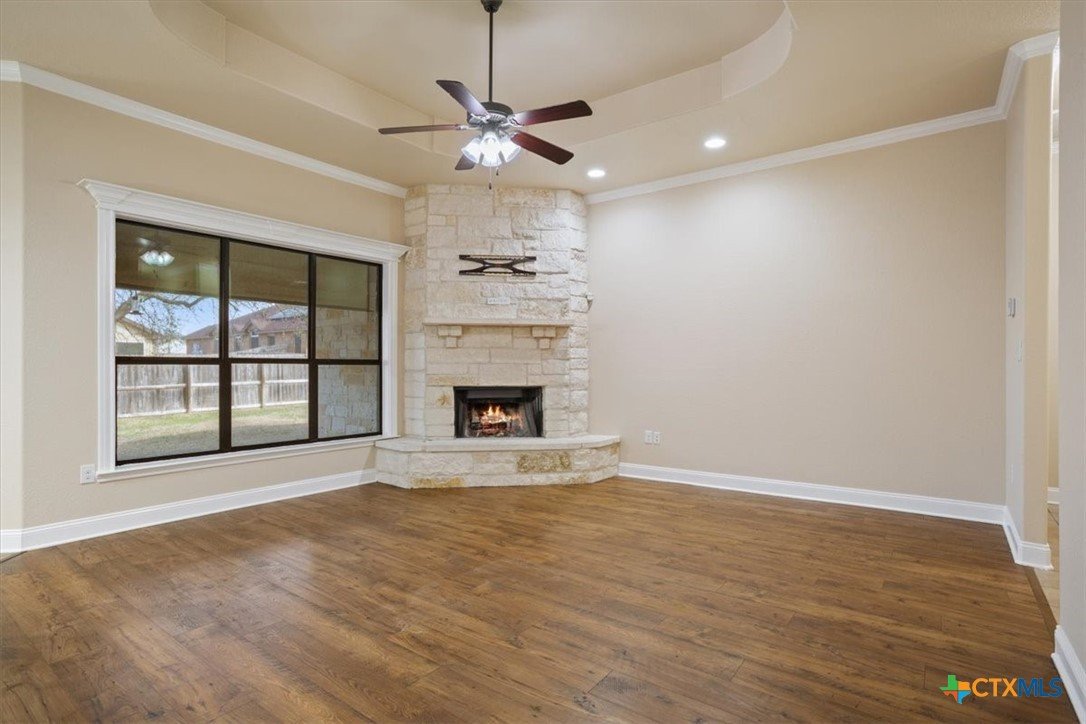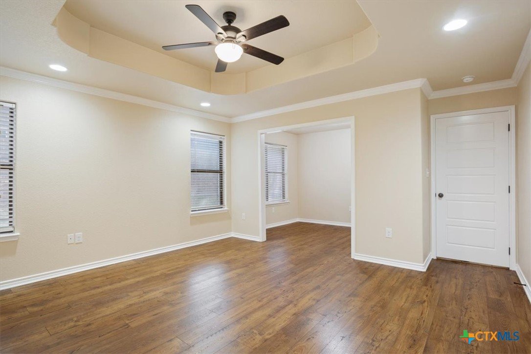 Welcome to this beautifully maintained 4-bedroom, 2-bathroom home built in 2014, located in the heart of Killeen. Designed with comfort and style in mind, this home offers the perfect blend of modern features and functional living space. Step inside to discover warm wood flooring that flows throughout the main living areas, creating an inviting and elegant atmosphere. The spacious living room is ideal for relaxing or entertaining guests, while the open-concept layout seamlessly connects to the kitchen and dining area. The kitchen is a true highlight, featuring stunning granite countertops, ample cabinet space, and modern appliances—perfect for preparing family meals or hosting gatherings. The thoughtful design ensures both beauty and practicality. The private primary suite offers a peaceful retreat, complete with its own cozy sitting area—perfect for a reading nook, home office space, or quiet relaxation spot. The en-suite bathroom provides comfort and convenience, with a walk in shower and separate soaking tub. With generous bedroom sizes, and quality finishes throughout, this home delivers both comfort and value. Built in 2014, it offers modern construction and energy-efficient features, giving you peace of mind for years to come. Located in Cosper Ridge, this home provides easy access to schools, shopping, dining, and local amenities. You can easily get to Fort Hood or Austin. Don’t miss your opportunity to own this move-in-ready gem in a thriving community.