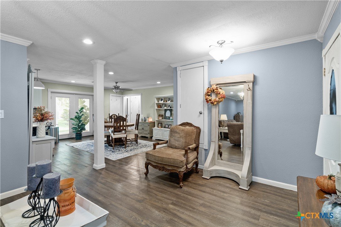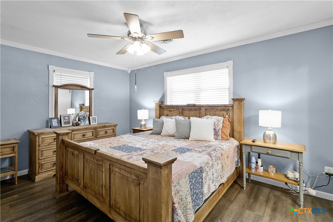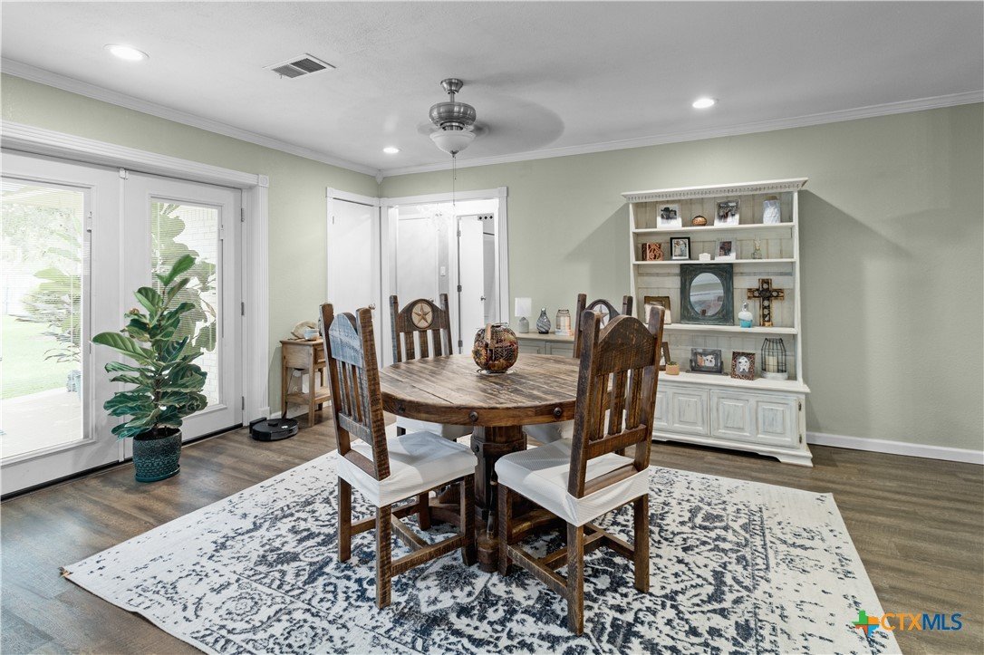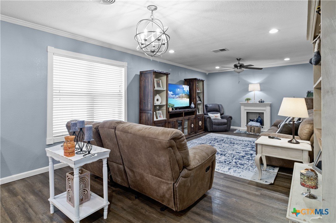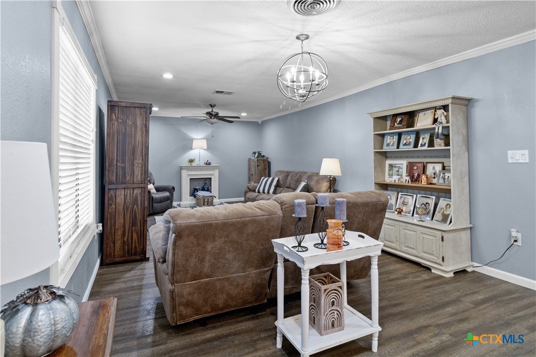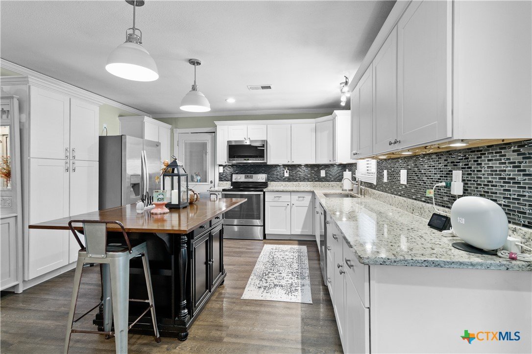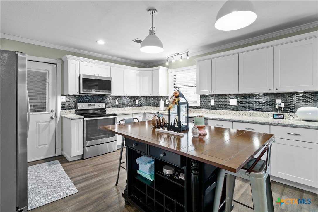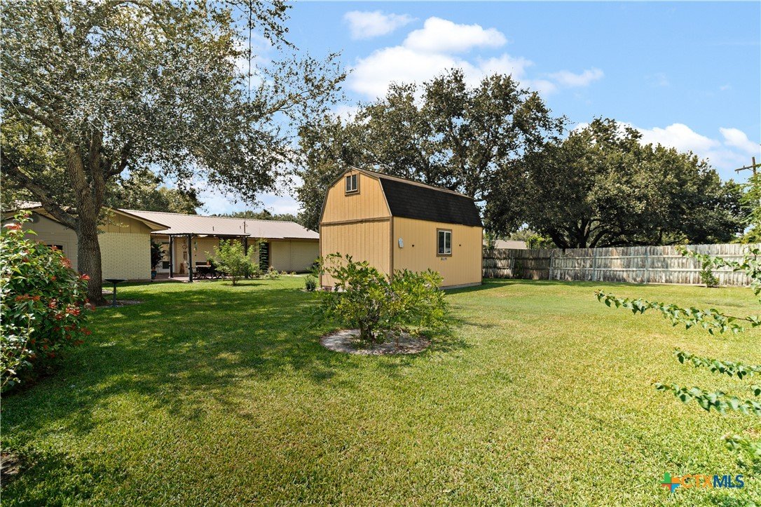 Move-in ready and beautifully updated, this 3-bedroom, 2-bath gem offers a perfect blend of style and functionality. The semi-open concept design connects the spacious living room, dining area, and kitchen—ideal for everyday living and entertaining. The kitchen shines with granite countertops, a stylish tile backsplash, premium appliances, and elegant crown molding throughout. Enjoy the added bonus of extra space in the converted garage/laundry room, plus a versatile storage building that once served as an office. The large fenced backyard is perfect for kids, pets, and outdoor gatherings. All of this in a prime location near both the elementary and high school!