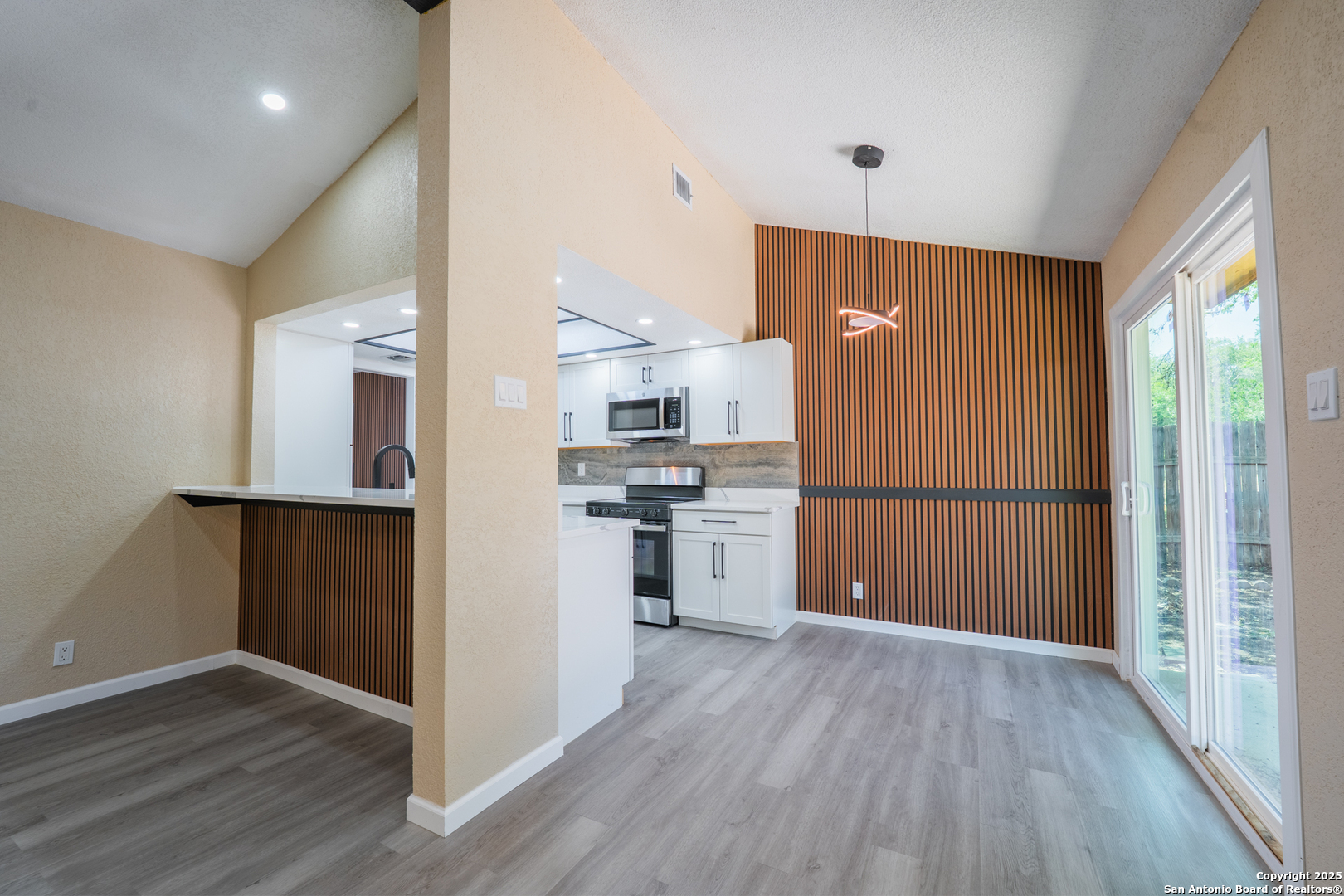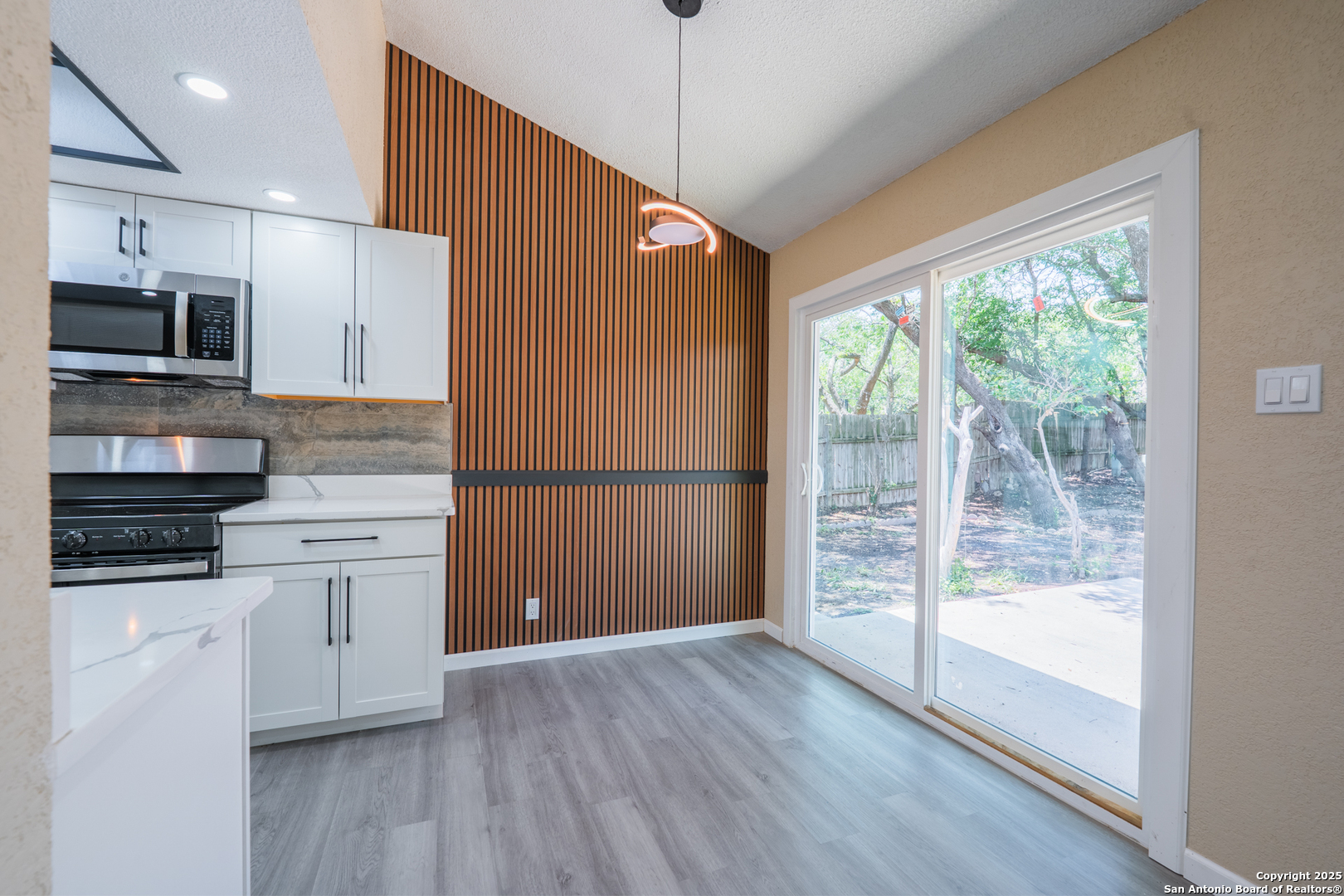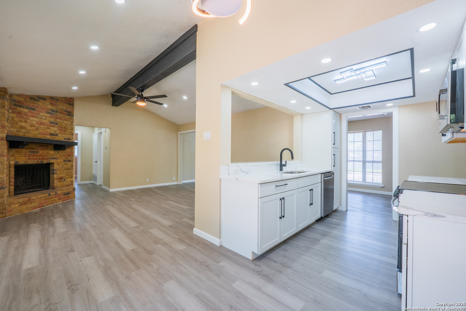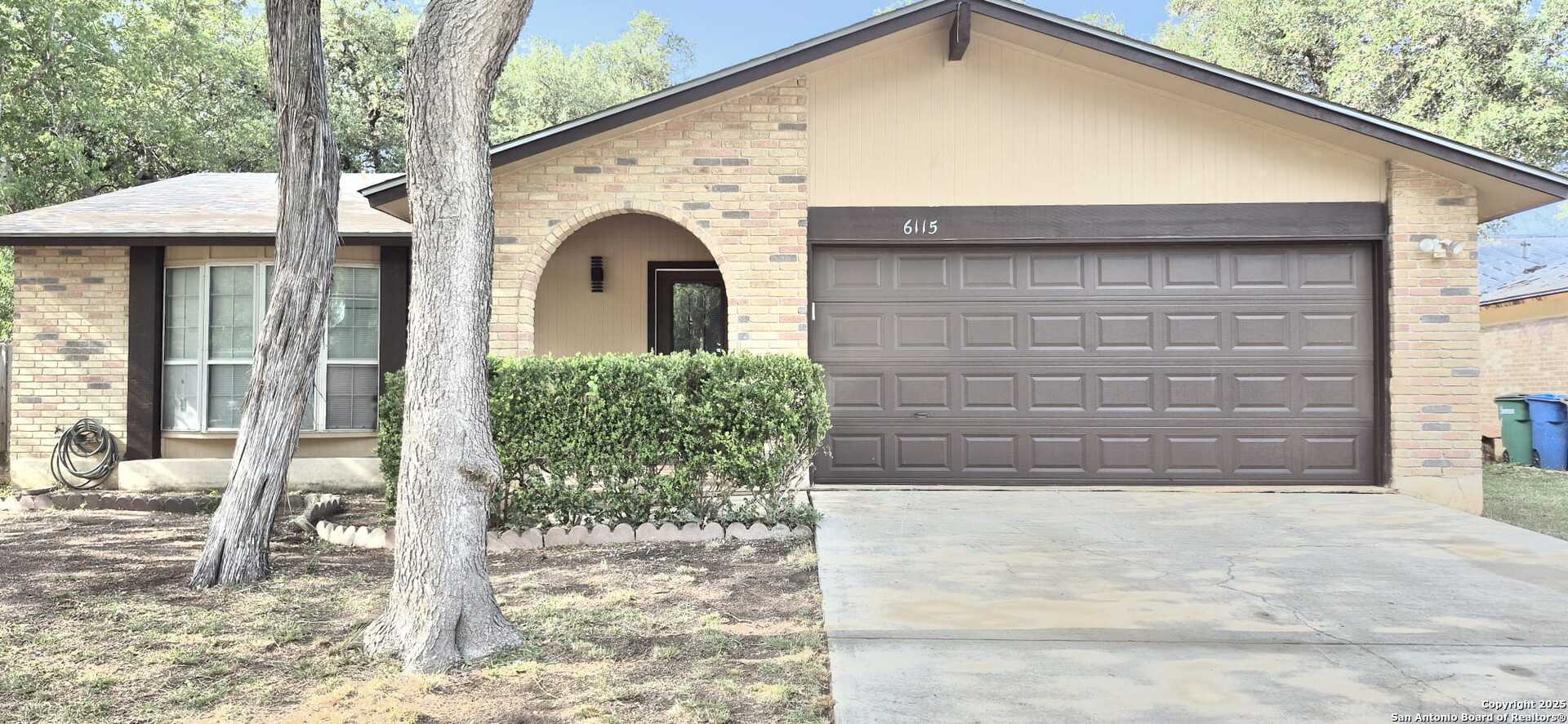 Welcome to 6115 Calderwood, a thoughtfully remodeled one-story home nestled on a mature, tree-lined lot in San Antonio. This 3-bedroom, 2-bathroom home offers approximately 1,520 square feet of updated living space. The interior features a modern open layout with high-quality laminate flooring throughout and fresh paint. The kitchen has been upgraded with quartz countertops, white cabinetry, stainless steel appliances, matte black fixtures, a contemporary backsplash, and custom ceiling lighting. A bold accent wall in the dining area adds character and style. Both bathrooms have been renovated with updated vanities, fixtures, and lighting. Most windows have been recently replaced to improve energy efficiency, natural light, and noise control. The distinctive three-panel bay window at the front of the home adds charm and enhances its beautiful curb appeal. The HVAC system was installed in May 2025 for improved climate control and energy performance. Additional features include recessed lighting, updated sheet light fixtures, and an attached garage. Conveniently located near UTSA, the Medical Center, and local parks, this move-in ready home offers a great blend of comfort, style, and location.