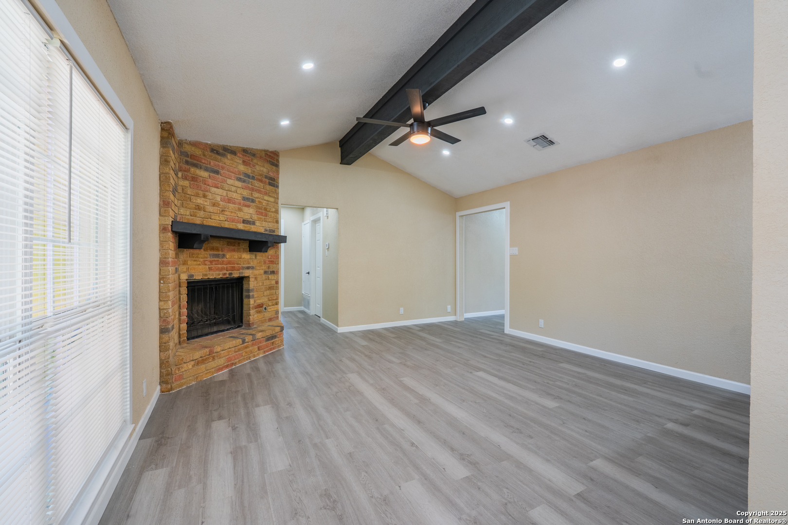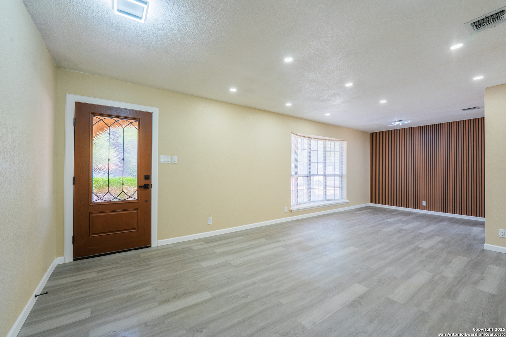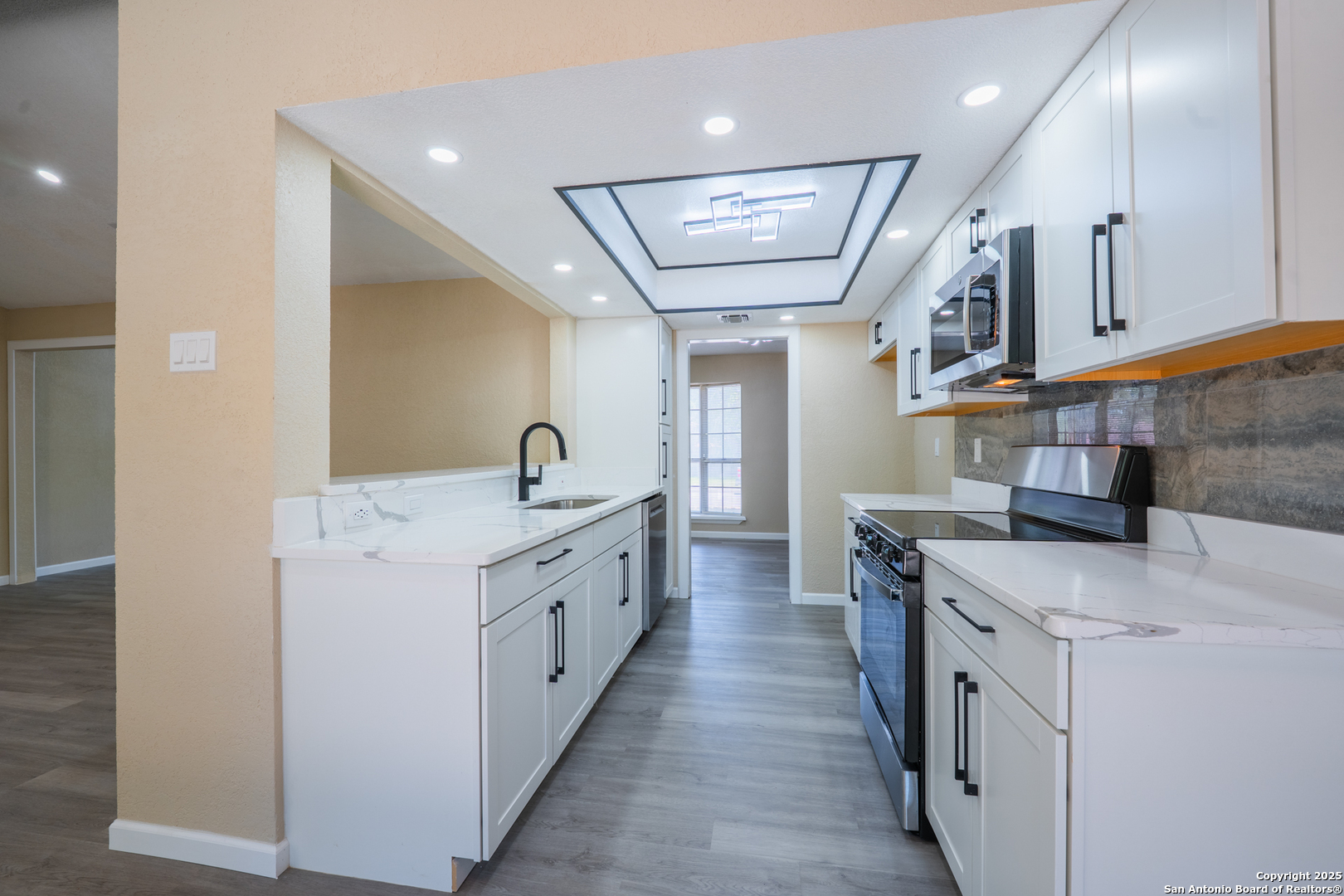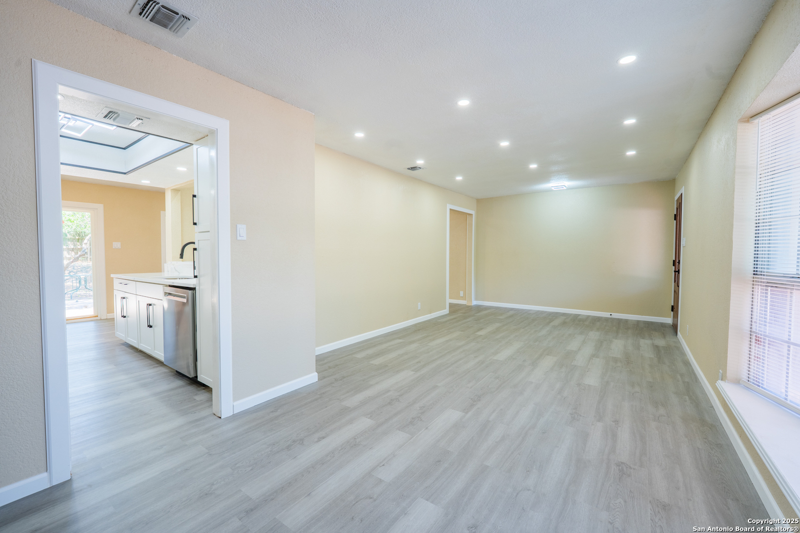 Welcome to 6115 Calderwood, a thoughtfully remodeled one-story home nestled on a mature, tree-lined lot in San Antonio. This 3-bedroom, 2-bathroom home offers approximately 1,520 square feet of updated living space. The interior features a modern open layout with high-quality laminate flooring throughout and fresh paint. The kitchen has been upgraded with quartz countertops, white cabinetry, stainless steel appliances, matte black fixtures, a contemporary backsplash, and custom ceiling lighting. A bold accent wall in the dining area adds character and style. Both bathrooms have been renovated with updated vanities, fixtures, and lighting. Most windows have been recently replaced to improve energy efficiency, natural light, and noise control. The distinctive three-panel bay window at the front of the home adds charm and enhances its beautiful curb appeal. The HVAC system was installed in May 2025 for improved climate control and energy performance. Additional features include recessed lighting, updated sheet light fixtures, and an attached garage. Conveniently located near UTSA, the Medical Center, and local parks, this move-in ready home offers a great blend of comfort, style, and location.
