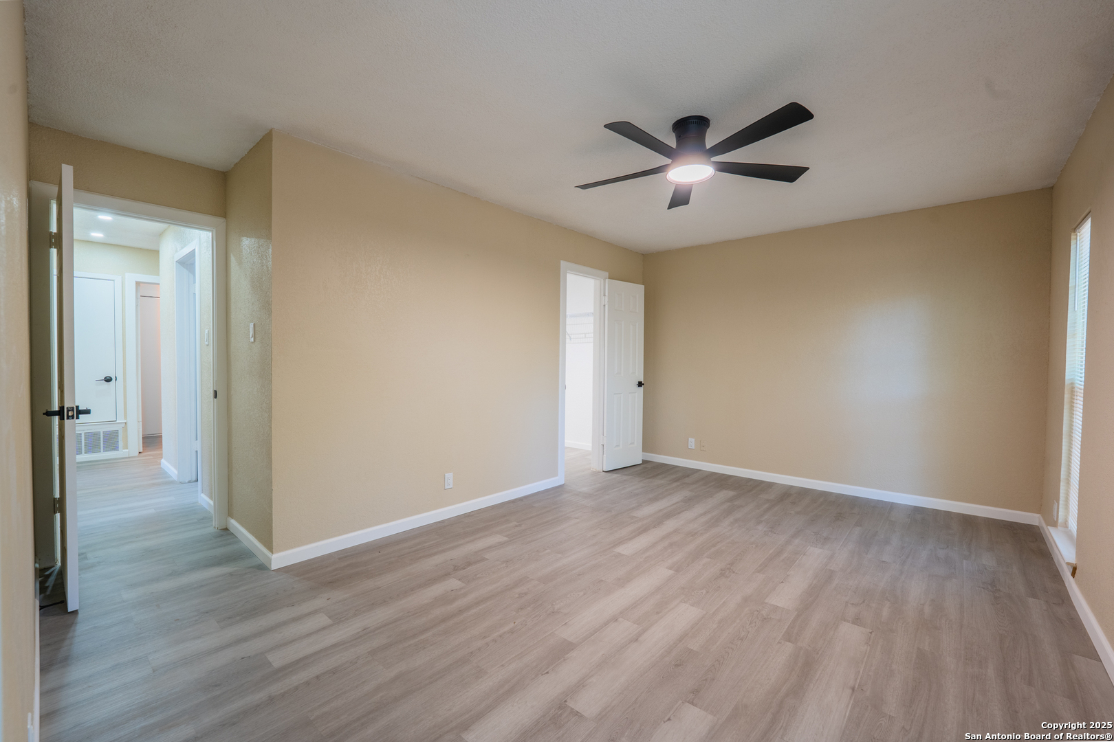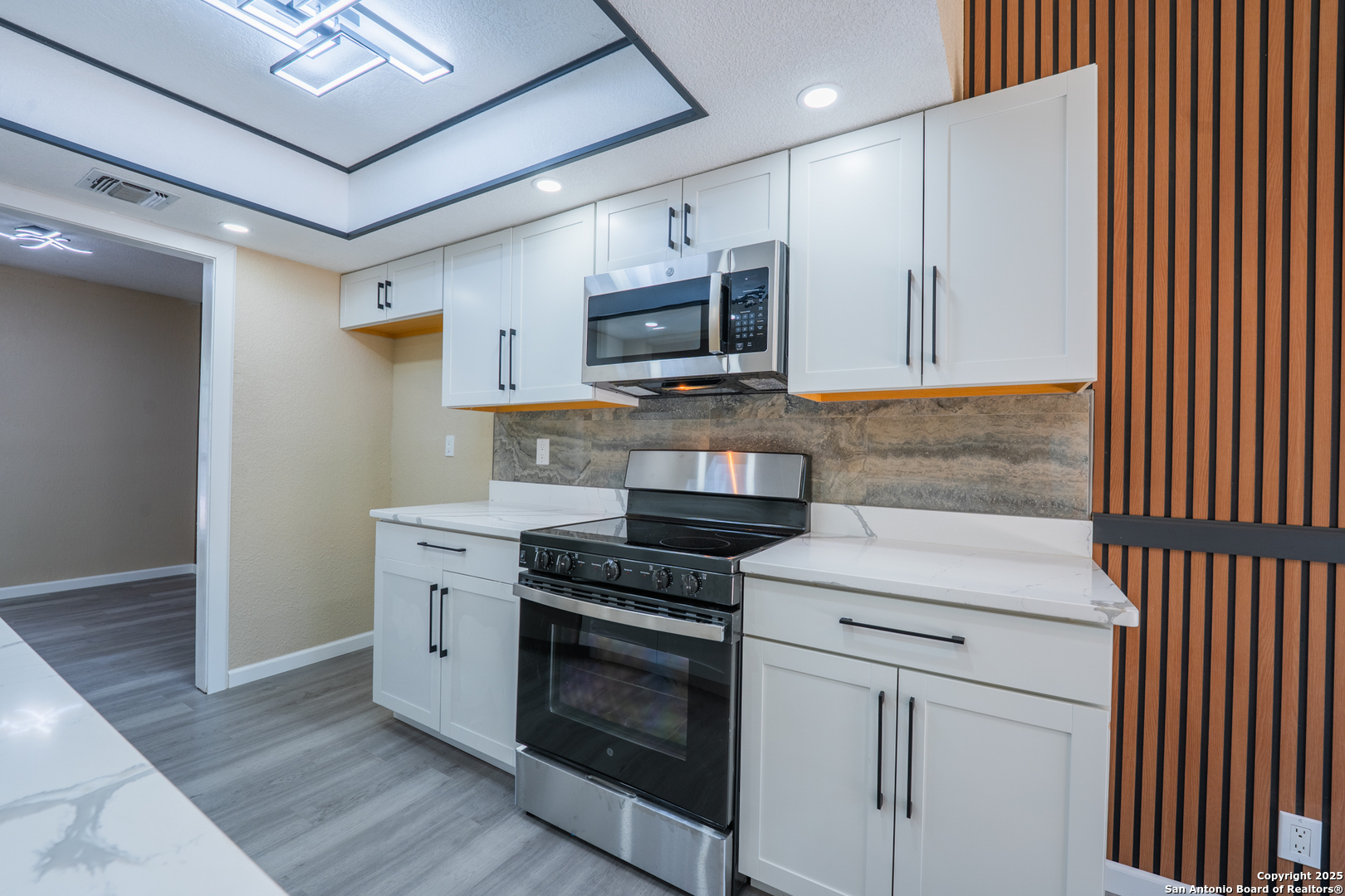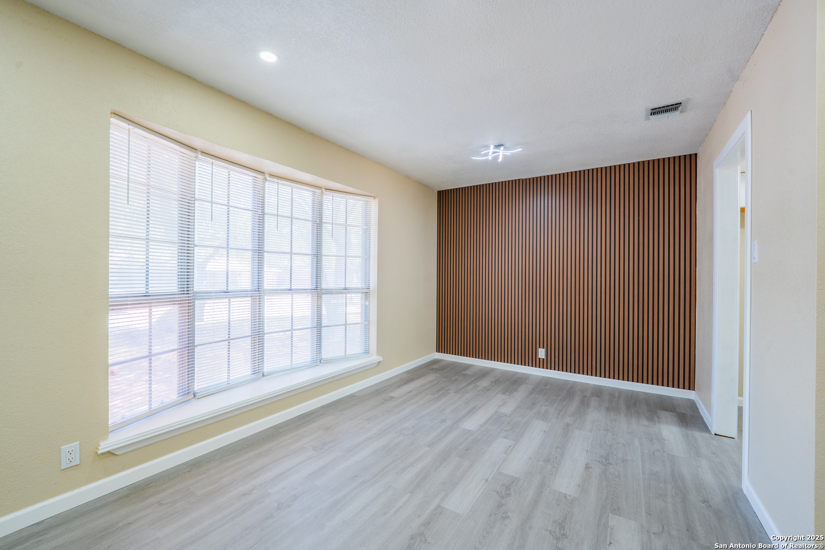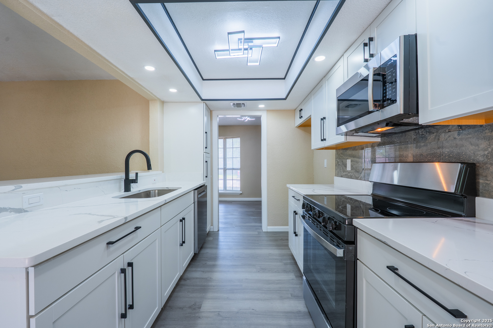 Welcome to 6115 Calderwood, a thoughtfully remodeled one-story home nestled on a mature, tree-lined lot in San Antonio. This 3-bedroom, 2-bathroom home offers approximately 1,520 square feet of updated living space. The interior features a modern open layout with high-quality laminate flooring throughout and fresh paint. The kitchen has been upgraded with quartz countertops, white cabinetry, stainless steel appliances, matte black fixtures, a contemporary backsplash, and custom ceiling lighting. A bold accent wall in the dining area adds character and style. Both bathrooms have been renovated with updated vanities, fixtures, and lighting. Most windows have been recently replaced to improve energy efficiency, natural light, and noise control. The distinctive three-panel bay window at the front of the home adds charm and enhances its beautiful curb appeal. The HVAC system was installed in May 2025 for improved climate control and energy performance. Additional features include recessed lighting, updated sheet light fixtures, and an attached garage. Conveniently located near UTSA, the Medical Center, and local parks, this move-in ready home offers a great blend of comfort, style, and location.