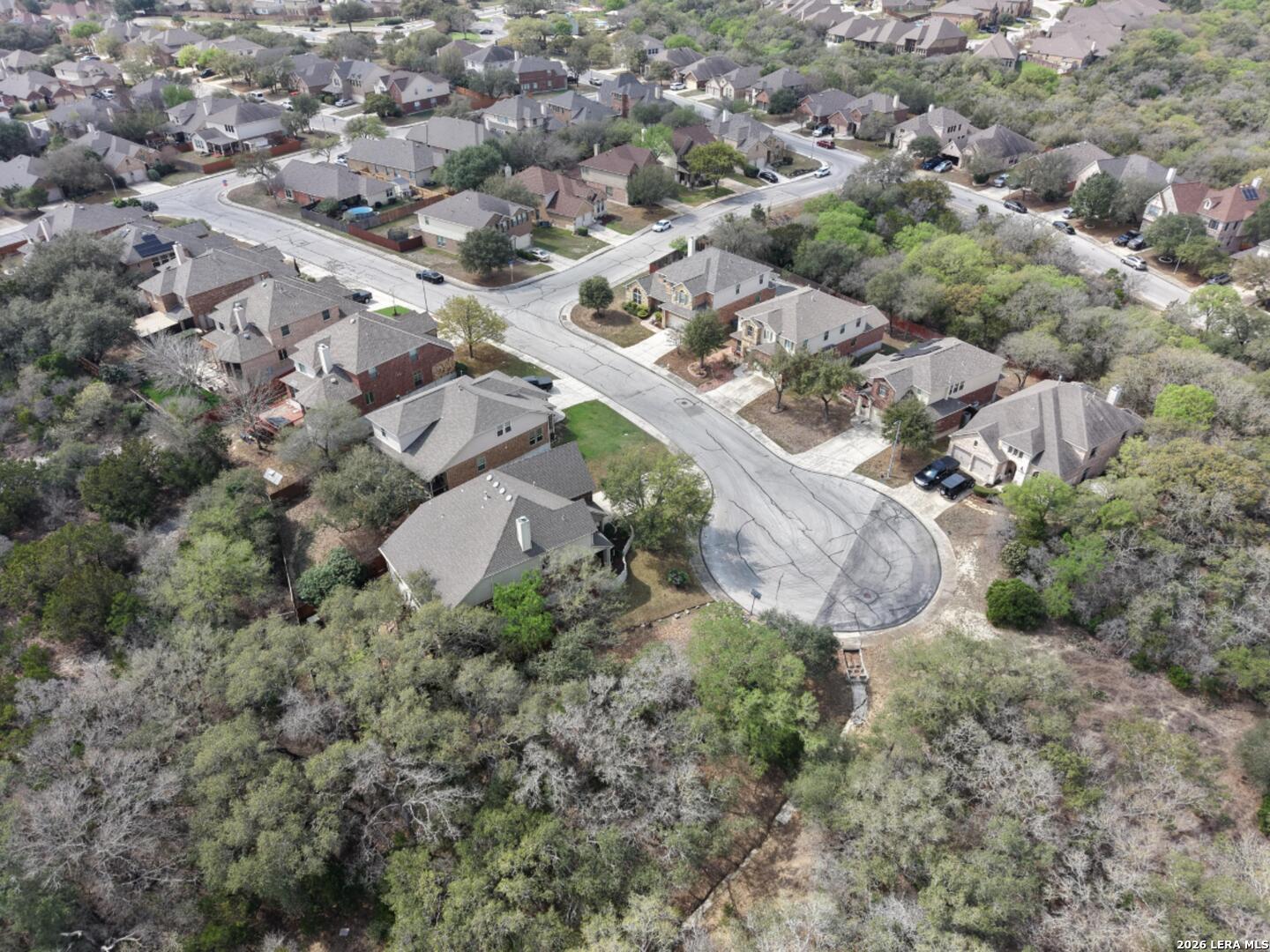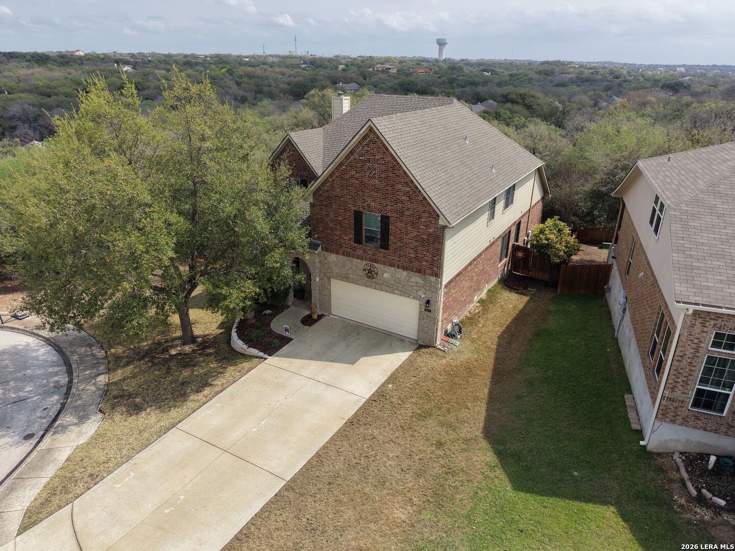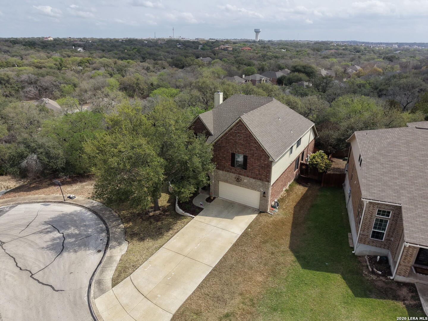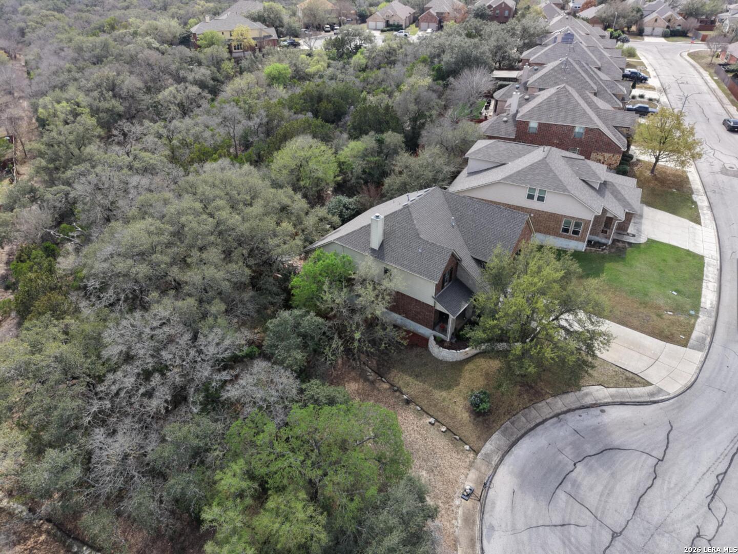 Welcome to 614 Colossus Way, a stunning 4-bedroom 2.5-bath home tucked away on a private cul-de-sac lot that backs to a serene greenbelt. From the moment you arrive, you'll feel the peaceful atmosphere as you step onto the inviting covered front porch. Inside, the bright open floor plan is filled with natural light and features rich wood flooring throughout. A formal dining room sits to your left, creating the perfect space for gatherings and holiday meals. The spacious living area offers a cozy fireplace and large windows that frame sweeping views of mature trees and the tranquil outdoors. The chef's kitchen blends style and function with gas cooking, granite counters, stainless steel appliances, a center island, breakfast bar, and abundant cabinet and counter space. A private study or flex room at the back of the home provides additional space to work or unwind while enjoying picturesque Hill Country views. The downstairs primary suite showcases peaceful greenbelt views and includes a private ensuite with dual vanities and a separate tub and shower. Upstairs, you'll find three generously sized secondary bedrooms and a large game room ideal for movie nights, hobbies, or indoor fun. Step outside and enjoy one of the home's true highlights. The covered patio opens to a tiered deck that offers plenty of space for entertaining or relaxing. With no neighbors behind you and a lush backdrop of trees, the setting feels like your own private retreat. Neighborhood amenities include a pool, park/playground, and basketball court, giving you even more to love. This home offers comfort, privacy, and a beautiful natural setting all in one. Come see why 614 Colossus Way is the perfect place to settle in and enjoy the San Antonio lifestyle. Schedule your showing today!