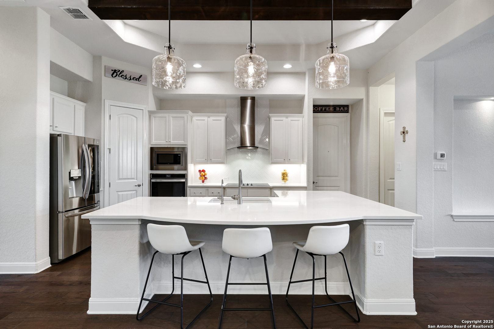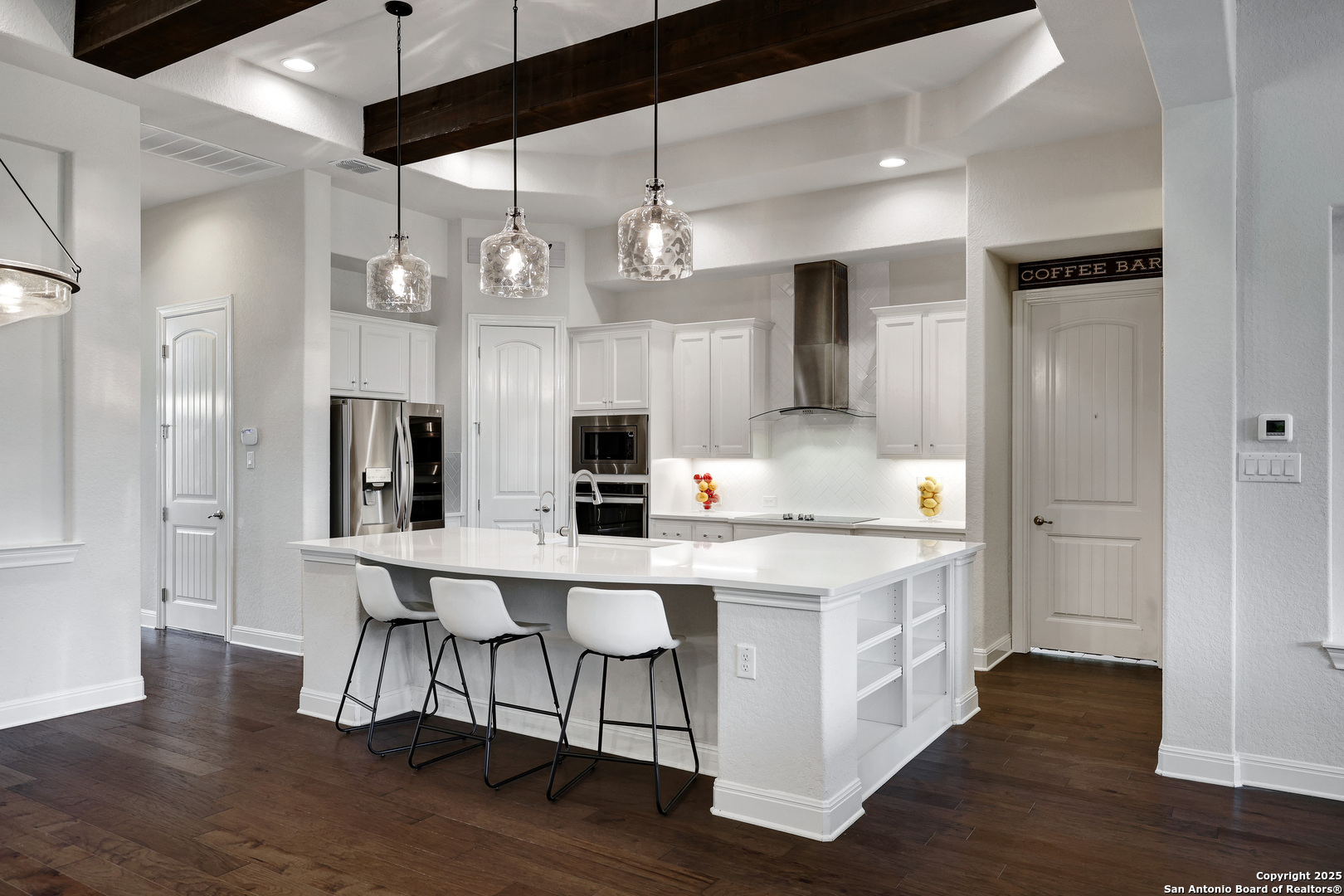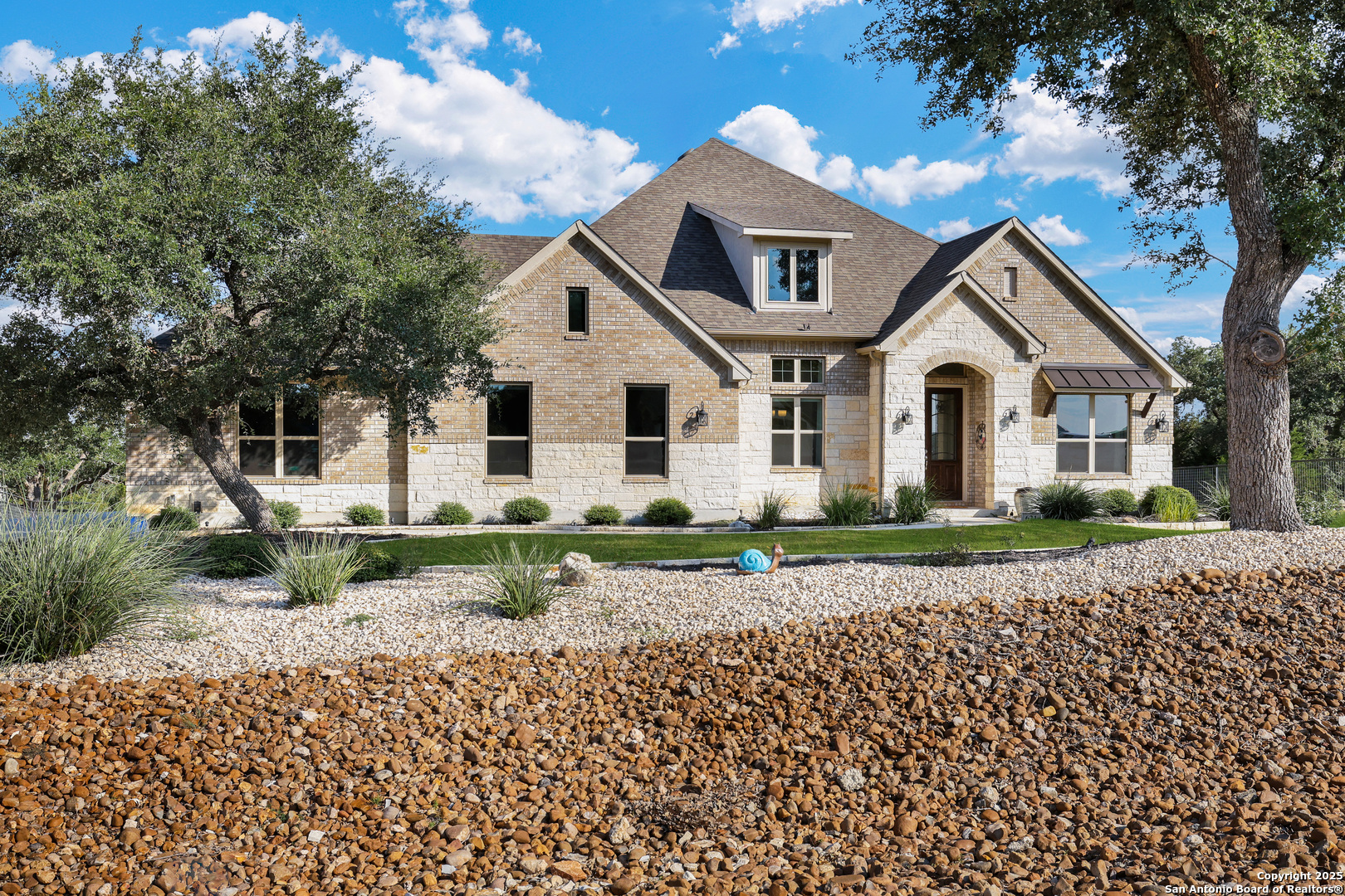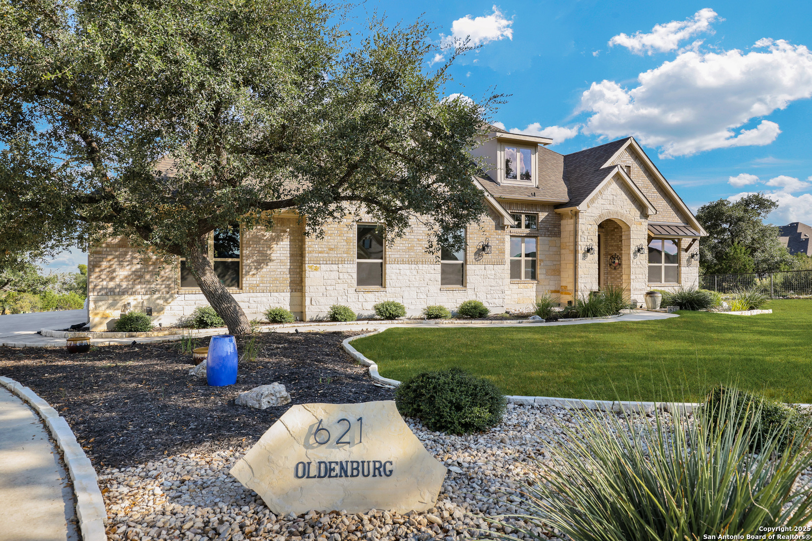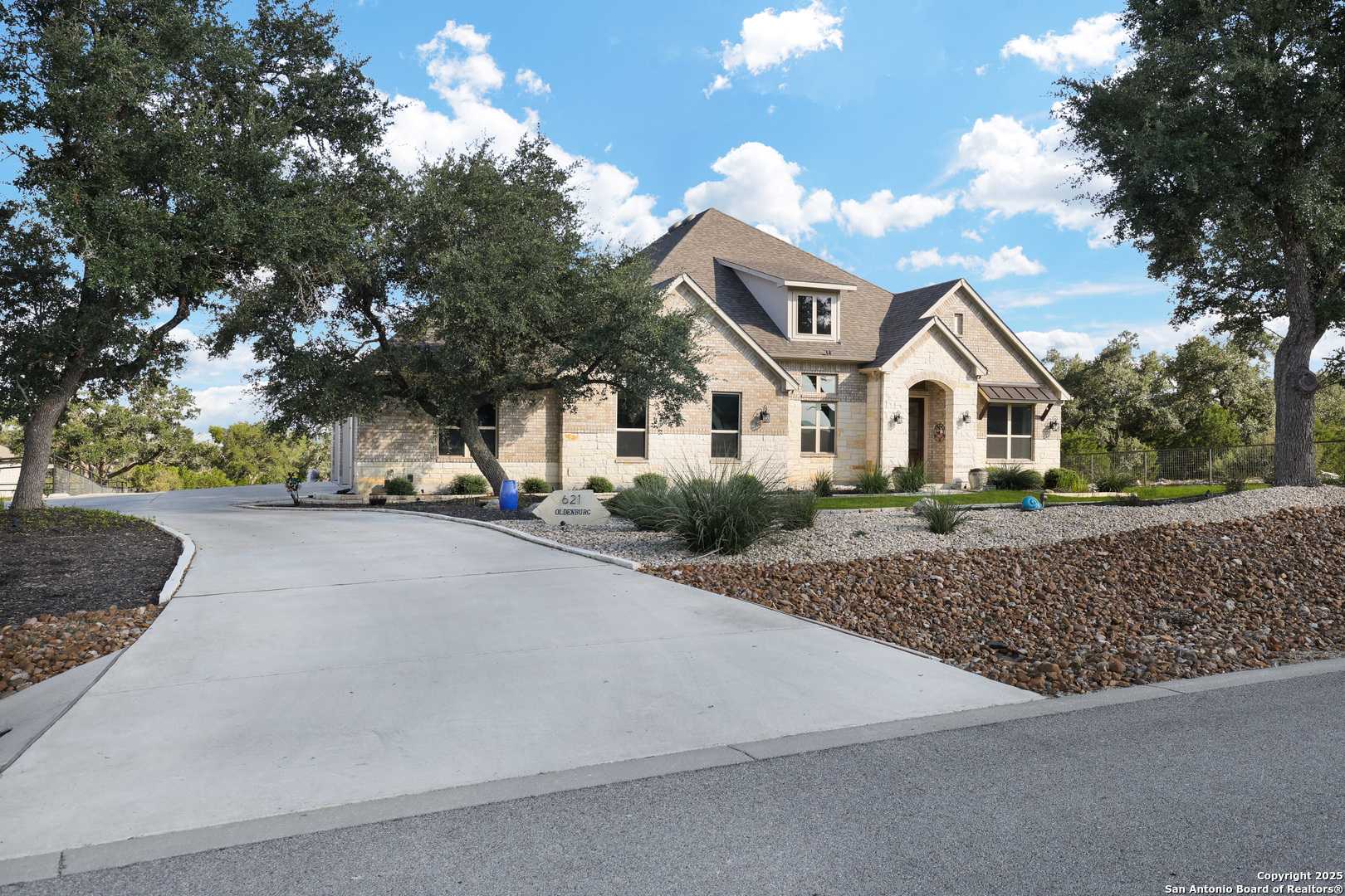 Luxury Hill Country Living at 621 Oldenburg | Copper Ridge, New Braunfels, TX 78132 Welcome to this beautifully designed 3,028 sq ft one-story home nestled in the highly sought-after manned-gated community of Copper Ridge. This 3-bedroom, 2.5-bath residence with a private study blends upscale finishes with everyday comfort. From the moment you walk in, you'll love the warm cedar-wrapped beams, the floor-to-ceiling stone fireplace with wood mantel, and the open-concept layout. The heart of the home is the gourmet kitchen featuring a large white quartz island, stainless steel appliances, a sleek glass/stainless steel vent hood, and a reverse osmosis system. The spacious primary suite boasts a luxurious walk-in shower with three rain shower heads featuring built-in lighting. The home also includes a water softener, oversized laundry room with additional pantry/storage space, and three custom lighted niches for added designer appeal. Enjoy the convenience of an oversized 3-car tandem garage-perfect for vehicles, storage, or a workshop-and holiday soffit lighting that makes decorating a breeze. Additional features: Hardwood Floors Private study/home office Professional landscape lighting Beautifully landscaped yard with full irrigation Quiet interior street location Copper Ridge offers unmatched community amenities including 24-hour gated security, a resort-style pool, pavilion, tennis and basketball courts, and walking trails. Move-in ready and loaded with upgrades-this home truly has it all. Schedule your private tour today!