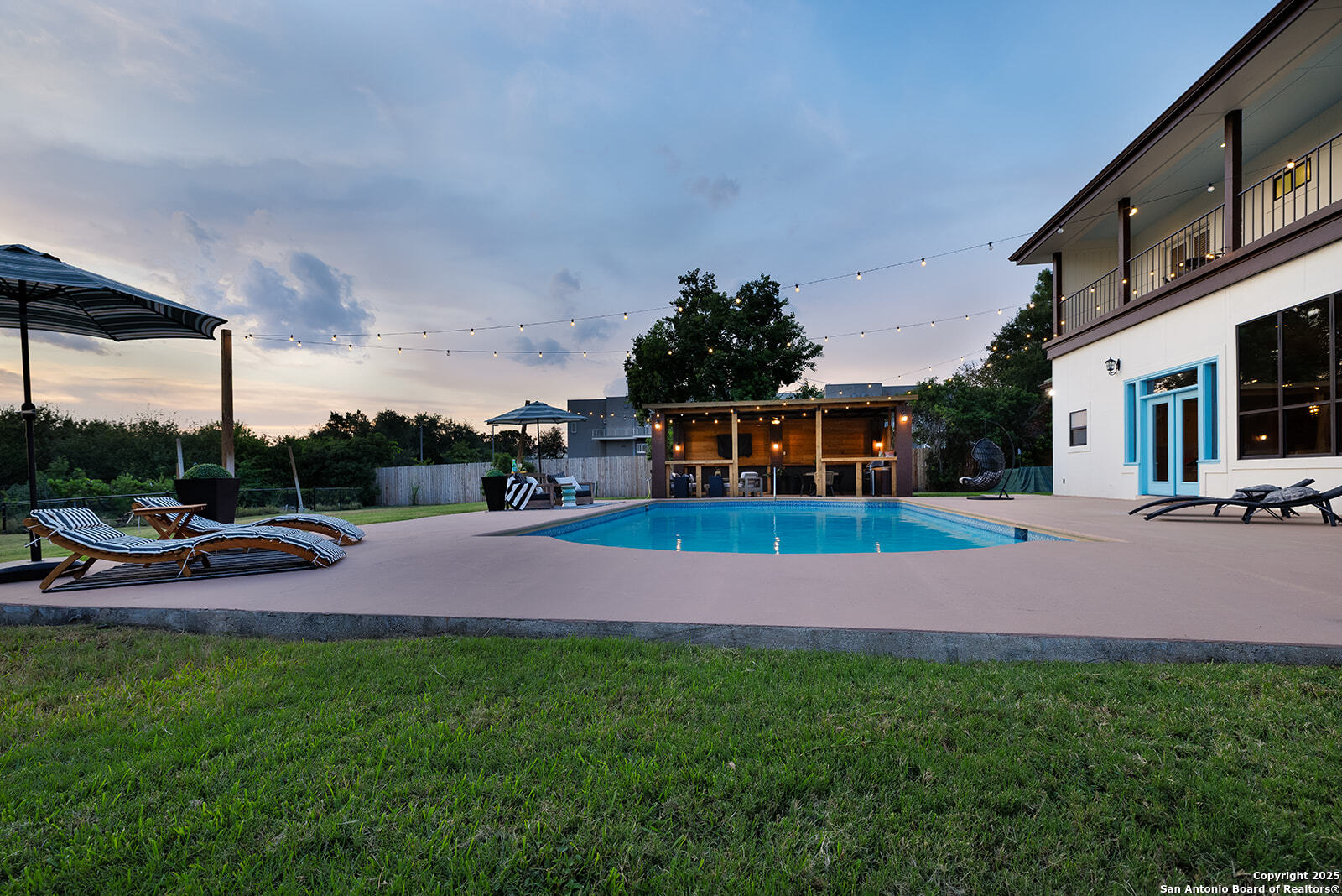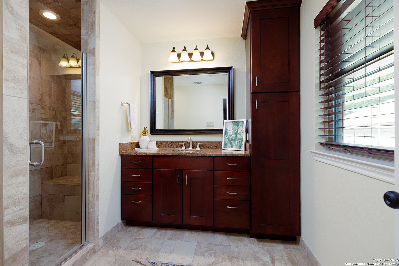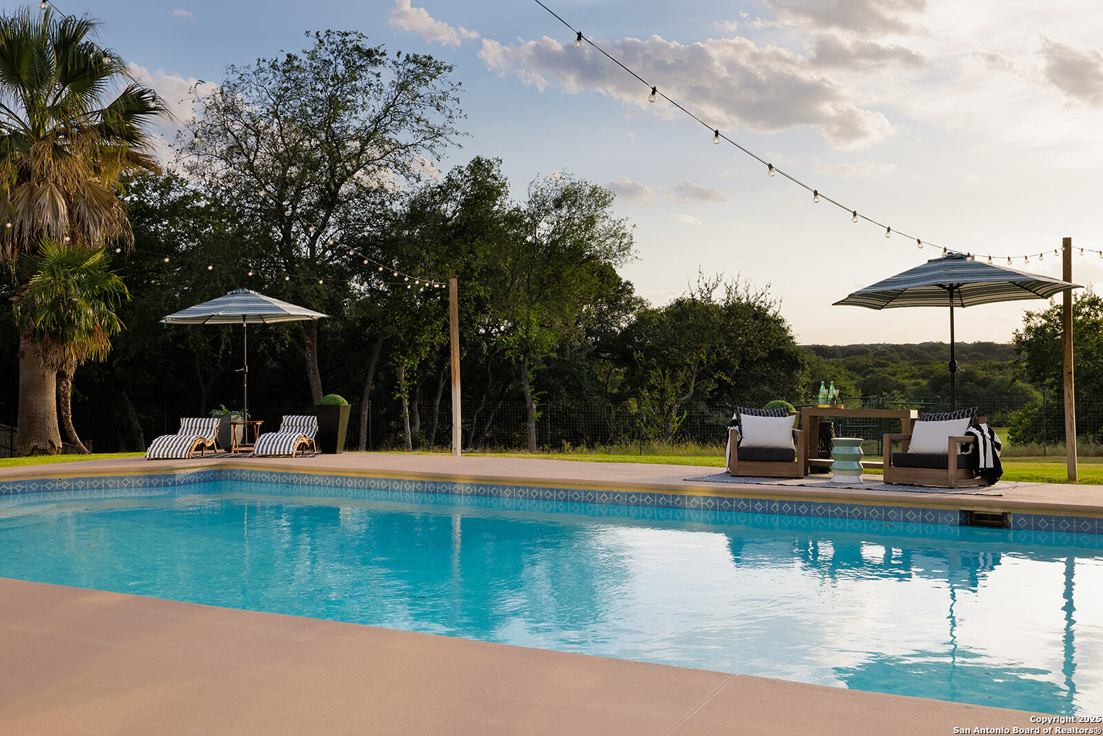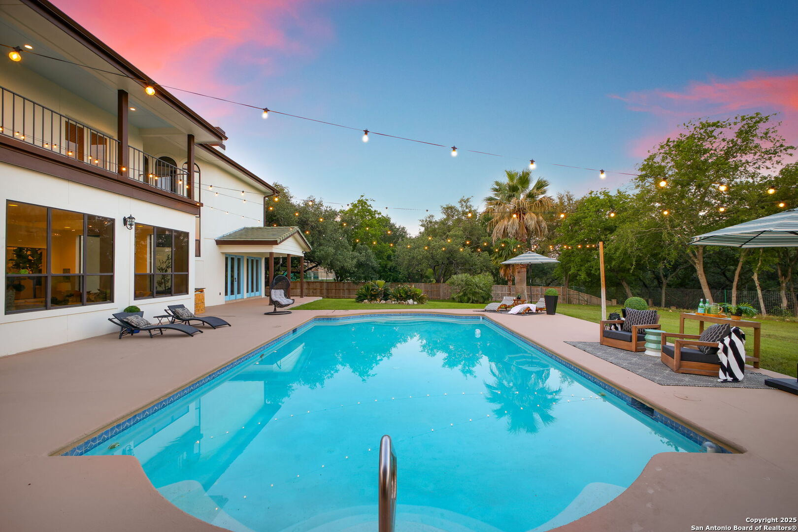 Also listed FOR SALE! Experience the pinnacle of luxury living in this extraordinary Hollywood Park villa, perfectly situated on 1.255 acres with breathtaking golf course views. Designed for both elegance and functionality, this expansive estate includes two impeccably updated residences offering over 7,866 sq. ft. of versatile living space. The 5,700 sq. ft. main home boasts 4 bedrooms and 4.5 bathrooms, highlighted by a show stopping great room with 40-foot ceilings, dual staircases, and a striking fireplace. A gourmet kitchen awaits with dual quartz islands, premium appliances, custom cabinetry, and seamless access to the outdoor kitchen. The main-level primary suite offers a true retreat with a spa-style wet room, soaking tub, digital fireplace, and sunlit skylights. A second primary suite upstairs, along with additional bedrooms and a loft, provides ample flexibility. The 2,500 sq. ft. guest house features 3 bedrooms, 2.5 baths, a full kitchen, and Juliet balcony-ideal for multigenerational living or hosting in style. Entertain effortlessly in the backyard oasis complete with a refinished pool, full outdoor kitchen, covered patio, and panoramic balcony views. Recent upgrades include 5 new HVAC units, upgraded insulation, new fencing, pool and sprinkler system updates, roof tile replacements, window tent and UV protection, and refreshed interiors with modern fixtures, flooring, and lighting throughout. This rare Hollywood Park gem combines luxury, privacy, and convenience just minutes from San Antonio's upscale shopping, dining, and airport access.
