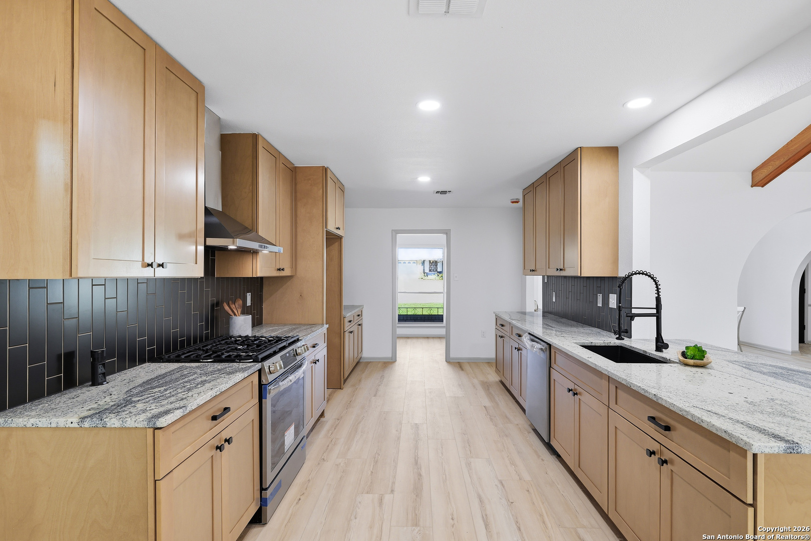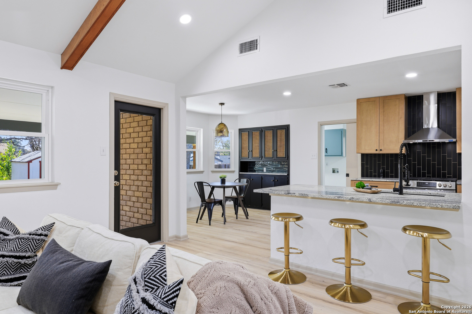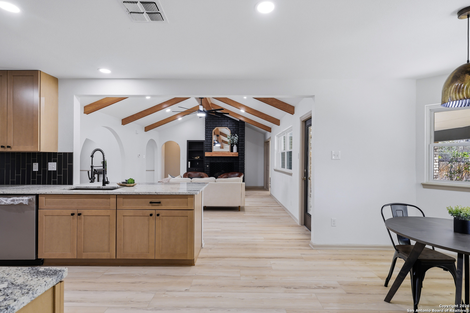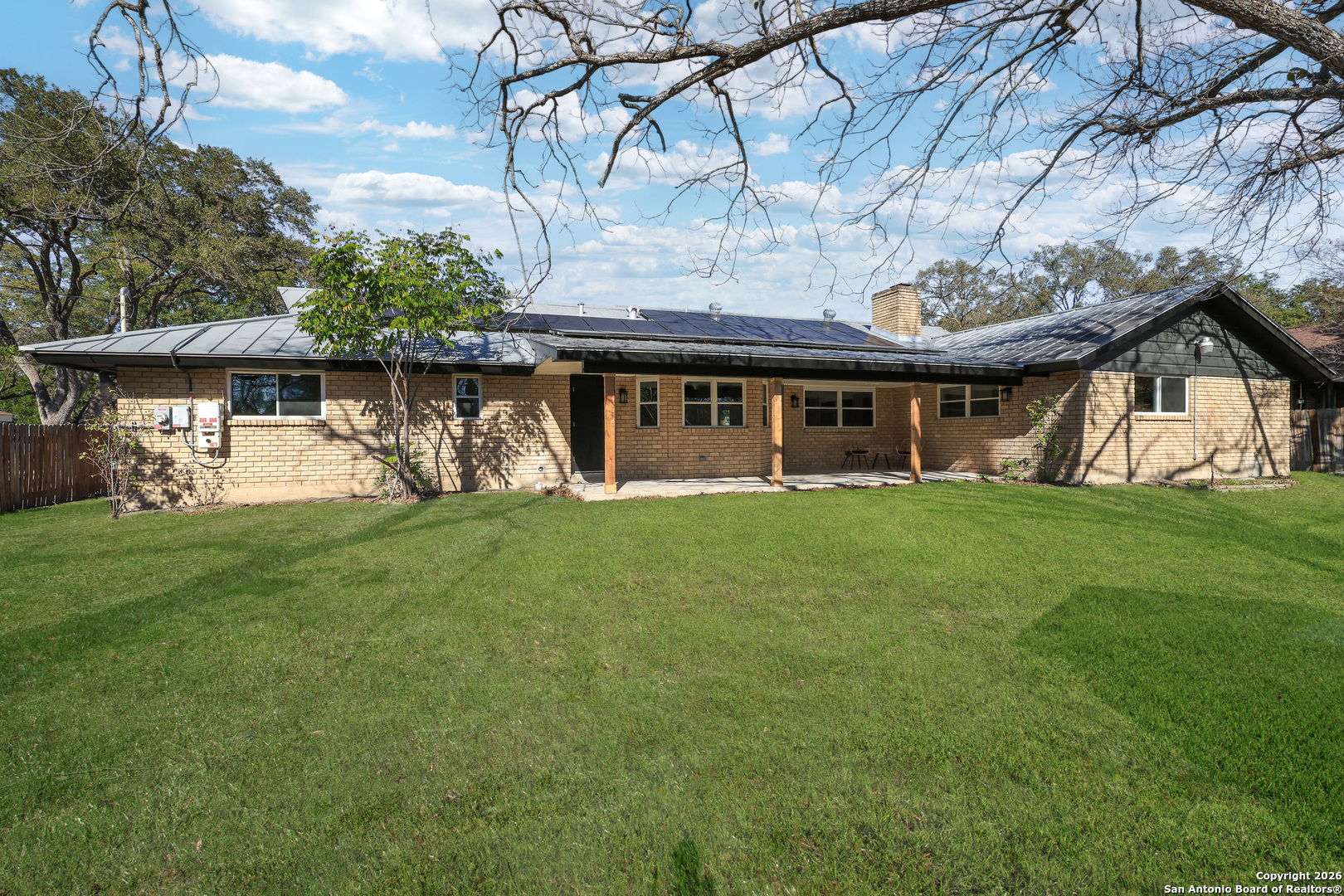 BEAUTIFUL REMODELED HOME! Home boasts high ceilings, sprawling living room with gas burning fireplace, open floor plan with inviting space to entertain. Open kitchen floor plan with new cabinets, new stainless steel appliances, new vent hood, gorgeous backsplash with granite countertops, butlers pantry, & built-in that can be used as a coffee bar. Huge primary bedroom with ensuite bathroom w/spa like walk in shower & walk in closet. Big, spacious secondary bedrooms with new ceiling fans. New doors, LVP & tile flooring, double pane windows, and modern hardware. Plenty of storage. Oversized laundry room with dog wash. New lighting fixtures & recess lighting. New paint on exterior & interior. Metal roof, solar panels (paid & participating in CPS rebate program). Two gas water heaters, oversized 2 car garage with workshop area. Huge backyard with mature trees, storage building, & alley access. Located in established subdivision with golf course, community pool, clubhouse, and playground. Near IH 35, Fort Sam, BAMC, airport, retail and restaurants.