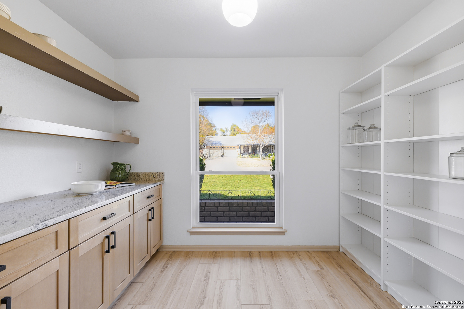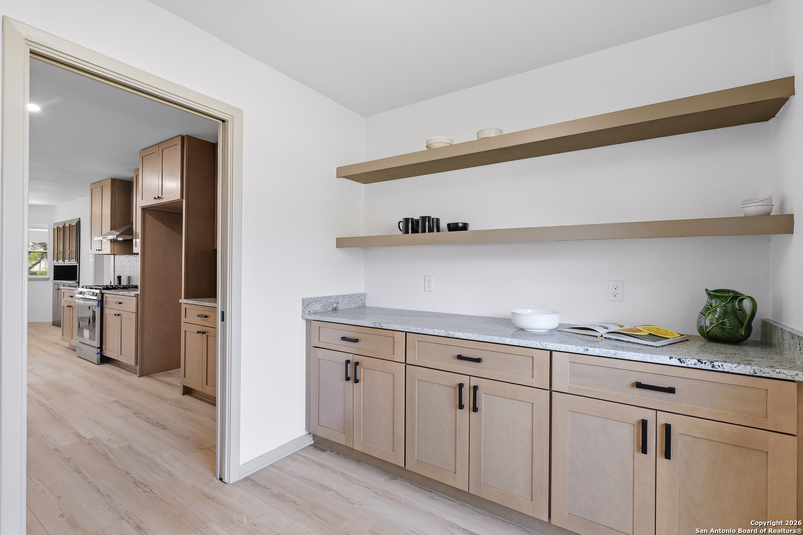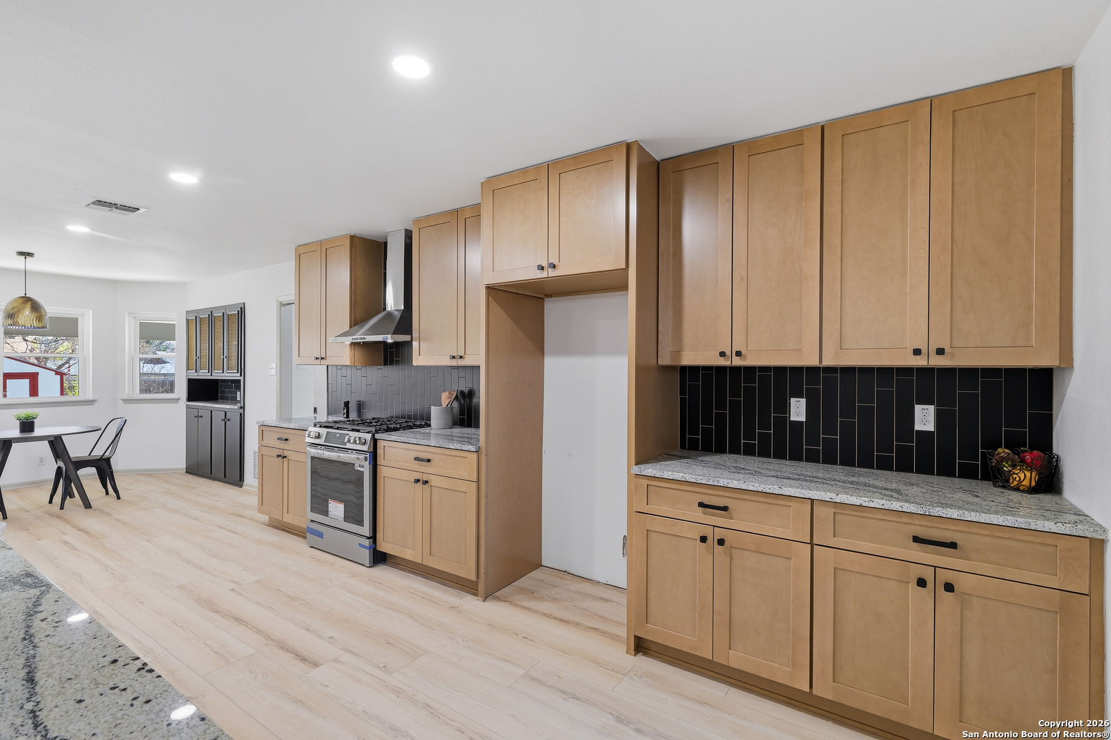 BEAUTIFUL REMODELED HOME! Home boasts high ceilings, sprawling living room with gas burning fireplace, open floor plan with inviting space to entertain. Open kitchen floor plan with new cabinets, new stainless steel appliances, new vent hood, gorgeous backsplash with granite countertops, butlers pantry, & built-in that can be used as a coffee bar. Huge primary bedroom with ensuite bathroom w/spa like walk in shower & walk in closet. Big, spacious secondary bedrooms with new ceiling fans. New doors, LVP & tile flooring, double pane windows, and modern hardware. Plenty of storage. Oversized laundry room with dog wash. New lighting fixtures & recess lighting. New paint on exterior & interior. Metal roof, solar panels (paid & participating in CPS rebate program). Two gas water heaters, oversized 2 car garage with workshop area. Huge backyard with mature trees, storage building, & alley access. Located in established subdivision with golf course, community pool, clubhouse, and playground. Near IH 35, Fort Sam, BAMC, airport, retail and restaurants.