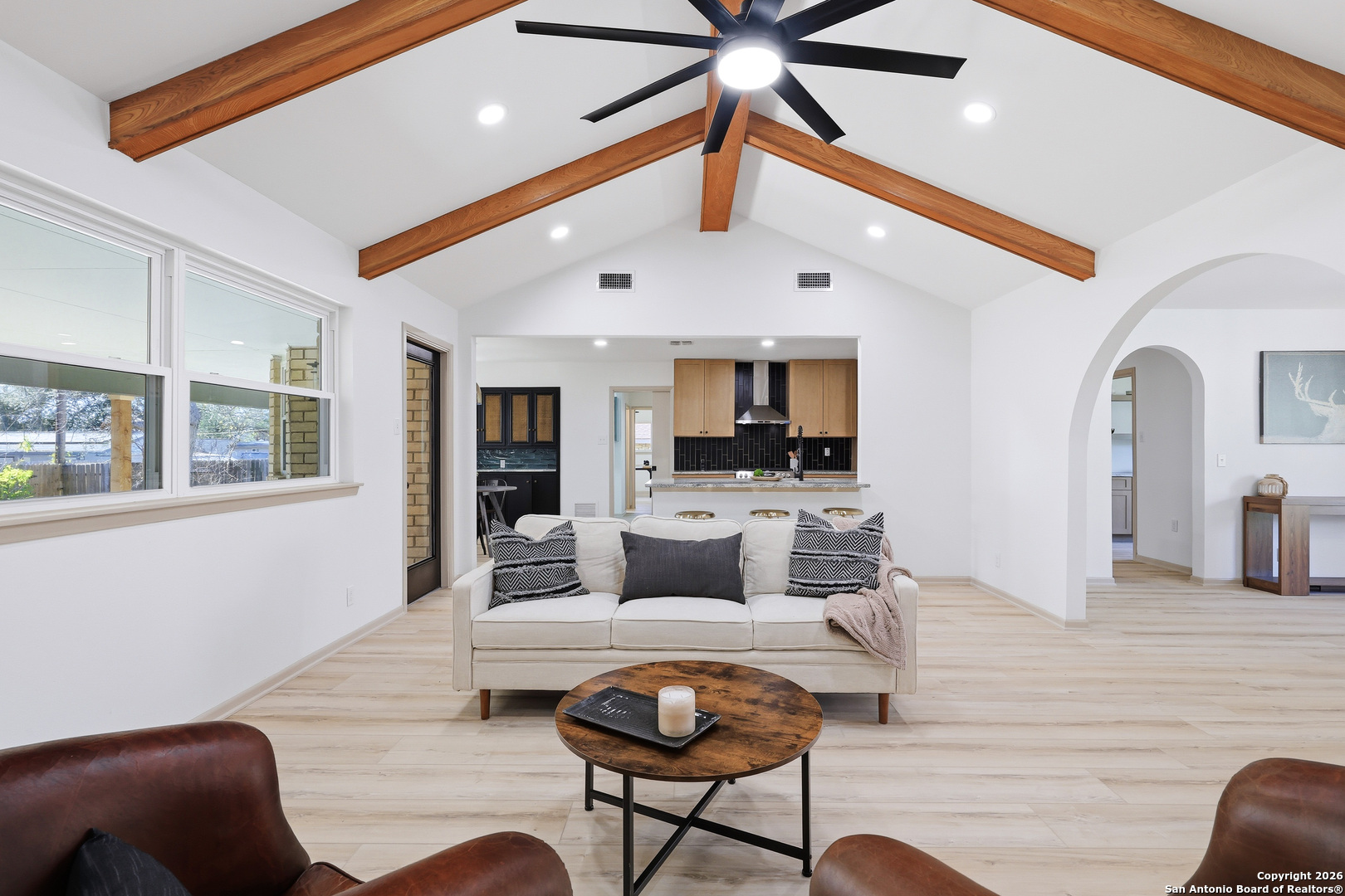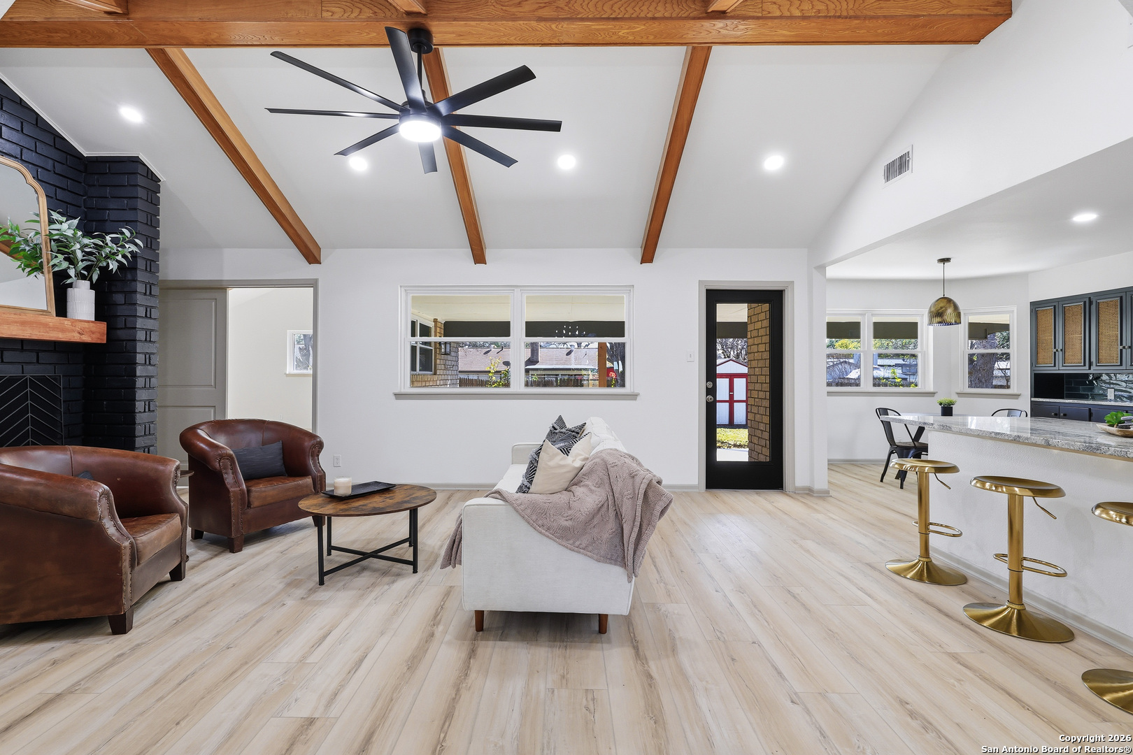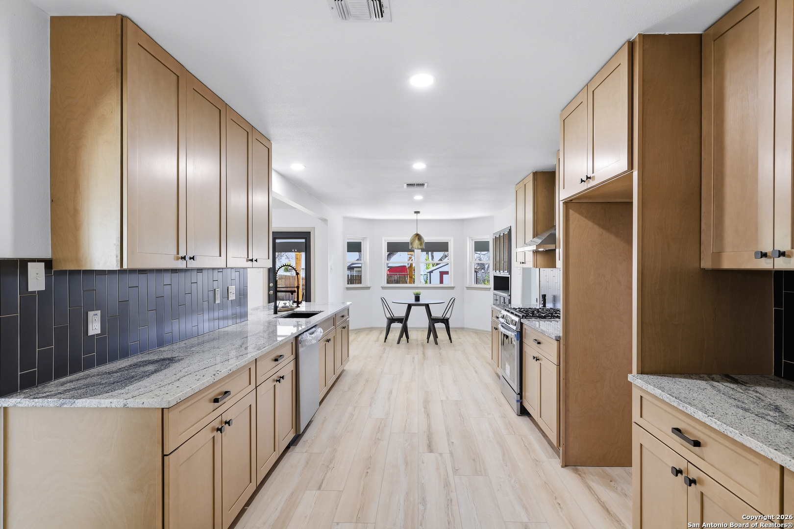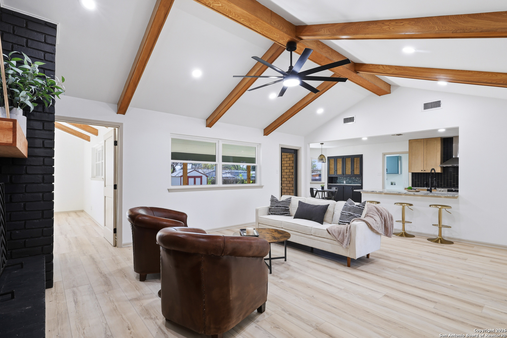 BEAUTIFUL REMODELED HOME! Home boasts high ceilings, sprawling living room with gas burning fireplace, open floor plan with inviting space to entertain. Open kitchen floor plan with new cabinets, new stainless steel appliances, new vent hood, gorgeous backsplash with granite countertops, butlers pantry, & built-in that can be used as a coffee bar. Huge primary bedroom with ensuite bathroom w/spa like walk in shower & walk in closet. Big, spacious secondary bedrooms with new ceiling fans. New doors, LVP & tile flooring, double pane windows, and modern hardware. Plenty of storage. Oversized laundry room with dog wash. New lighting fixtures & recess lighting. New paint on exterior & interior. Metal roof, solar panels (paid & participating in CPS rebate program). Two gas water heaters, oversized 2 car garage with workshop area. Huge backyard with mature trees, storage building, & alley access. Located in established subdivision with golf course, community pool, clubhouse, and playground. Near IH 35, Fort Sam, BAMC, airport, retail and restaurants.