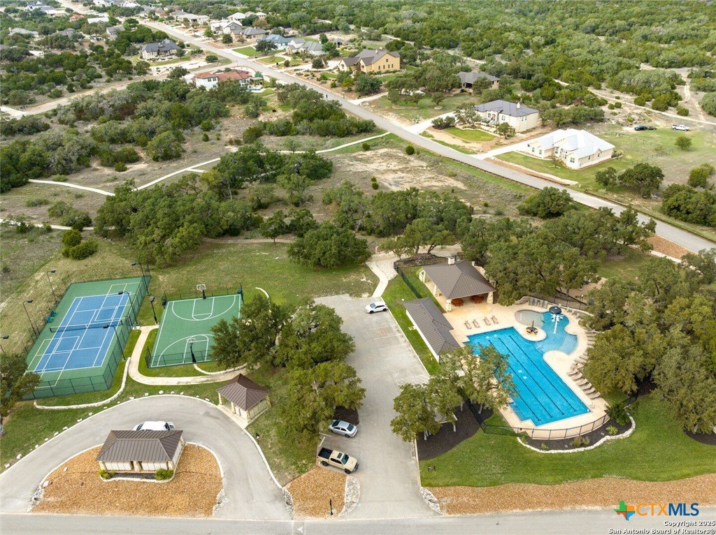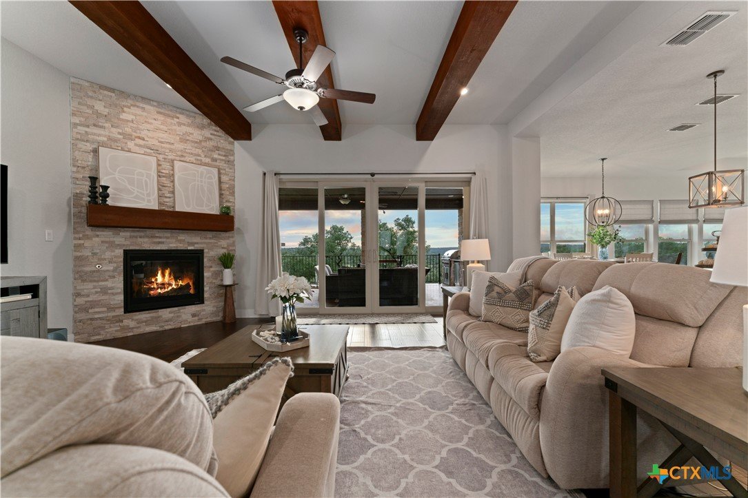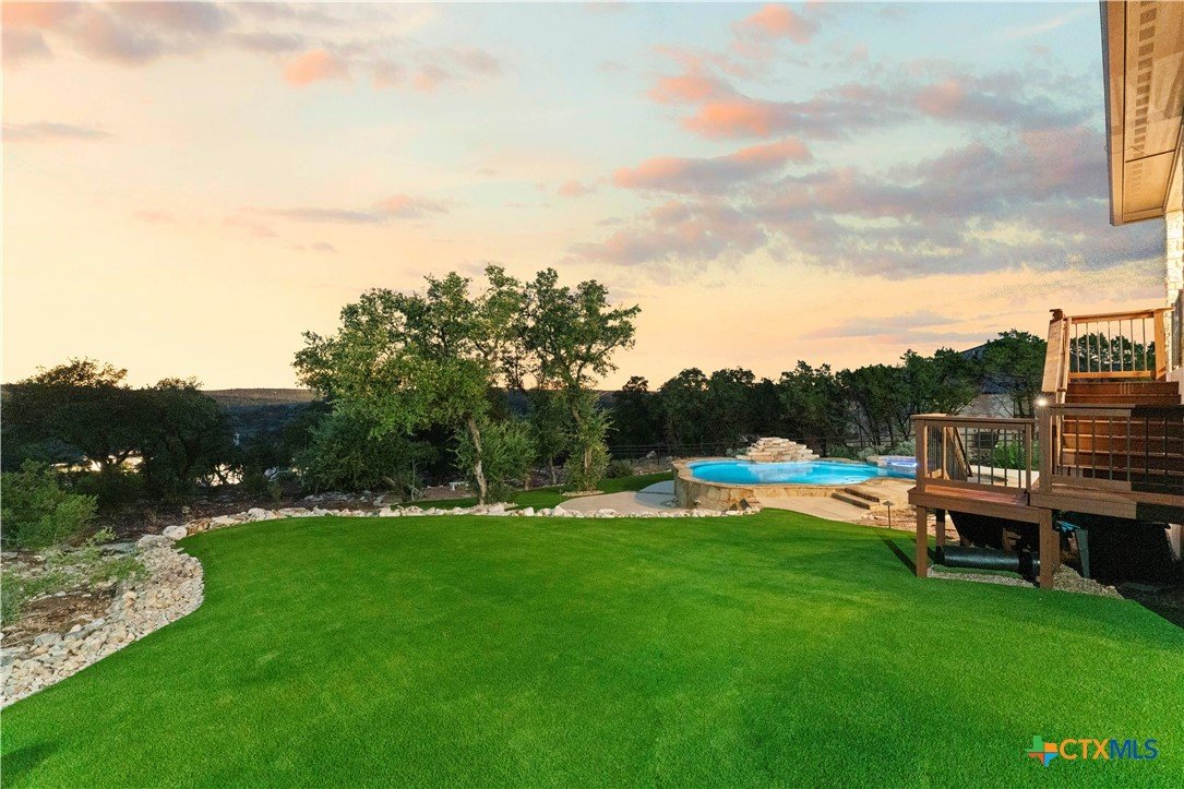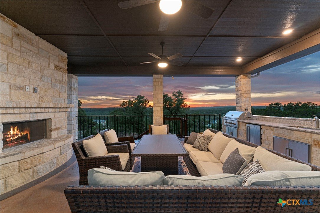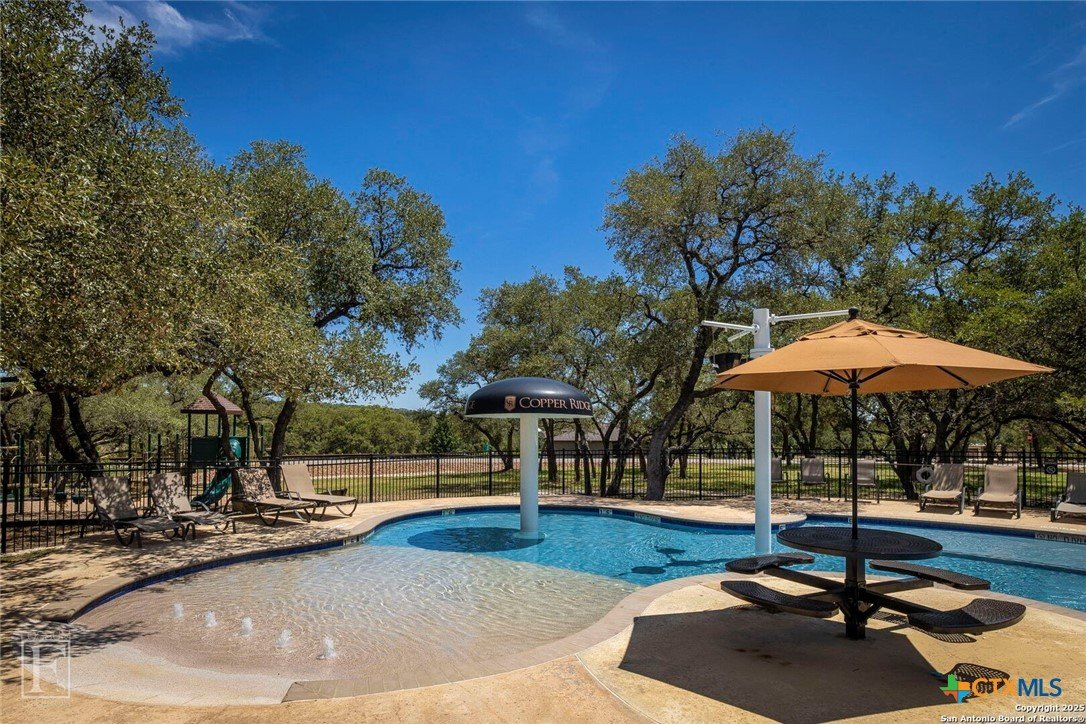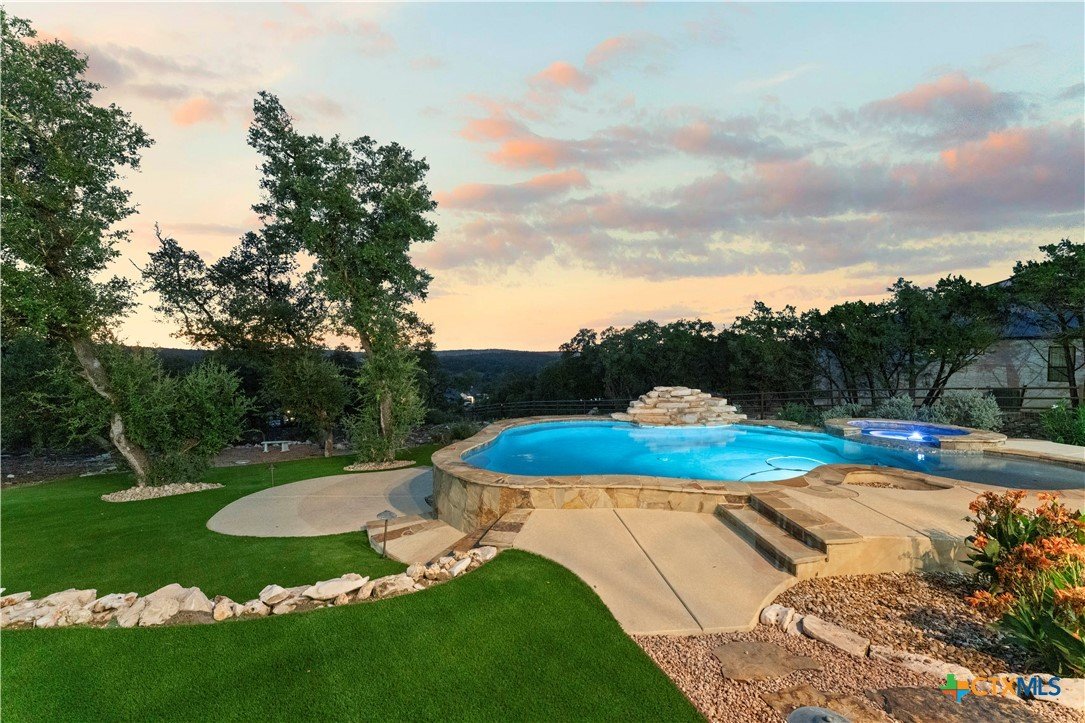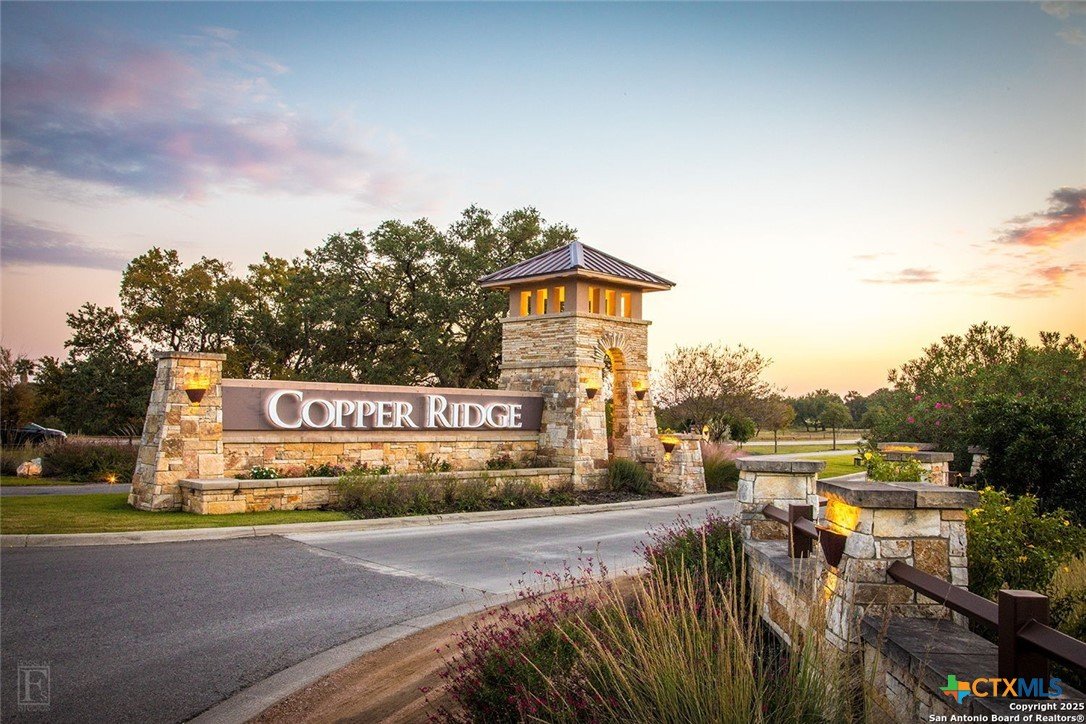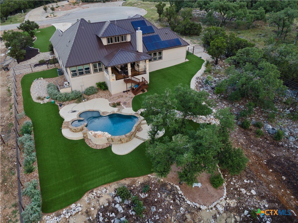 HEATED IN-GROUND POOL/SPA WITH WATERFALL** TOP OF THE HILL EXCLUSIVE LOT WITH IMPECCABLE VIEWS. Immaculate Hill Country Masterpiece * The electric/water bill averages $120/month. Paid off Solar Panels. Perfectly positioned on a private 1.1-acre cul-de-sac lot, this breathtaking estate combines timeless elegance with unrivaled panoramic views and a backyard resort oasis. Savannah Hickory hardwood flooring, hand-selected accent tile, soaring ceilings with wood beams, and a floor plan designed to impress and embrace. The chef’s kitchen is pure luxury, featuring Diamond Bianco granite countertops, double-stacked custom cabinetry with glass-front accents, a 36” Café gas cooktop, double ovens, and an Italian white apron sink. The main level features four serene bedrooms, a light-filled sunroom, a dedicated study, and a flexible bonus room, thoughtfully designed to offer both privacy and connection. The upstairs level is complete with a game room wired for surround sound, a media room, an office, and a half bath. The primary suite is a sanctuary offering sweeping views and a spa-worthy bathroom w/ a 71” cast iron soaking tub, a rain shower w/ body sprayers, and dual designer closets. A heated pool and spa with a cascading waterfall grotto. The outdoor kitchen is fully equipped w/ stainless steel appliances and granite countertops. Professionally designed landscaping features native rock, lush greenery, and premium artificial turf, requiring minimal maintenance. This home is as smart as it is stunning, with energy-efficient solar panels, a painted standing seam metal roof, a grand circular drive, and a 3-car garage. A premier 24-hour gated and guarded community in New Braunfels, Copper Ridge offers resort-style amenities (including a resort-style pool with both lap and play pool, pavilion with fireplace, barbecue and picnic tables, tennis and basketball courts.