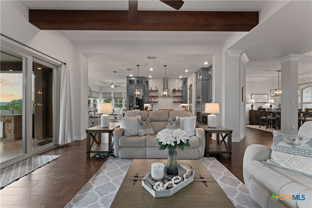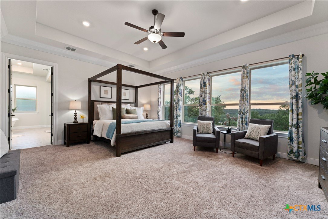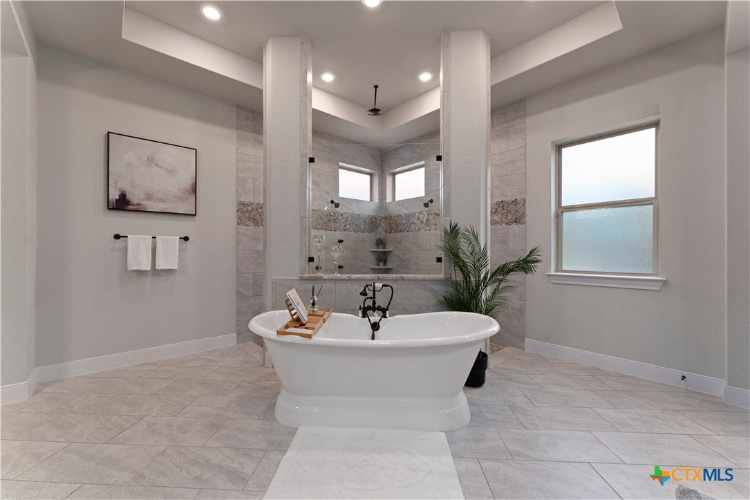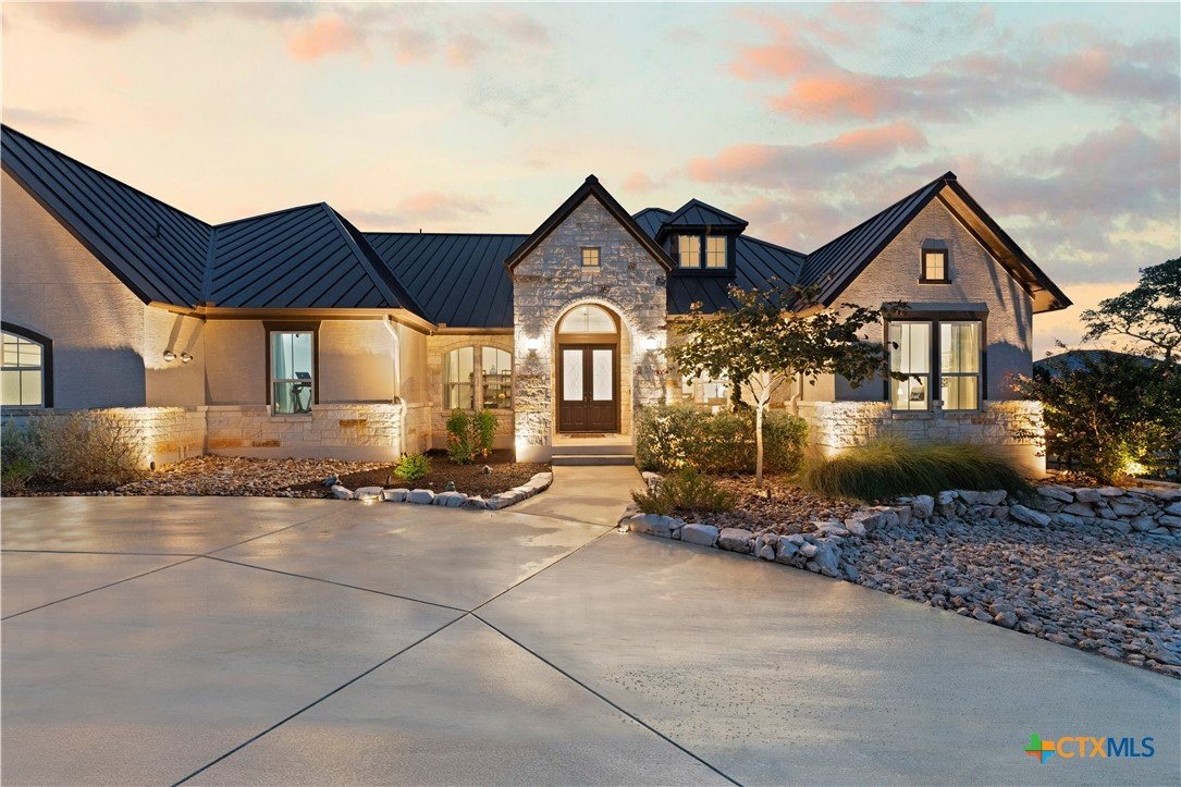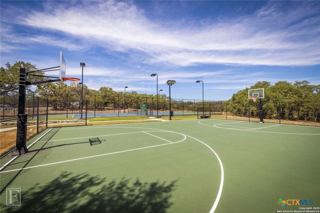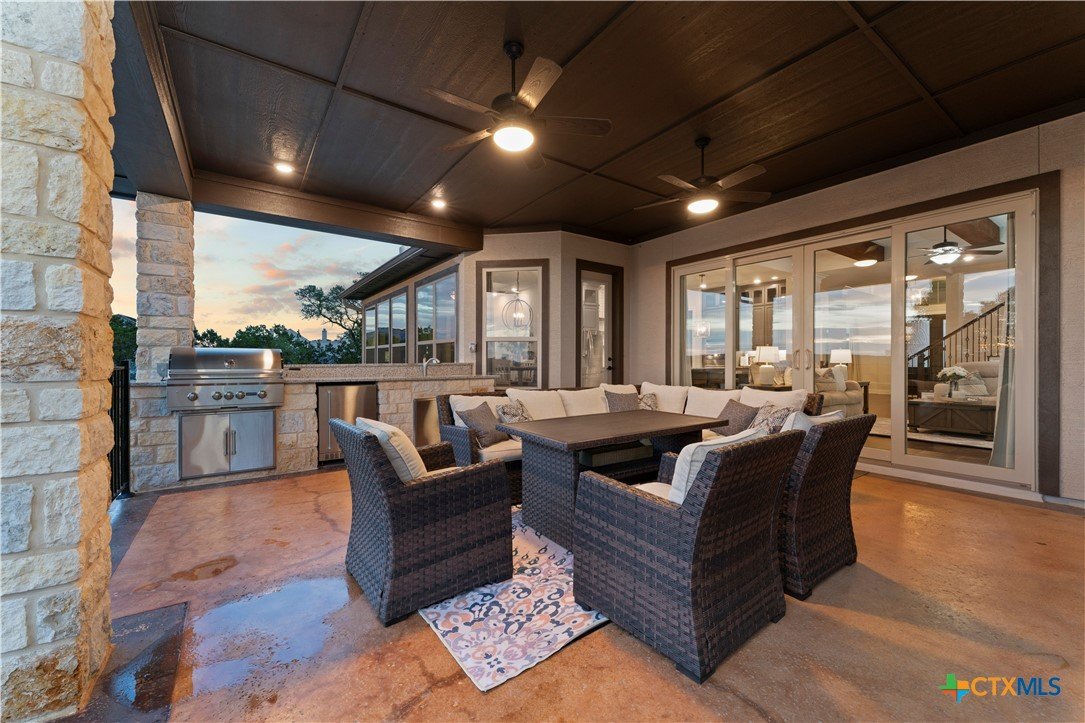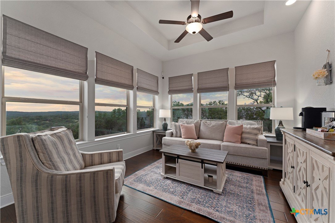 HEATED IN-GROUND POOL/SPA WITH WATERFALL** TOP OF THE HILL EXCLUSIVE LOT WITH IMPECCABLE VIEWS. Immaculate Hill Country Masterpiece * The electric/water bill averages $120/month. Paid off Solar Panels. Perfectly positioned on a private 1.1-acre cul-de-sac lot, this breathtaking estate combines timeless elegance with unrivaled panoramic views and a backyard resort oasis. Savannah Hickory hardwood flooring, hand-selected accent tile, soaring ceilings with wood beams, and a floor plan designed to impress and embrace. The chef’s kitchen is pure luxury, featuring Diamond Bianco granite countertops, double-stacked custom cabinetry with glass-front accents, a 36” Café gas cooktop, double ovens, and an Italian white apron sink. The main level features four serene bedrooms, a light-filled sunroom, a dedicated study, and a flexible bonus room, thoughtfully designed to offer both privacy and connection. The upstairs level is complete with a game room wired for surround sound, a media room, an office, and a half bath. The primary suite is a sanctuary offering sweeping views and a spa-worthy bathroom w/ a 71” cast iron soaking tub, a rain shower w/ body sprayers, and dual designer closets. A heated pool and spa with a cascading waterfall grotto. The outdoor kitchen is fully equipped w/ stainless steel appliances and granite countertops. Professionally designed landscaping features native rock, lush greenery, and premium artificial turf, requiring minimal maintenance. This home is as smart as it is stunning, with energy-efficient solar panels, a painted standing seam metal roof, a grand circular drive, and a 3-car garage. A premier 24-hour gated and guarded community in New Braunfels, Copper Ridge offers resort-style amenities (including a resort-style pool with both lap and play pool, pavilion with fireplace, barbecue and picnic tables, tennis and basketball courts.