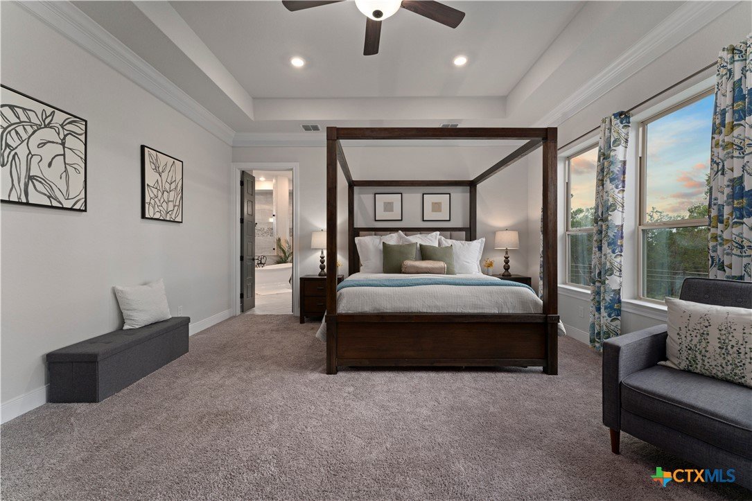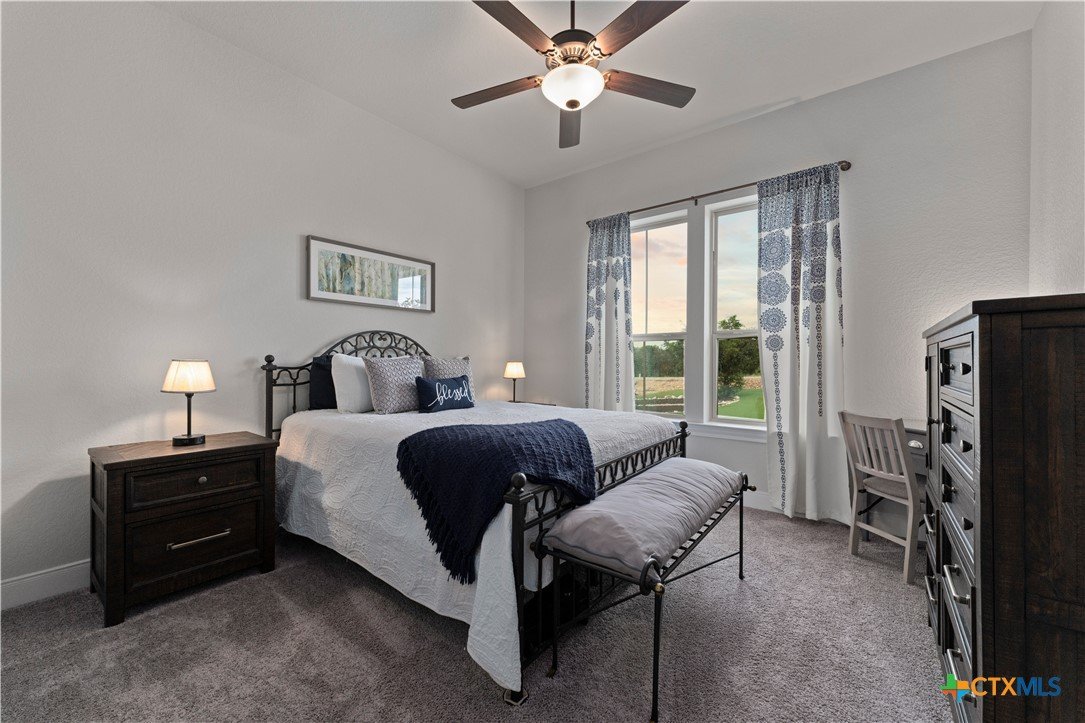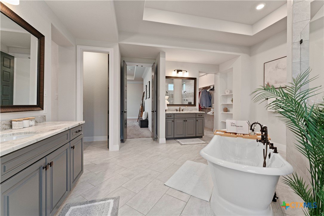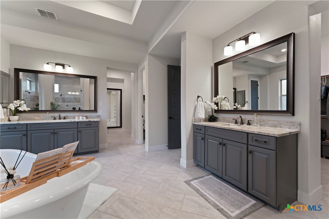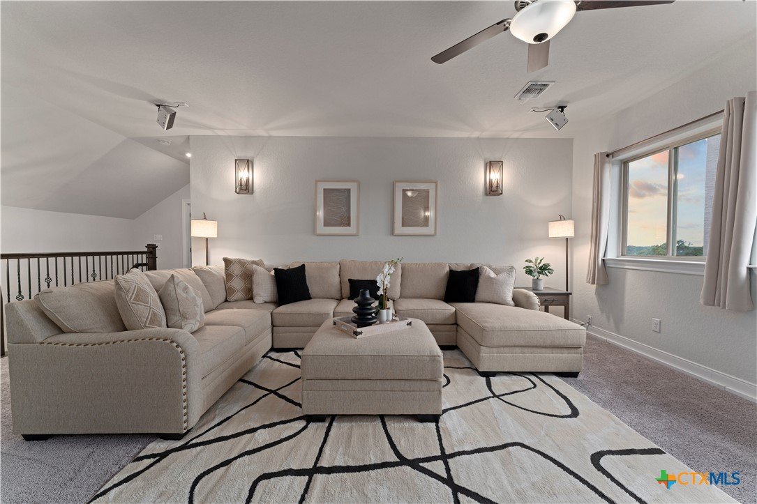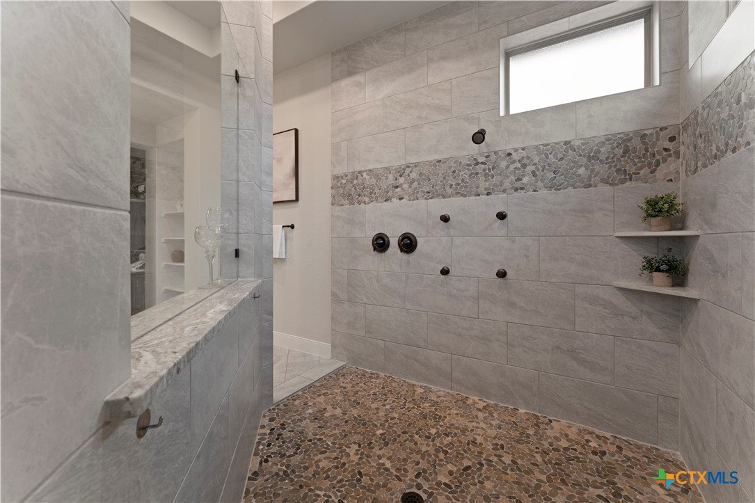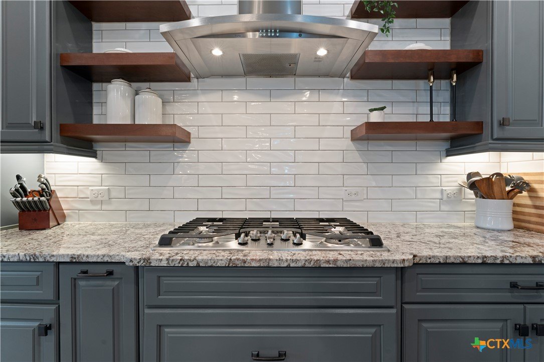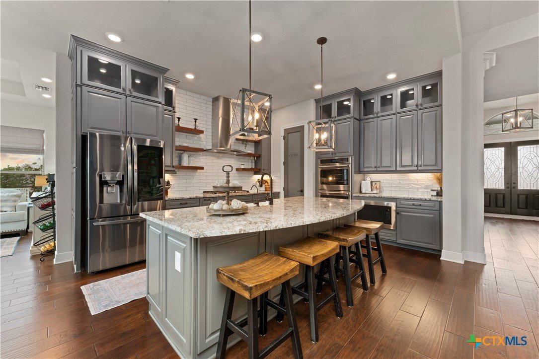 HEATED IN-GROUND POOL/SPA WITH WATERFALL** TOP OF THE HILL EXCLUSIVE LOT WITH IMPECCABLE VIEWS. Immaculate Hill Country Masterpiece * The electric/water bill averages $120/month. Paid off Solar Panels. Perfectly positioned on a private 1.1-acre cul-de-sac lot, this breathtaking estate combines timeless elegance with unrivaled panoramic views and a backyard resort oasis. Savannah Hickory hardwood flooring, hand-selected accent tile, soaring ceilings with wood beams, and a floor plan designed to impress and embrace. The chef’s kitchen is pure luxury, featuring Diamond Bianco granite countertops, double-stacked custom cabinetry with glass-front accents, a 36” Café gas cooktop, double ovens, and an Italian white apron sink. The main level features four serene bedrooms, a light-filled sunroom, a dedicated study, and a flexible bonus room, thoughtfully designed to offer both privacy and connection. The upstairs level is complete with a game room wired for surround sound, a media room, an office, and a half bath. The primary suite is a sanctuary offering sweeping views and a spa-worthy bathroom w/ a 71” cast iron soaking tub, a rain shower w/ body sprayers, and dual designer closets. A heated pool and spa with a cascading waterfall grotto. The outdoor kitchen is fully equipped w/ stainless steel appliances and granite countertops. Professionally designed landscaping features native rock, lush greenery, and premium artificial turf, requiring minimal maintenance. This home is as smart as it is stunning, with energy-efficient solar panels, a painted standing seam metal roof, a grand circular drive, and a 3-car garage. A premier 24-hour gated and guarded community in New Braunfels, Copper Ridge offers resort-style amenities (including a resort-style pool with both lap and play pool, pavilion with fireplace, barbecue and picnic tables, tennis and basketball courts.