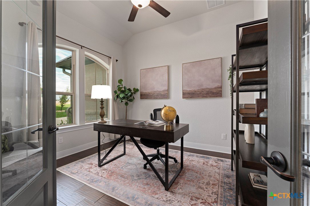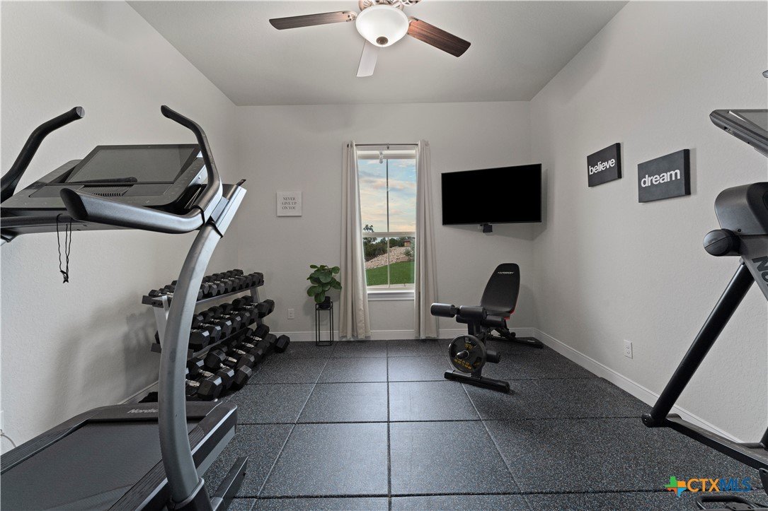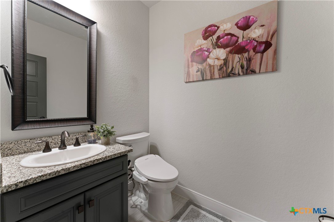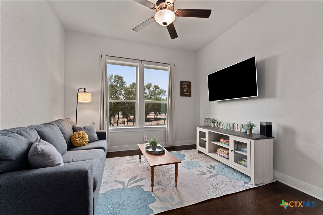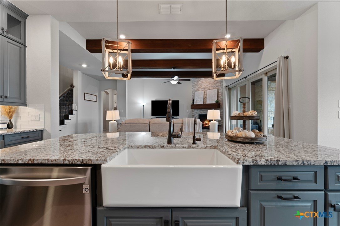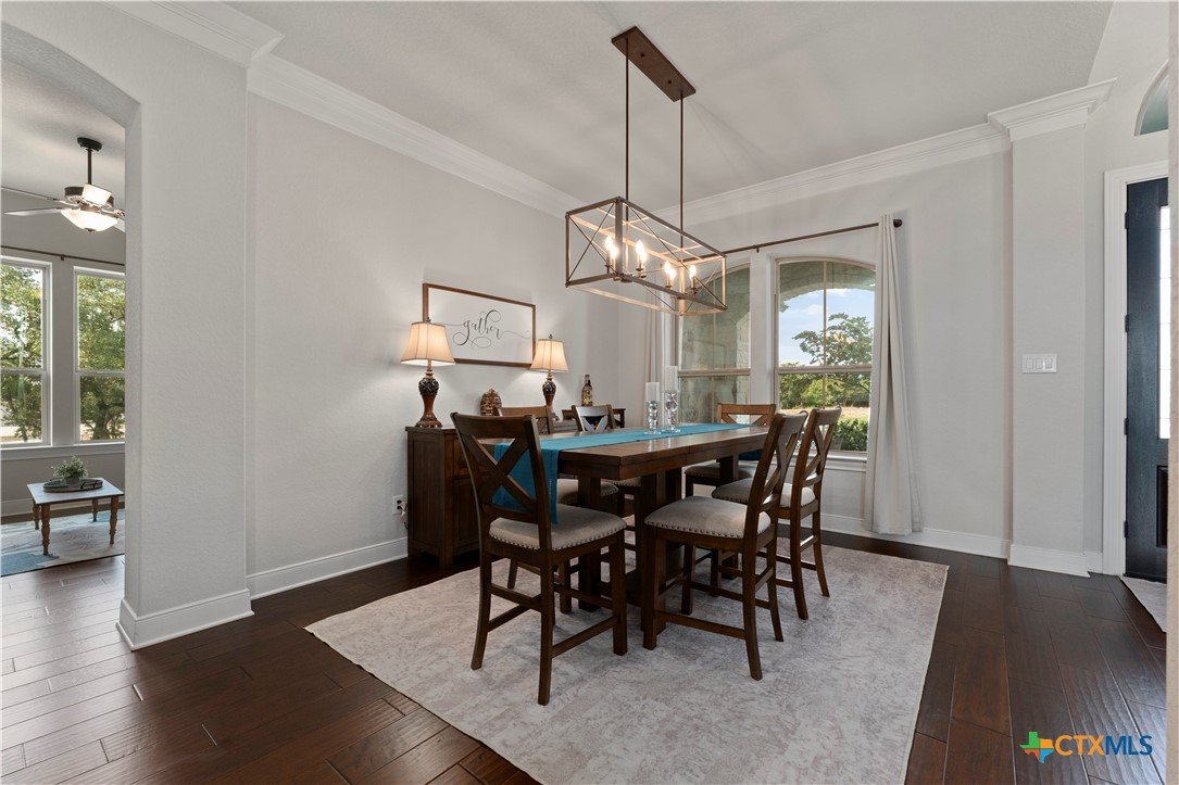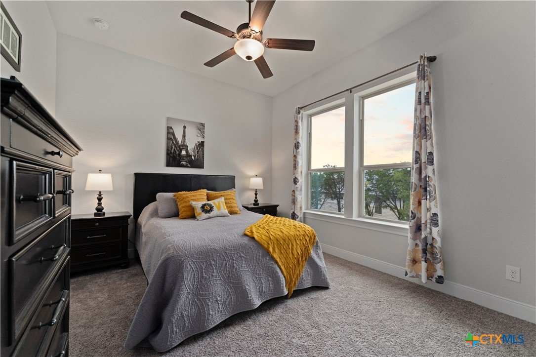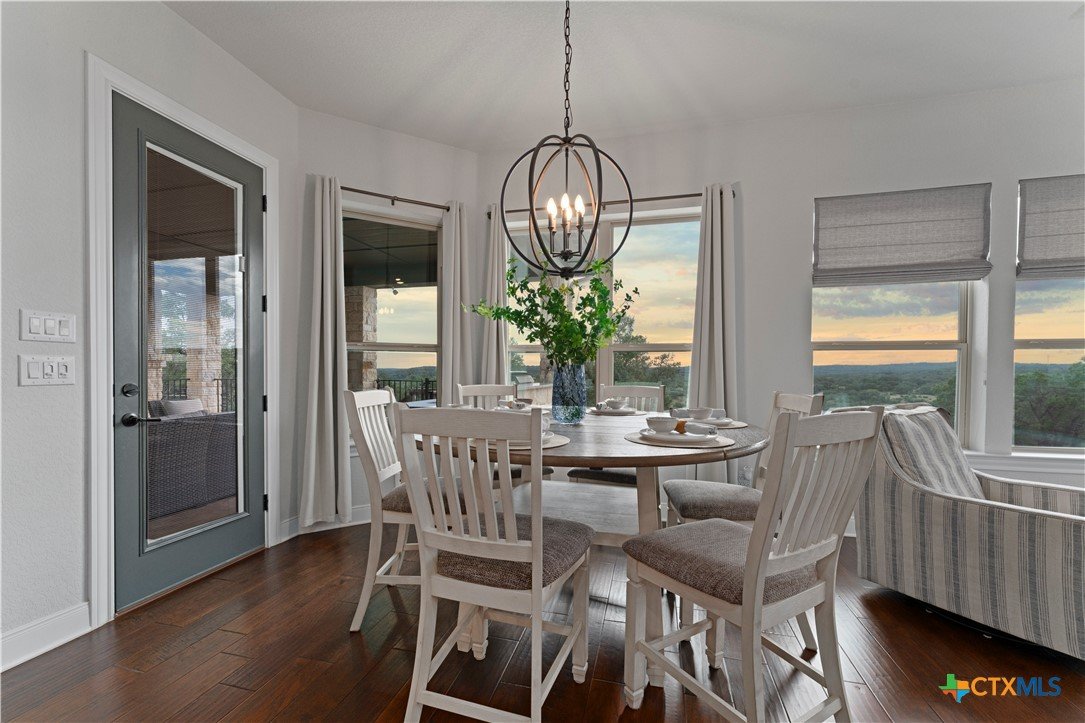HEATED IN-GROUND POOL/SPA WITH WATERFALL** TOP OF THE HILL EXCLUSIVE LOT WITH IMPECCABLE VIEWS. Immaculate Hill Country Masterpiece * The electric/water bill averages $120/month. Paid off Solar Panels. Perfectly positioned on a private 1.1-acre cul-de-sac lot, this breathtaking estate combines timeless elegance with unrivaled panoramic views and a backyard resort oasis. Savannah Hickory hardwood flooring, hand-selected accent tile, soaring ceilings with wood beams, and a floor plan designed to impress and embrace. The chef’s kitchen is pure luxury, featuring Diamond Bianco granite countertops, double-stacked custom cabinetry with glass-front accents, a 36” Café gas cooktop, double ovens, and an Italian white apron sink. The main level features four serene bedrooms, a light-filled sunroom, a dedicated study, and a flexible bonus room, thoughtfully designed to offer both privacy and connection. The upstairs level is complete with a game room wired for surround sound, a media room, an office, and a half bath. The primary suite is a sanctuary offering sweeping views and a spa-worthy bathroom w/ a 71” cast iron soaking tub, a rain shower w/ body sprayers, and dual designer closets. A heated pool and spa with a cascading waterfall grotto. The outdoor kitchen is fully equipped w/ stainless steel appliances and granite countertops. Professionally designed landscaping features native rock, lush greenery, and premium artificial turf, requiring minimal maintenance. This home is as smart as it is stunning, with energy-efficient solar panels, a painted standing seam metal roof, a grand circular drive, and a 3-car garage. A premier 24-hour gated and guarded community in New Braunfels, Copper Ridge offers resort-style amenities (including a resort-style pool with both lap and play pool, pavilion with fireplace, barbecue and picnic tables, tennis and basketball courts.