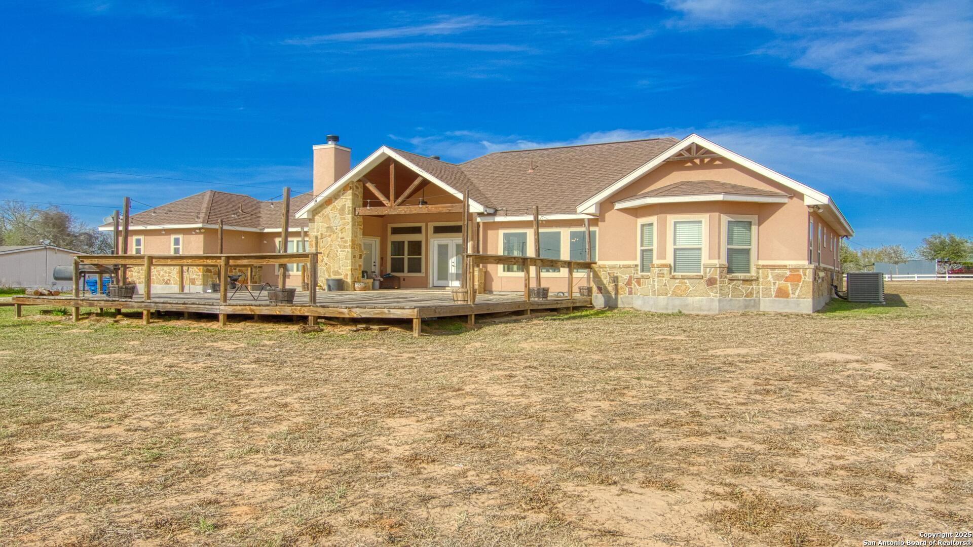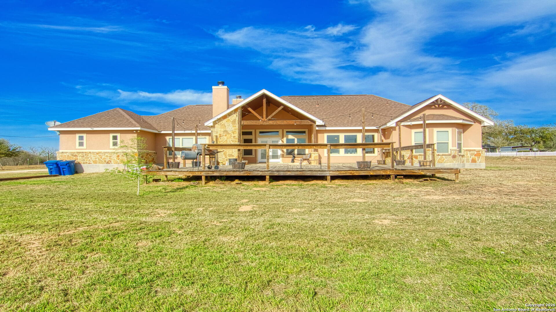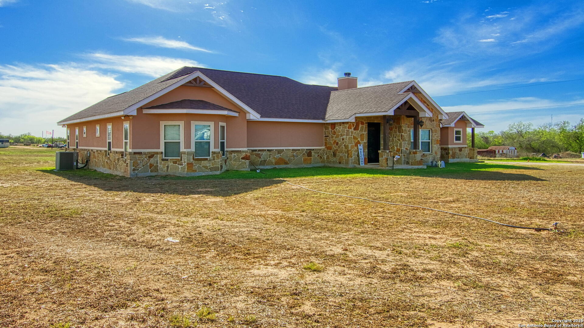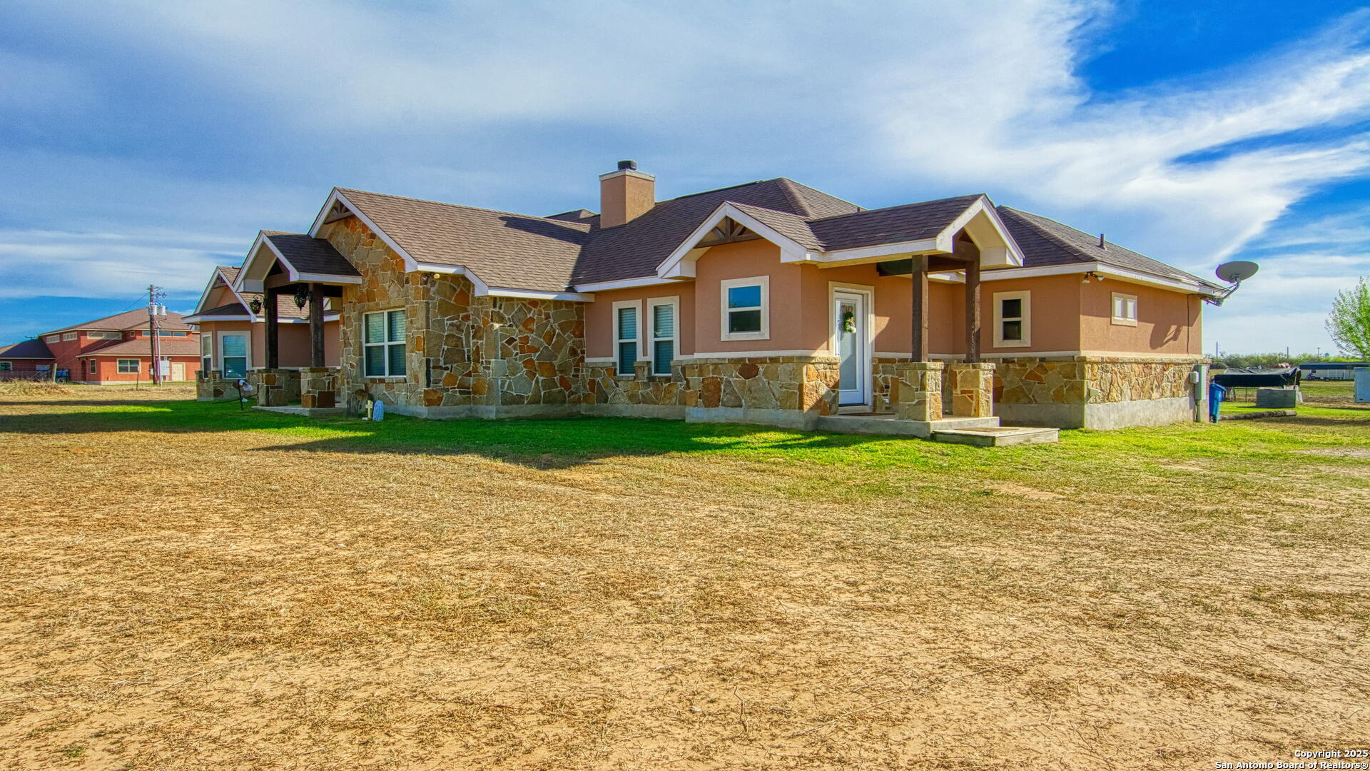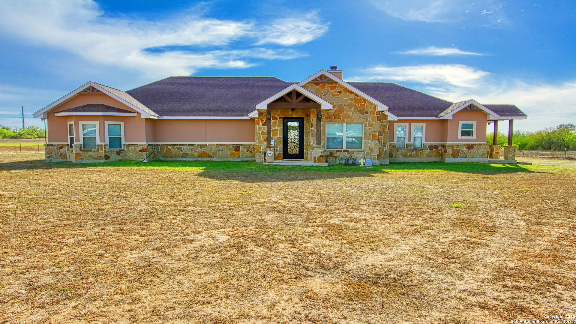 CUSTOM BUILT in 2017, this beautiful 3 BED, 3 BATH home with an OPEN FLOOR PLAN sits on the outskirts of small town Floresville, Texas! The heart of the 2443 SQ FT home is the spacious kitchen (refrigerator included!) and expansive living room with impressive rock FIREPLACE and views of the back of the property. For those who enjoy outdoor living, a second rock fireplace on the large DECK provides a cozy retreat with country views, ideal for entertaining or simply relaxing. The MASTER SUITE is a true sanctuary, with vaulted ceilings, private outside access, and a luxurious ensuite bath. Centered around the relaxing SPA TUB, the master bathroom includes SEPARATE VANITIES, a walk-in tile SHOWER, a massive WALK IN CLOSET, and a private water closet for added convenience. On the opposite side of the home, the other two bedrooms are equally impressive, each featuring charming BAY WINDOWS, walk-in closets, and connected by a JACK AND JILL BATHROOM. The SPLIT FLOOR PLAN ensures added privacy for everyone in the home. The MUDROOM, laundry room and NO CARPET help streamline home maintenance and the OFFICE is perfect for working or could be used as a FOURTH BEDROOM with its own closet. The large STORAGE BUILDING and covered carport behind the house provide storage galore. Nestled on a peaceful 5 ACRE LOT and located just minutes from town, this property offers a perfect balance of privacy and accessibility. Enjoy the peace and quiet of a short street with minimal traffic, while still being close to schools, stores, and emergency services. And only a short 20 minute drive to San Antonio or the Eagle Ford area. Whether you're entertaining, relaxing, or simply enjoying your space, this home has it all. Don't miss the opportunity to make this beautiful property your own!