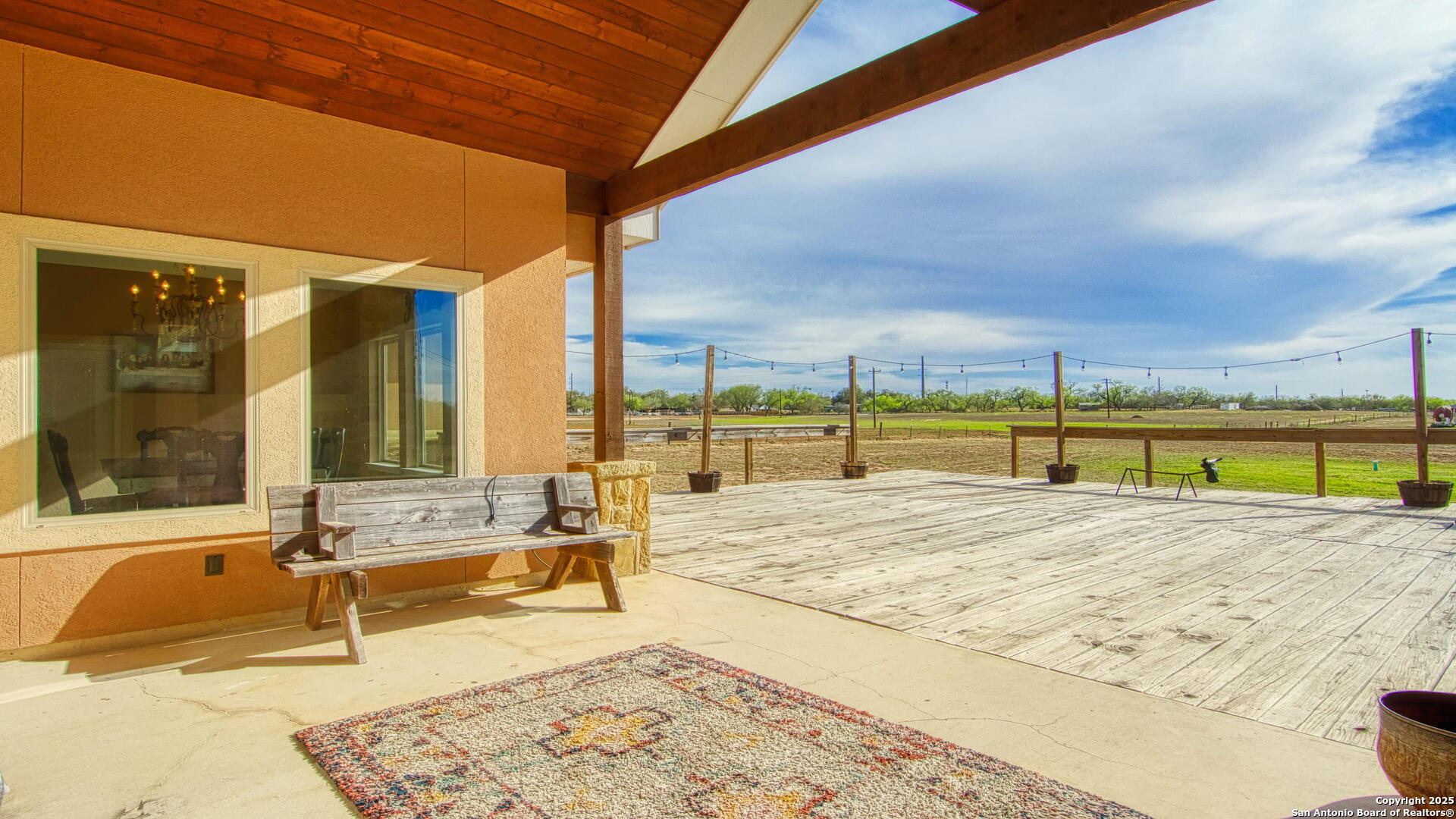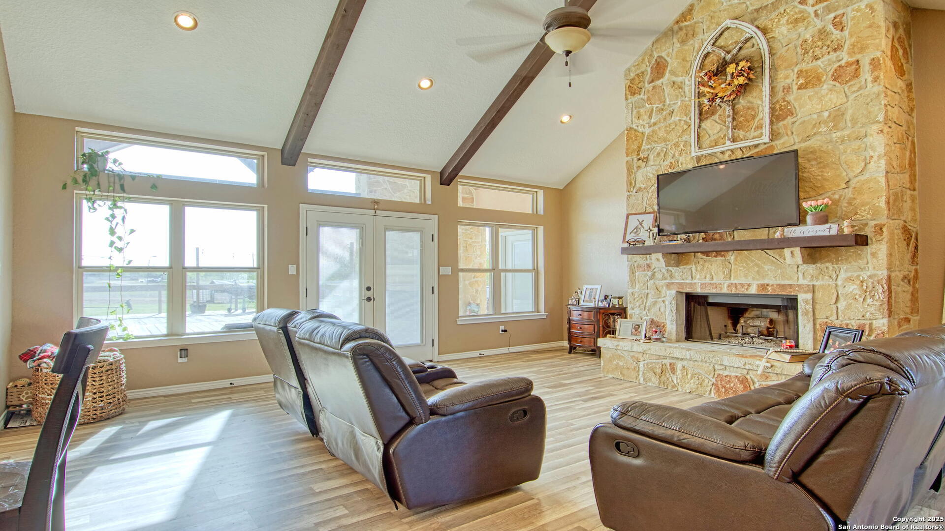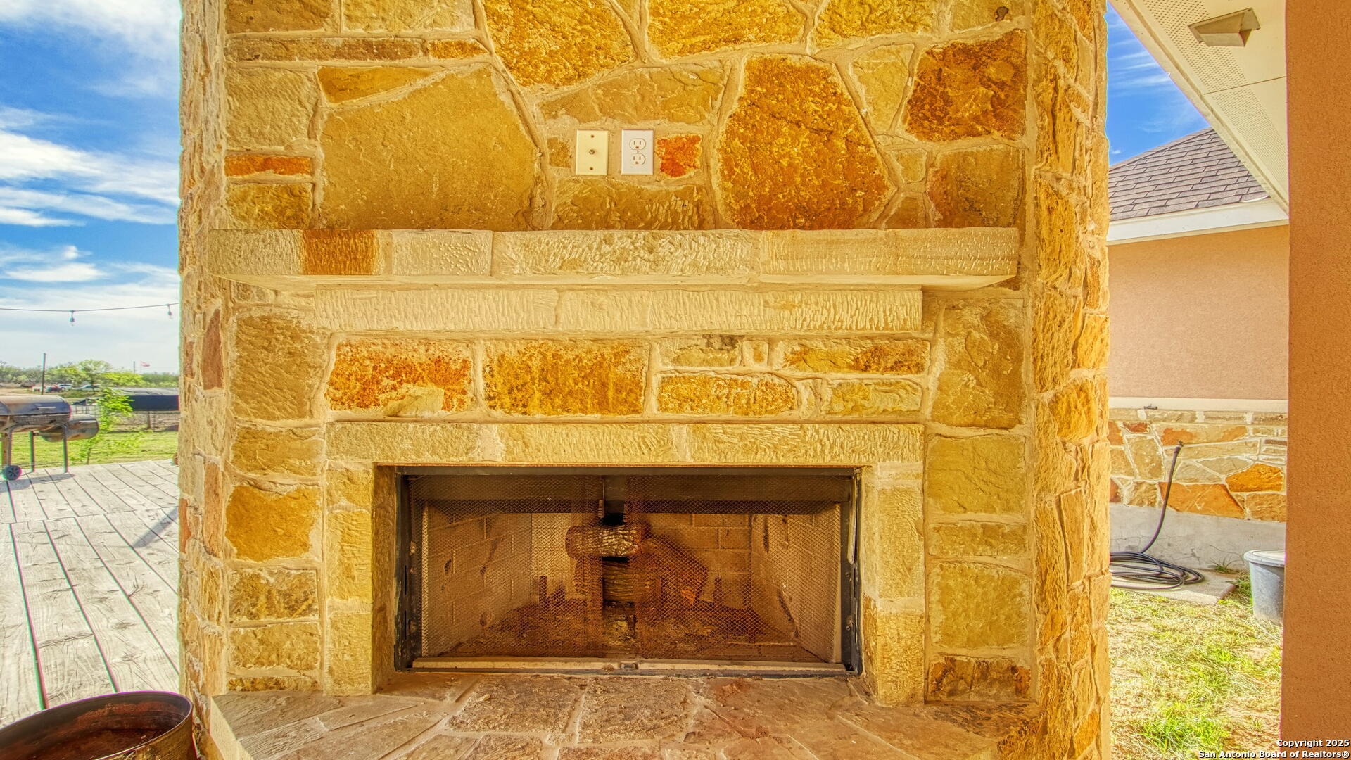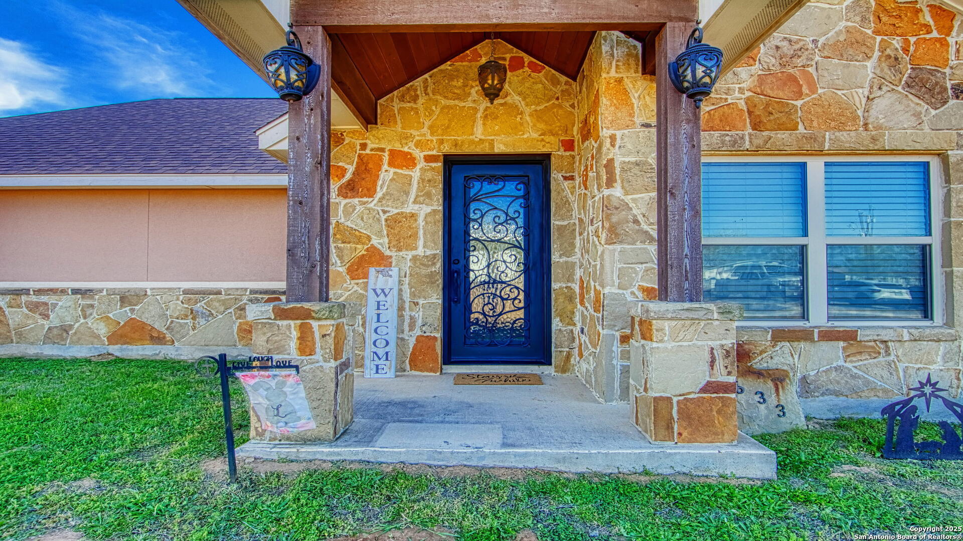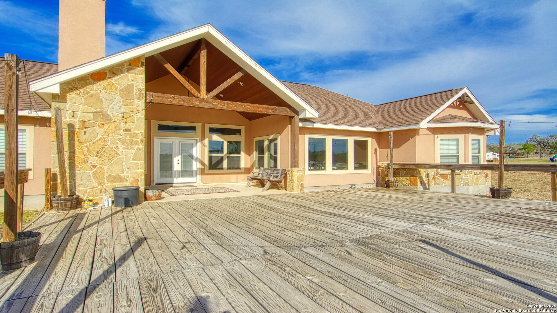 CUSTOM BUILT in 2017, this beautiful 3 BED, 3 BATH home with an OPEN FLOOR PLAN sits on the outskirts of small town Floresville, Texas! The heart of the 2443 SQ FT home is the spacious kitchen (refrigerator included!) and expansive living room with impressive rock FIREPLACE and views of the back of the property. For those who enjoy outdoor living, a second rock fireplace on the large DECK provides a cozy retreat with country views, ideal for entertaining or simply relaxing. The MASTER SUITE is a true sanctuary, with vaulted ceilings, private outside access, and a luxurious ensuite bath. Centered around the relaxing SPA TUB, the master bathroom includes SEPARATE VANITIES, a walk-in tile SHOWER, a massive WALK IN CLOSET, and a private water closet for added convenience. On the opposite side of the home, the other two bedrooms are equally impressive, each featuring charming BAY WINDOWS, walk-in closets, and connected by a JACK AND JILL BATHROOM. The SPLIT FLOOR PLAN ensures added privacy for everyone in the home. The MUDROOM, laundry room and NO CARPET help streamline home maintenance and the OFFICE is perfect for working or could be used as a FOURTH BEDROOM with its own closet. The large STORAGE BUILDING and covered carport behind the house provide storage galore. Nestled on a peaceful 5 ACRE LOT and located just minutes from town, this property offers a perfect balance of privacy and accessibility. Enjoy the peace and quiet of a short street with minimal traffic, while still being close to schools, stores, and emergency services. And only a short 20 minute drive to San Antonio or the Eagle Ford area. Whether you're entertaining, relaxing, or simply enjoying your space, this home has it all. Don't miss the opportunity to make this beautiful property your own!