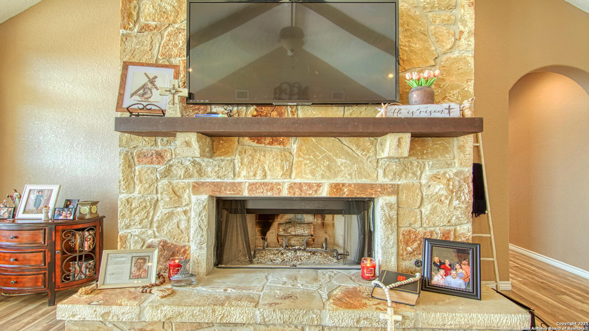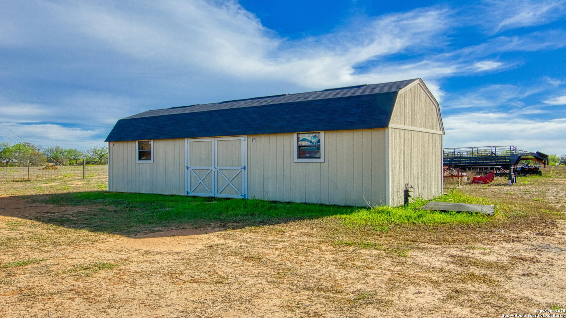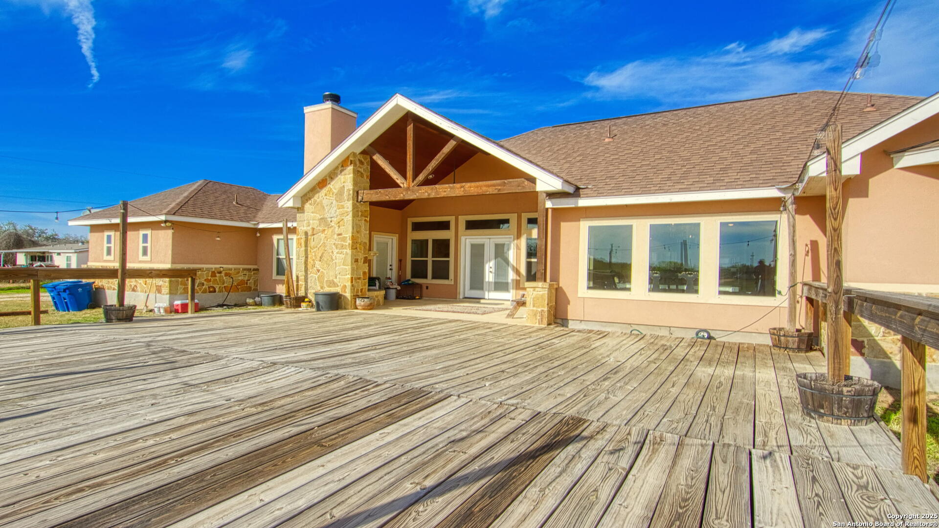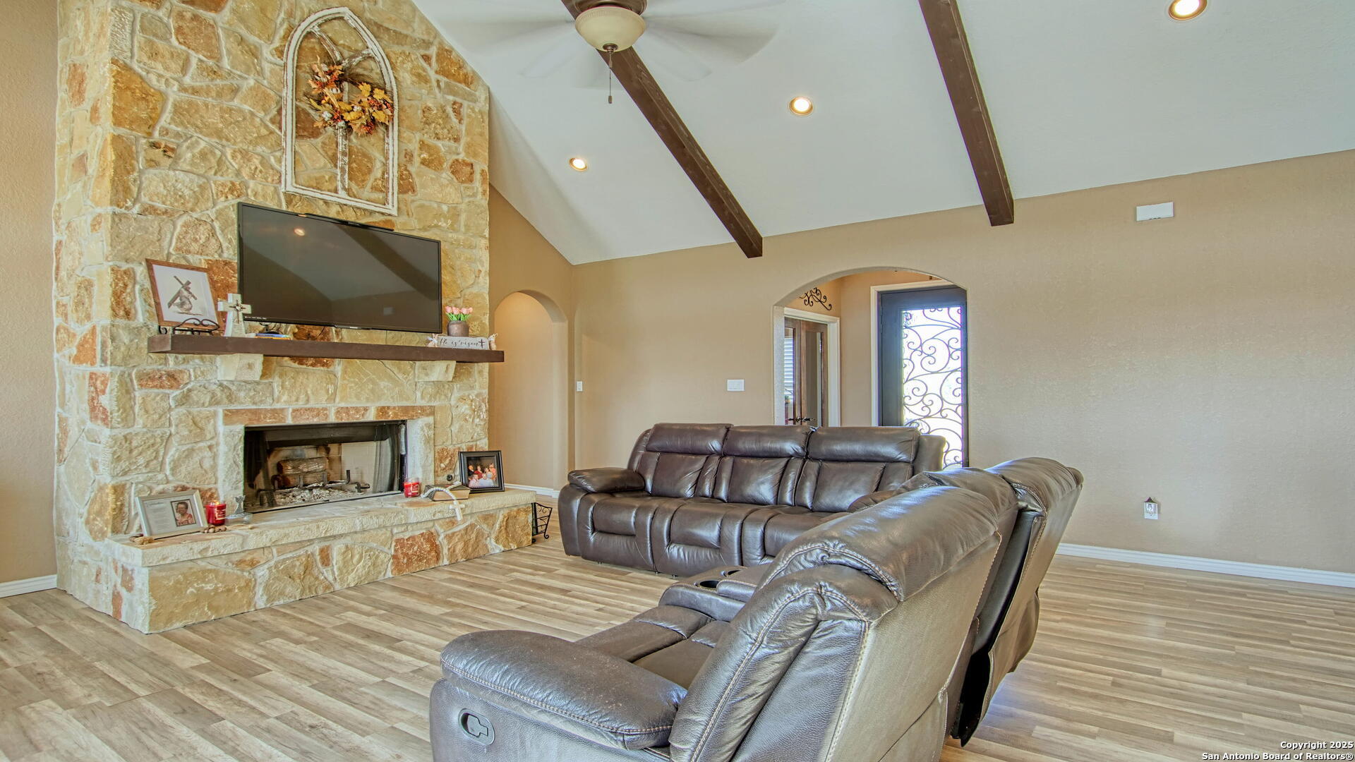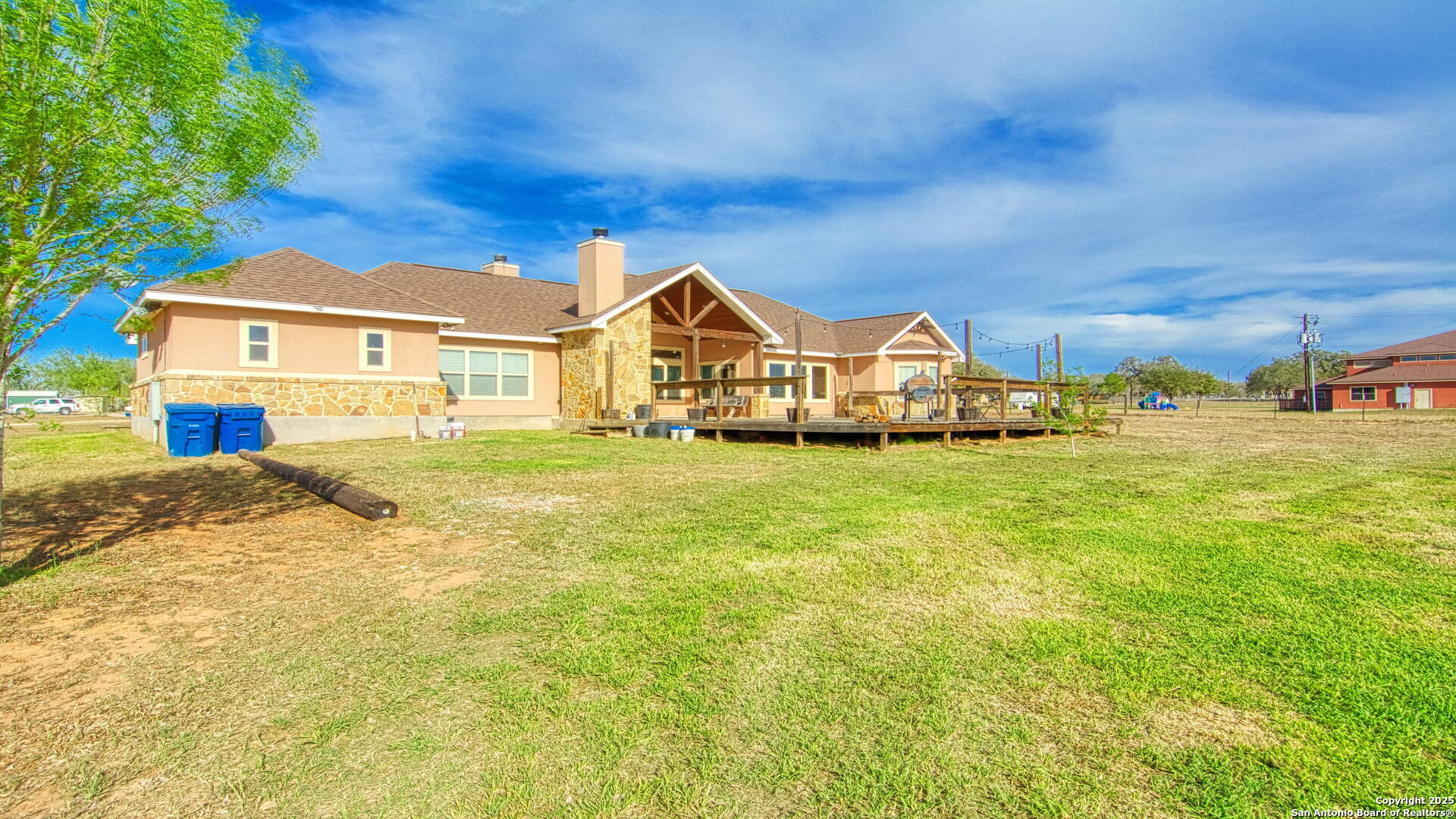 CUSTOM BUILT in 2017, this beautiful 3 BED, 3 BATH home with an OPEN FLOOR PLAN sits on the outskirts of small town Floresville, Texas! The heart of the 2443 SQ FT home is the spacious kitchen (refrigerator included!) and expansive living room with impressive rock FIREPLACE and views of the back of the property. For those who enjoy outdoor living, a second rock fireplace on the large DECK provides a cozy retreat with country views, ideal for entertaining or simply relaxing. The MASTER SUITE is a true sanctuary, with vaulted ceilings, private outside access, and a luxurious ensuite bath. Centered around the relaxing SPA TUB, the master bathroom includes SEPARATE VANITIES, a walk-in tile SHOWER, a massive WALK IN CLOSET, and a private water closet for added convenience. On the opposite side of the home, the other two bedrooms are equally impressive, each featuring charming BAY WINDOWS, walk-in closets, and connected by a JACK AND JILL BATHROOM. The SPLIT FLOOR PLAN ensures added privacy for everyone in the home. The MUDROOM, laundry room and NO CARPET help streamline home maintenance and the OFFICE is perfect for working or could be used as a FOURTH BEDROOM with its own closet. The large STORAGE BUILDING and covered carport behind the house provide storage galore. Nestled on a peaceful 5 ACRE LOT and located just minutes from town, this property offers a perfect balance of privacy and accessibility. Enjoy the peace and quiet of a short street with minimal traffic, while still being close to schools, stores, and emergency services. And only a short 20 minute drive to San Antonio or the Eagle Ford area. Whether you're entertaining, relaxing, or simply enjoying your space, this home has it all. Don't miss the opportunity to make this beautiful property your own!