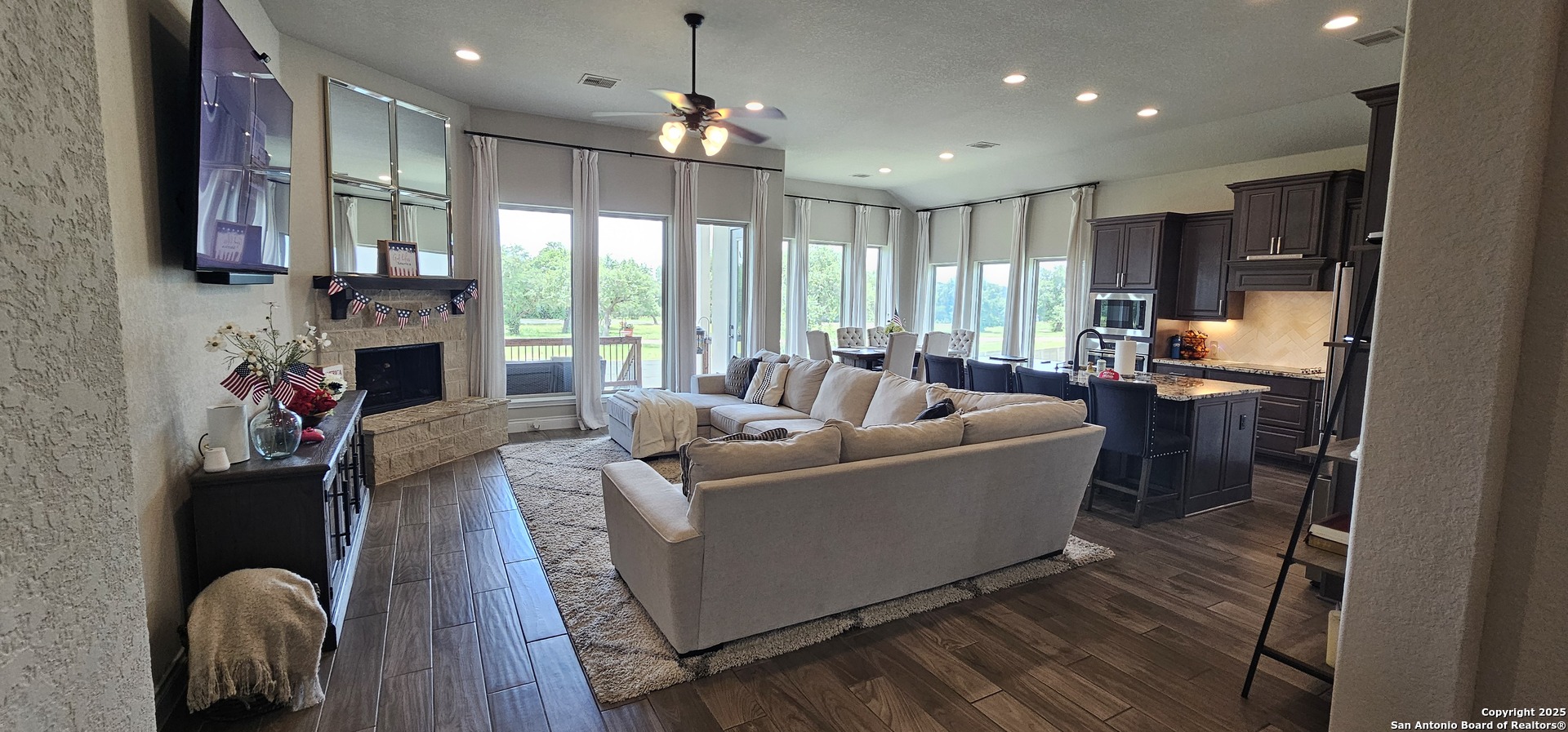 Ready to find your dream home? Step inside this gorgeous Perry Home, where peace and privacy are yours with no front or back neighbors. You'll feel the difference on this expansive 80-foot-wide lot, starting with the striking mahogany front door that welcomes you. Natural light floods the home through walls of windows in the kitchen, family room, and master bedroom, creating a bright and airy feel. The open-concept layout makes it easy to move from the gourmet kitchen, with its oversized island, to the cozy family room, complete with a fireplace and elegant ceramic tile floors. This home is designed for both work and play. Find a quiet spot to focus in the private library, featuring French doors and a stunning 13-foot ceiling, or host game night in the dedicated game room, also with French doors. The master suite is your personal sanctuary. Relax with a wall of windows, a huge walk-in closet, and a luxurious bathroom boasting dual vanities, a garden tub, and a separate glass-enclosed shower. An additional guest suite with a full bath ensures visitors feel right at home. Beyond the home's beauty, you'll love the convenience. Enjoy peace of mind with a 10-year Perry Home foundation warranty. Plus, the location is unbeatable-simply walk across the street to the community gym and pool, or take a quick 5-minute golf cart ride to the incredible Vintage Oaks amenities, including the lazy river.