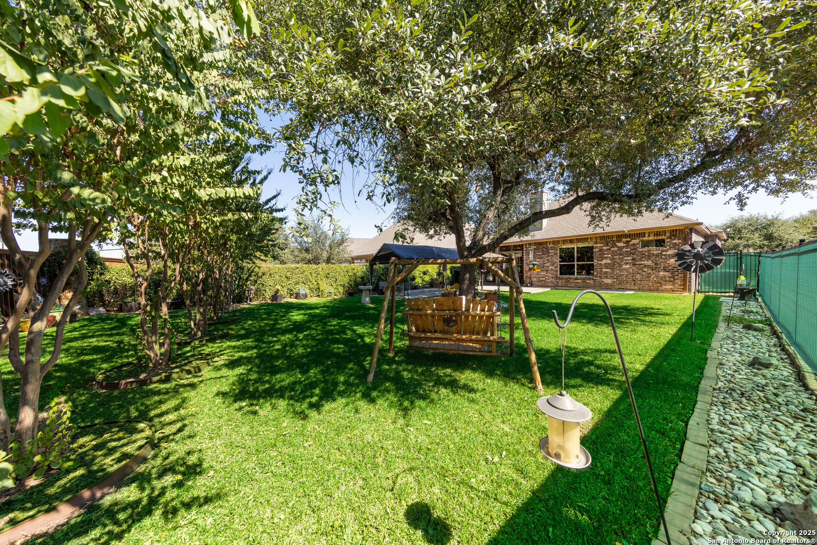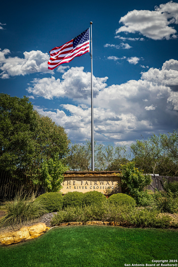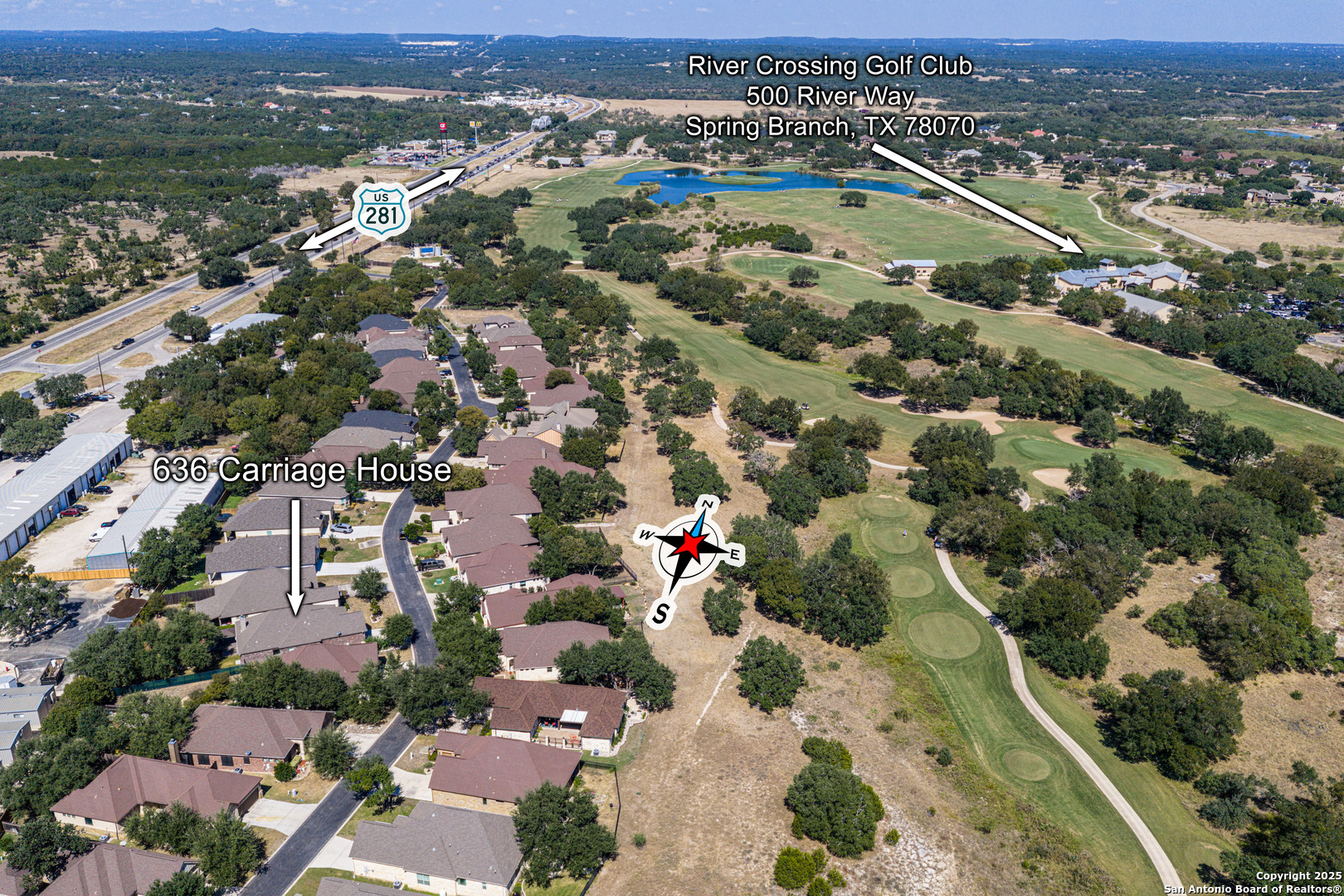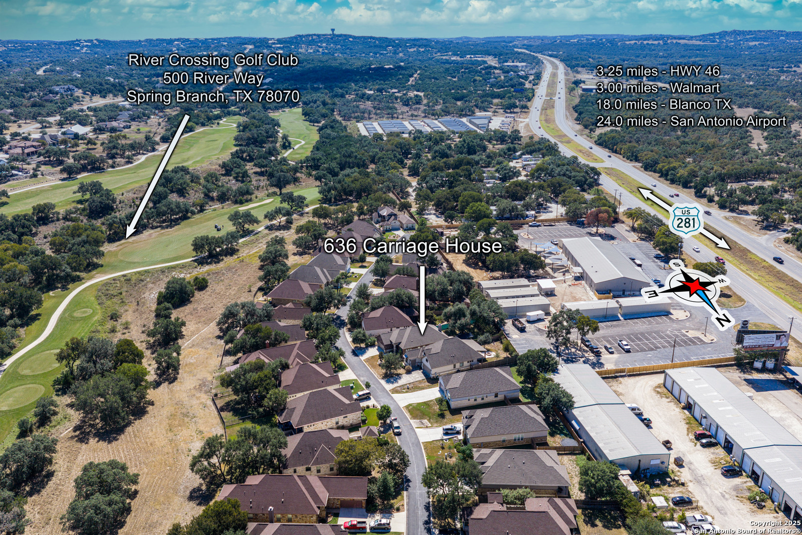 Welcome home to this beautifully maintained 3-bedroom, 2-bath retreat in the gated Fairways at River Crossing/Carriage house community! Bright and open, the home features high ceilings, warm finishes, and a stylish kitchen with stainless appliances and quality cabinetry. The spacious primary suite offers a relaxing bath, beautiful shower and large walk-in closet. Enjoy peaceful evenings on the covered patio surrounded by mature trees. The covered patio also features a wood burning fireplace for those cool evenings. Built in 2014 with a two-car garage and easy-care living thanks to an HOA-maintained front yard. Enjoy golf cart access to River Crossing Golf Course and Club with great dining, recreation center and pool with various levels of Club membership. Close to local shops and restaurants - this home is move-in ready and full of charm! Don't miss this opportunity to own move-in ready, lock-and-leave living with all the upscale touches in a privileged community setting. Make this your home in the Texas hill country.