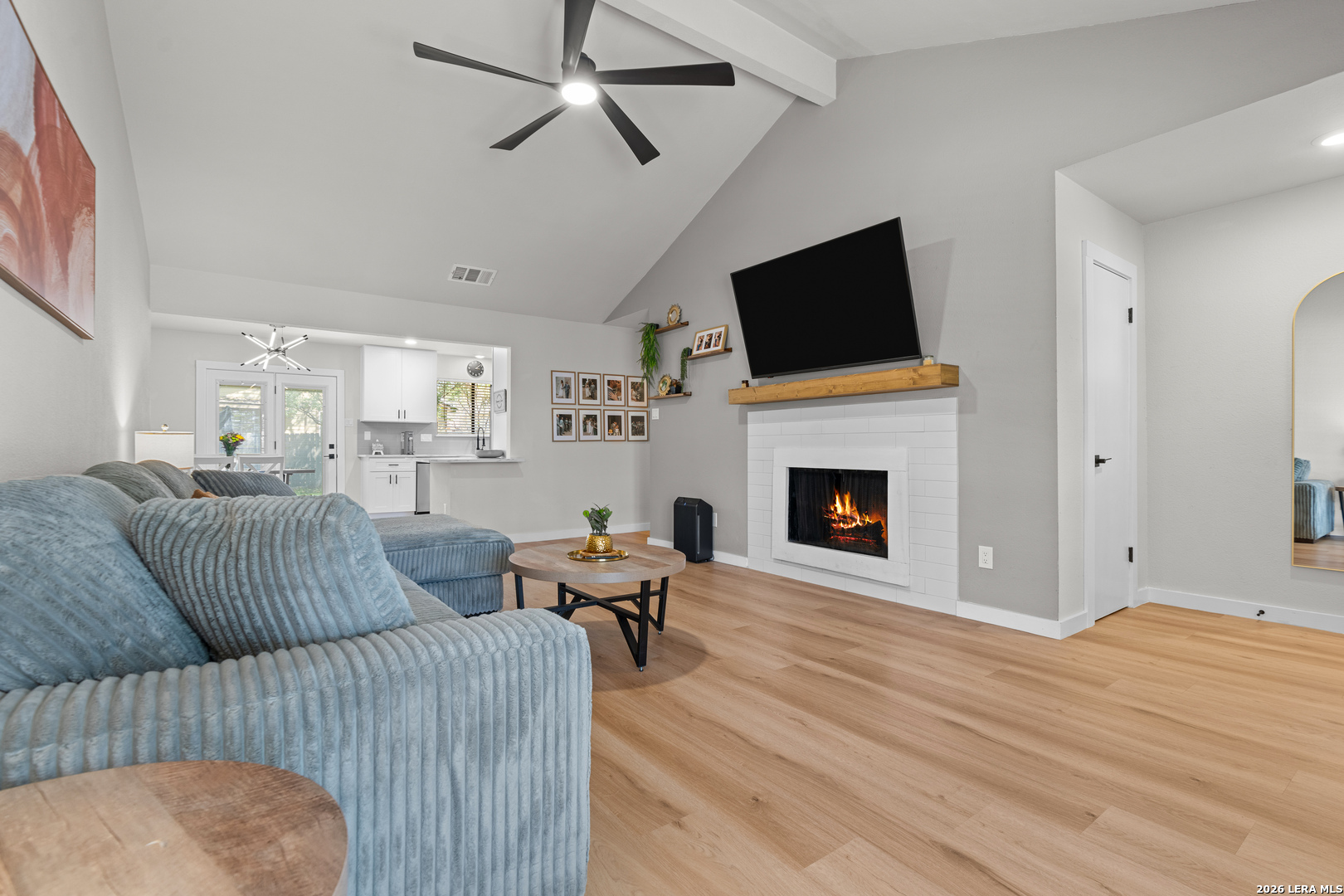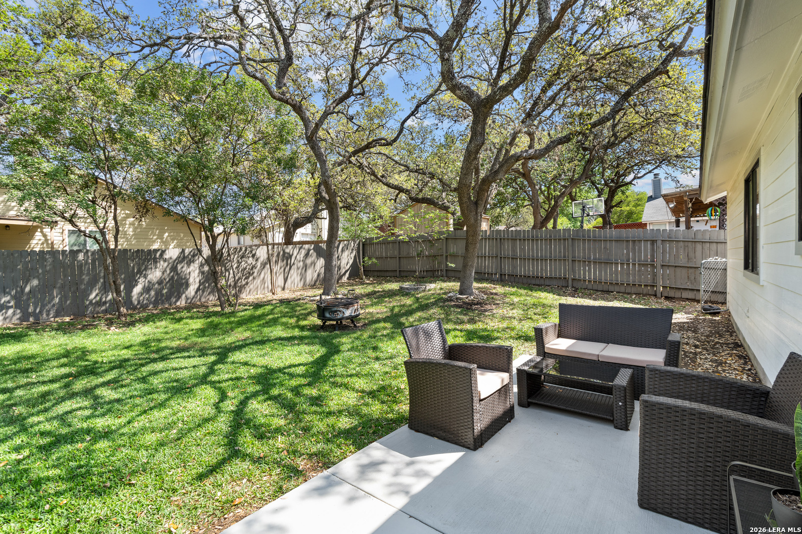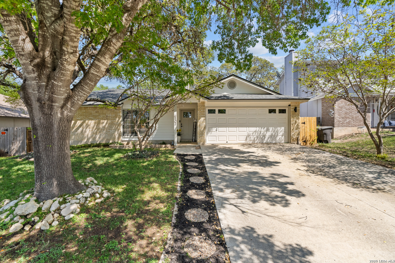 Turn-key, fully renovated & upgraded pristine home in the desirable Ridge Creek community! This beautifully updated 3-bedroom, 2-bath home offers 1,276 sq ft of thoughtfully designed living space with an open-concept layout, soaring ceilings, & abundant natural light. Step inside to find a modern interior featuring no carpet, custom cabinetry, quartz countertops, & a spacious living area centered around a cozy fireplace with a newly added wood mantle, shelving, & built-in TV outlet for a clean, cord-free setup. The kitchen is equipped with like-new stainless steel appliances (only 1 year old), including refrigerator, stove, and dishwasher, making this home truly move-in ready. This home is featuring a BRAND NEW ROOF (2026). The home also will include three premium TV wall mounts already in place for added convenience. Enjoy the outdoors with a well-maintained yard featuring lush green grass, improved landscaping, & mature trees, plus an added patio space perfect for relaxing or entertaining. Additional highlights include a 2-car garage and a professionally installed in-wall dog door that is both clean and functional. Located in the highly sought-after Northside ISD with easy access to shopping, dining, & major highways, this home stands out as one of the most updated and move-in ready properties in the area. Don't miss your opportunity to own a top-tier home with major upgrades already completed - including one of the only homes in the area with a brand new roof! Schedule your showing today, you will not be disappointed!
