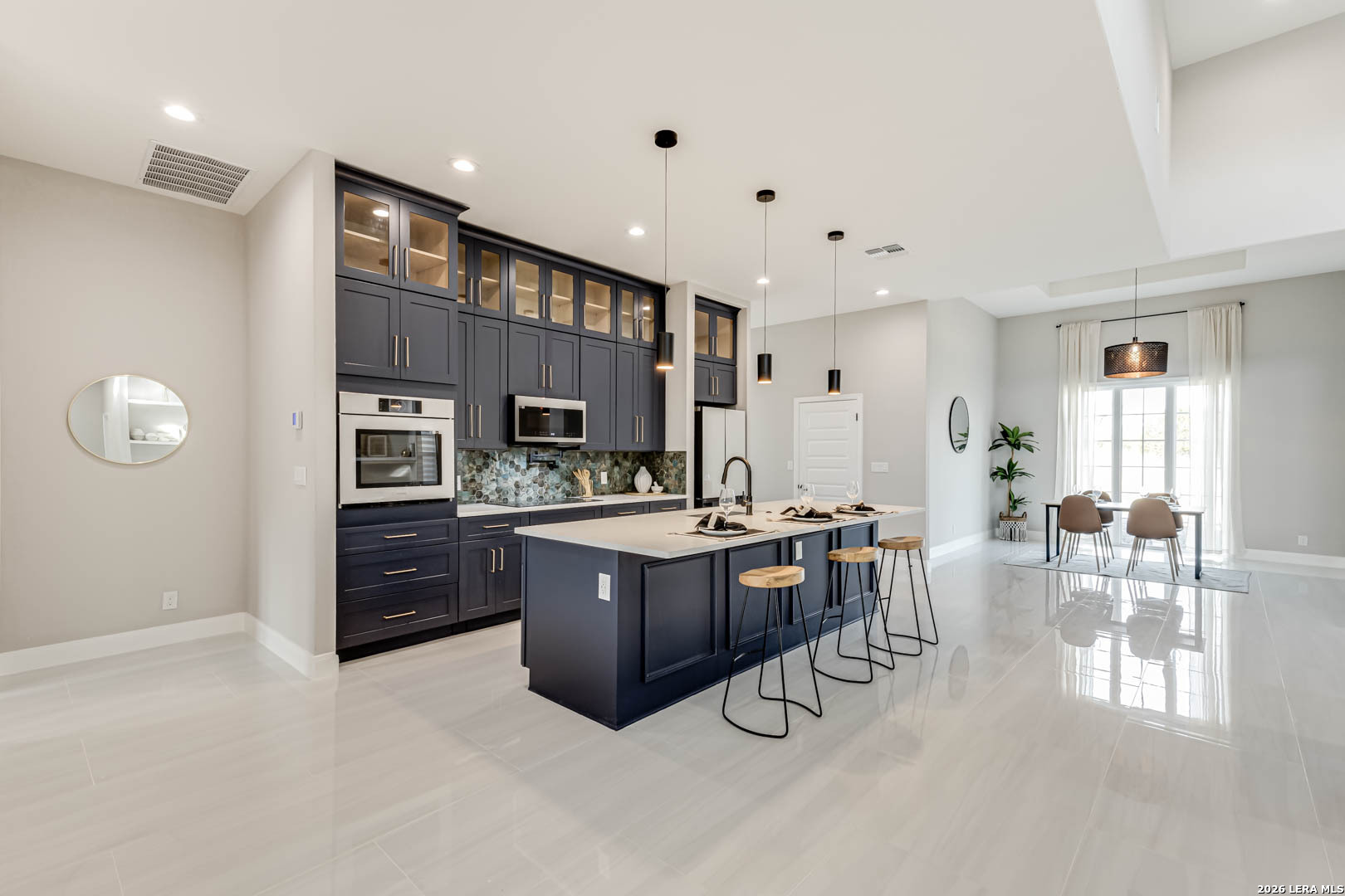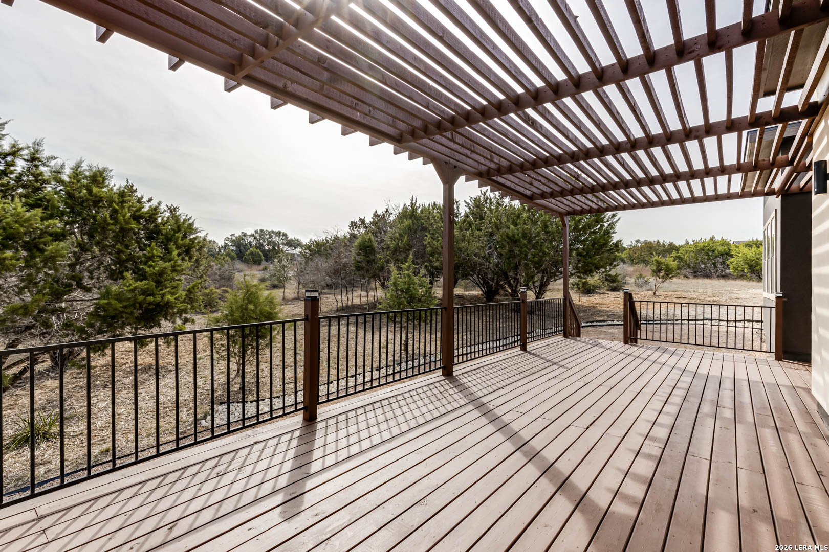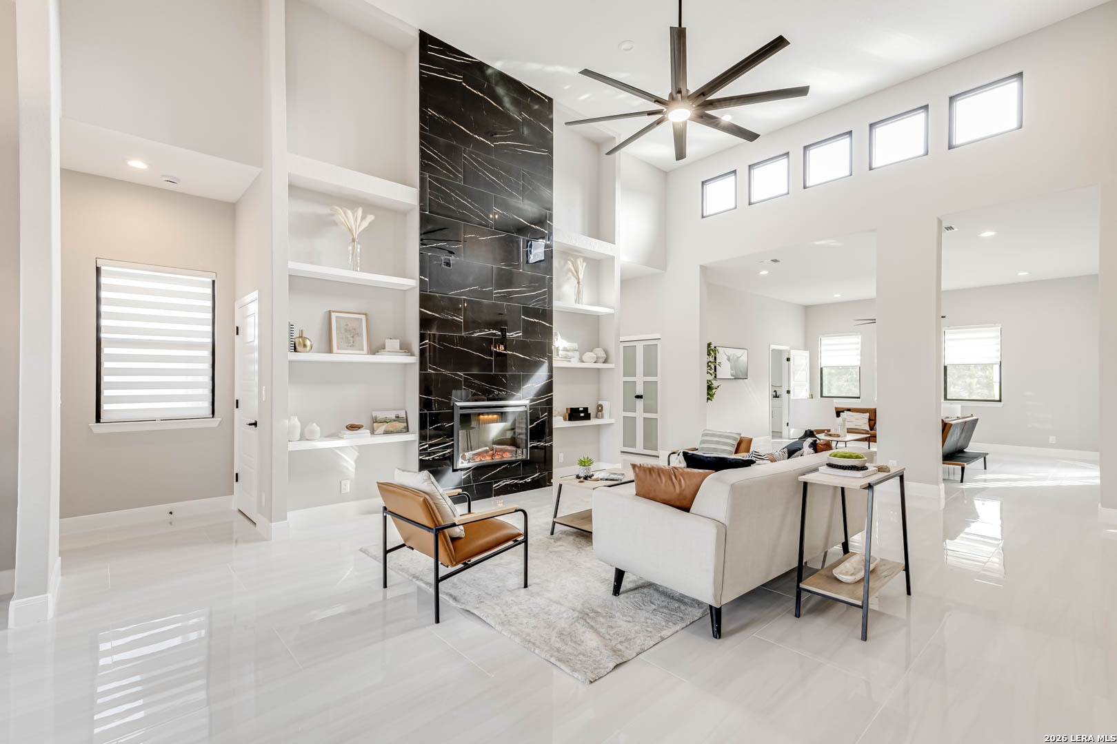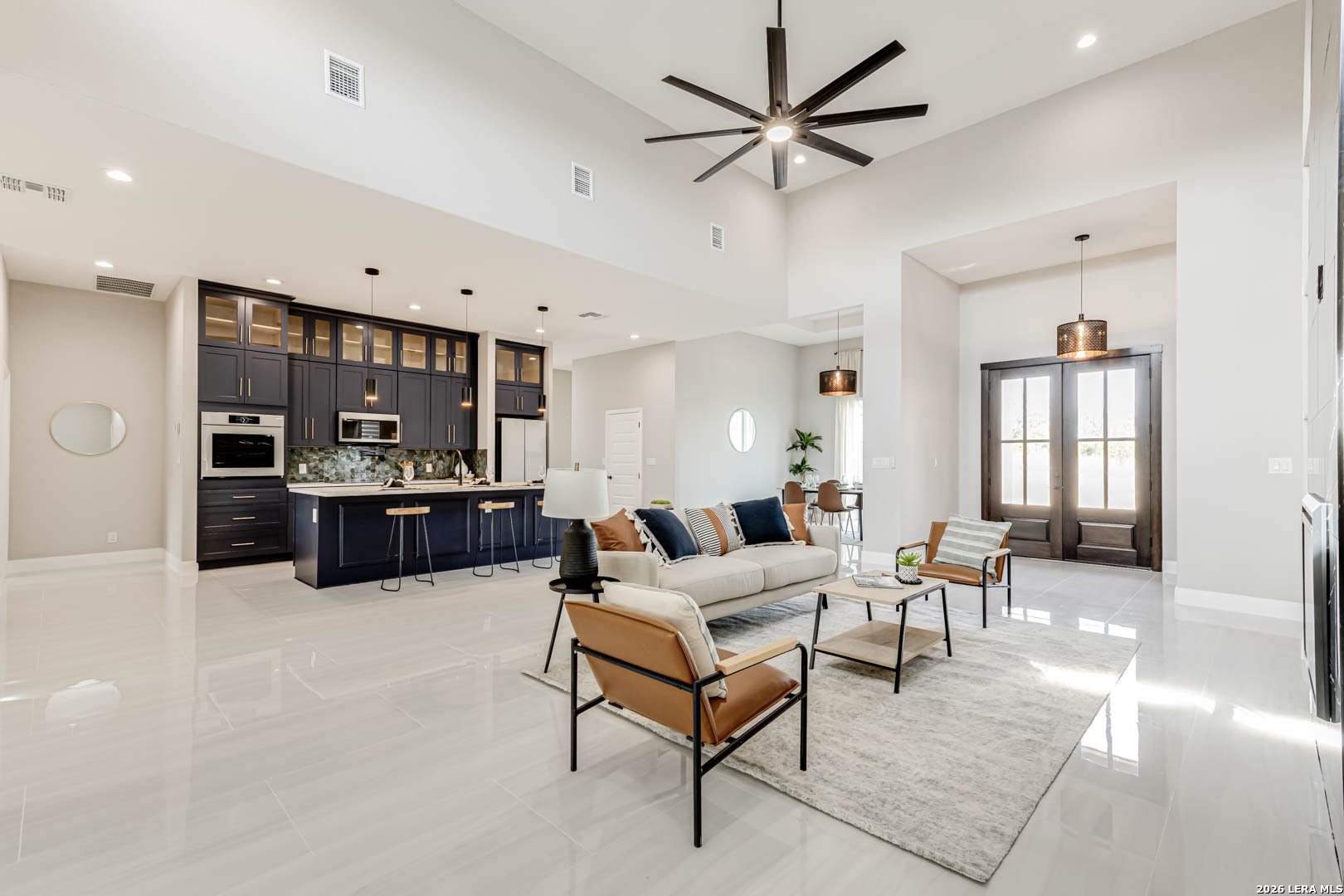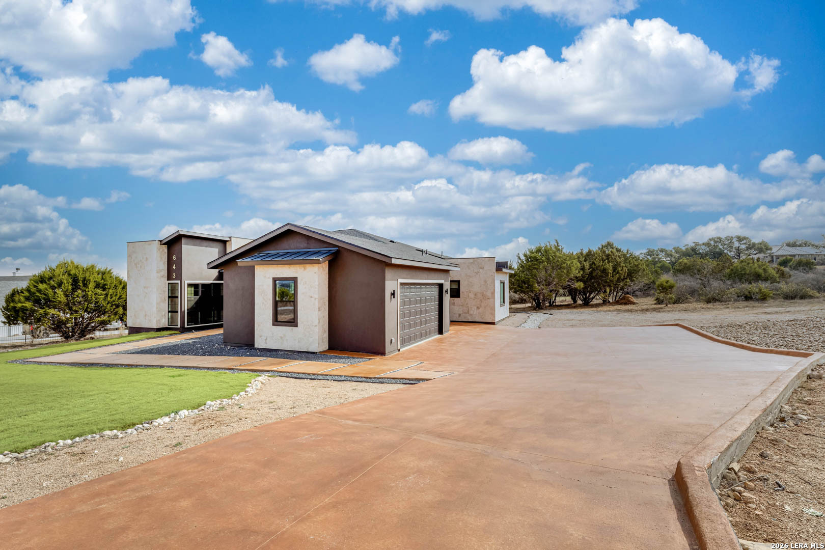 Completed in 2025, this modern single-story home offers refined design and rare privacy on an oversized homesite in Mystic Shores. 3,077 sq ft of light-filled living features soaring ceilings, a dramatic floor-to-ceiling black marble fireplace, and a statement kitchen with custom navy cabinetry and an oversized island designed for gathering. The primary suite delivers a spa-inspired retreat with a freestanding soaking tub and oversized walk-in shower. A covered pergola and expansive outdoor space extend the living experience beyond the interior. Residents enjoy resort-style amenities, lake access, and nature preserve trails. Modern construction. Elevated finishes. Privacy without compromise.
