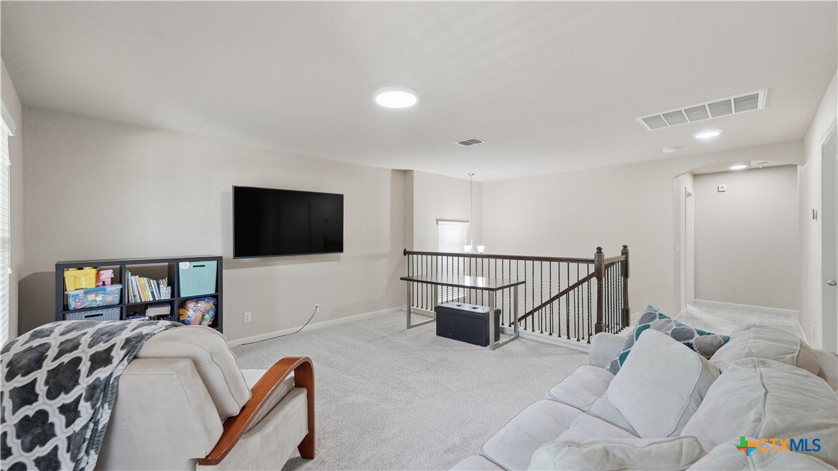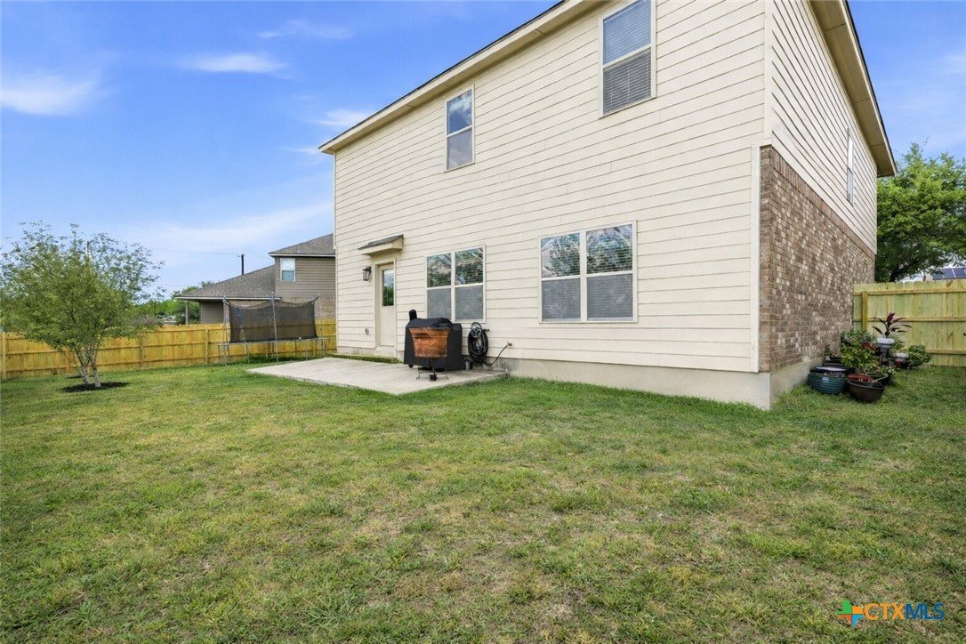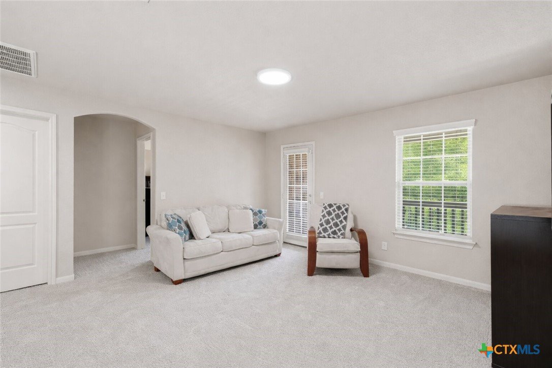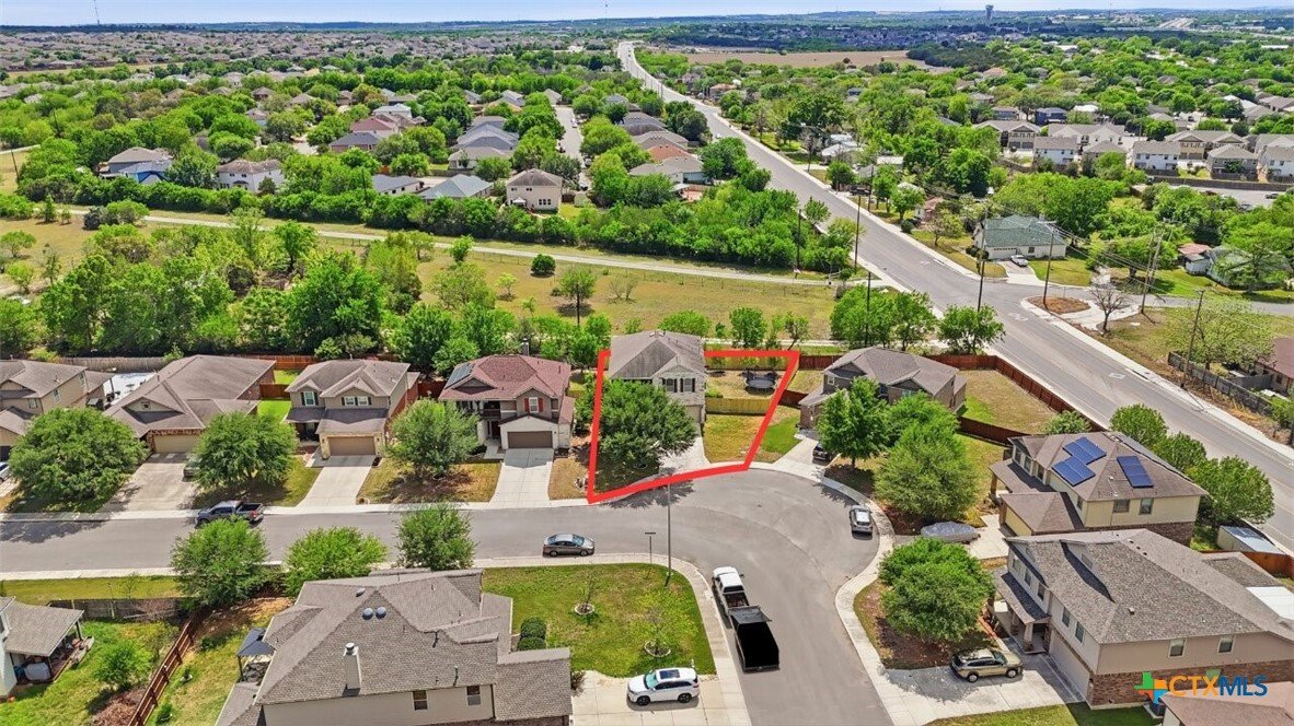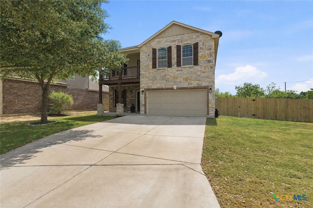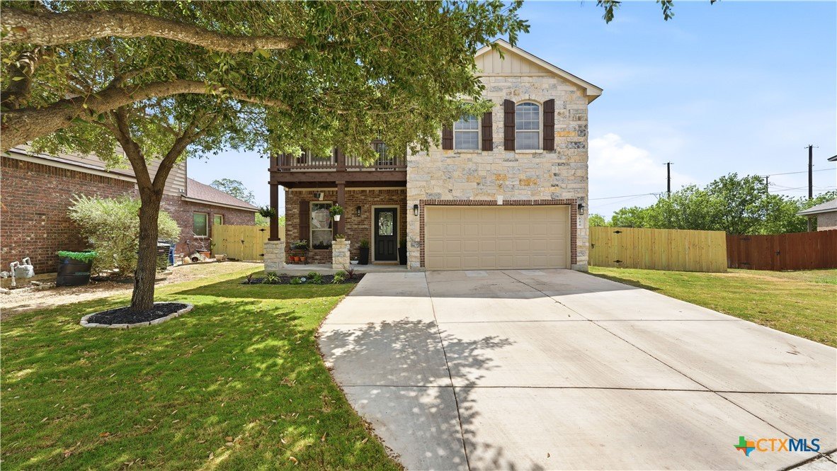 Beautifully positioned on a quiet cul-de-sac, this move-in ready home offers space, privacy, and thoughtful updates throughout. The striking three-side masonry exterior with stone front elevation and a second-floor balcony creates immediate curb appeal, with direct access from the second floor—perfect for enjoying your morning coffee. Inside, the open-concept layout is designed for everyday living and entertaining, featuring a spacious living and dining area that flows seamlessly into the kitchen with ample cabinetry, generous counter space, and a breakfast bar. The first floor is finished with tile throughout for easy maintenance, while brand new carpet upstairs adds comfort. The oversized primary suite offers a true retreat with plenty of room to unwind, complemented by a bathroom featuring a garden tub and separate shower. An additional upstairs living area provides flexible space for a game room, media room, or second lounge. Step outside to a large backyard with brand new sod and fencing, offering privacy with no rear neighbors and plenty of room to enjoy the outdoors. Ideally located with convenient access to I-35, making commuting to San Antonio or Austin simple.
