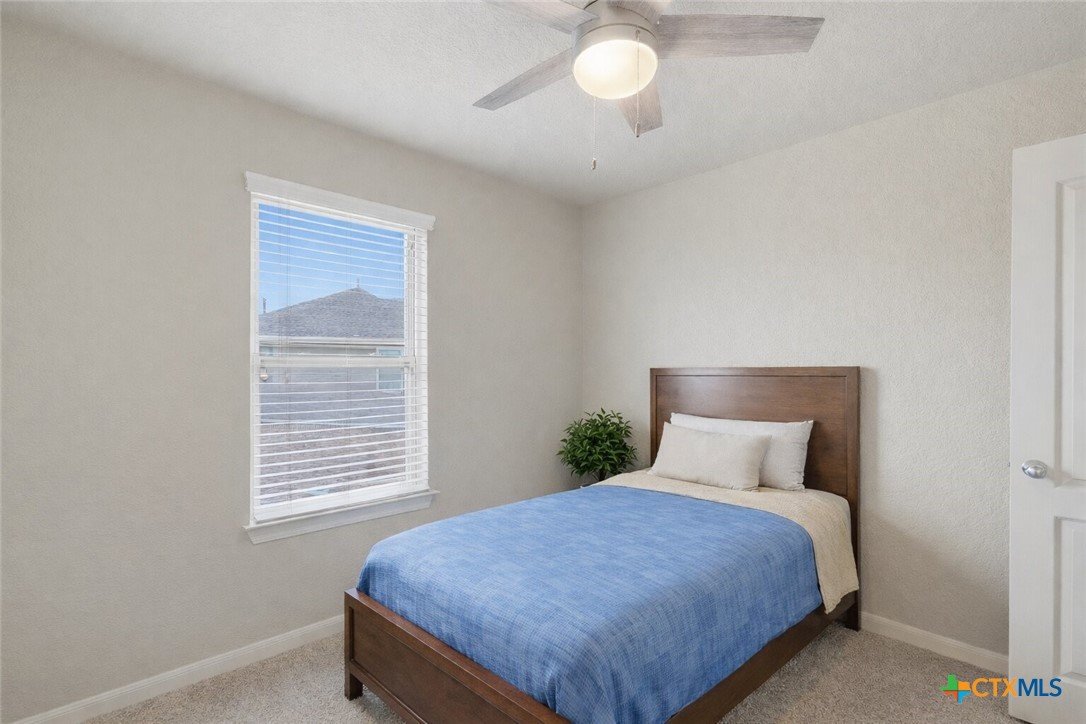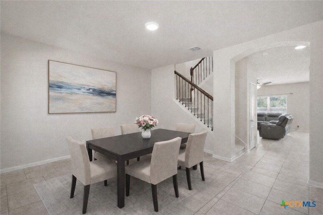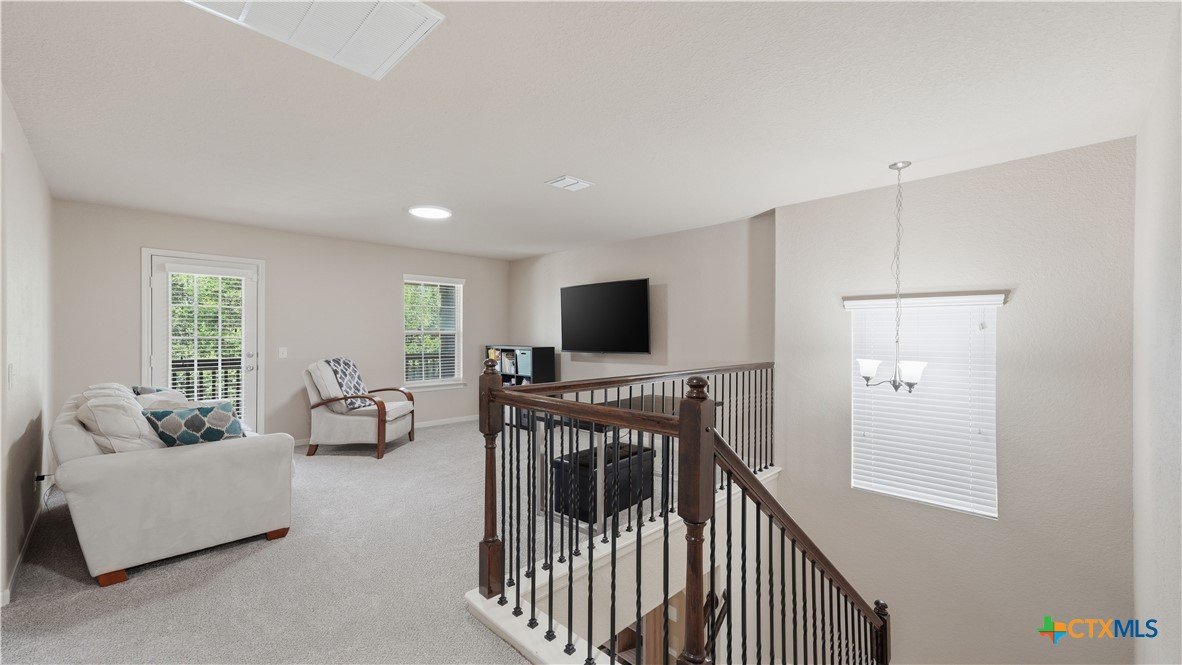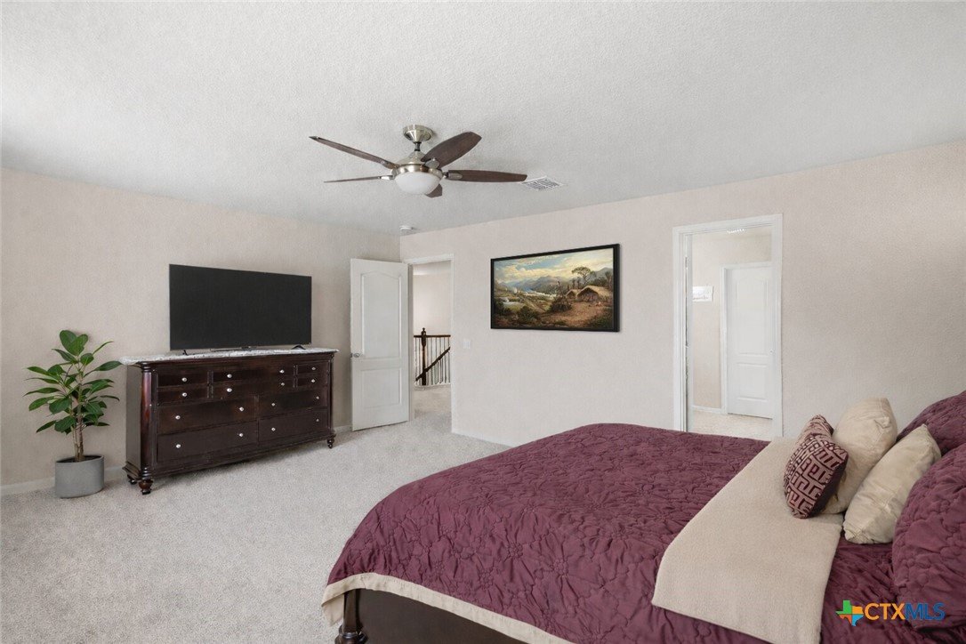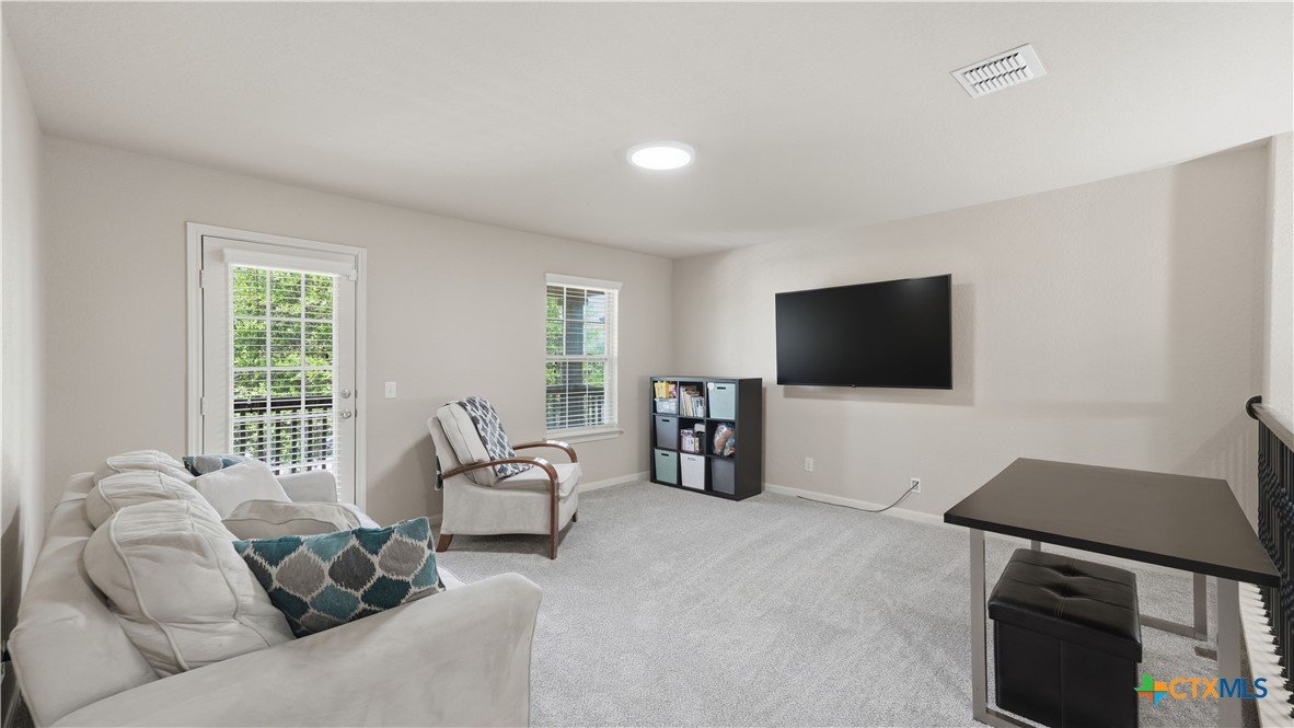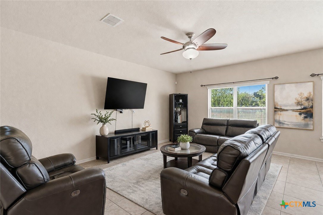 Beautifully positioned on a quiet cul-de-sac, this move-in ready home offers space, privacy, and thoughtful updates throughout. The striking three-side masonry exterior with stone front elevation and a second-floor balcony creates immediate curb appeal, with direct access from the second floor—perfect for enjoying your morning coffee. Inside, the open-concept layout is designed for everyday living and entertaining, featuring a spacious living and dining area that flows seamlessly into the kitchen with ample cabinetry, generous counter space, and a breakfast bar. The first floor is finished with tile throughout for easy maintenance, while brand new carpet upstairs adds comfort. The oversized primary suite offers a true retreat with plenty of room to unwind, complemented by a bathroom featuring a garden tub and separate shower. An additional upstairs living area provides flexible space for a game room, media room, or second lounge. Step outside to a large backyard with brand new sod and fencing, offering privacy with no rear neighbors and plenty of room to enjoy the outdoors. Ideally located with convenient access to I-35, making commuting to San Antonio or Austin simple.