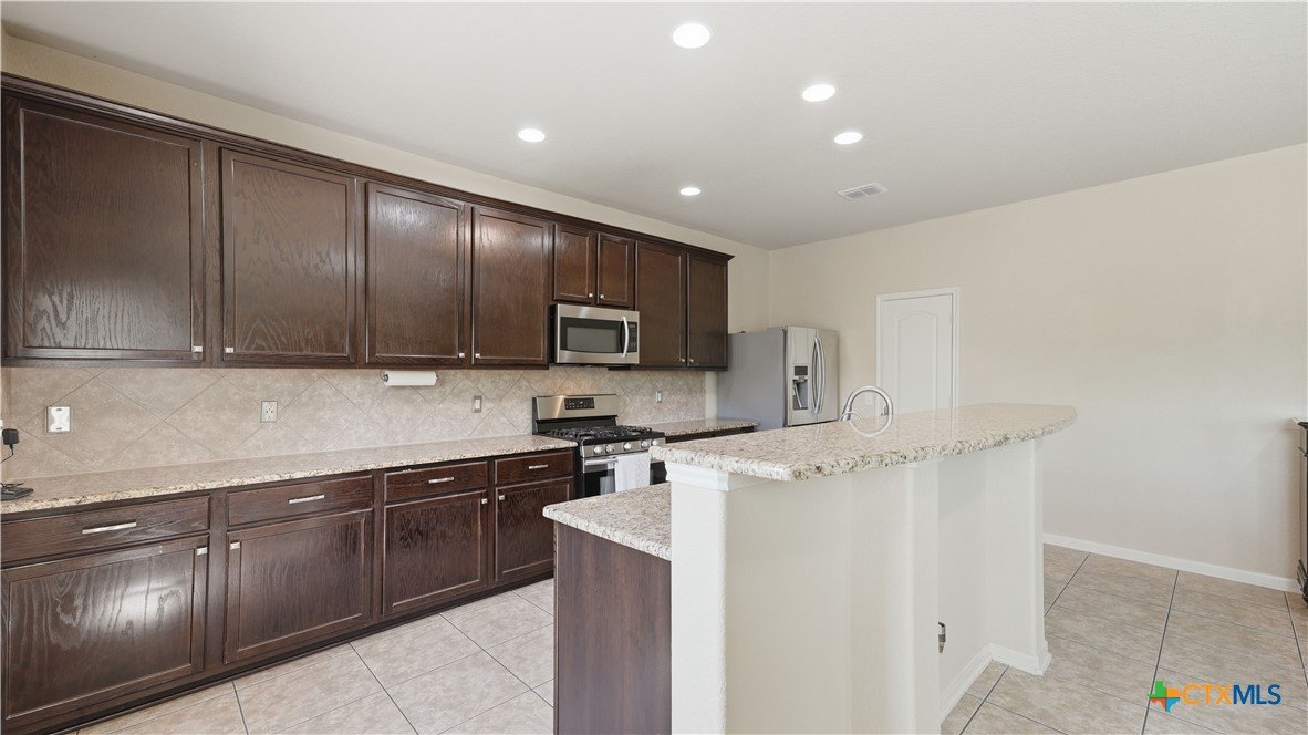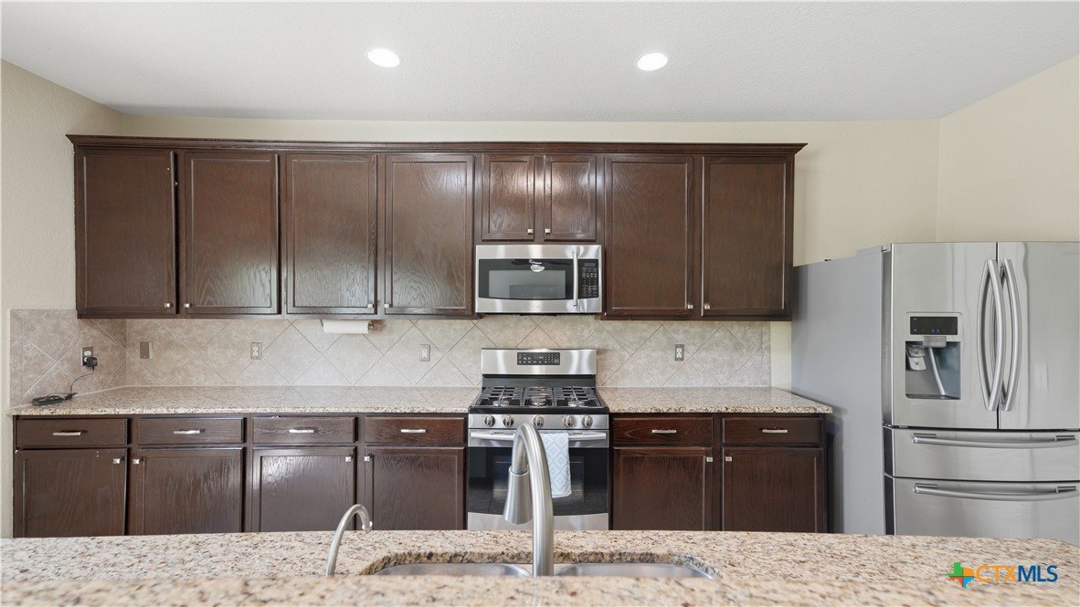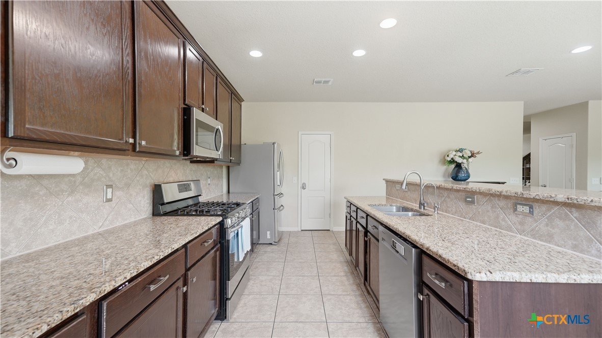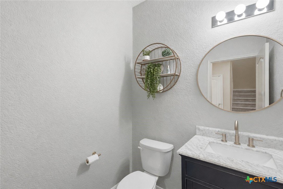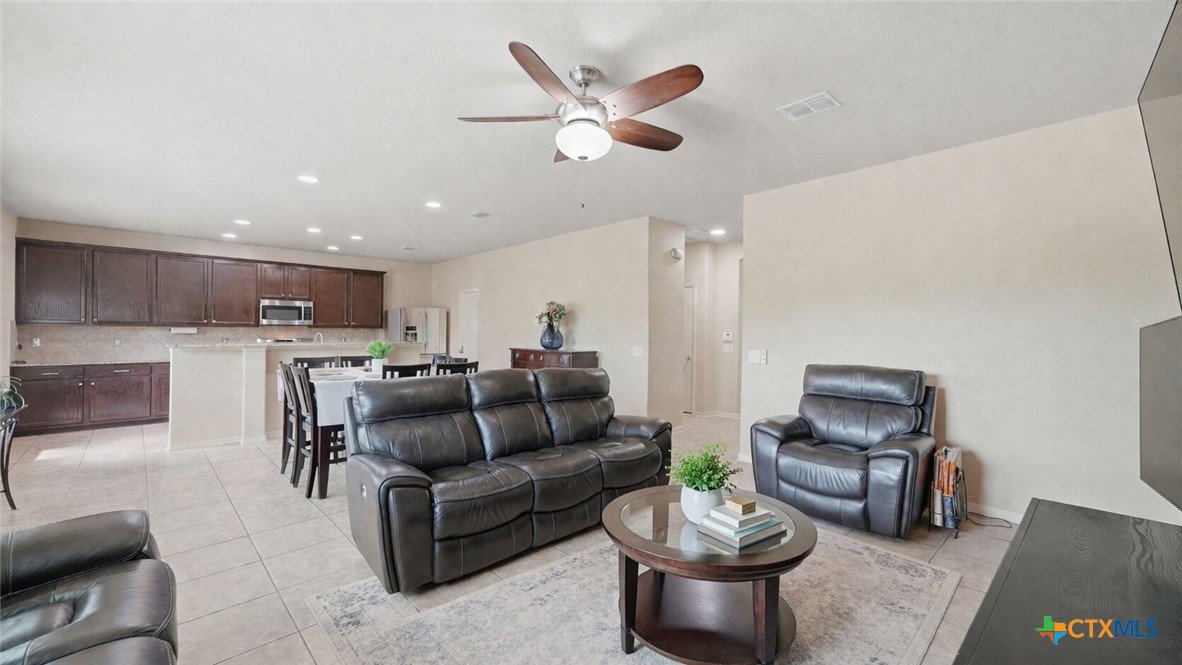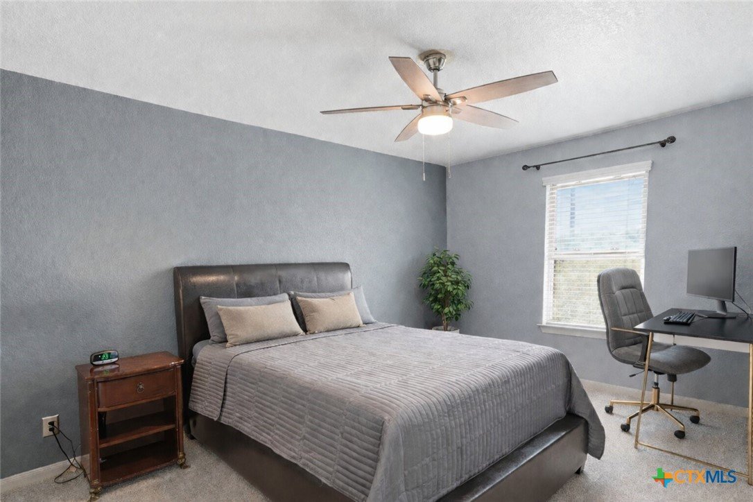 Beautifully positioned on a quiet cul-de-sac, this move-in ready home offers space, privacy, and thoughtful updates throughout. The striking three-side masonry exterior with stone front elevation and a second-floor balcony creates immediate curb appeal, with direct access from the second floor—perfect for enjoying your morning coffee. Inside, the open-concept layout is designed for everyday living and entertaining, featuring a spacious living and dining area that flows seamlessly into the kitchen with ample cabinetry, generous counter space, and a breakfast bar. The first floor is finished with tile throughout for easy maintenance, while brand new carpet upstairs adds comfort. The oversized primary suite offers a true retreat with plenty of room to unwind, complemented by a bathroom featuring a garden tub and separate shower. An additional upstairs living area provides flexible space for a game room, media room, or second lounge. Step outside to a large backyard with brand new sod and fencing, offering privacy with no rear neighbors and plenty of room to enjoy the outdoors. Ideally located with convenient access to I-35, making commuting to San Antonio or Austin simple.
