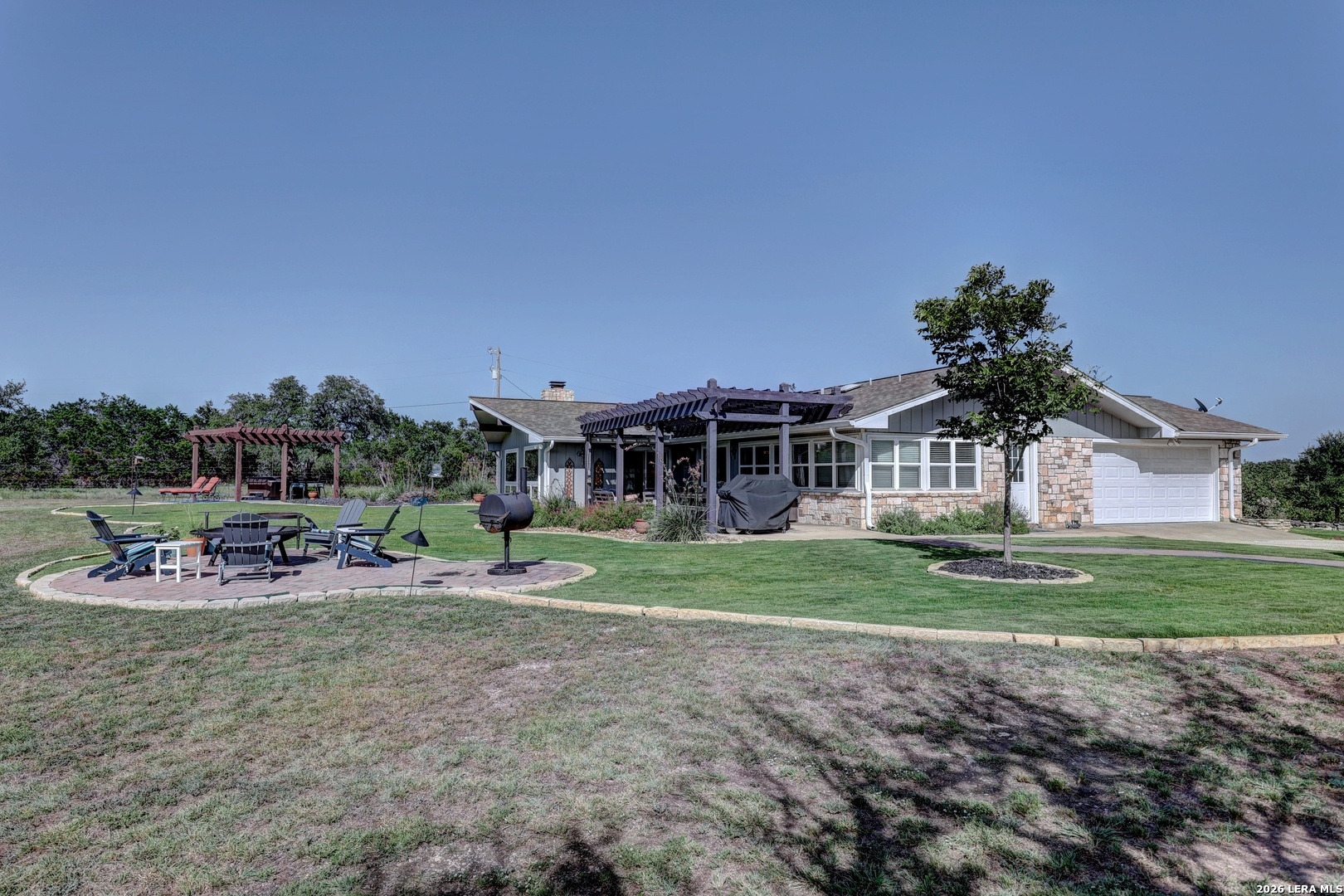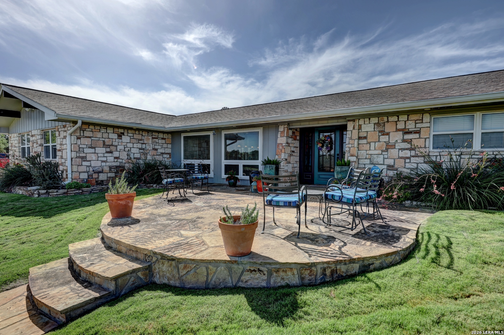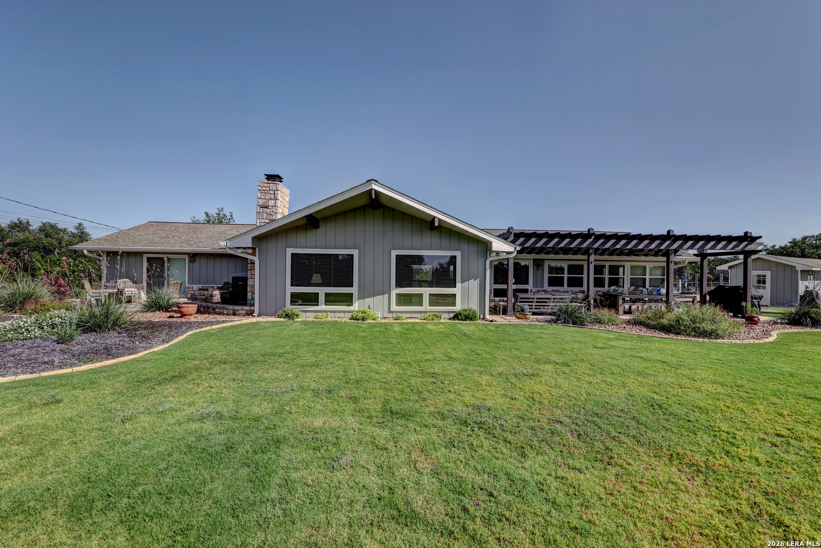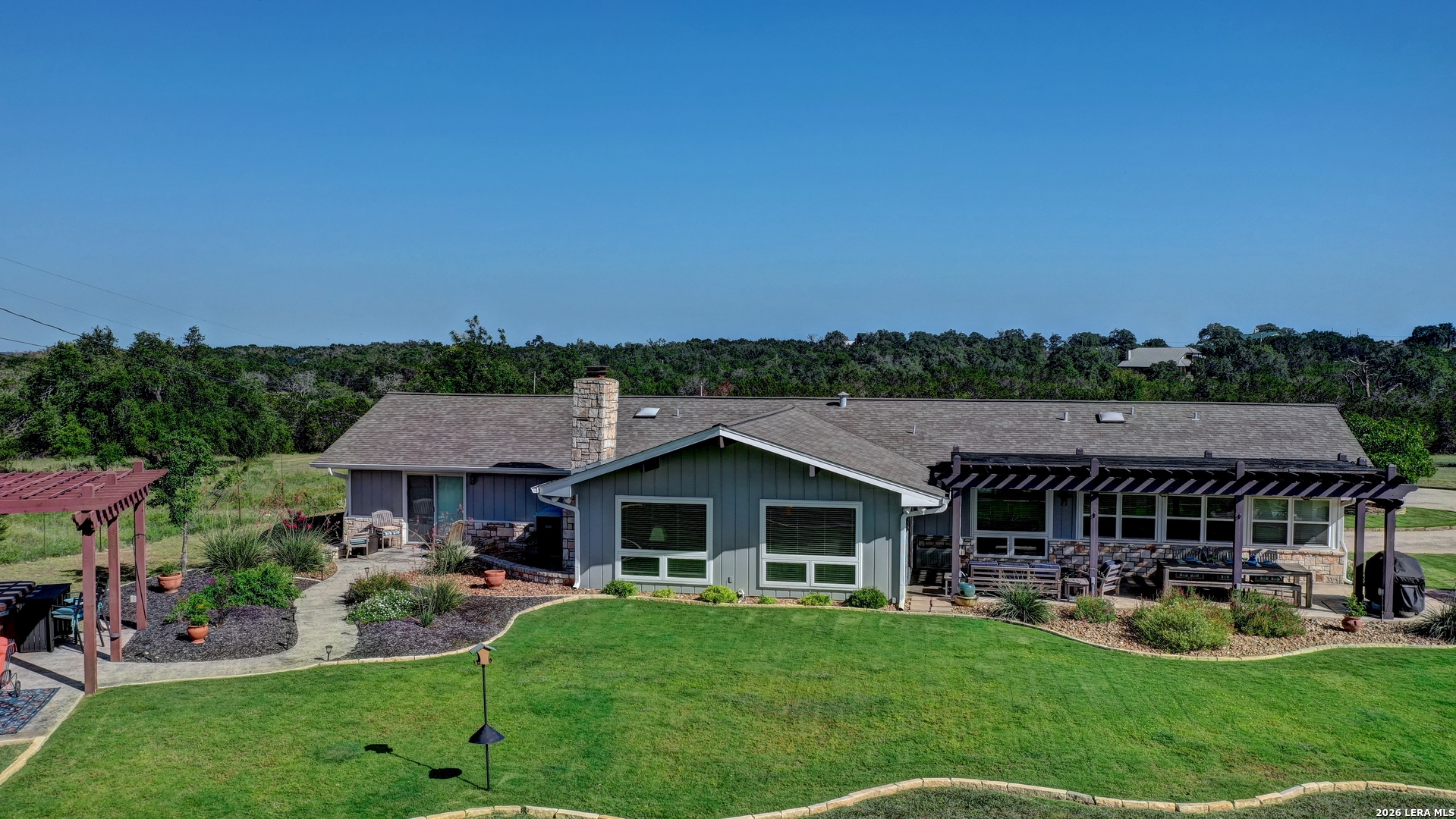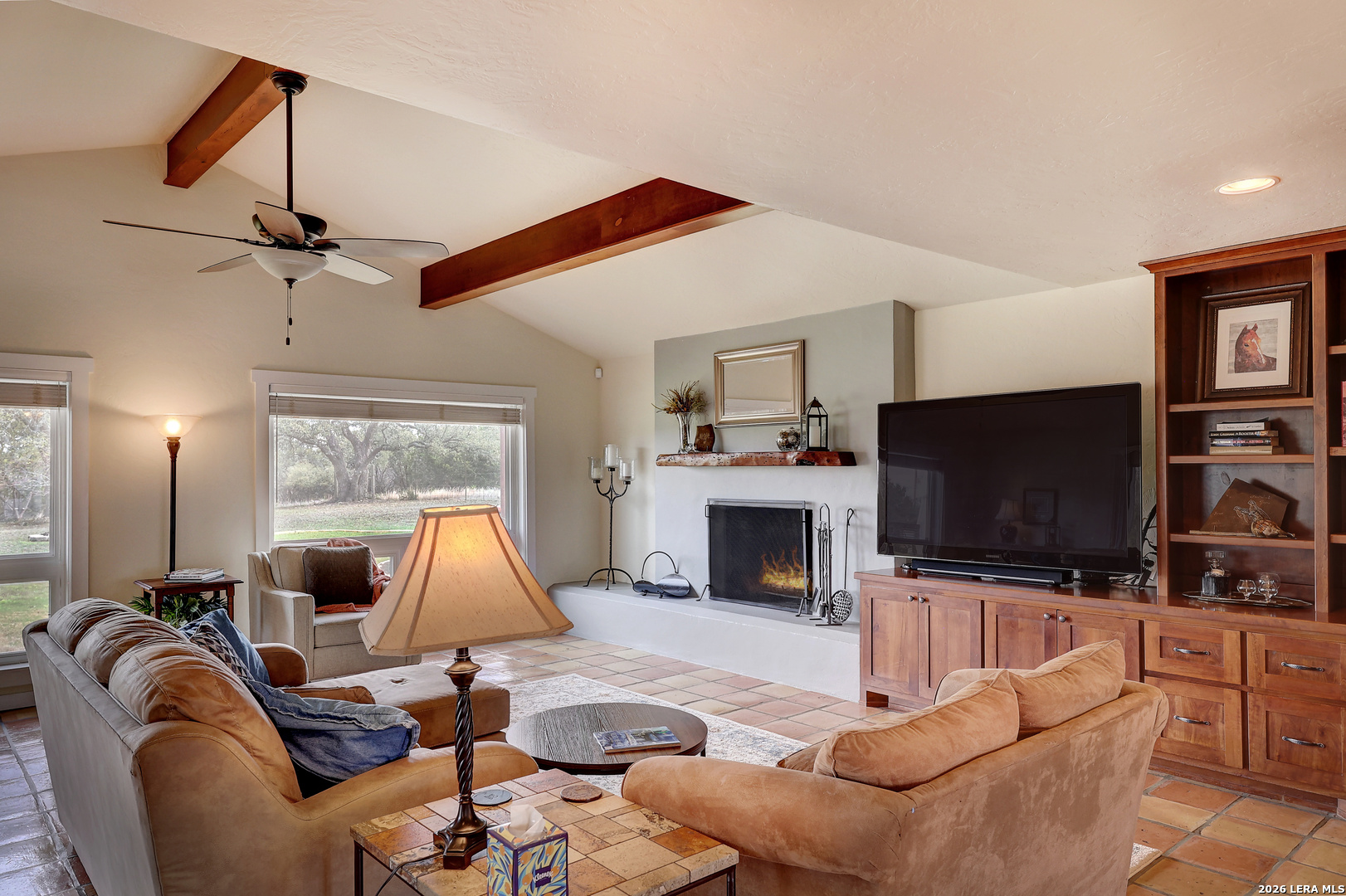 Beautifully updated and well maintained home and guest home on 12.31 acres in Tierra Linda Ranch. The park like setting features a 2425 sf, 3 bedroom, 2.5 bath home, with custom cabinetry, Saltillo tile floors, raw-edge granite countertops, picture windows, built-ins and a spacious, yet comfortable floor plan. The primary bedroom features direct exterior access near the hot tub, as well as a nicely updated ensuite with double vanity and walk in shower. The great room has lots of natural light, a wood burning fireplace and vaulted ceilings with wood beams. There's also an office/sunroom and a large covered back porch. The guest house is 846 sf, 2 bedrooms and 2 full baths, has a living room, kitchenette and private porch. Both homes have been freshly painted inside. The property has two water wells, one into the Trinity aquifer, and the other into the Edwards, which also has a functional windmill. The homes are within a couple acres of high fencing, with the remaining acreage having Ag exemption. Tierra Linda is a unique HOA community, with a swimming pool, airstrip, tennis courts, fishing lakes, trails and horseback riding.