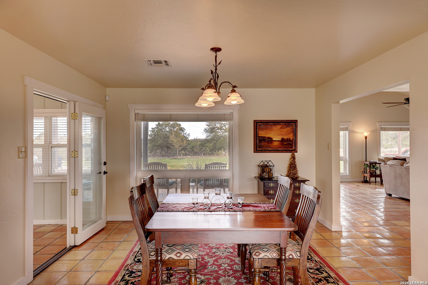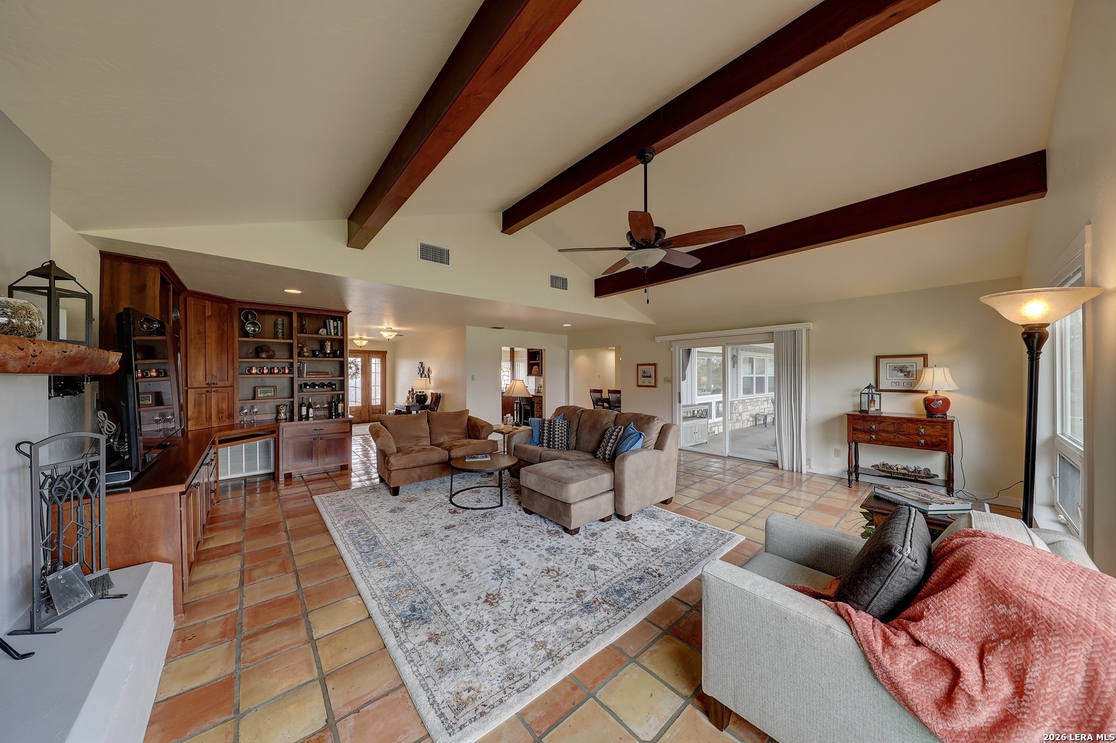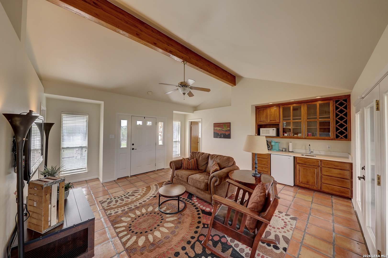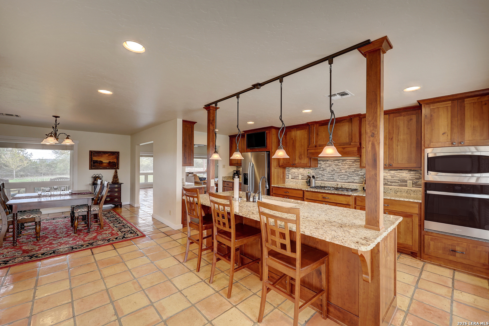 Beautifully updated and well maintained home and guest home on 12.31 acres in Tierra Linda Ranch. The park like setting features a 2425 sf, 3 bedroom, 2.5 bath home, with custom cabinetry, Saltillo tile floors, raw-edge granite countertops, picture windows, built-ins and a spacious, yet comfortable floor plan. The primary bedroom features direct exterior access near the hot tub, as well as a nicely updated ensuite with double vanity and walk in shower. The great room has lots of natural light, a wood burning fireplace and vaulted ceilings with wood beams. There's also an office/sunroom and a large covered back porch. The guest house is 846 sf, 2 bedrooms and 2 full baths, has a living room, kitchenette and private porch. Both homes have been freshly painted inside. The property has two water wells, one into the Trinity aquifer, and the other into the Edwards, which also has a functional windmill. The homes are within a couple acres of high fencing, with the remaining acreage having Ag exemption. Tierra Linda is a unique HOA community, with a swimming pool, airstrip, tennis courts, fishing lakes, trails and horseback riding.